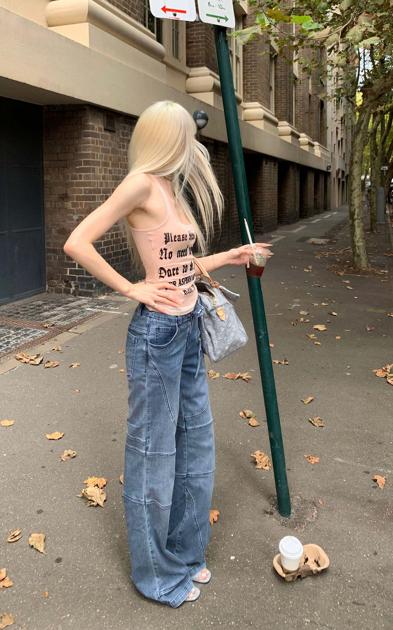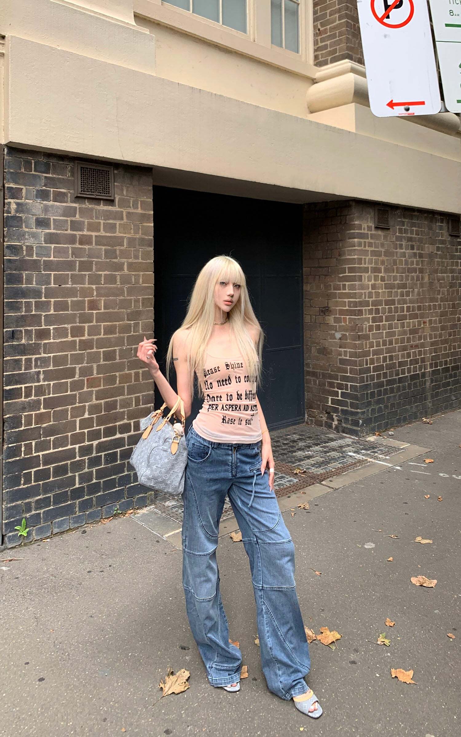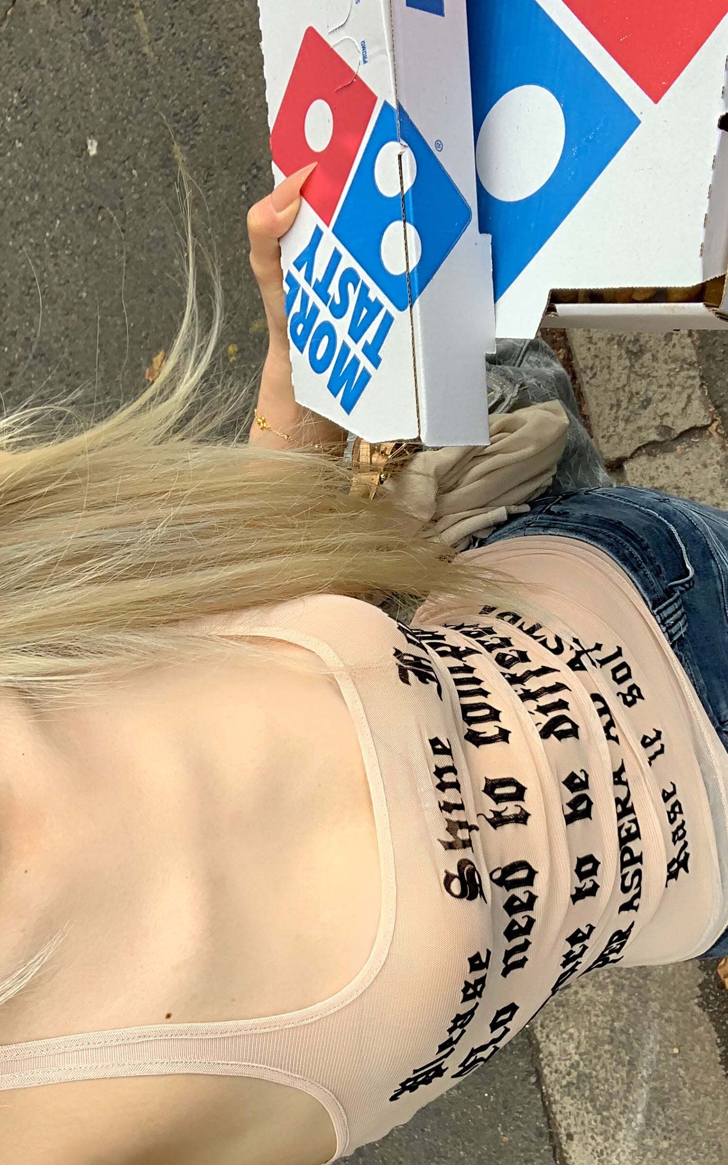 A sheer nude-pink mesh tank top paired with a matching bandeau forms this two-piece set—minimal in construction yet powerful in message. Gothic black lettering across the front weaves a manifesto of defiance, difference, and ascension, while a single cross printed at the upper back evokes a quiet, spiritual severity. The top drapes close to the body, subtly sculpting the silhouette without restricting movement. The included bandeau is crafted from a soft, slightly elastic fabric, offering a second-skin feel and discreet support. Designed for both layering and standalone wear, this set invites the wearer to make the body a site of expression—personal, poetic, and unapologetic.