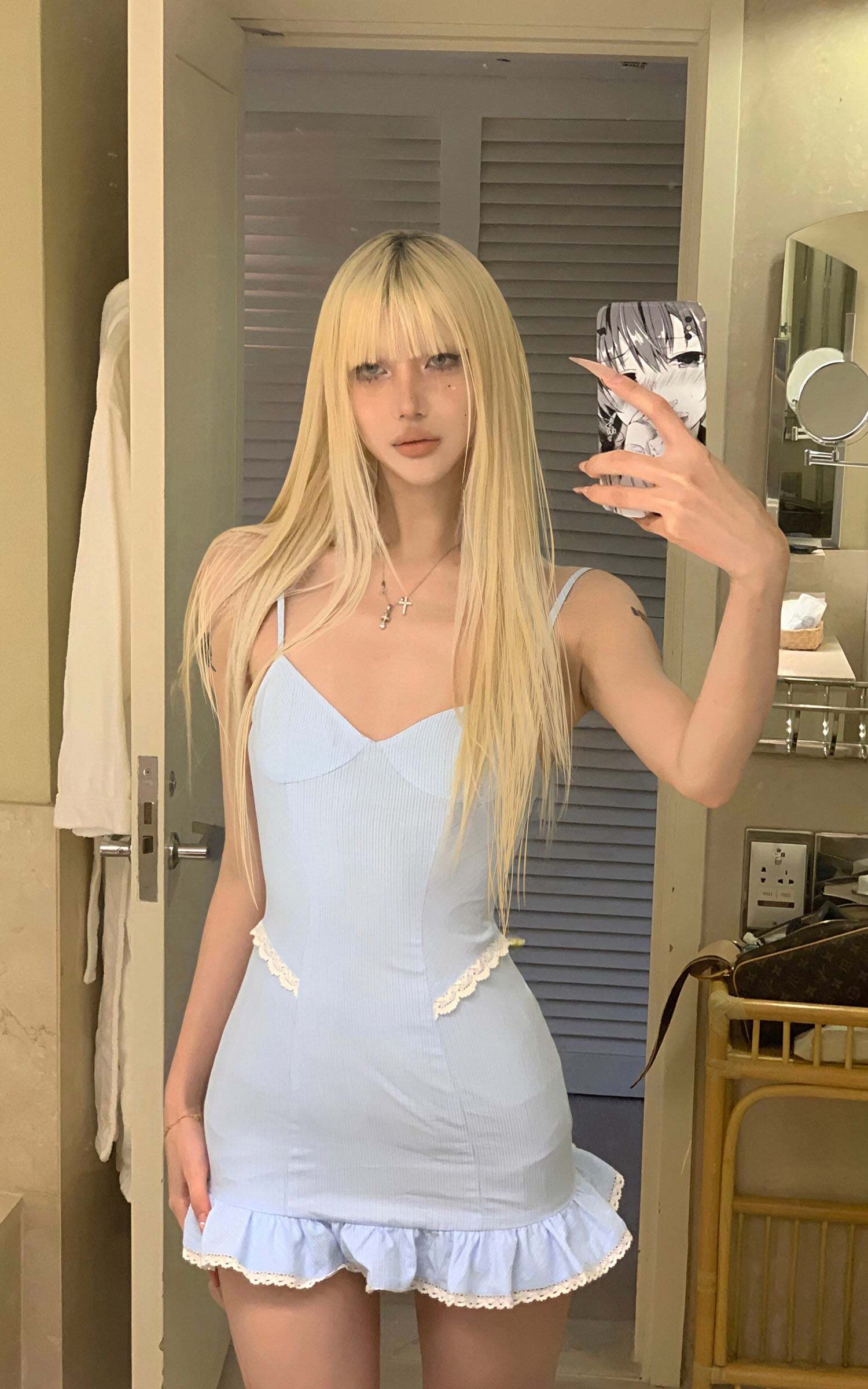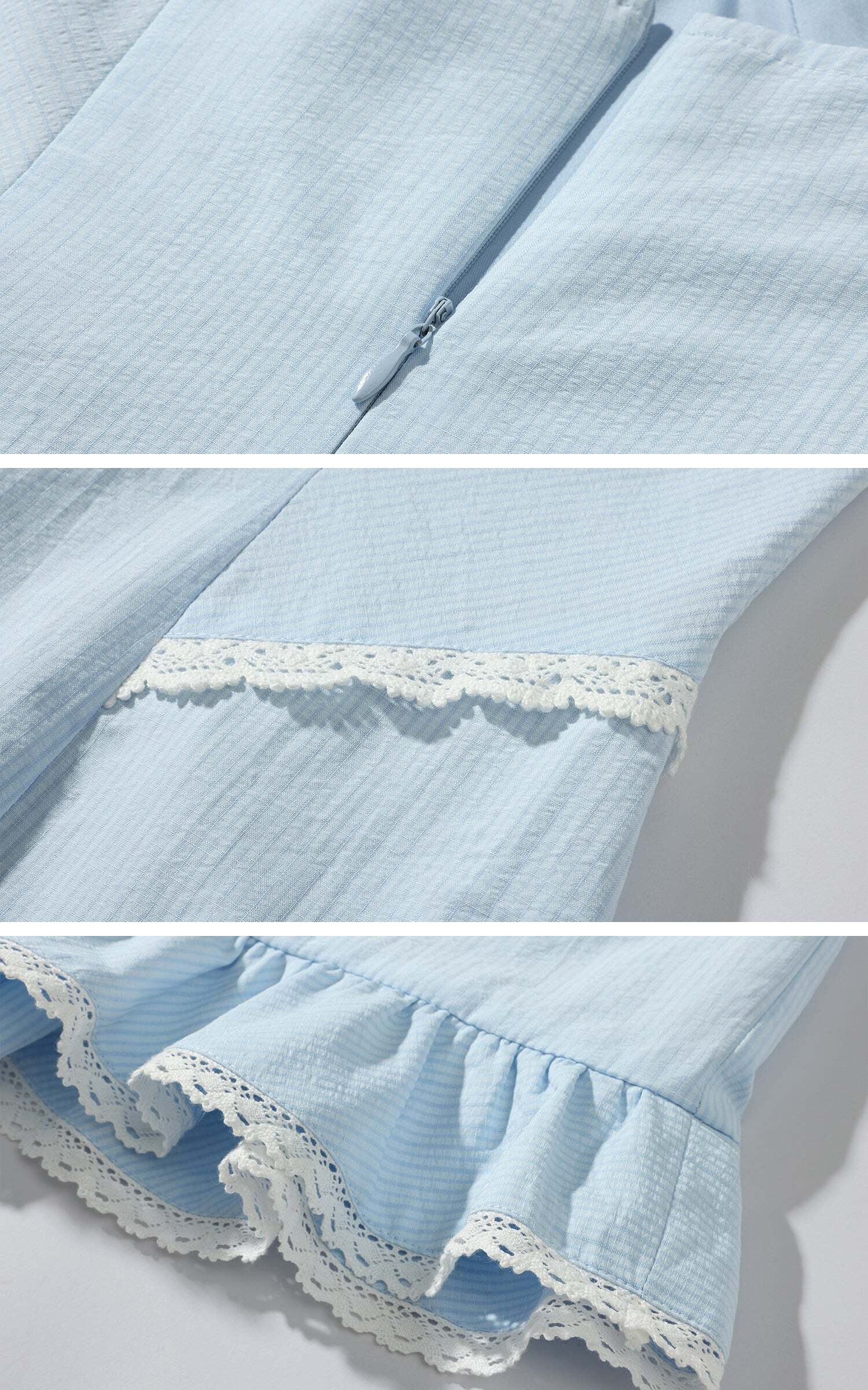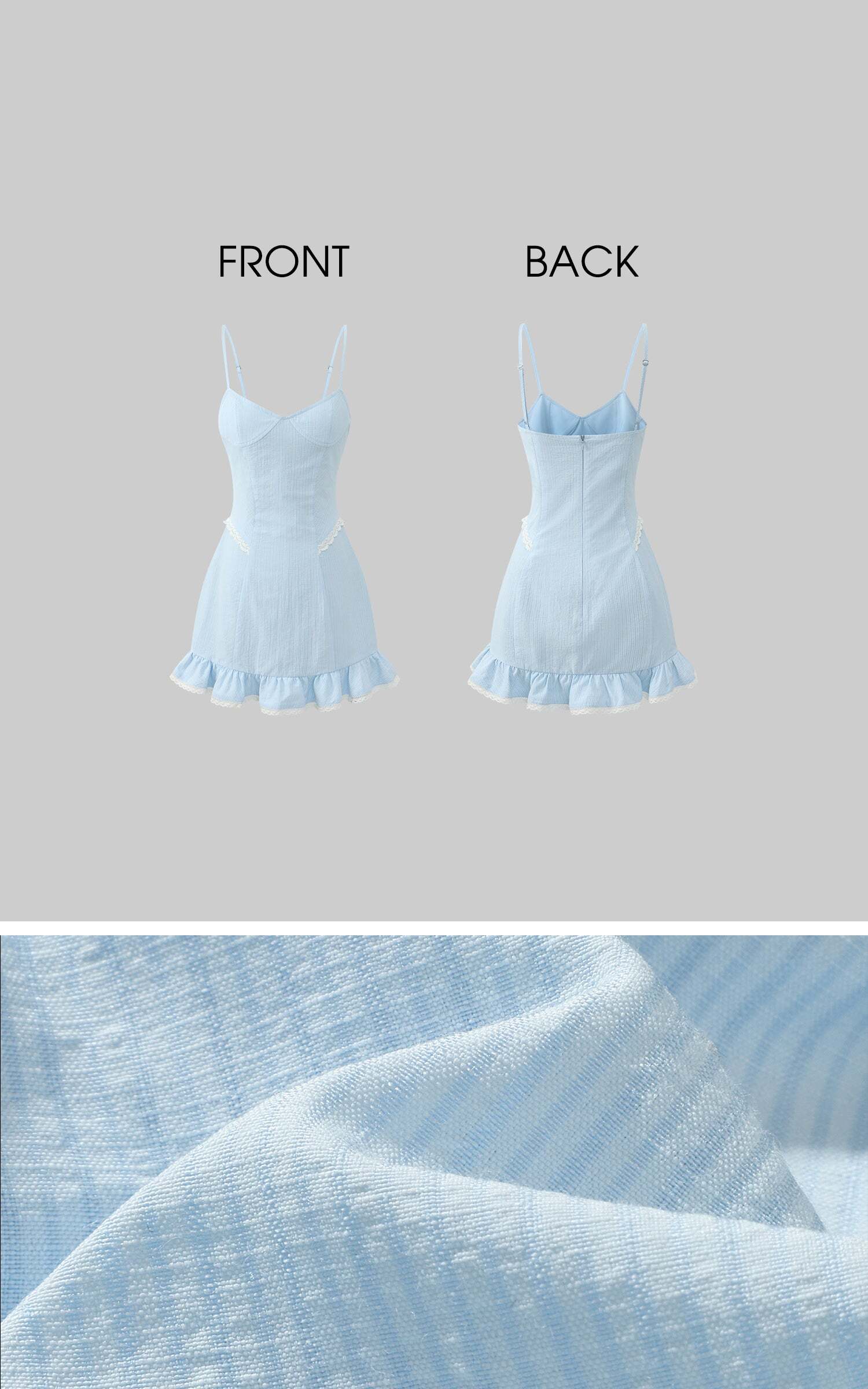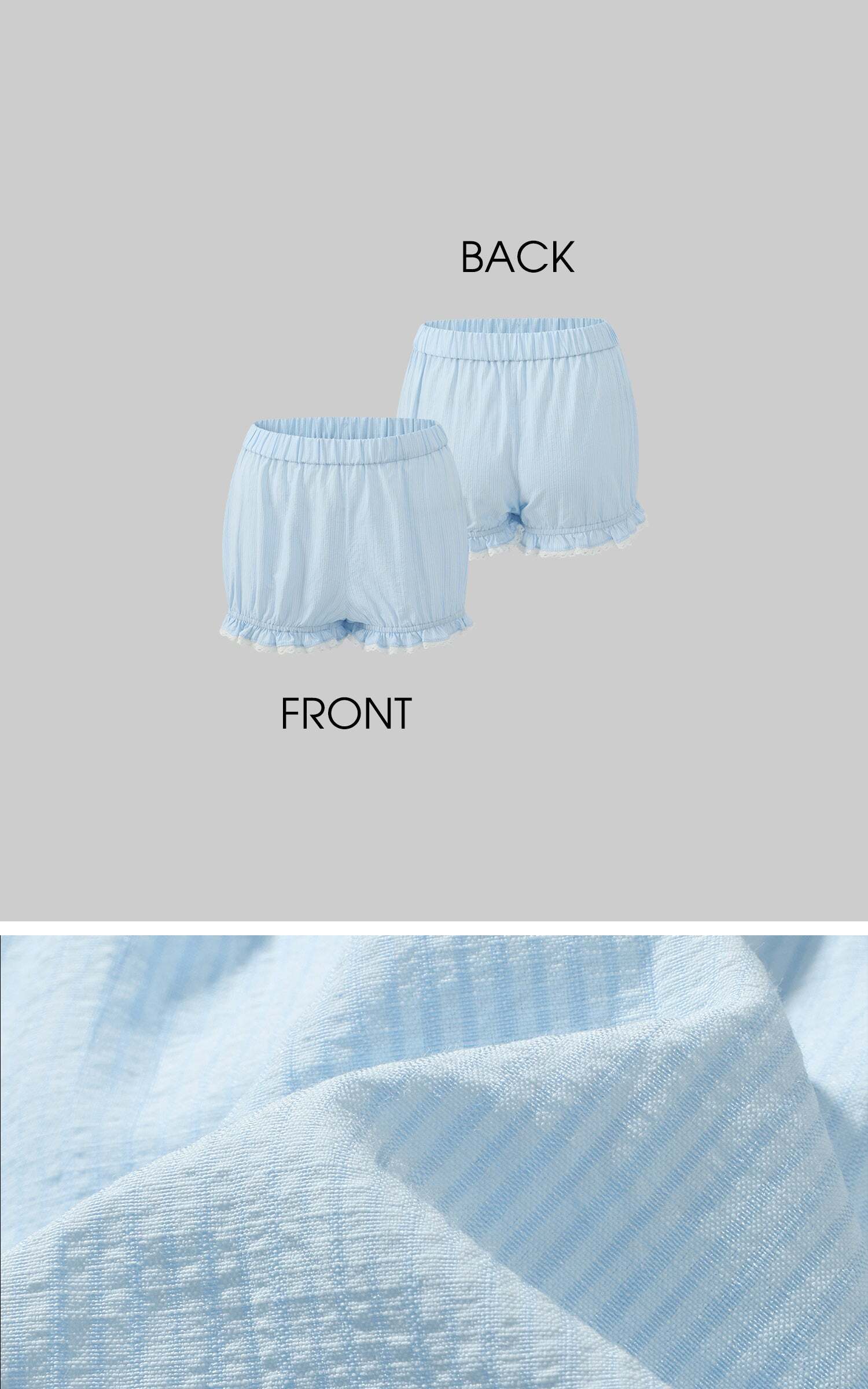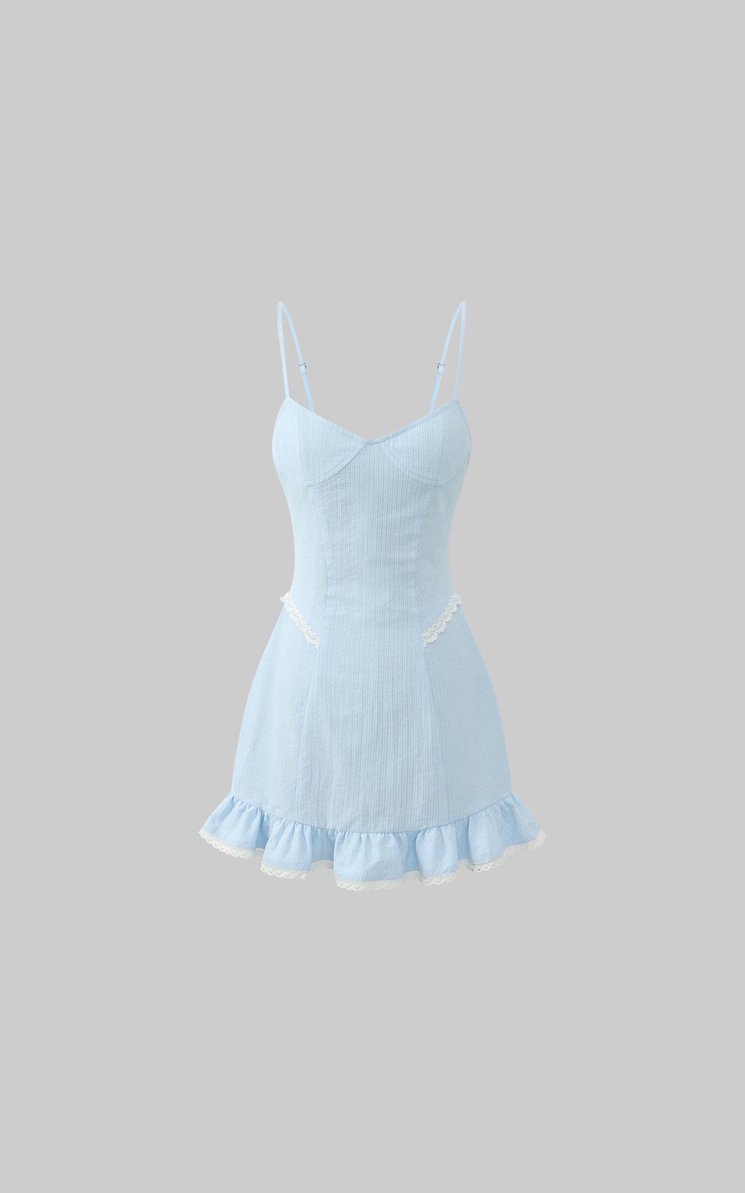 As if caught in an unending afternoon reverie, this camisole dress comes in a powdery blue, with subtle texture that clings without constraint. The softly contoured bustline meets delicate lace at the waist, while the hem falls into gentle ruffles—moving like breath with each step. Paired with matching lace-trimmed bloomers, the set carries a quiet sense of intimacy, a whisper of protection beneath its airy lightness. It speaks of silent corridors, of thoughts not spoken, and the soft glimmer of lamplight on skin just before sleep.