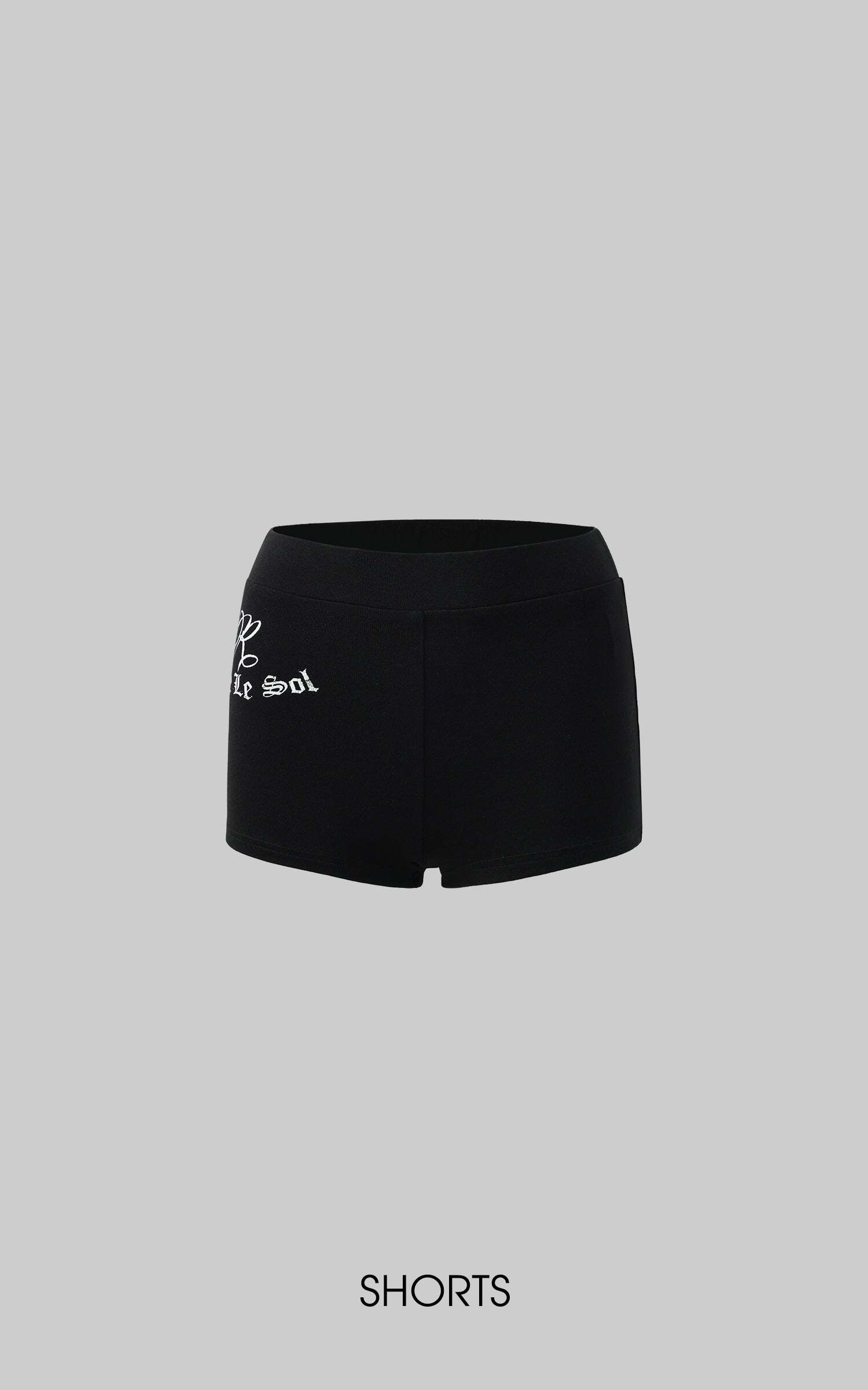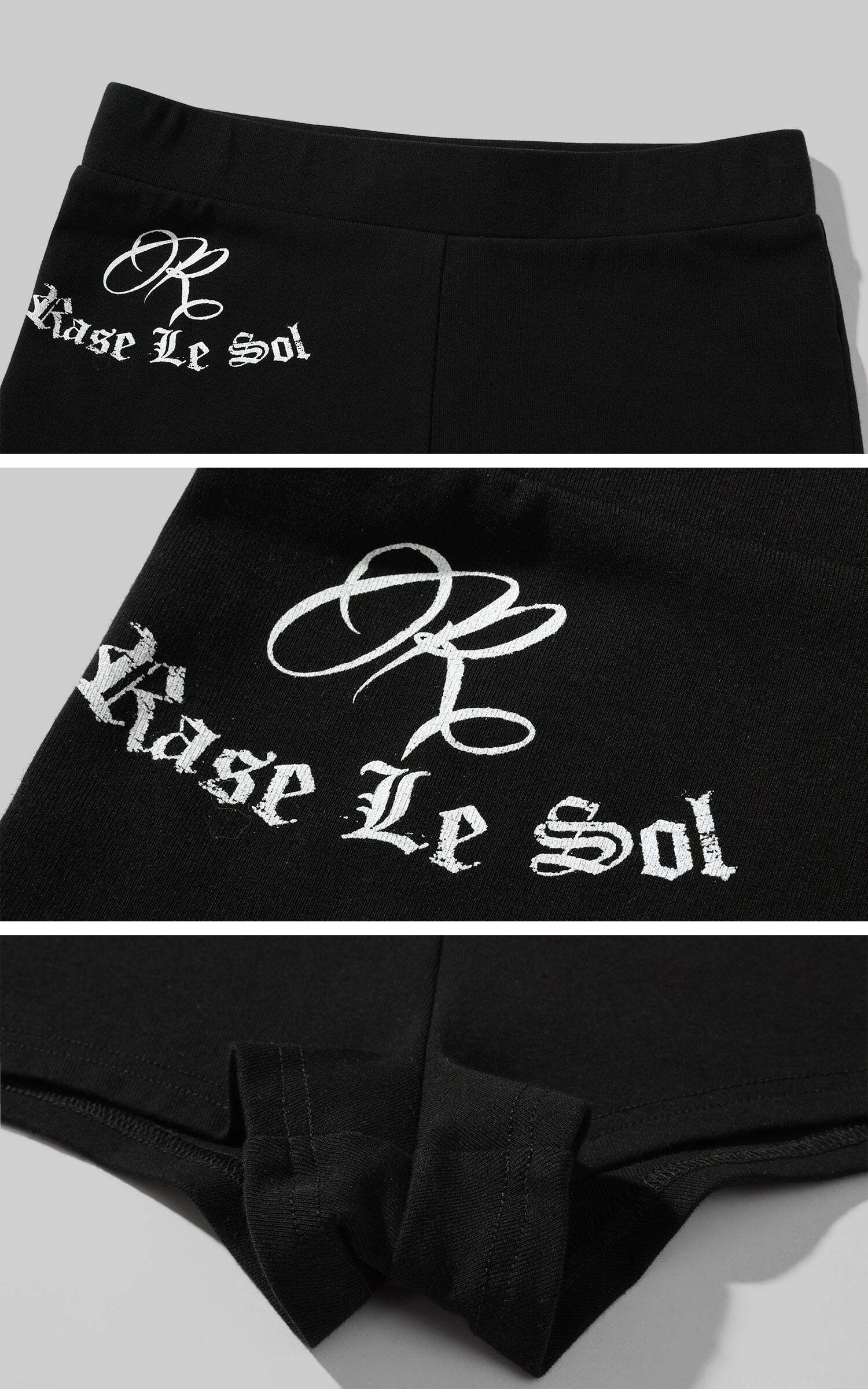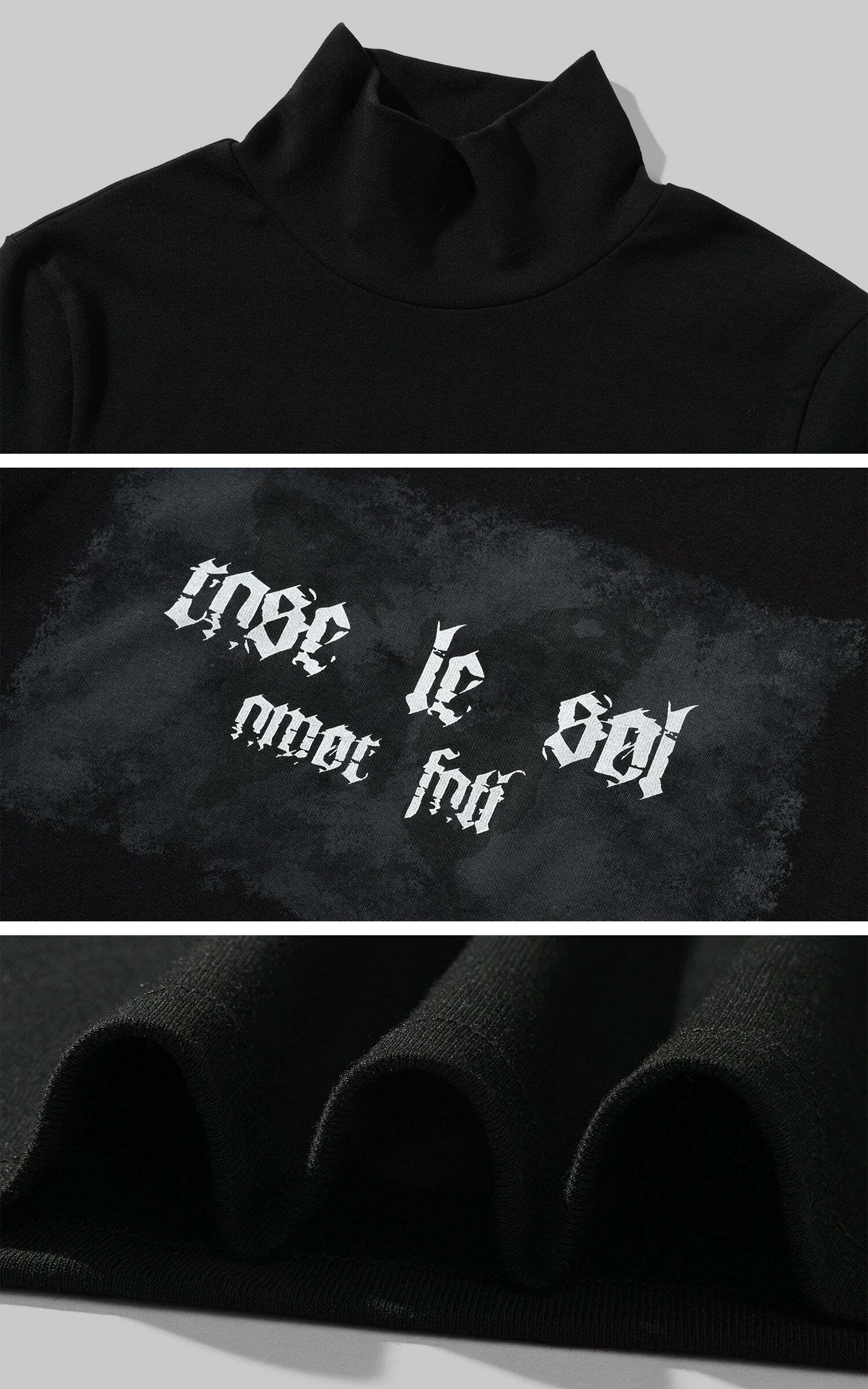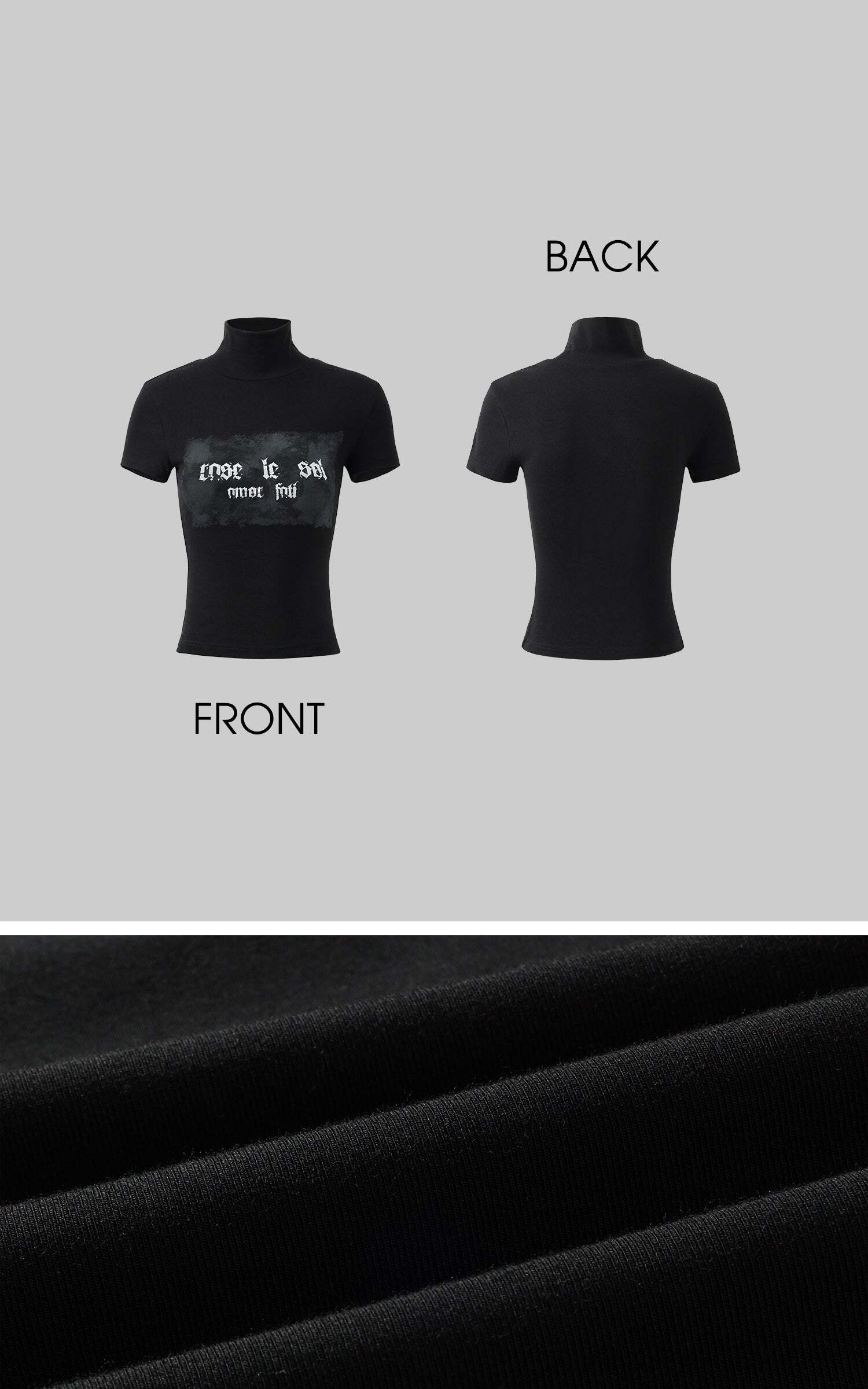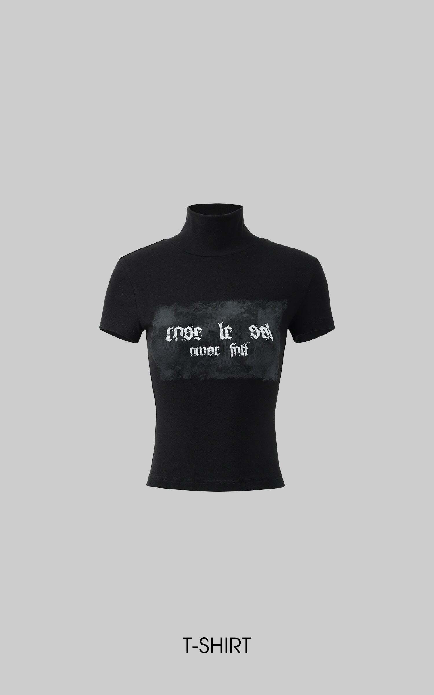 A silhouette that speaks with restraint. The fitted tee clings softly, its mock neck shielding the throat like silent armor. Centered on the chest, fractured lettering emerges from a misted texture—illegible yet certain, like a message half-erased by time. The matching stretch shorts hug the body with no demand, simply tracing its presence. Together, they form a quiet tension—an oath whispered under dusk.