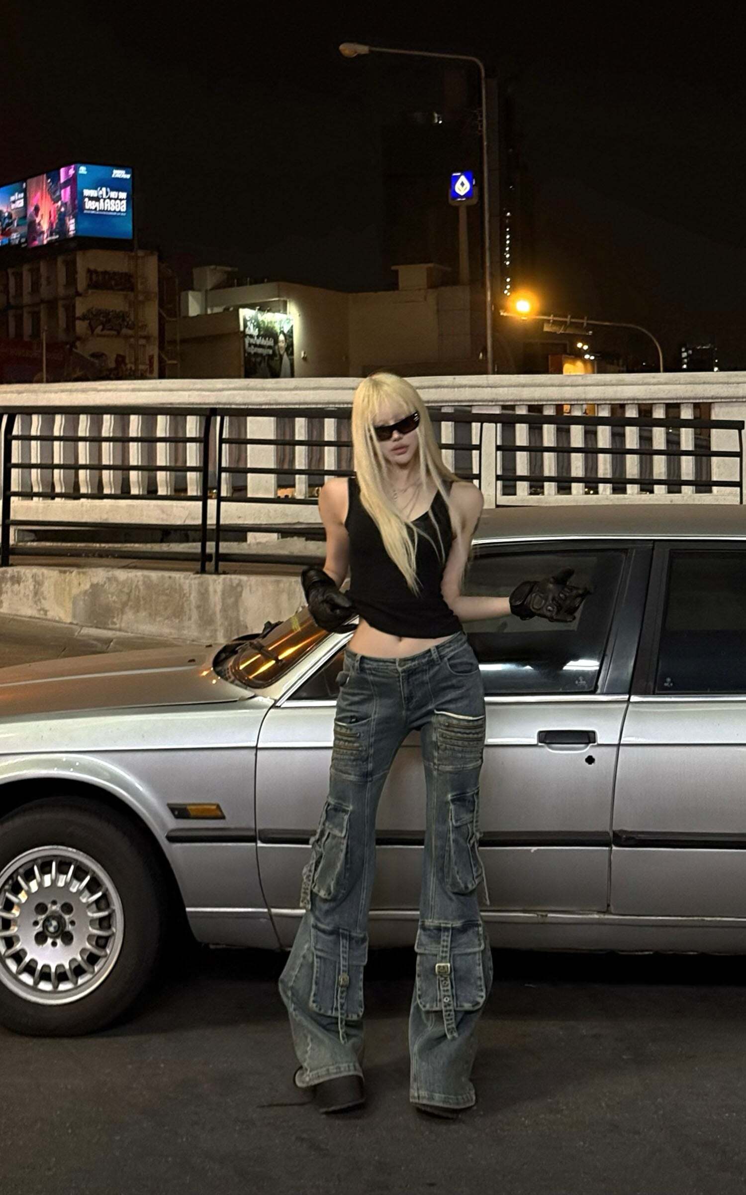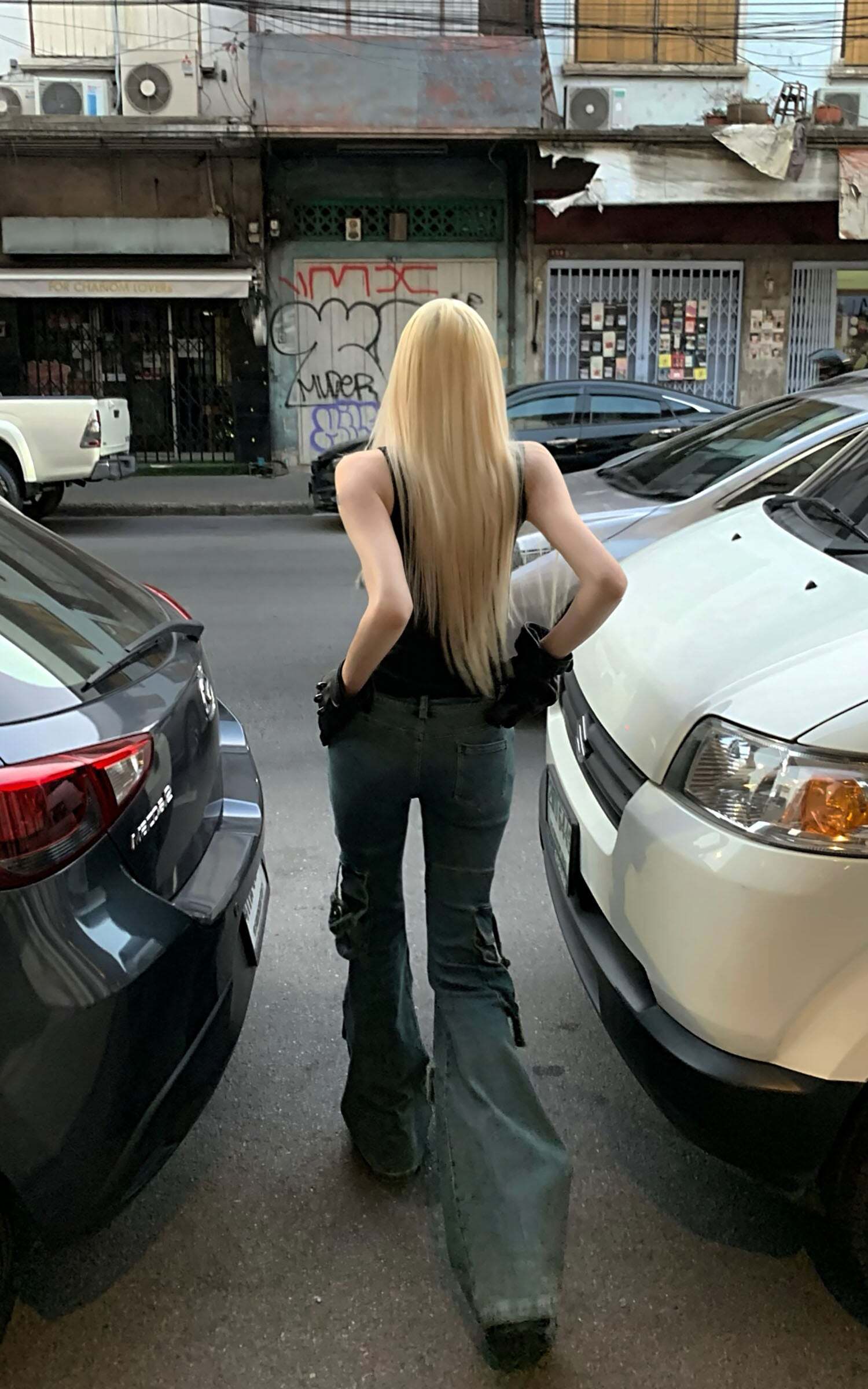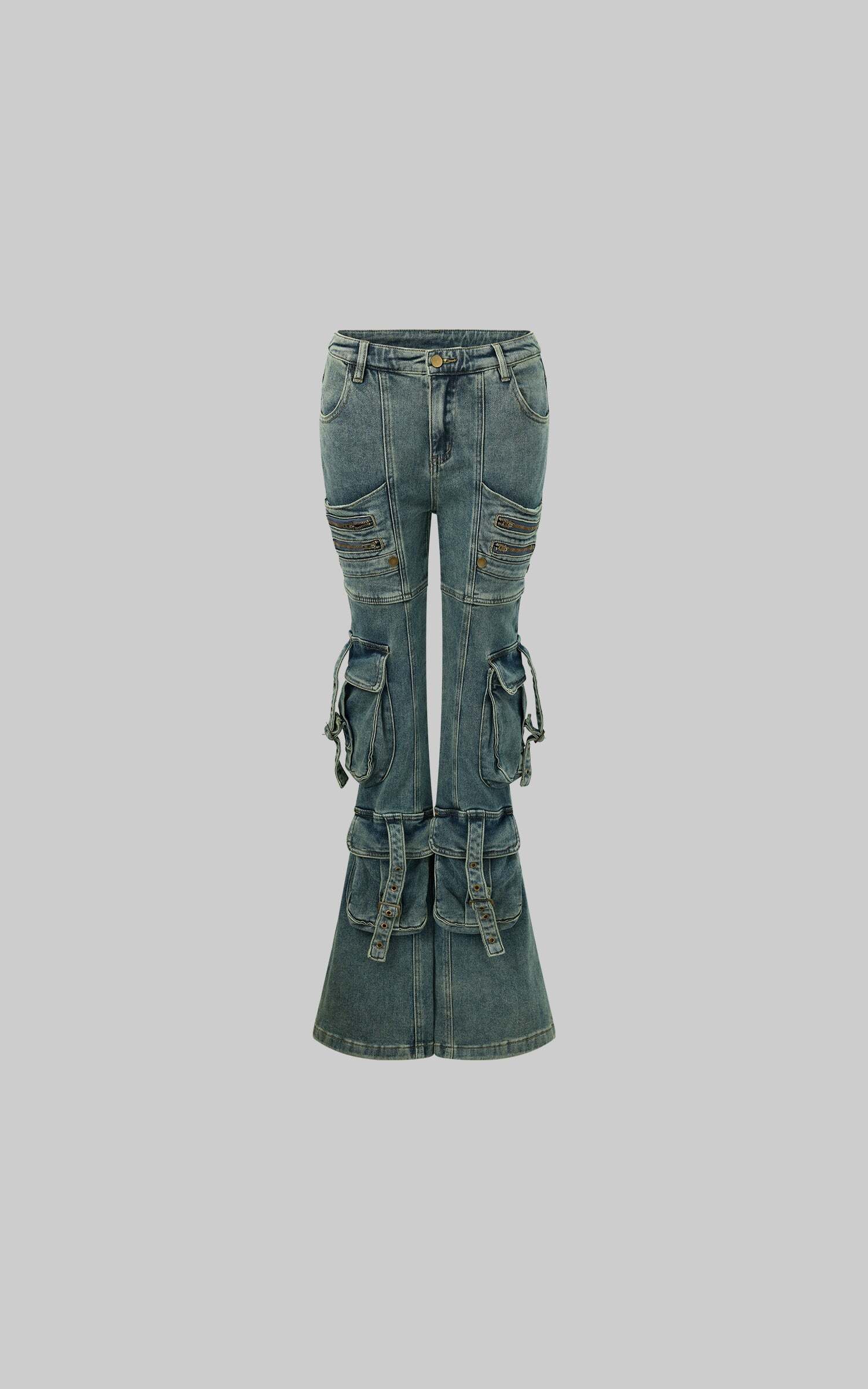 A silhouette that drags the ground, suspended in motion—like a shadow folded into the edges of the city. These flared jeans dismantle symmetry with their irregular pocket placements, reconfiguring proportions and movement. The distressed denim bears the traces of time, worn like a memory without origin. Constructed with silence and weight, they are made not to speak—but to insist.
