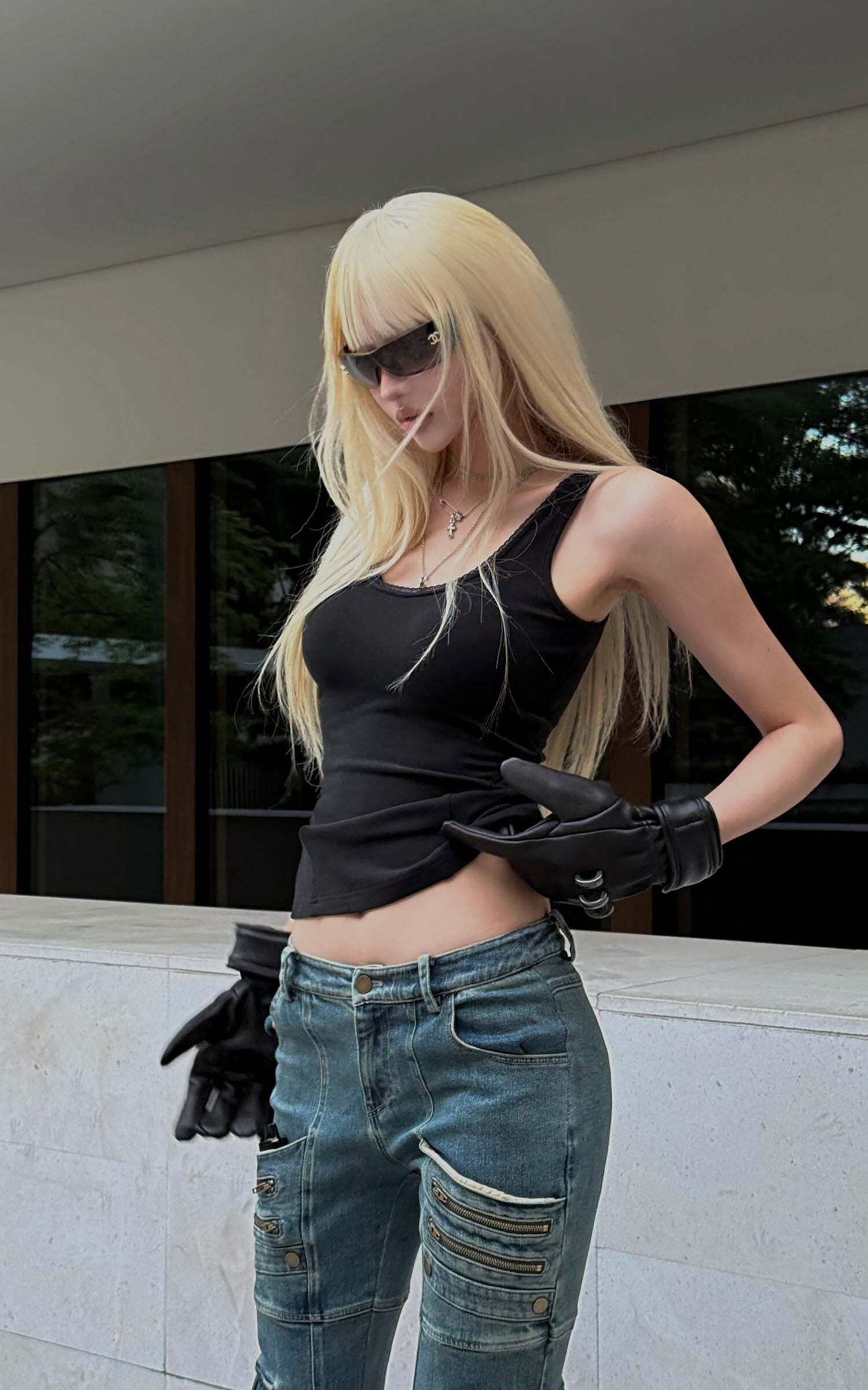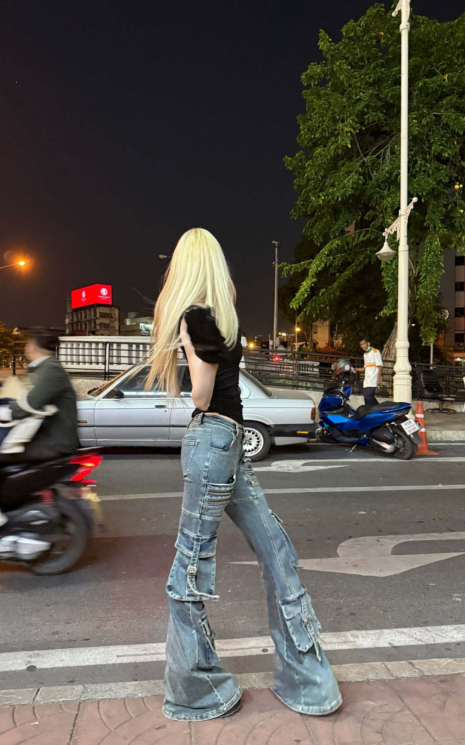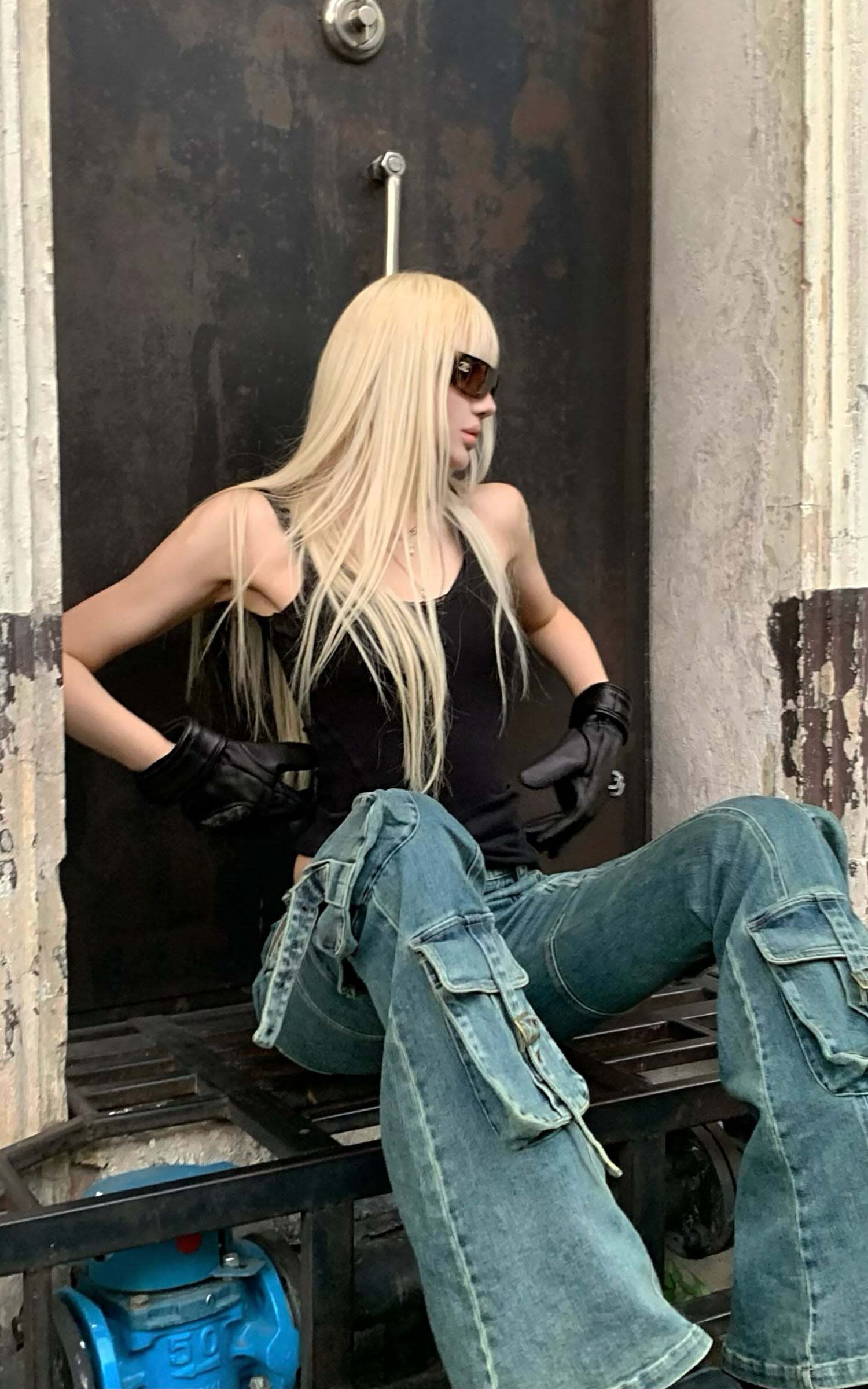 A silhouette that drags the ground, suspended in motion—like a shadow folded into the edges of the city. These flared jeans dismantle symmetry with their irregular pocket placements, reconfiguring proportions and movement. The distressed denim bears the traces of time, worn like a memory without origin. Constructed with silence and weight, they are made not to speak—but to insist.