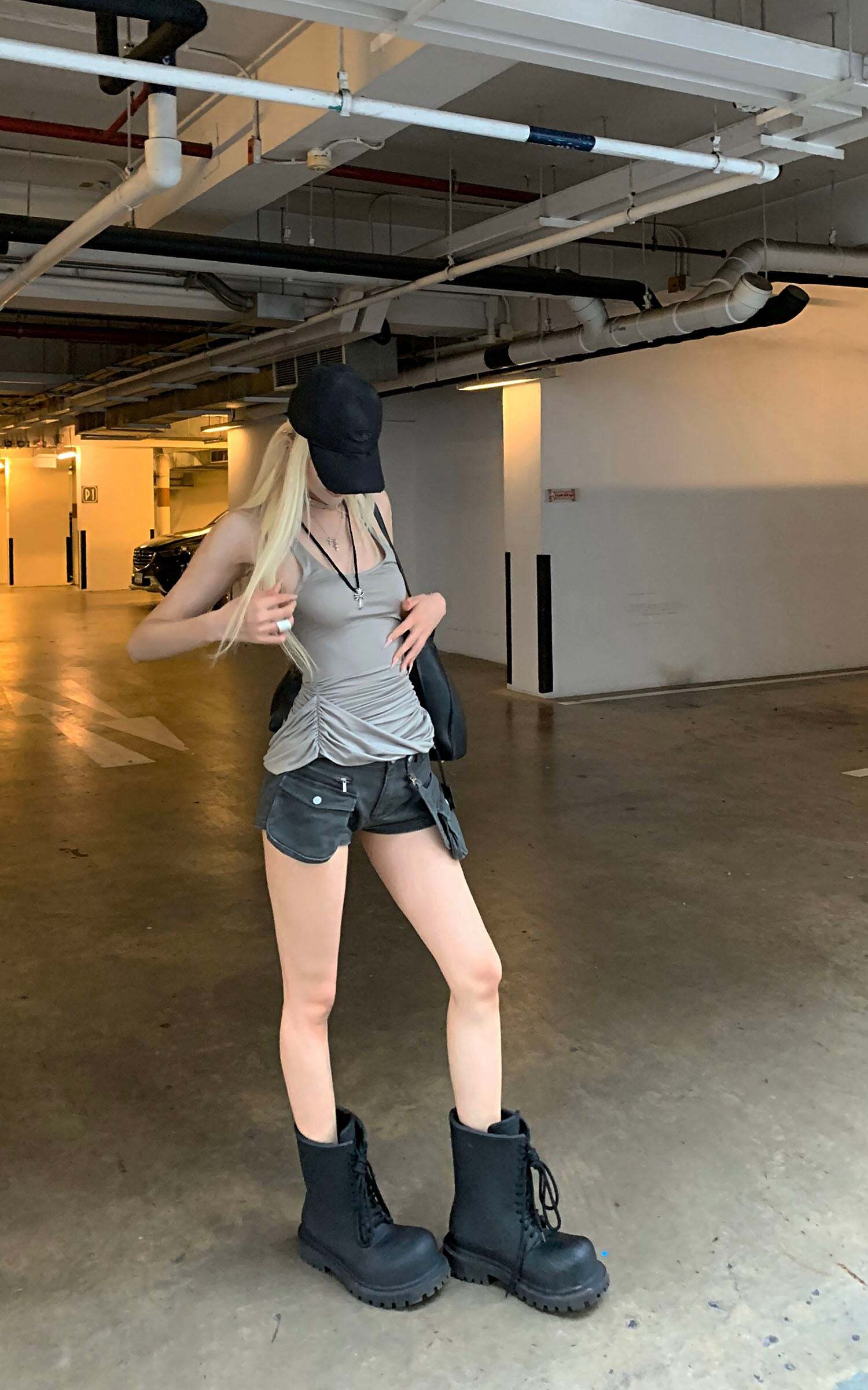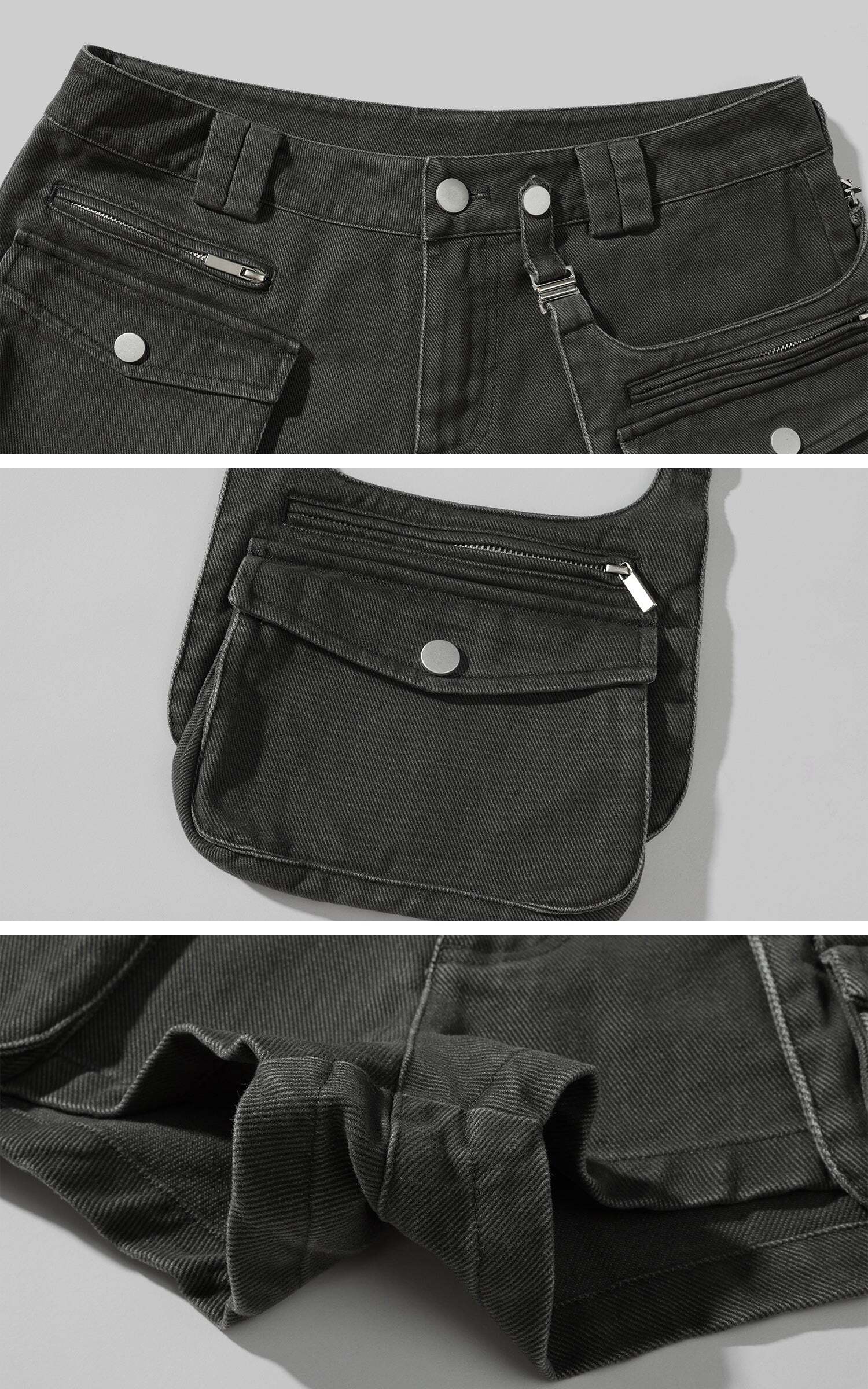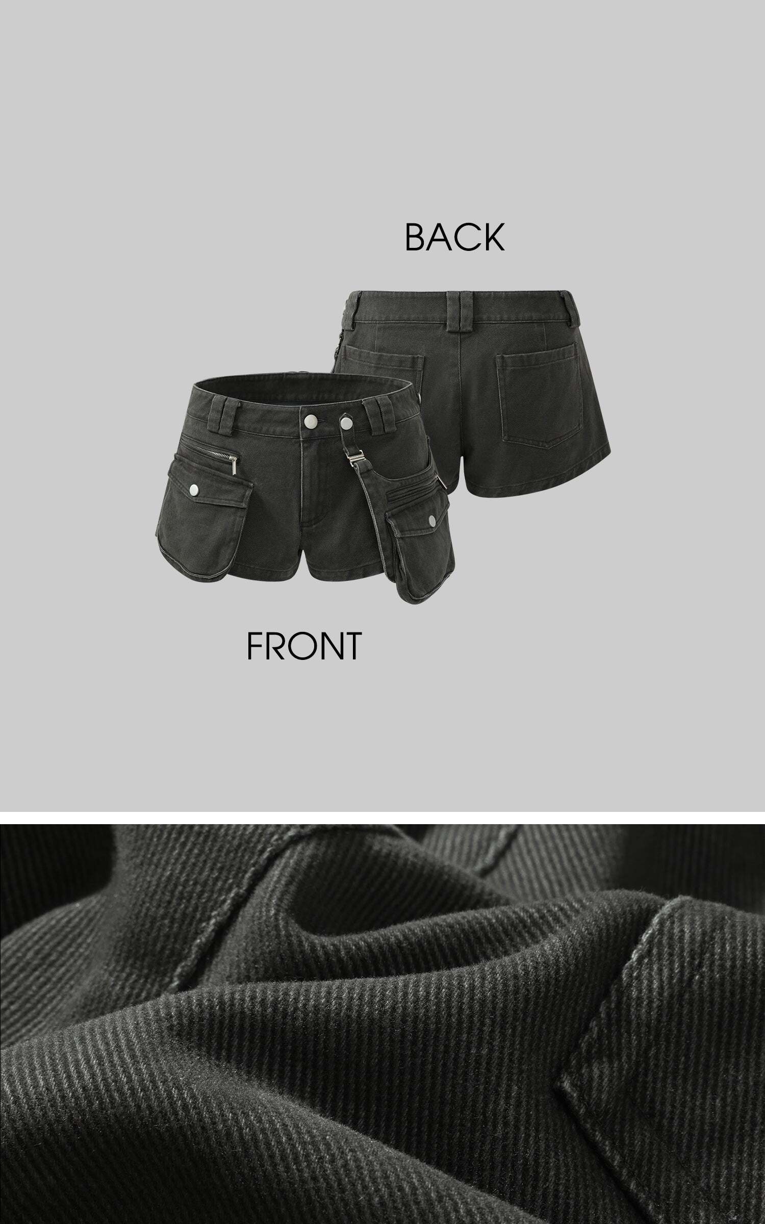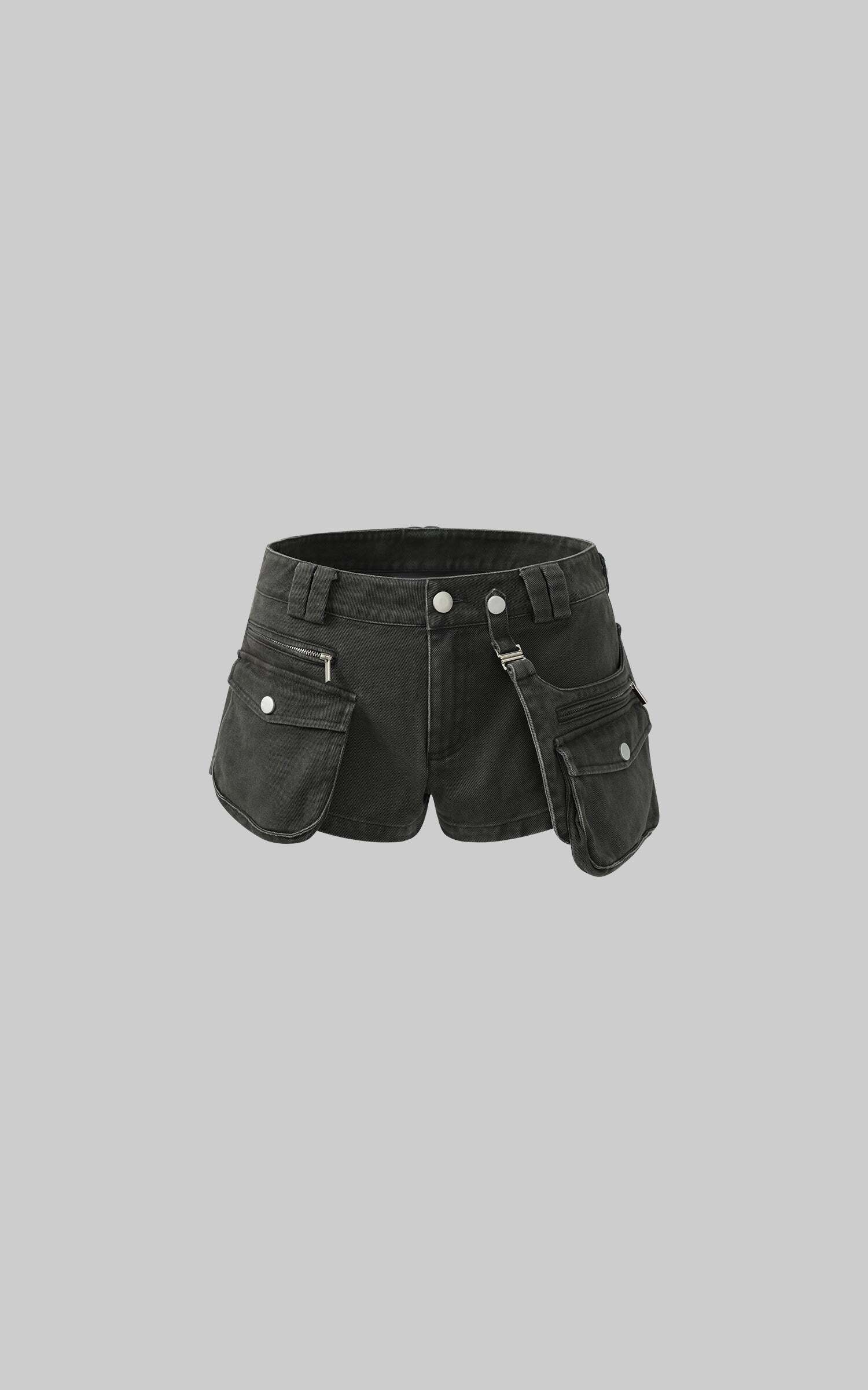 Rooted in utilitarian design, these shorts feature a structured silhouette cut from dense twill cotton. Dual oversized side pockets with zip and snap closures bring volume and edge, while a detachable micro pouch adds a modular twist. The washed black hue exudes restraint and grit, echoing the attitude of modern armor. Pair with asymmetric tops or fitted tanks for a confrontational, urban ensemble.
