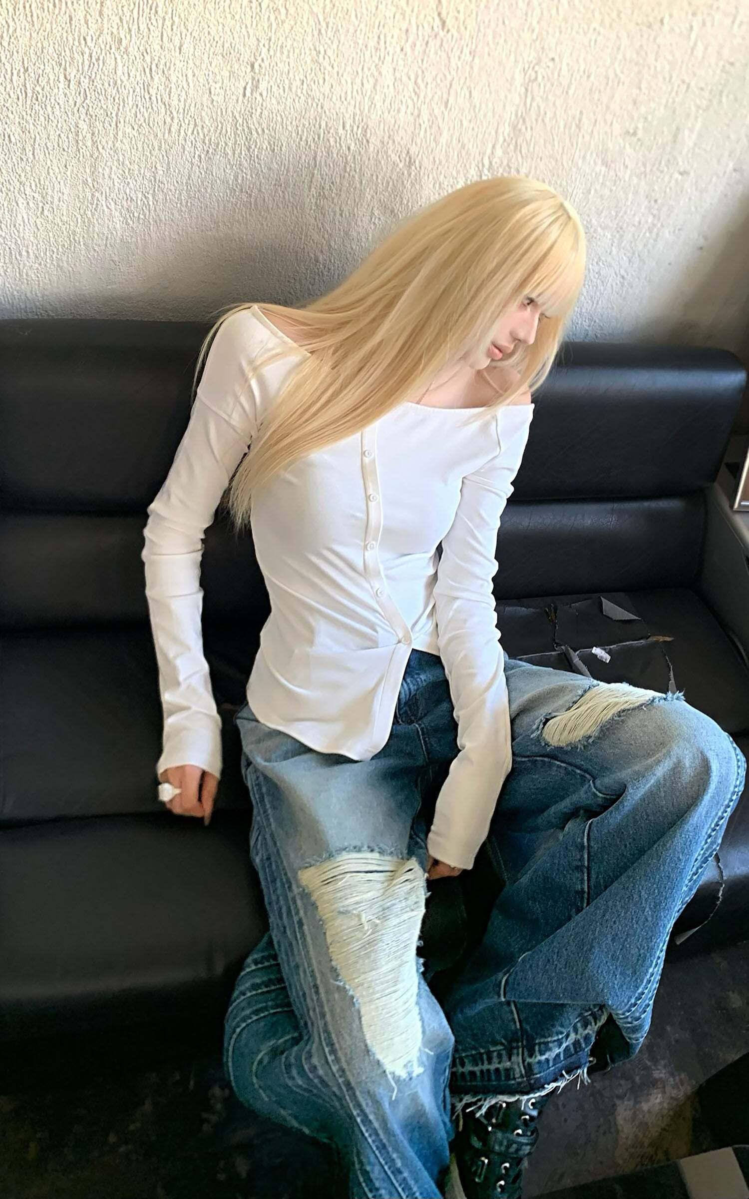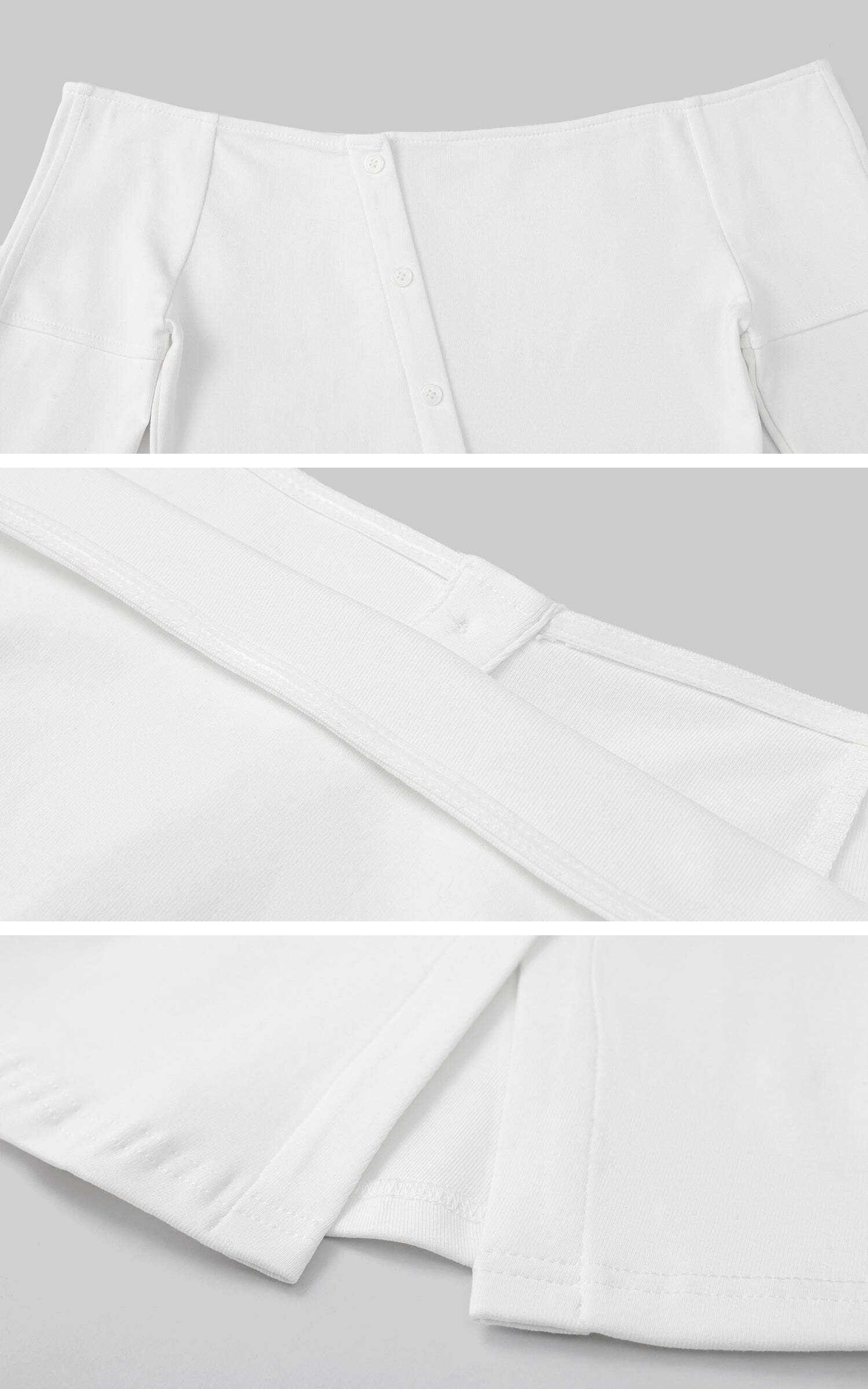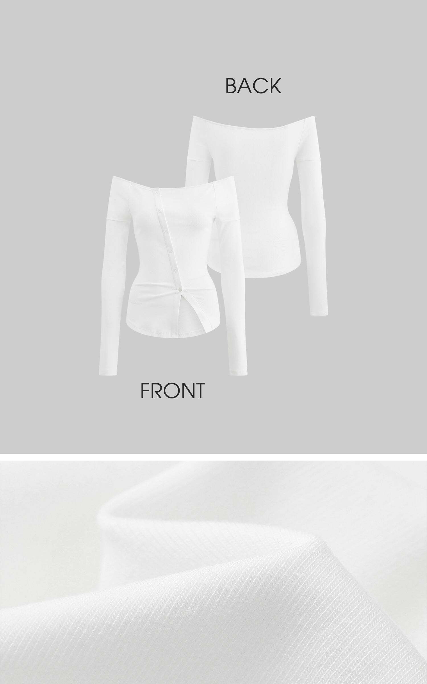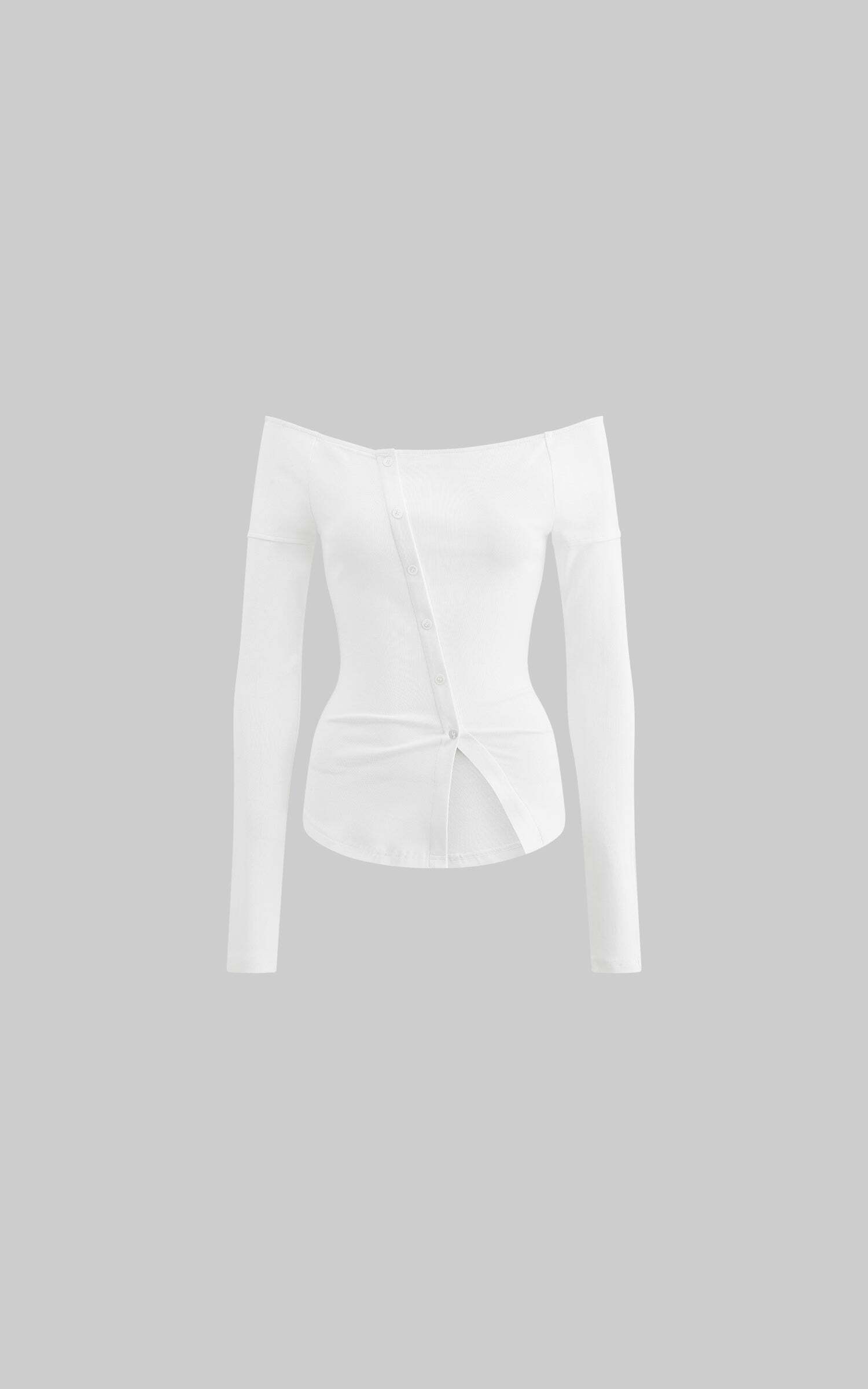 This off-shoulder tee combines minimalist design with delicate detail. The asymmetric button-down front creates an elegant yet modern silhouette, highlighting the sleek, contoured fit of the top. Crafted from soft, ribbed fabric, this piece offers both comfort and style. The design emphasizes a clean, streamlined look while maintaining a subtle sensuality with its off-shoulder neckline. Pair it with wide-leg jeans or tailored trousers to complete an effortlessly chic outfit. Its versatility makes it perfect for both day and night styling.