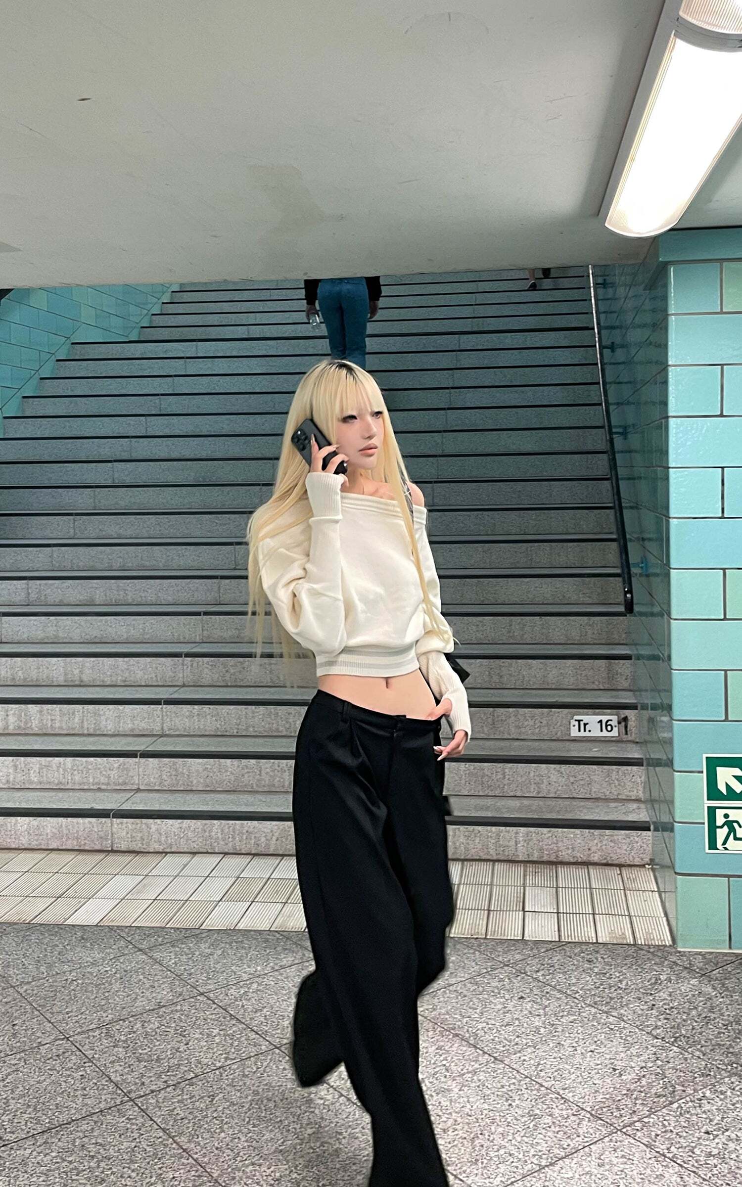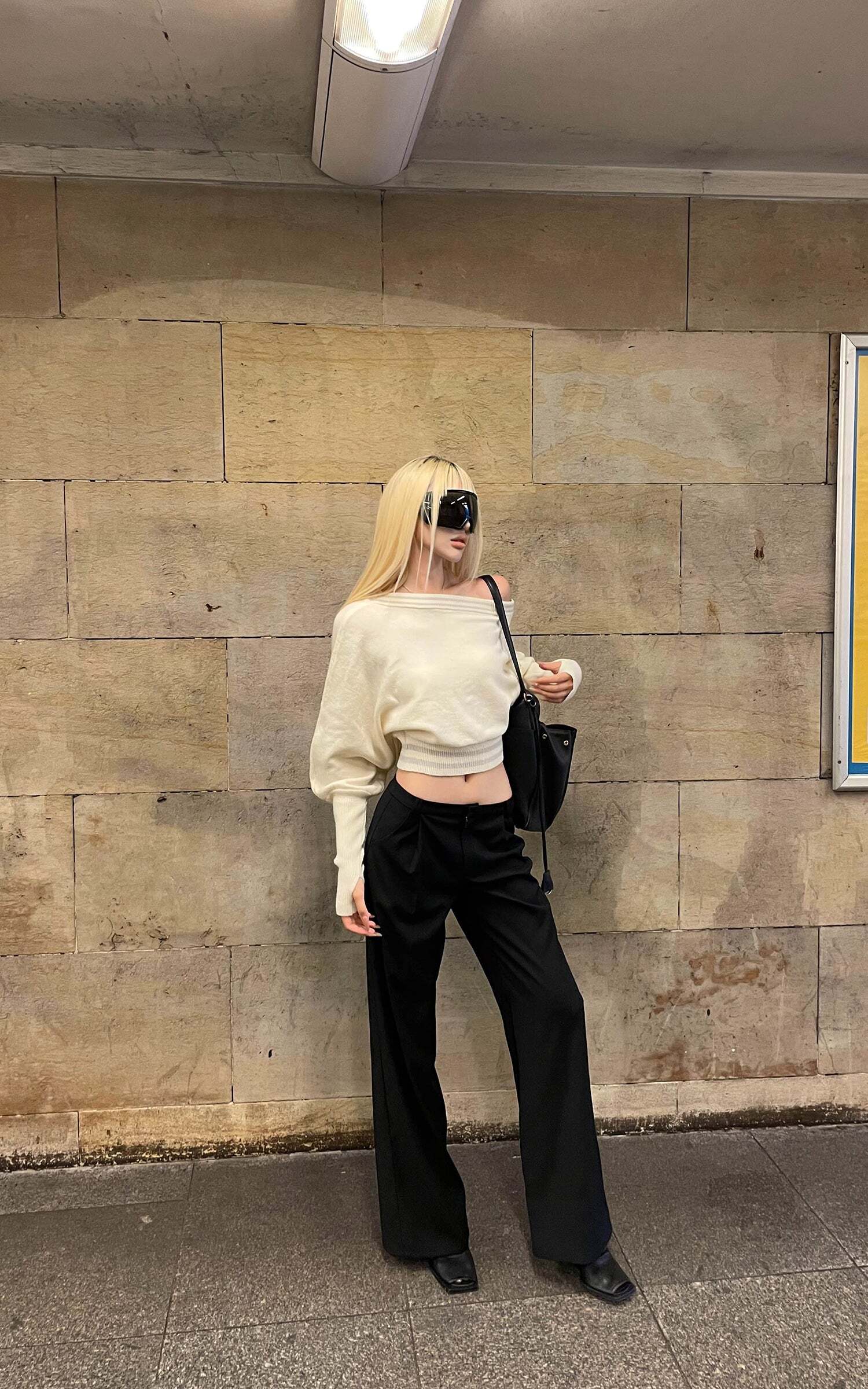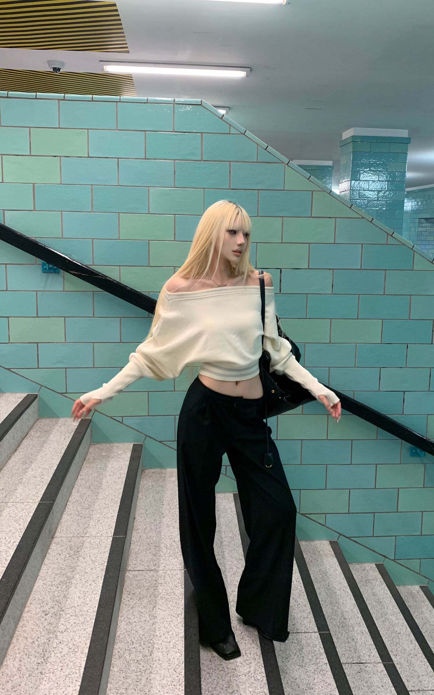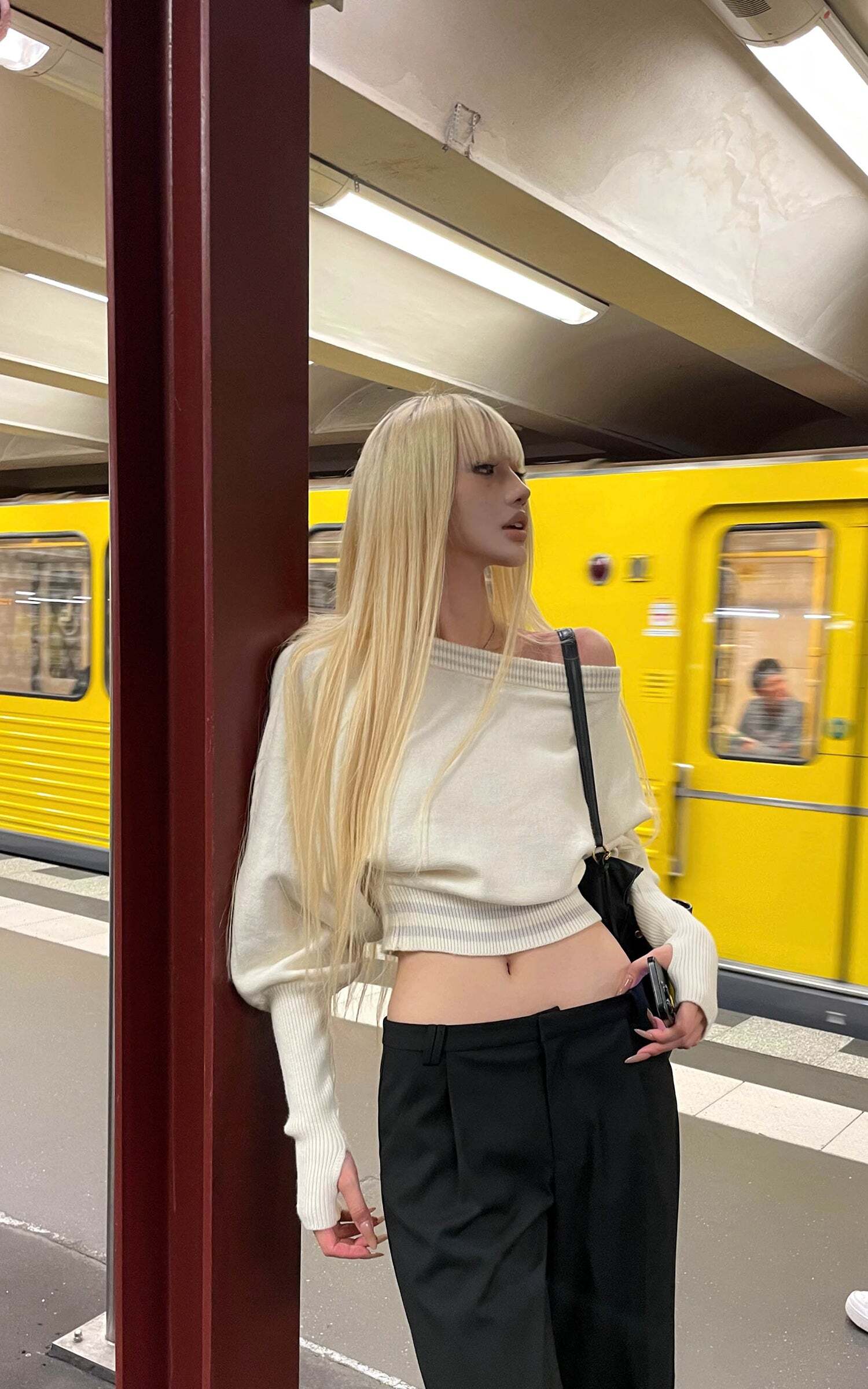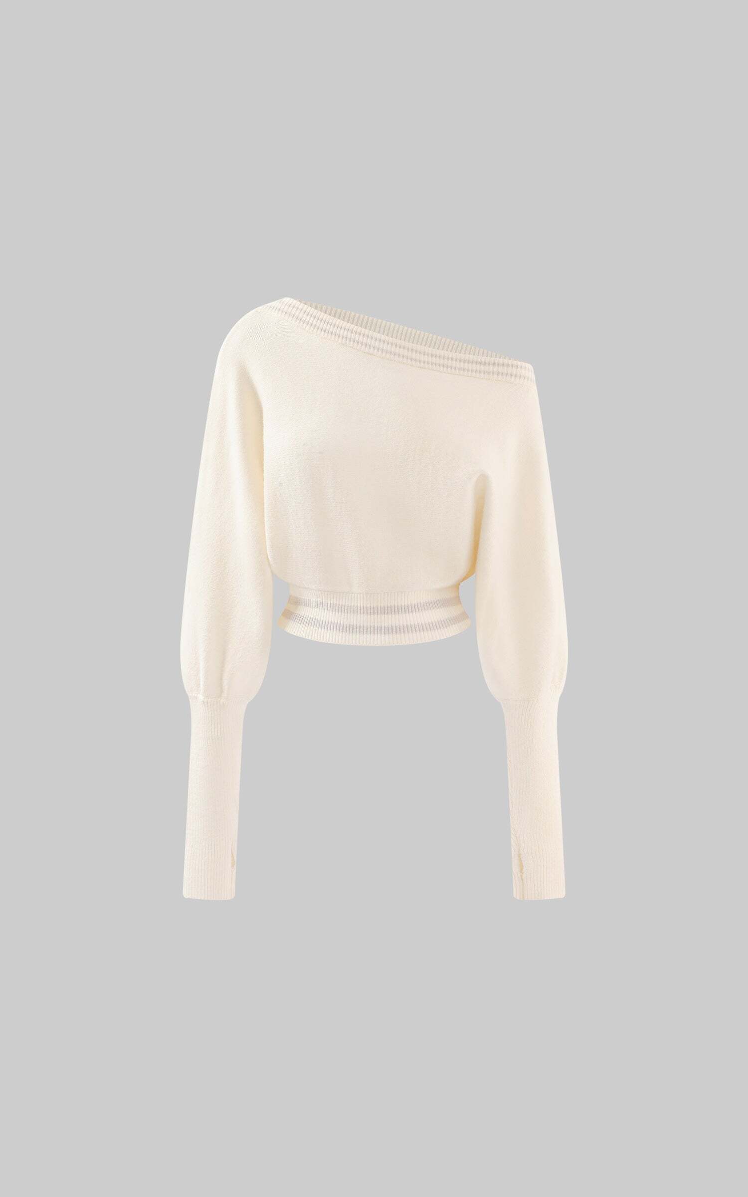 This sweater embodies minimal elegance with its soft knit texture and pared-down silhouette. The wide neckline drapes off the shoulder, creating an asymmetric reveal. A cropped proportion contrasts with elongated sleeves, featuring thumb openings that evoke a subtle sense of undone beauty. Its light fabric and restrained lines allow the garment to flow between body and space, leaving room for poetic silence.