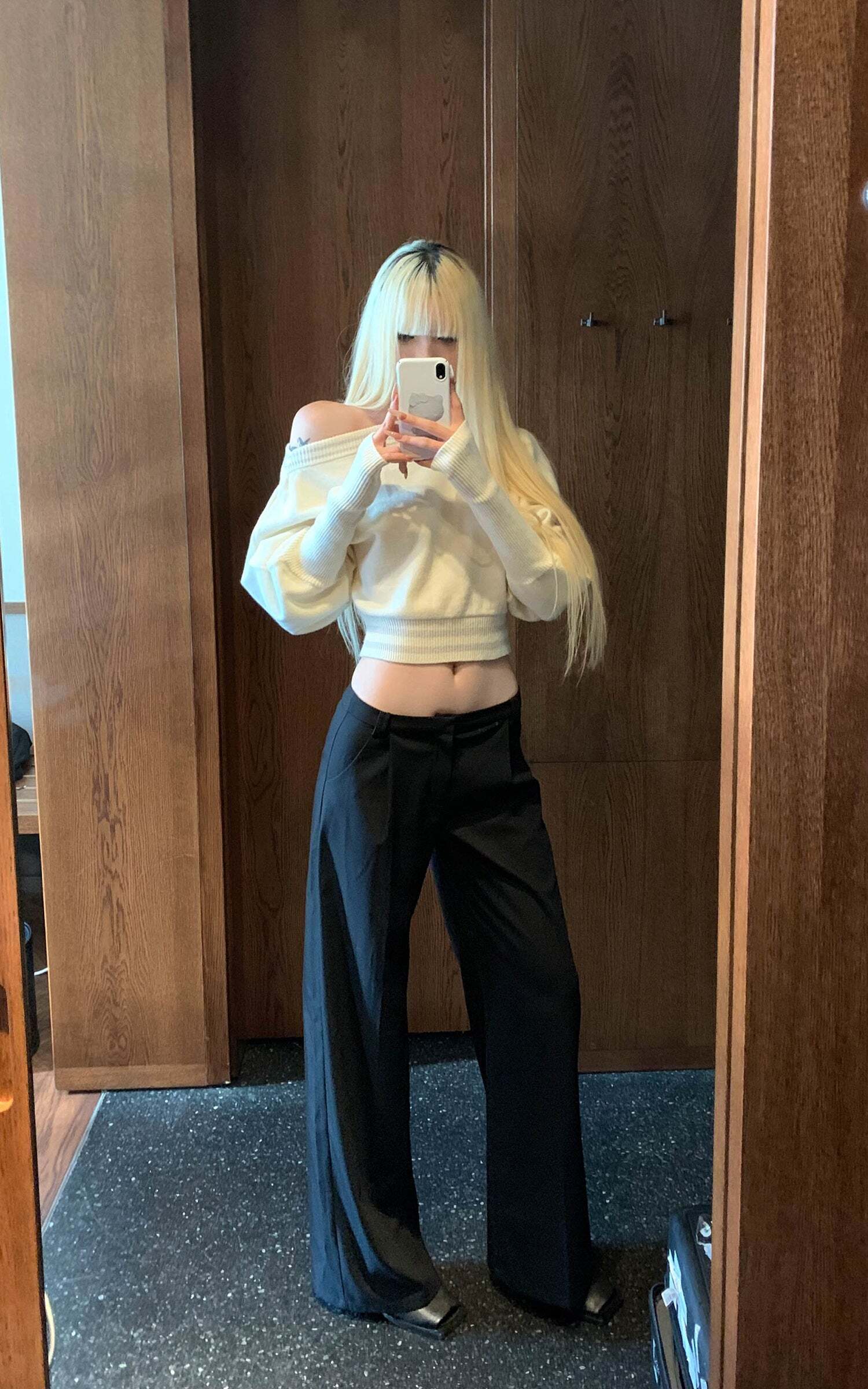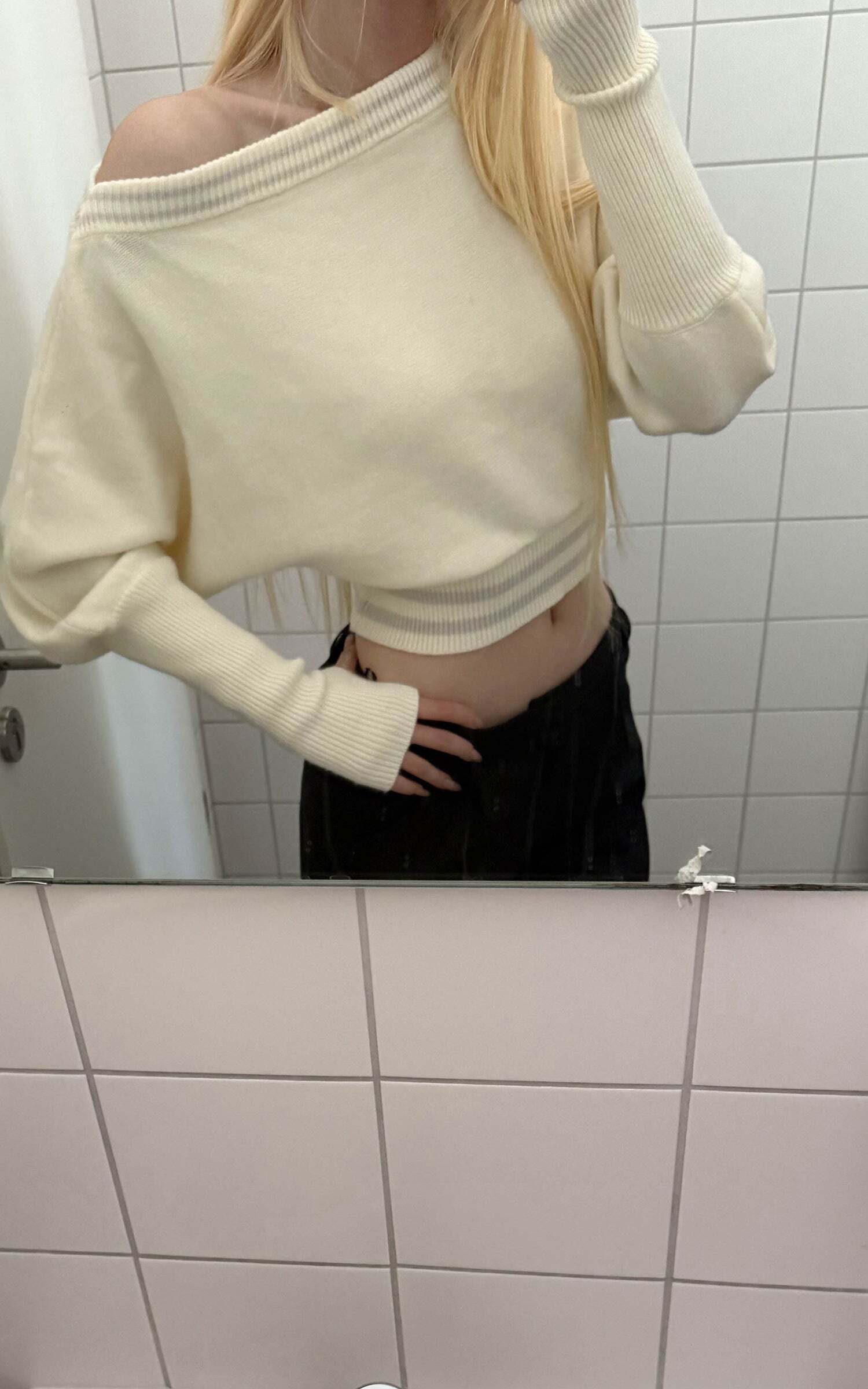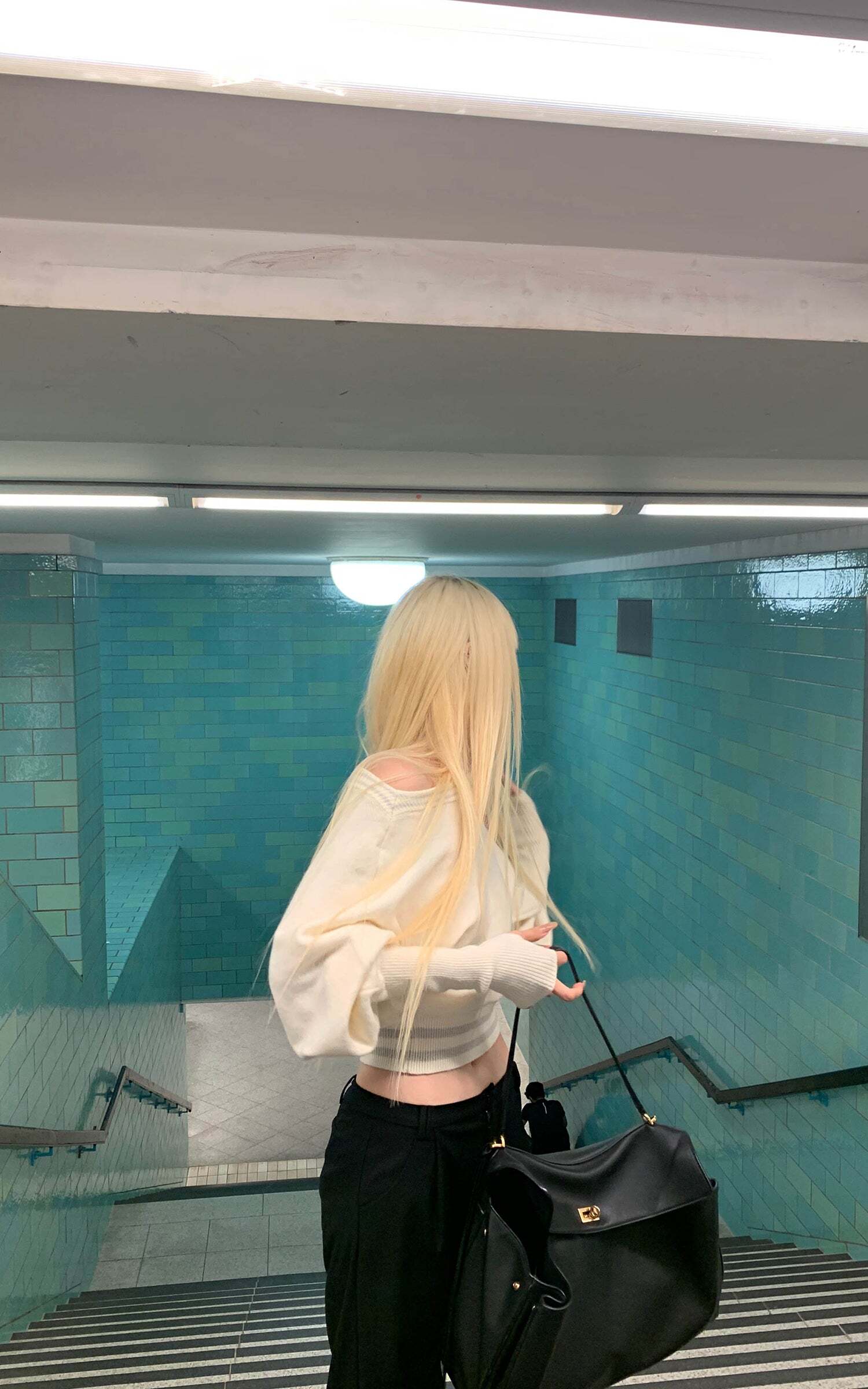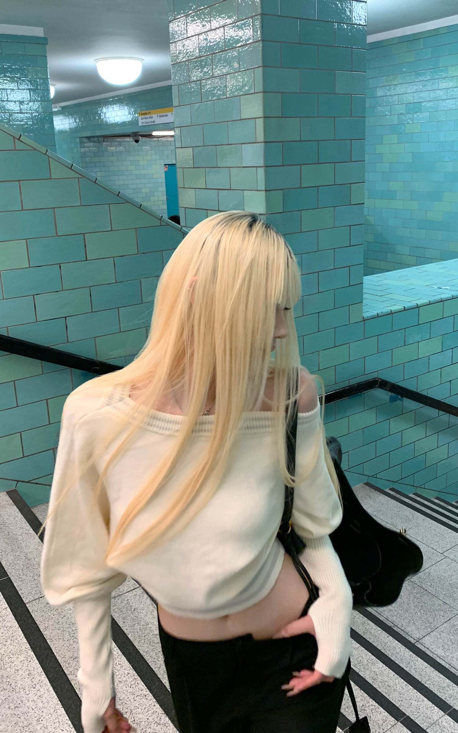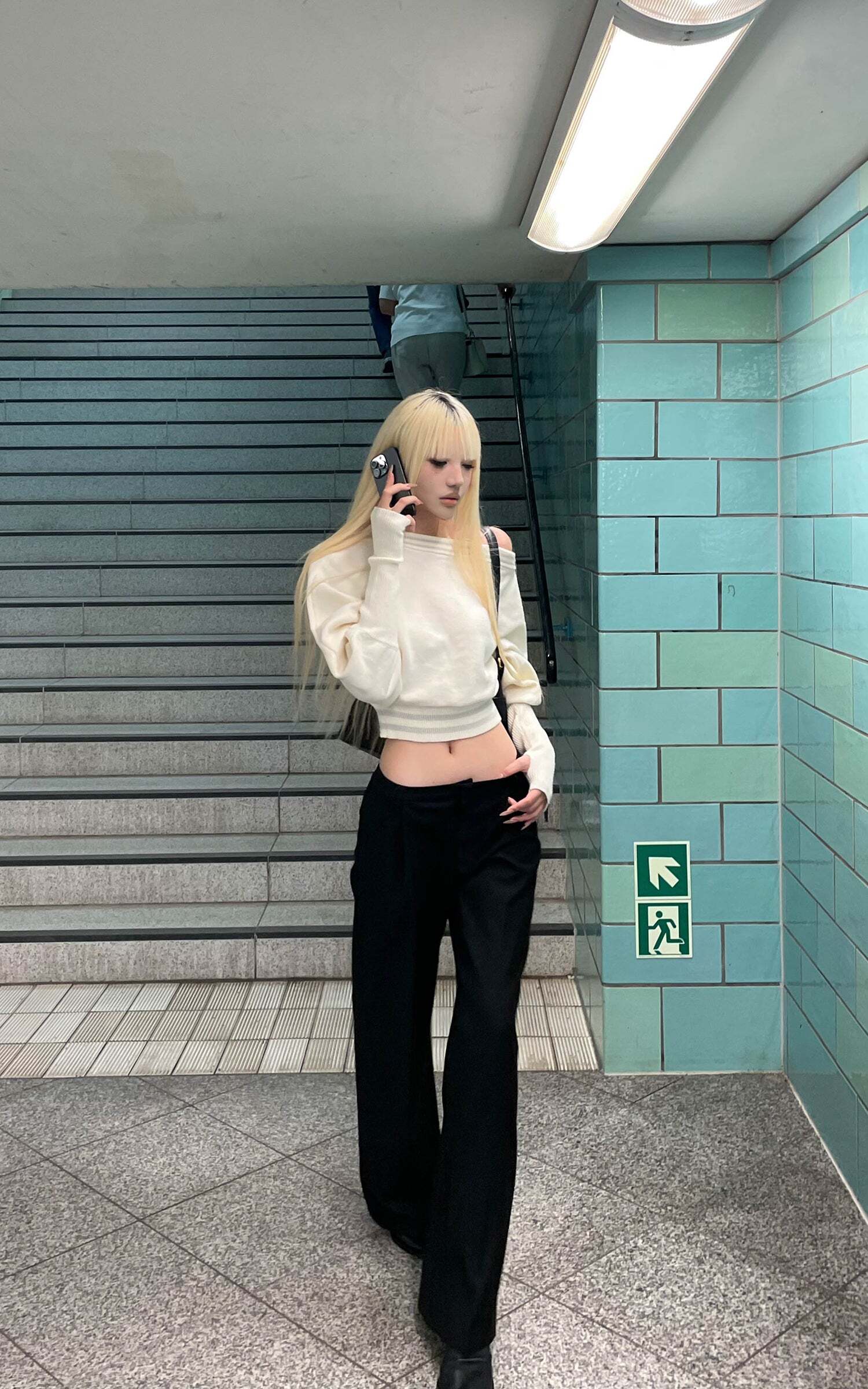 This sweater embodies minimal elegance with its soft knit texture and pared-down silhouette. The wide neckline drapes off the shoulder, creating an asymmetric reveal. A cropped proportion contrasts with elongated sleeves, featuring thumb openings that evoke a subtle sense of undone beauty. Its light fabric and restrained lines allow the garment to flow between body and space, leaving room for poetic silence.