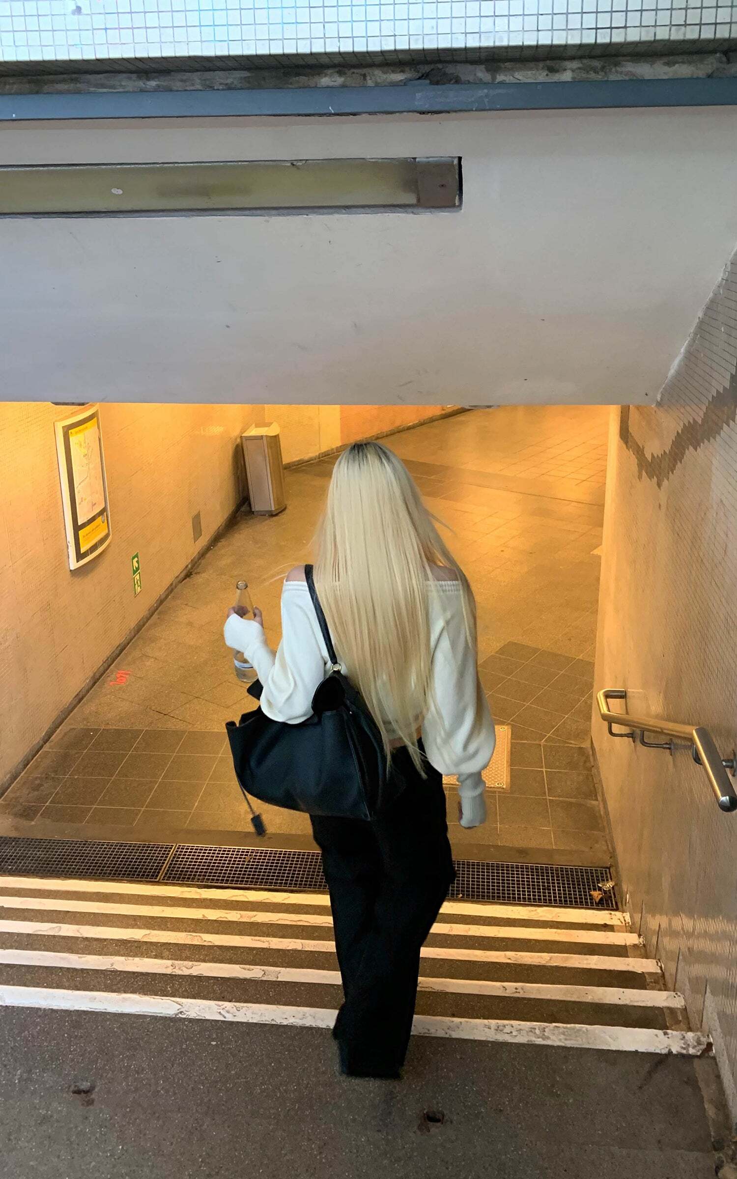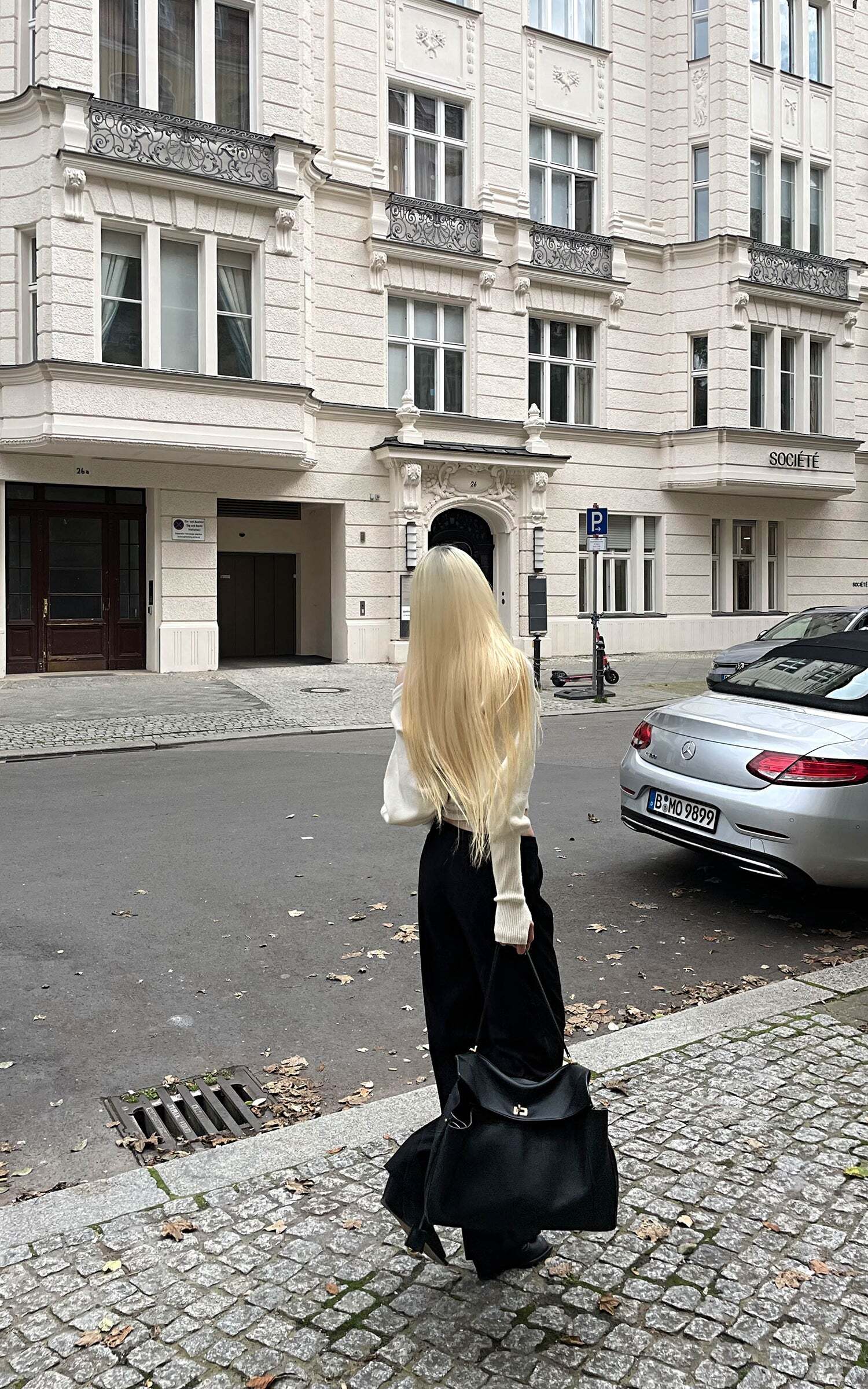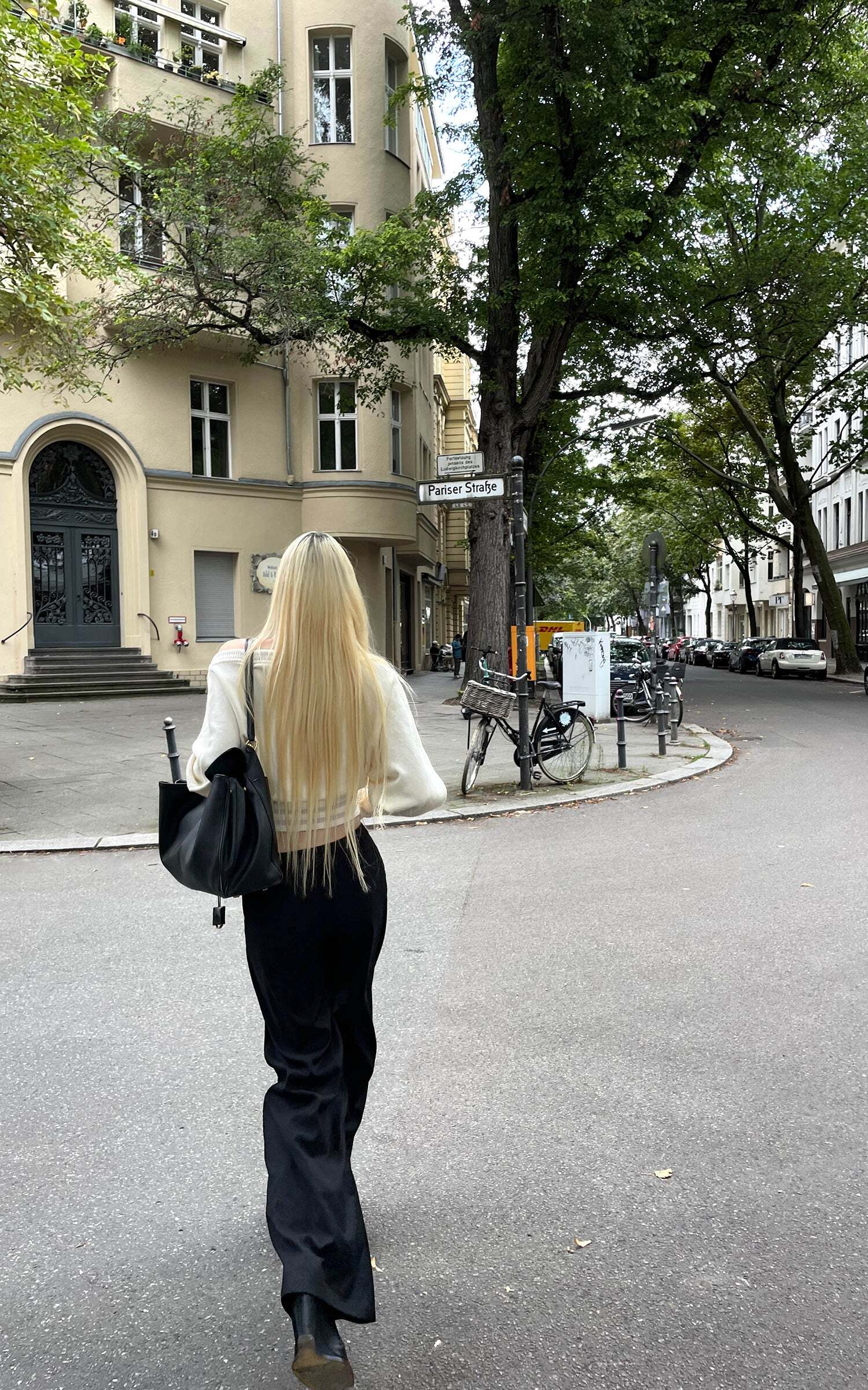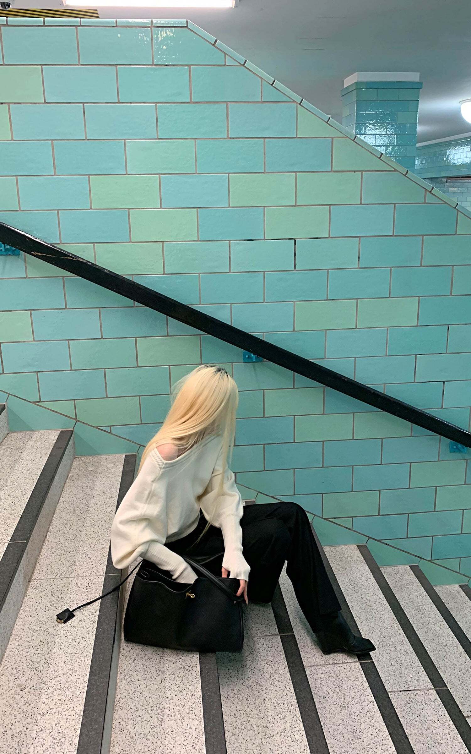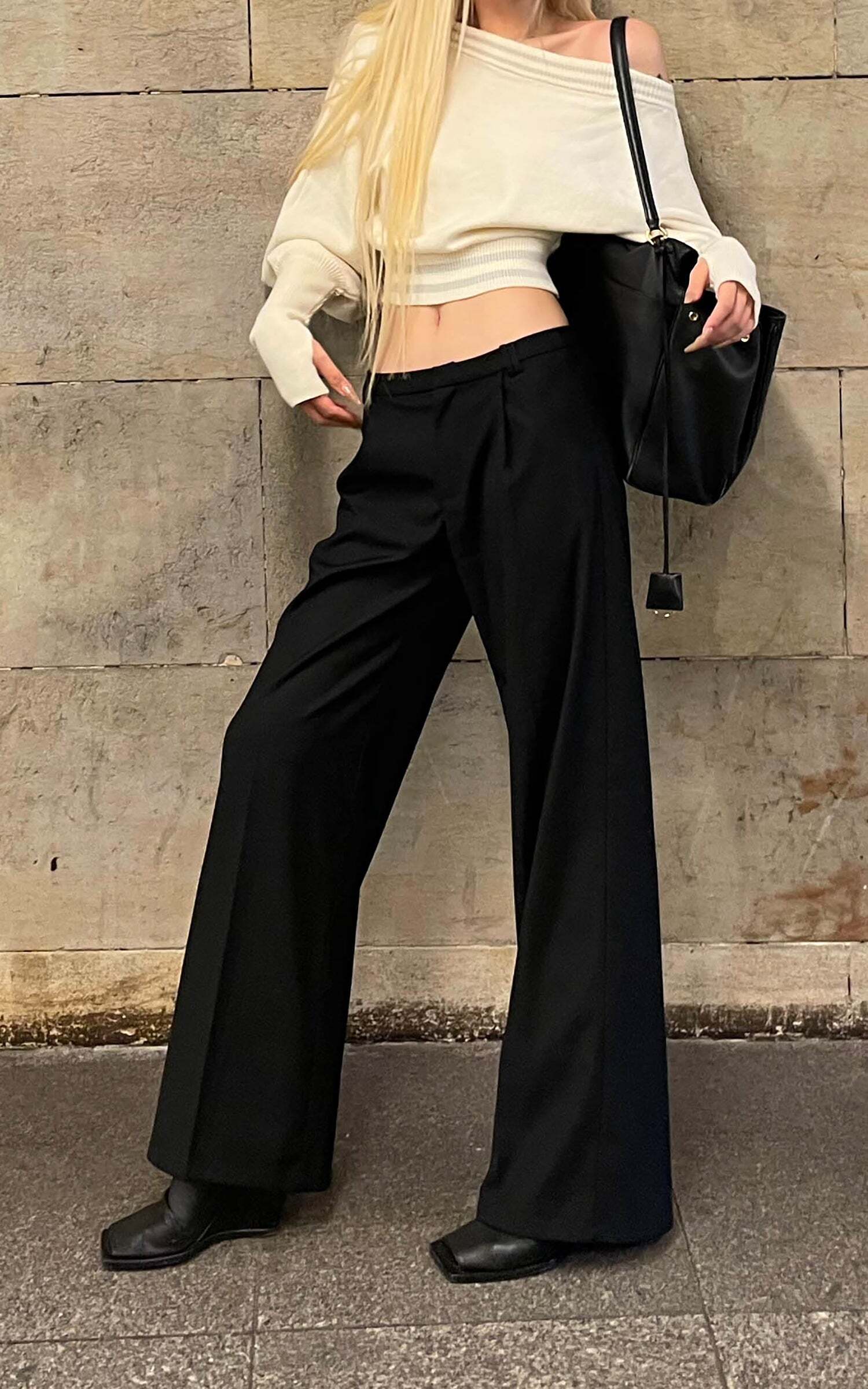 This sweater embodies minimal elegance with its soft knit texture and pared-down silhouette. The wide neckline drapes off the shoulder, creating an asymmetric reveal. A cropped proportion contrasts with elongated sleeves, featuring thumb openings that evoke a subtle sense of undone beauty. Its light fabric and restrained lines allow the garment to flow between body and space, leaving room for poetic silence.