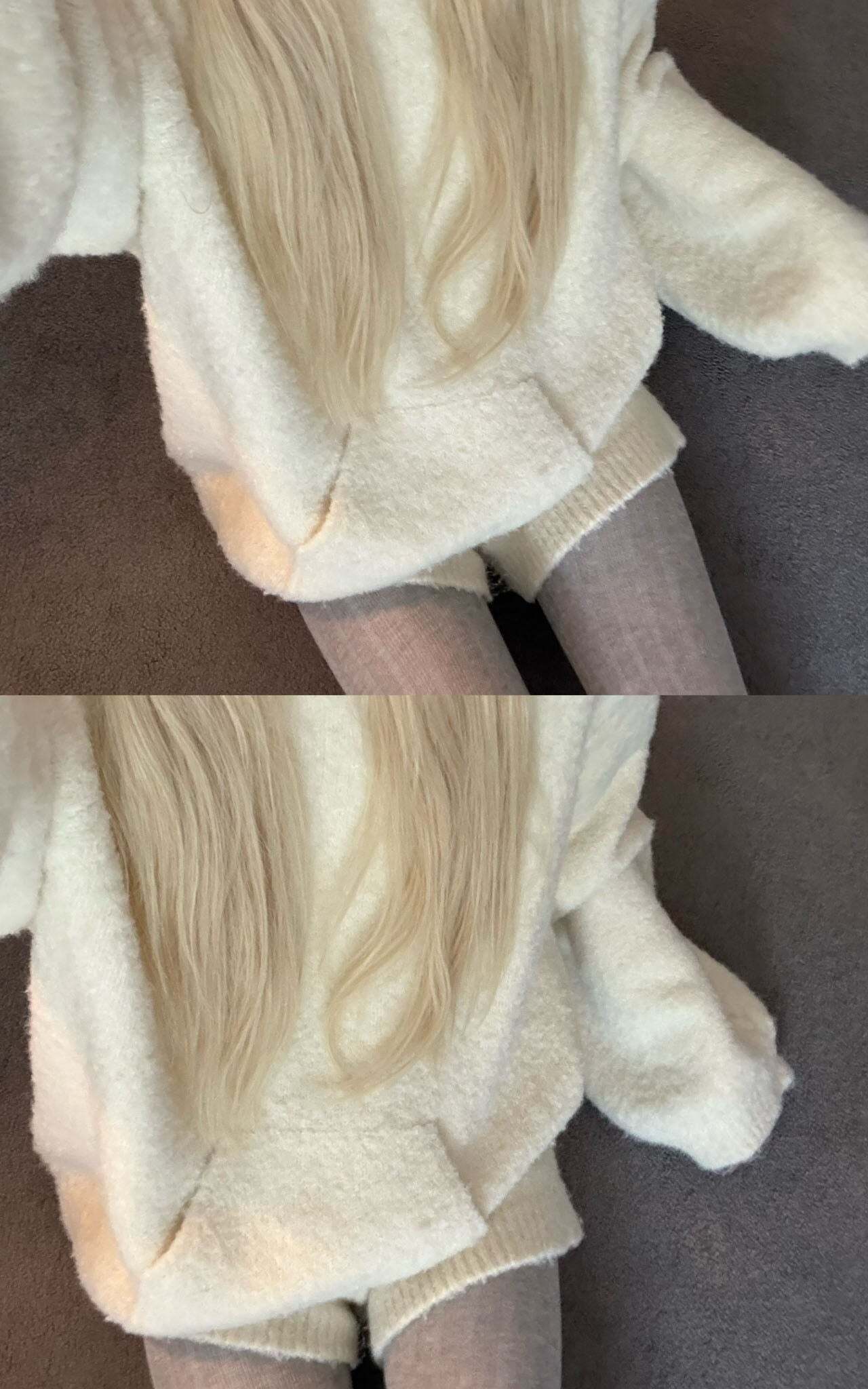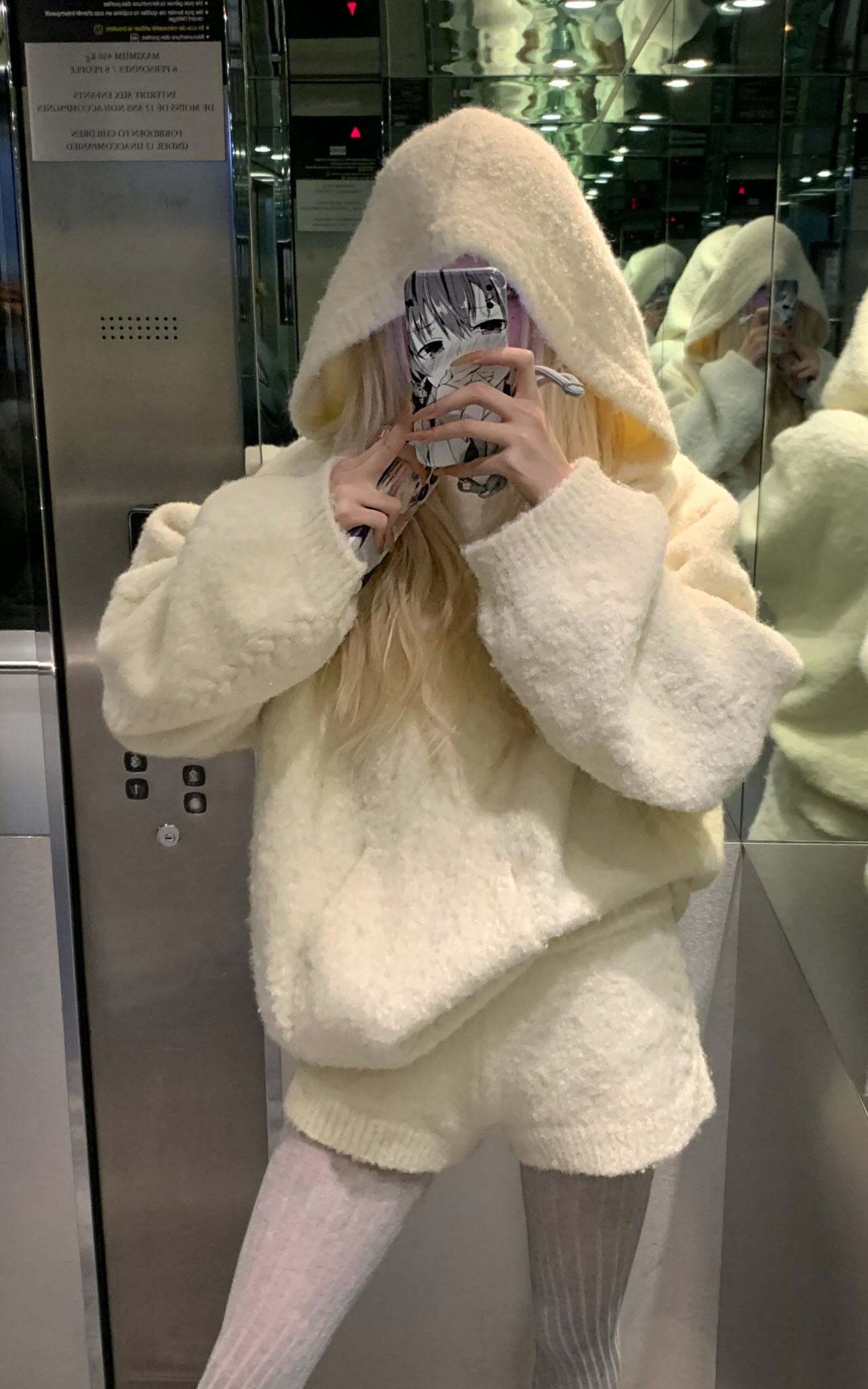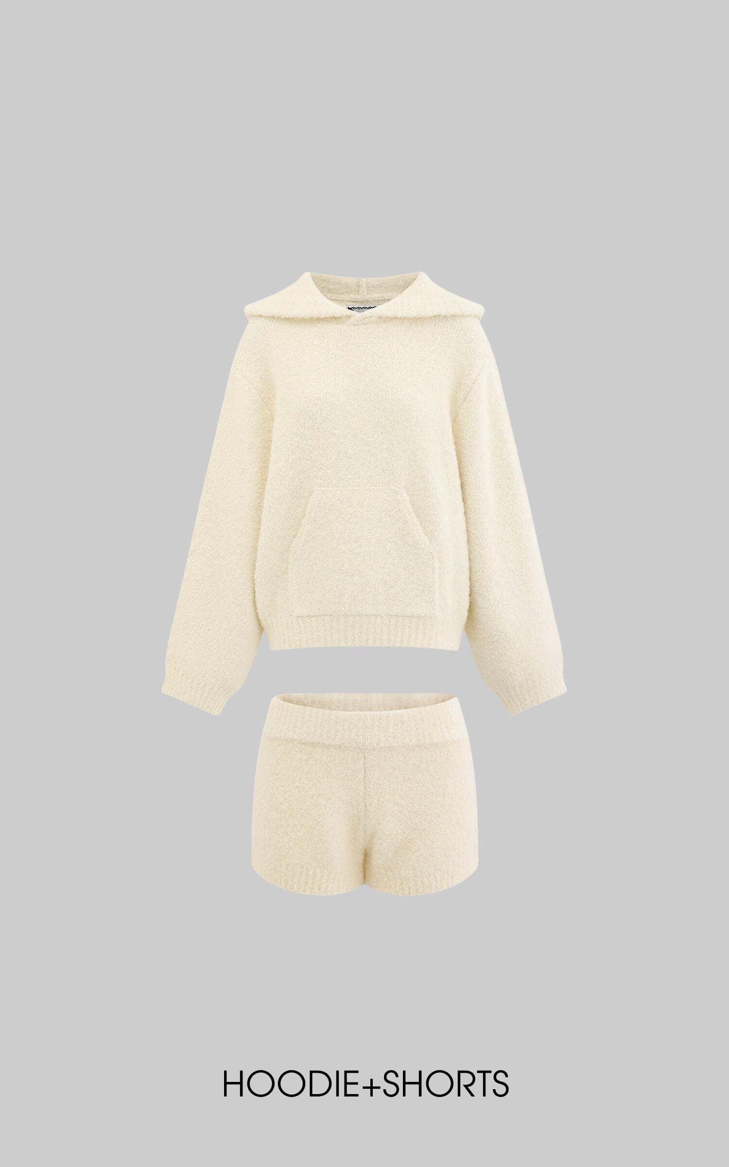 Crafted from ultra-soft fuzzy fabric, this hoodie set offers unparalleled comfort and warmth. The oversized silhouette paired with minimalist tailoring exudes an understated elegance. Featuring a practical front pocket on the hoodie and high-waisted shorts, it strikes a harmonious balance between casual ease and refined style. Perfect for lounging at home or a leisurely walk outside, this set is an ideal choice for versatile comfort.