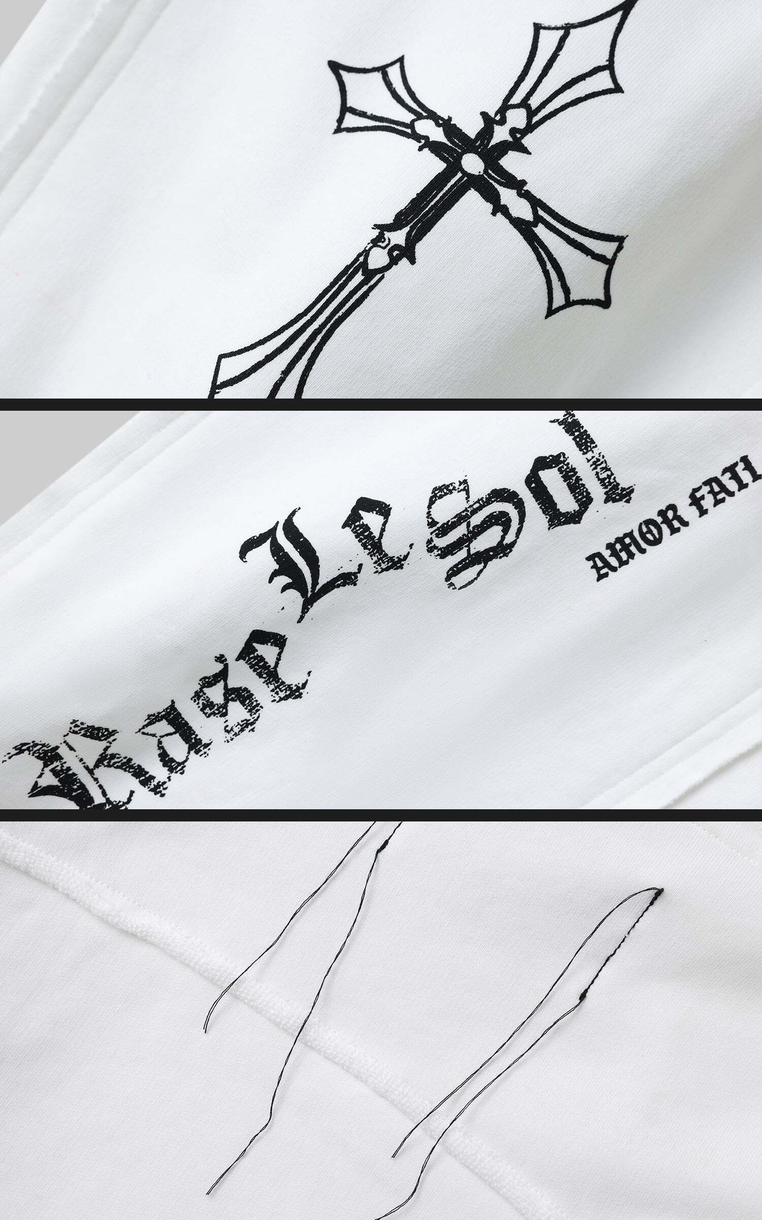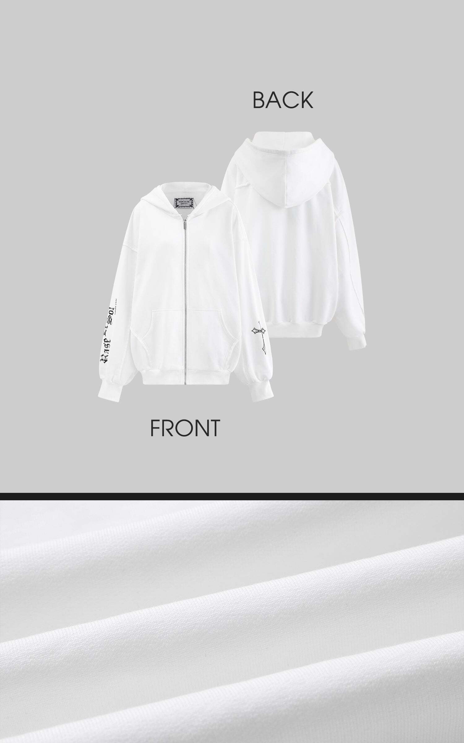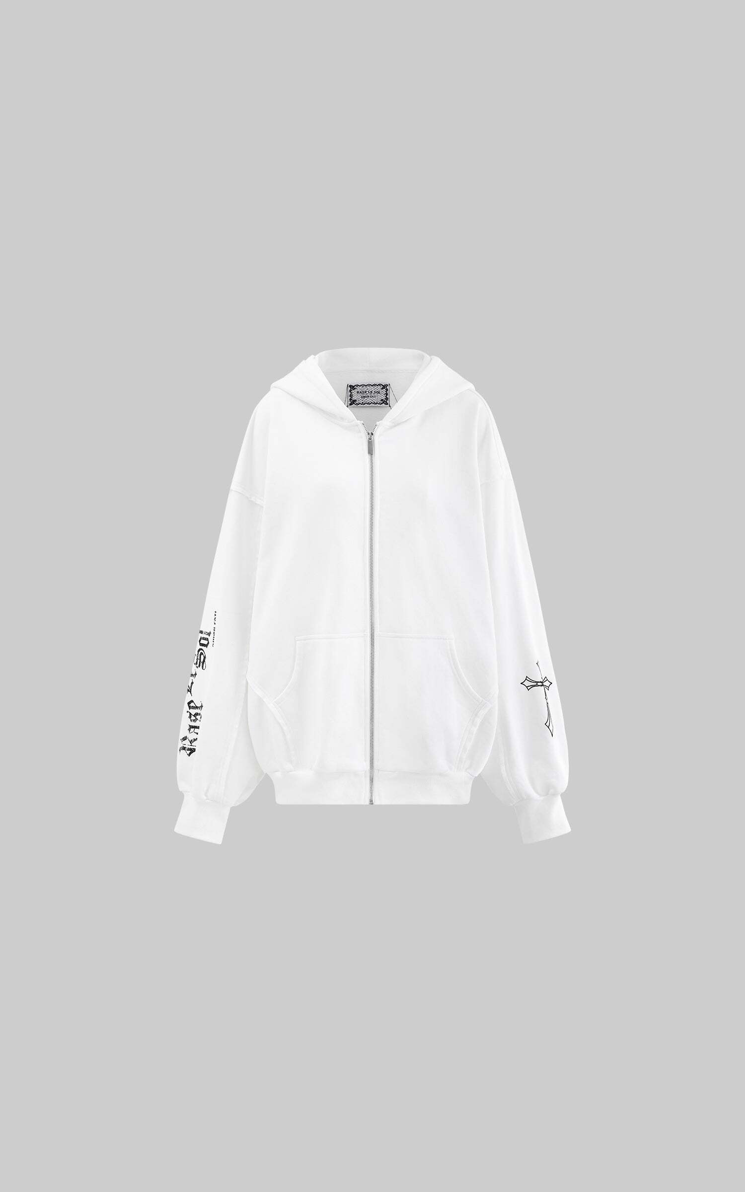 An oversized silhouette redefines this classic zip-up hoodie, featuring bold sleeve lettering and cross detailing for a modern, rebellious twist. The roomy fit and dropped shoulders offer a laid-back yet structured look, perfect for layering or wearing on its own for an effortlessly cool style.