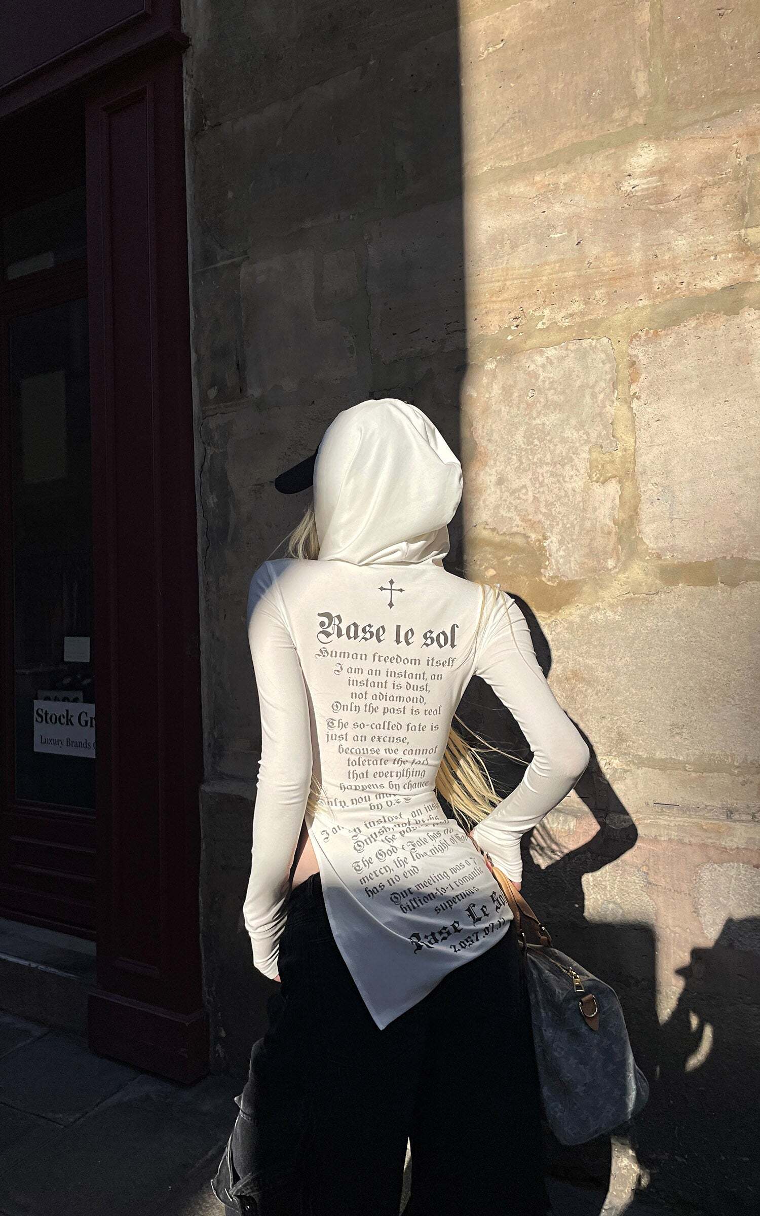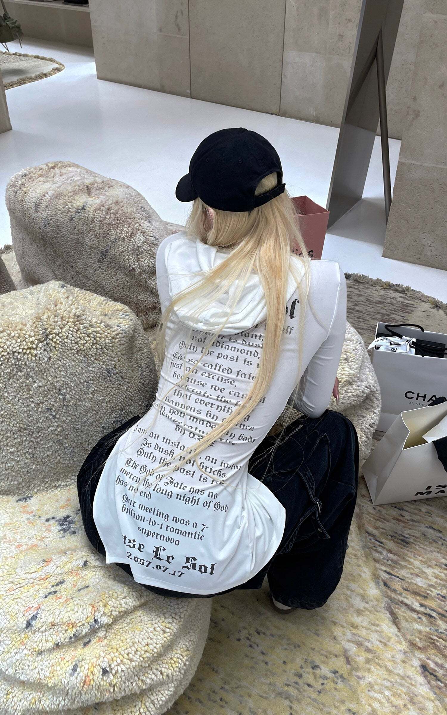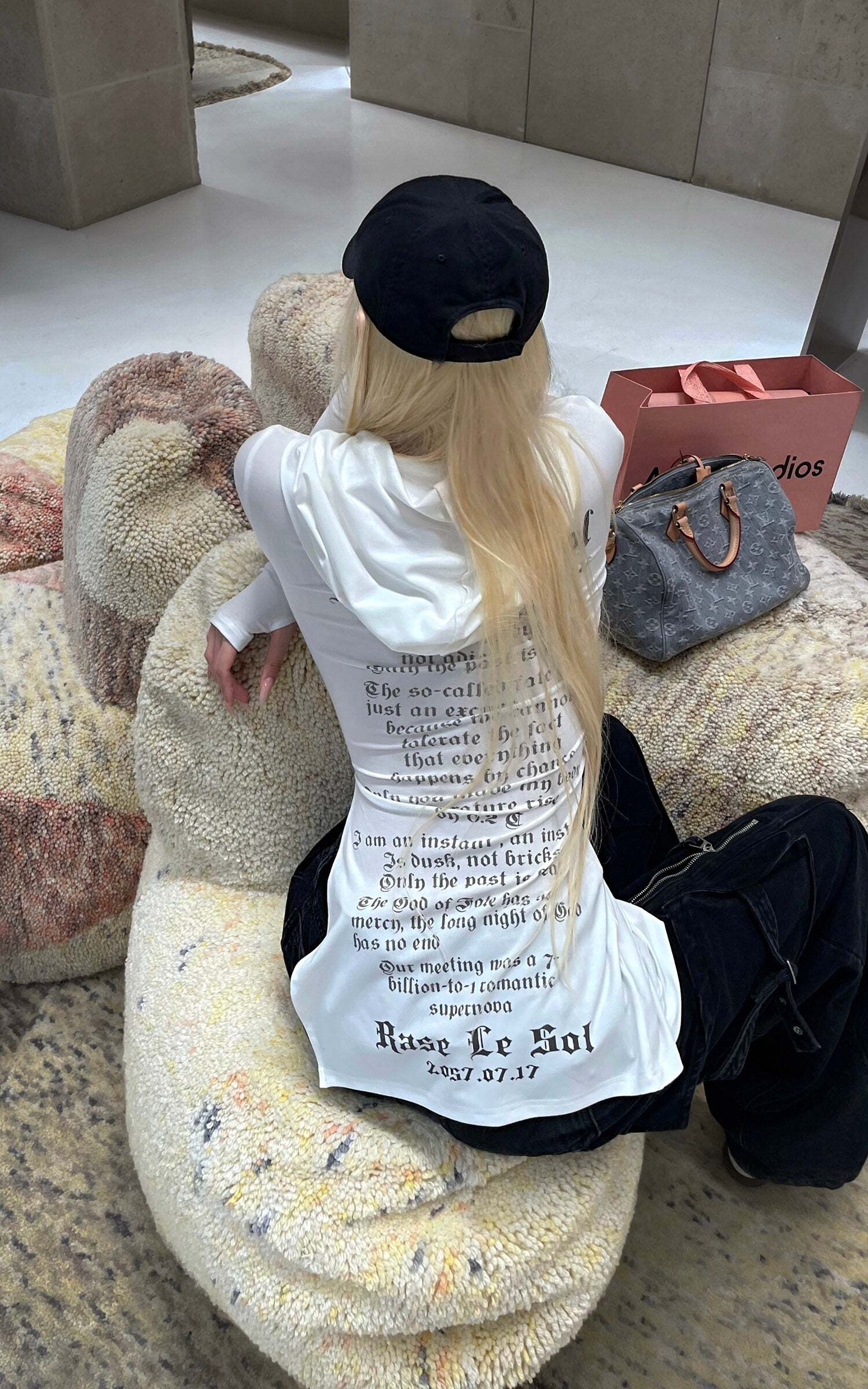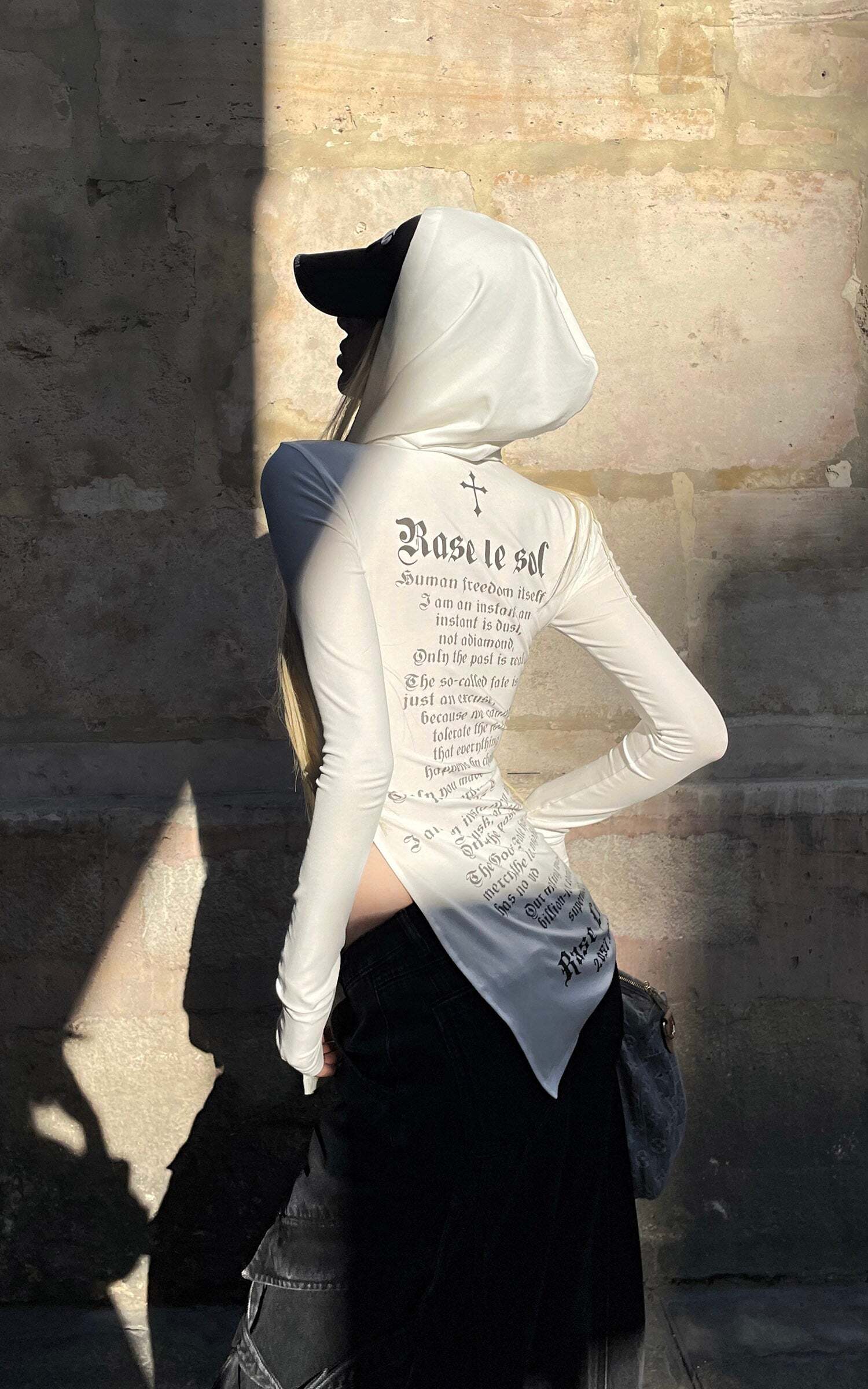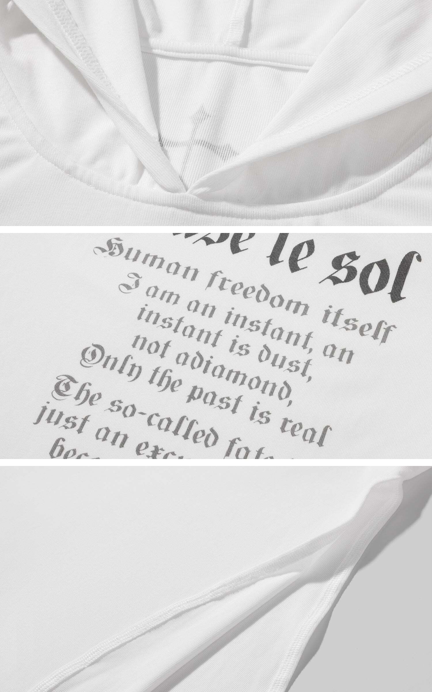 This lightweight hoodie clings to the body like a second skin, crafted from a stretch-knit fabric that breathes with ease. The back features an elongated Gothic script poem—whispered declarations etched in ink, breathing tension into stillness. An asymmetric slit hem disrupts the symmetry, slicing the silhouette into expressive motion. Whether paired with structured cargo trousers or a draped skirt, it evokes a solitary narrative in the quiet hum of the city.