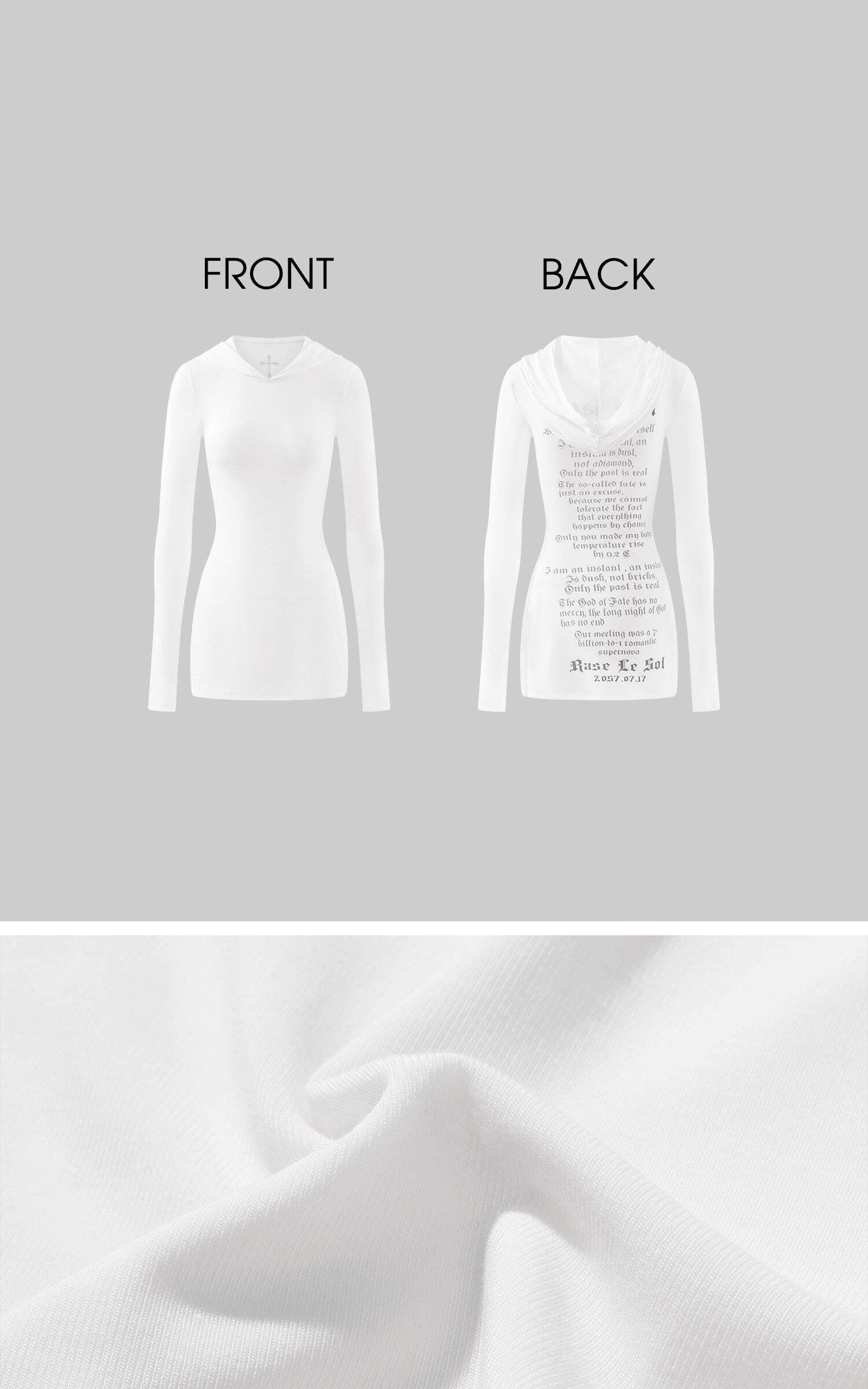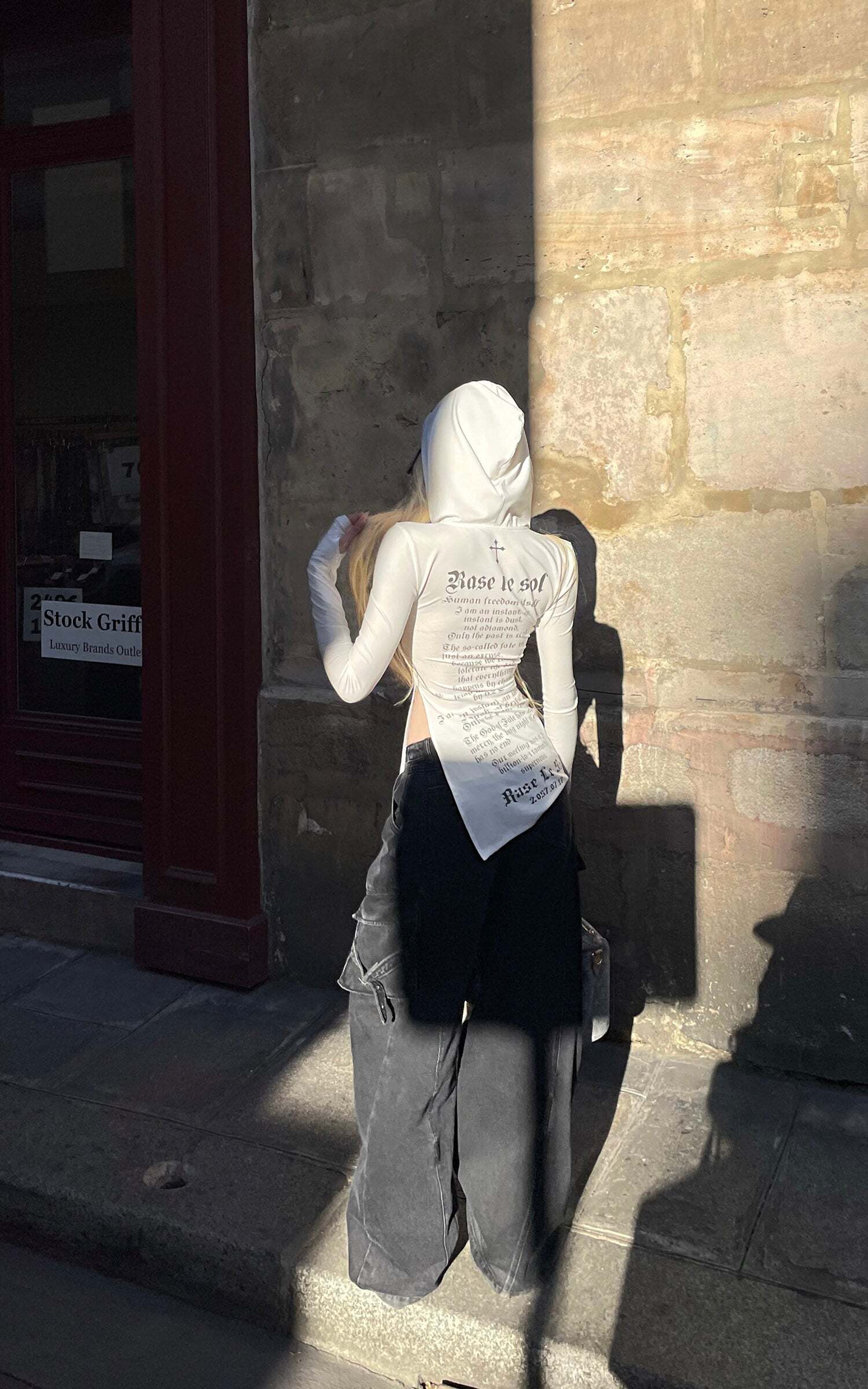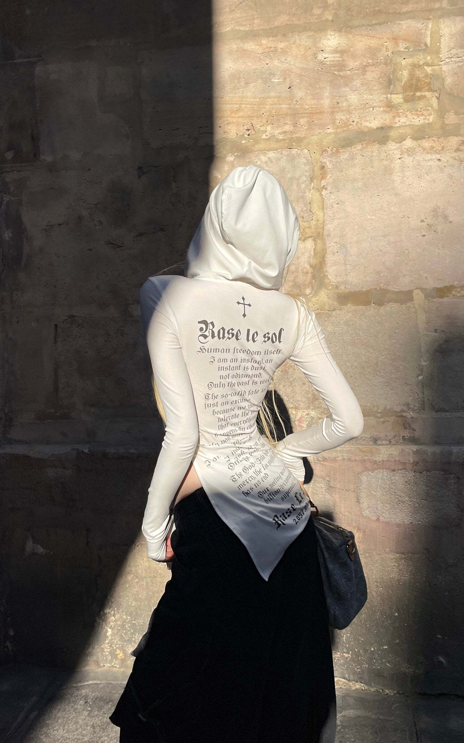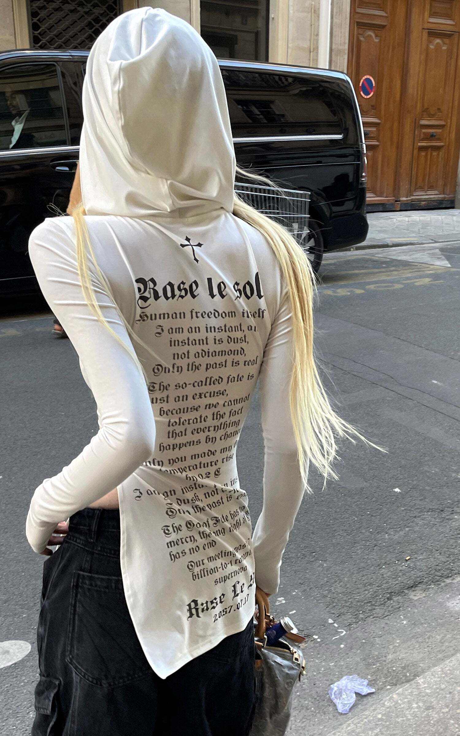 This lightweight hoodie clings to the body like a second skin, crafted from a stretch-knit fabric that breathes with ease. The back features an elongated Gothic script poem—whispered declarations etched in ink, breathing tension into stillness. An asymmetric slit hem disrupts the symmetry, slicing the silhouette into expressive motion. Whether paired with structured cargo trousers or a draped skirt, it evokes a solitary narrative in the quiet hum of the city.
