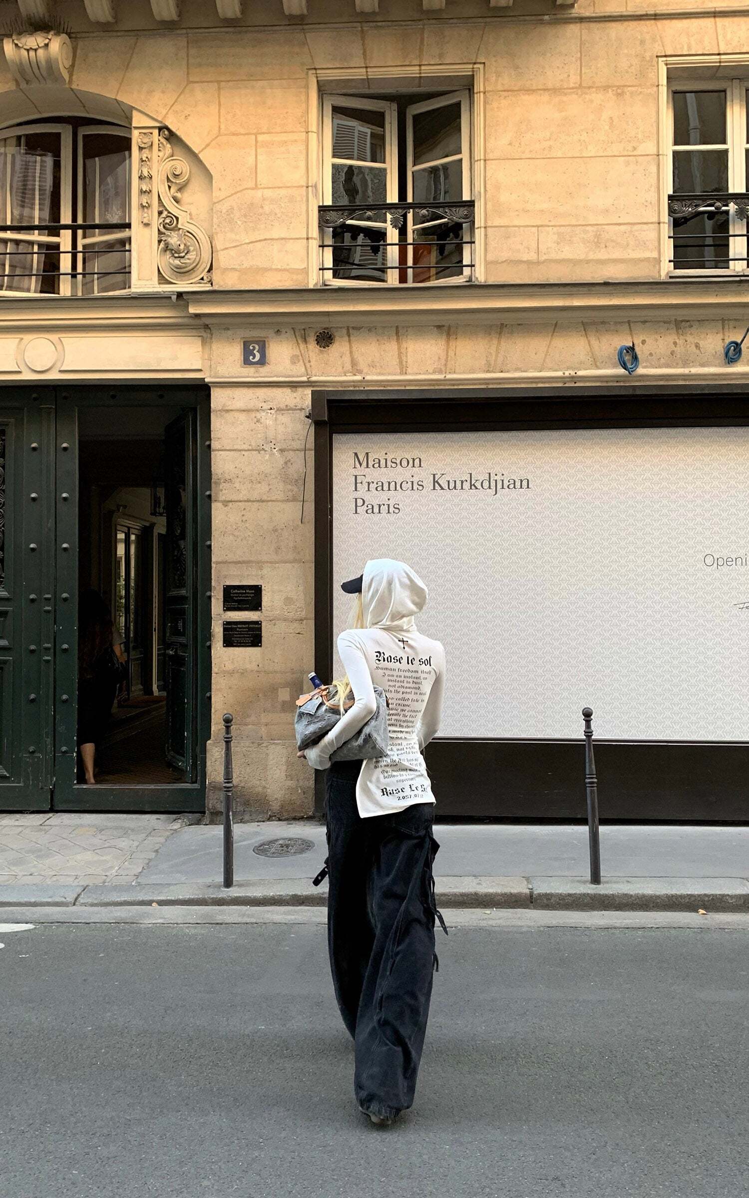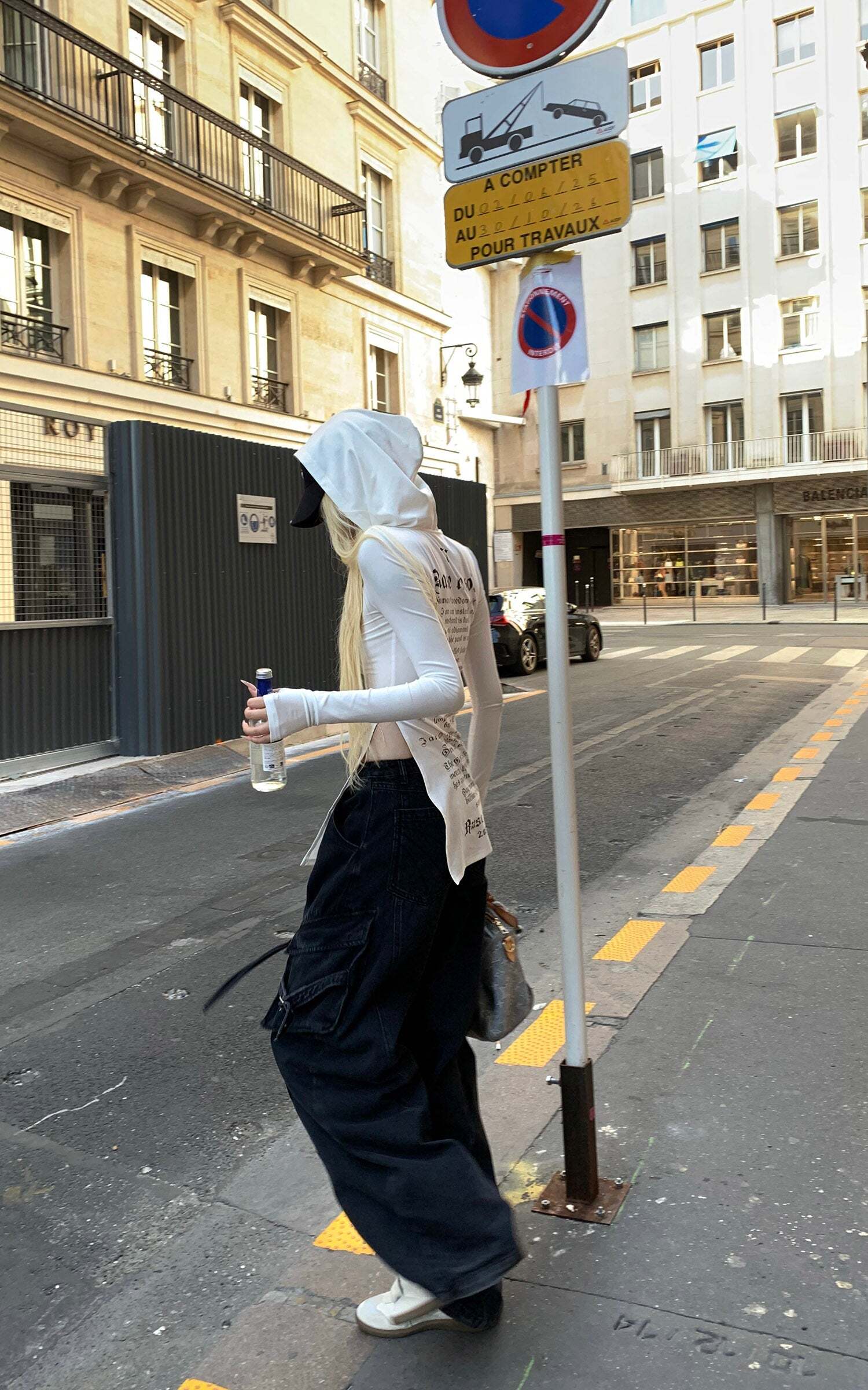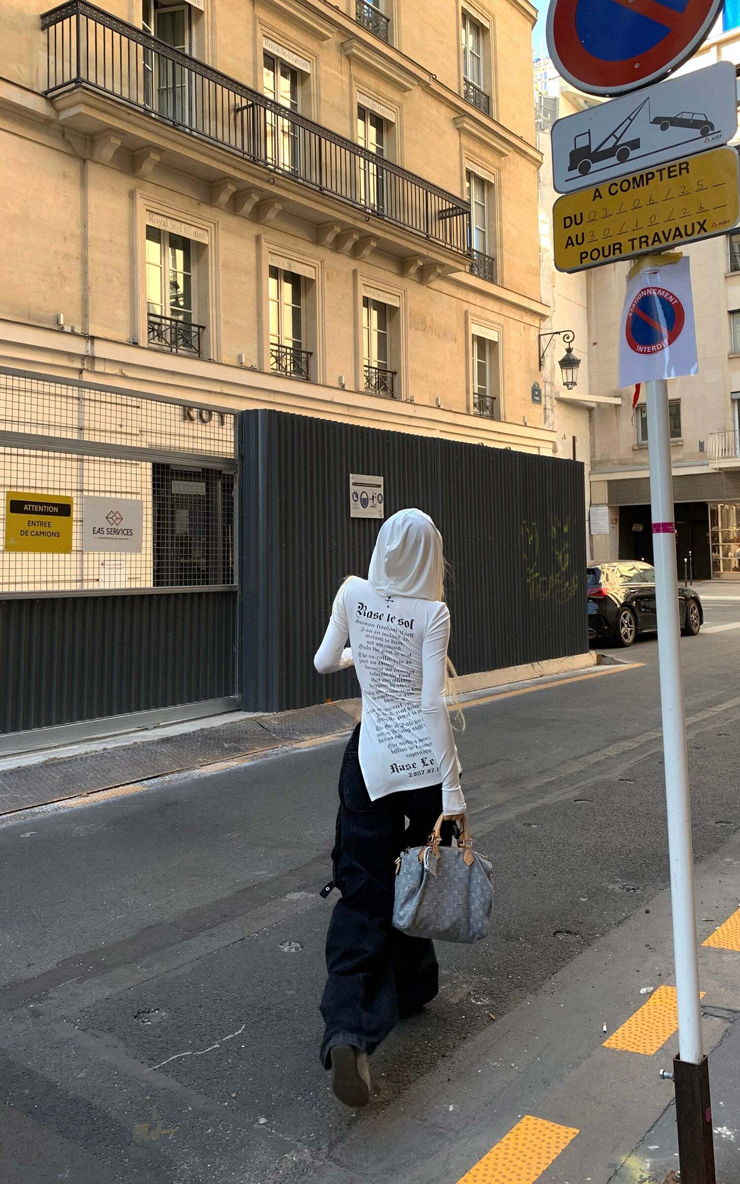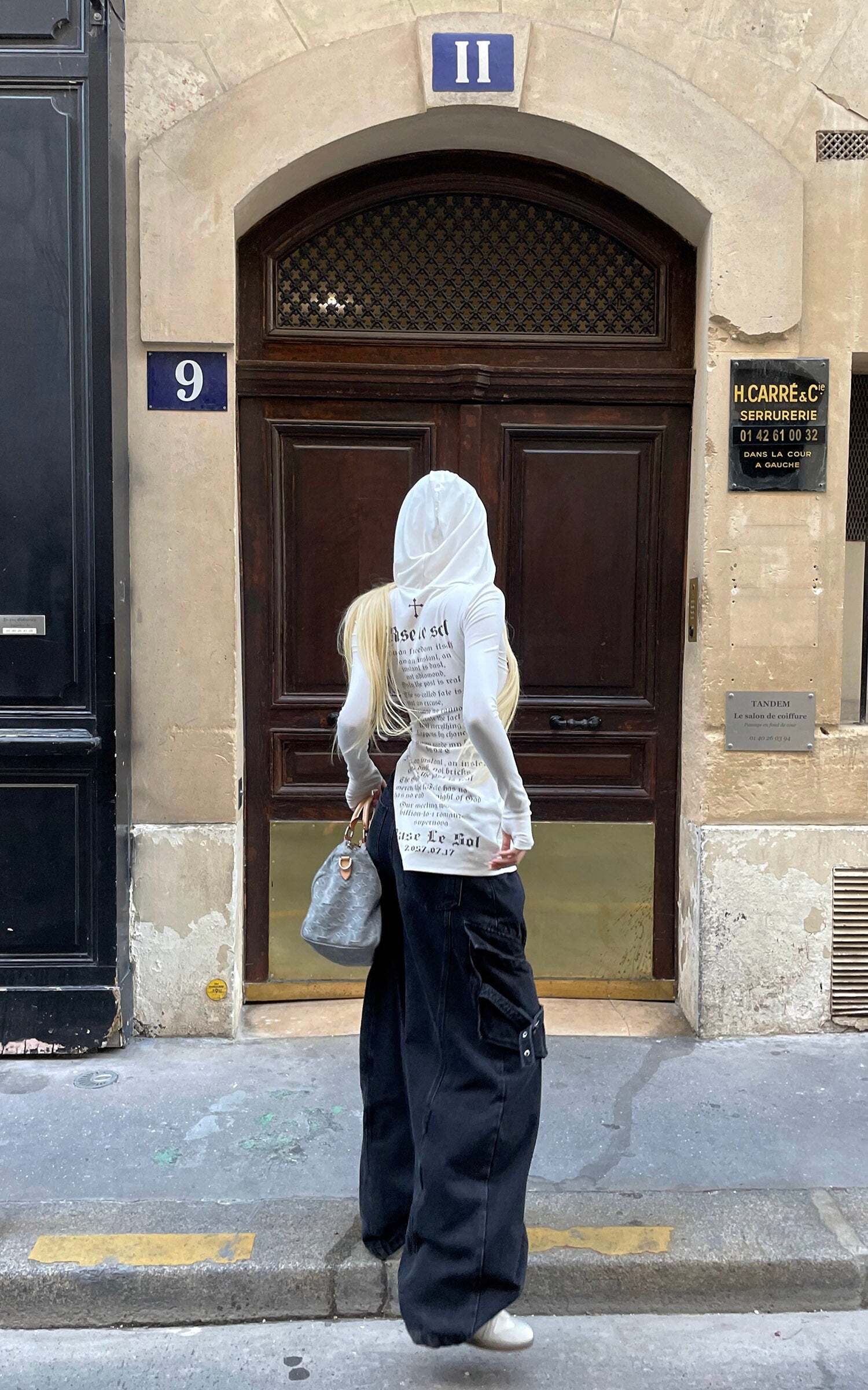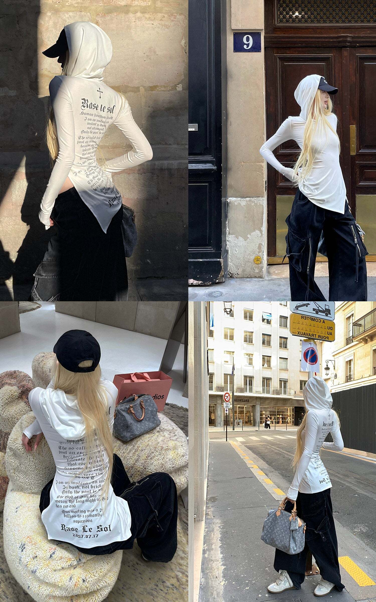 This lightweight hoodie clings to the body like a second skin, crafted from a stretch-knit fabric that breathes with ease. The back features an elongated Gothic script poem—whispered declarations etched in ink, breathing tension into stillness. An asymmetric slit hem disrupts the symmetry, slicing the silhouette into expressive motion. Whether paired with structured cargo trousers or a draped skirt, it evokes a solitary narrative in the quiet hum of the city.