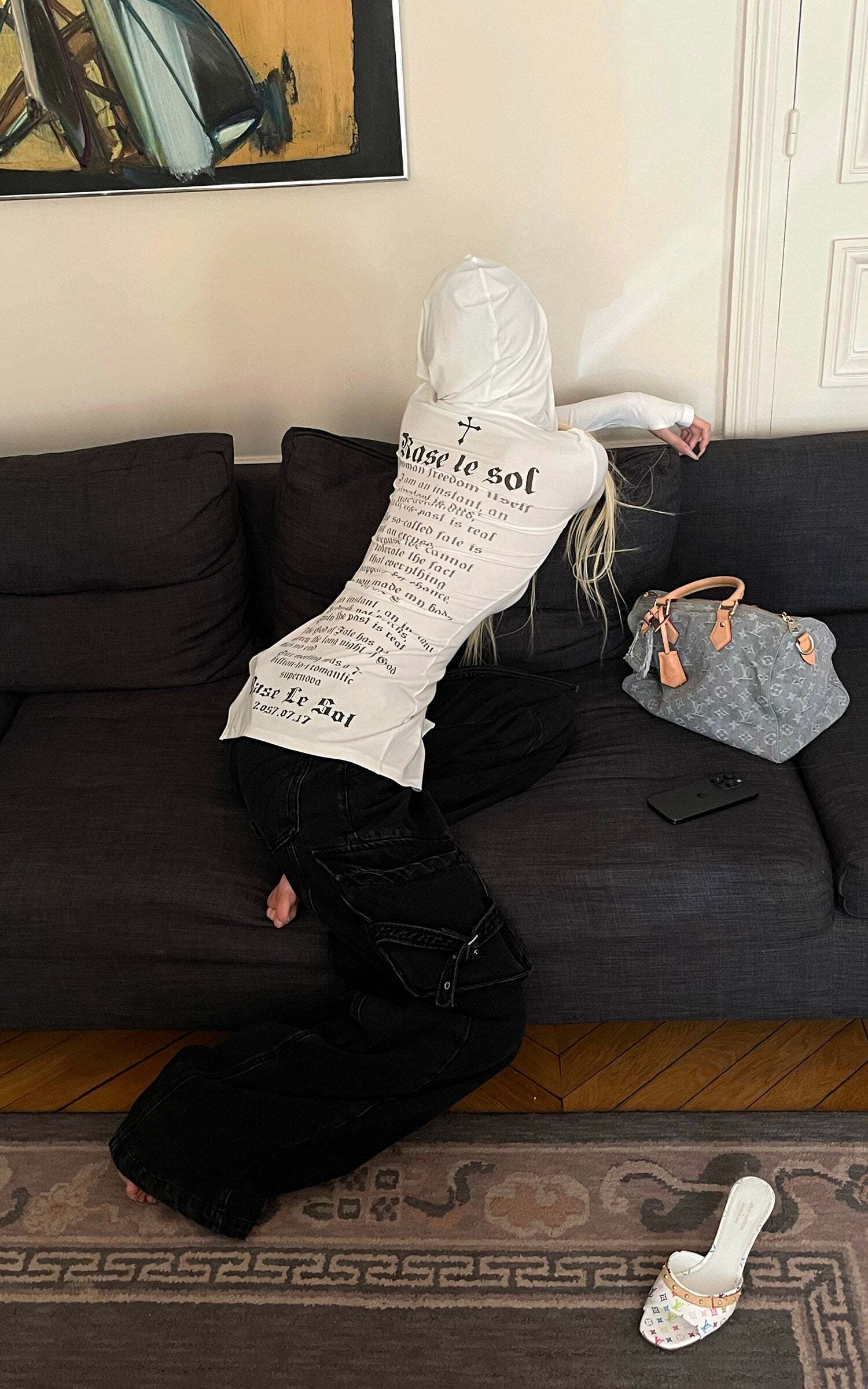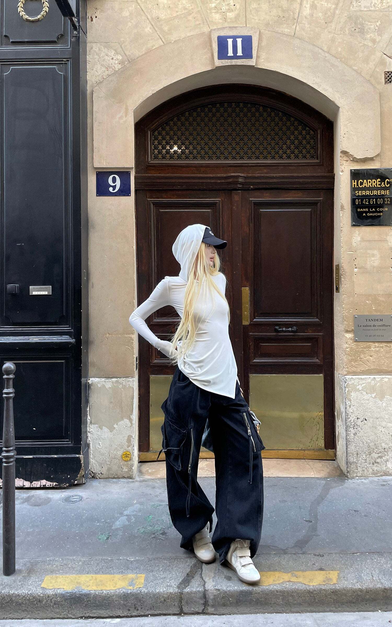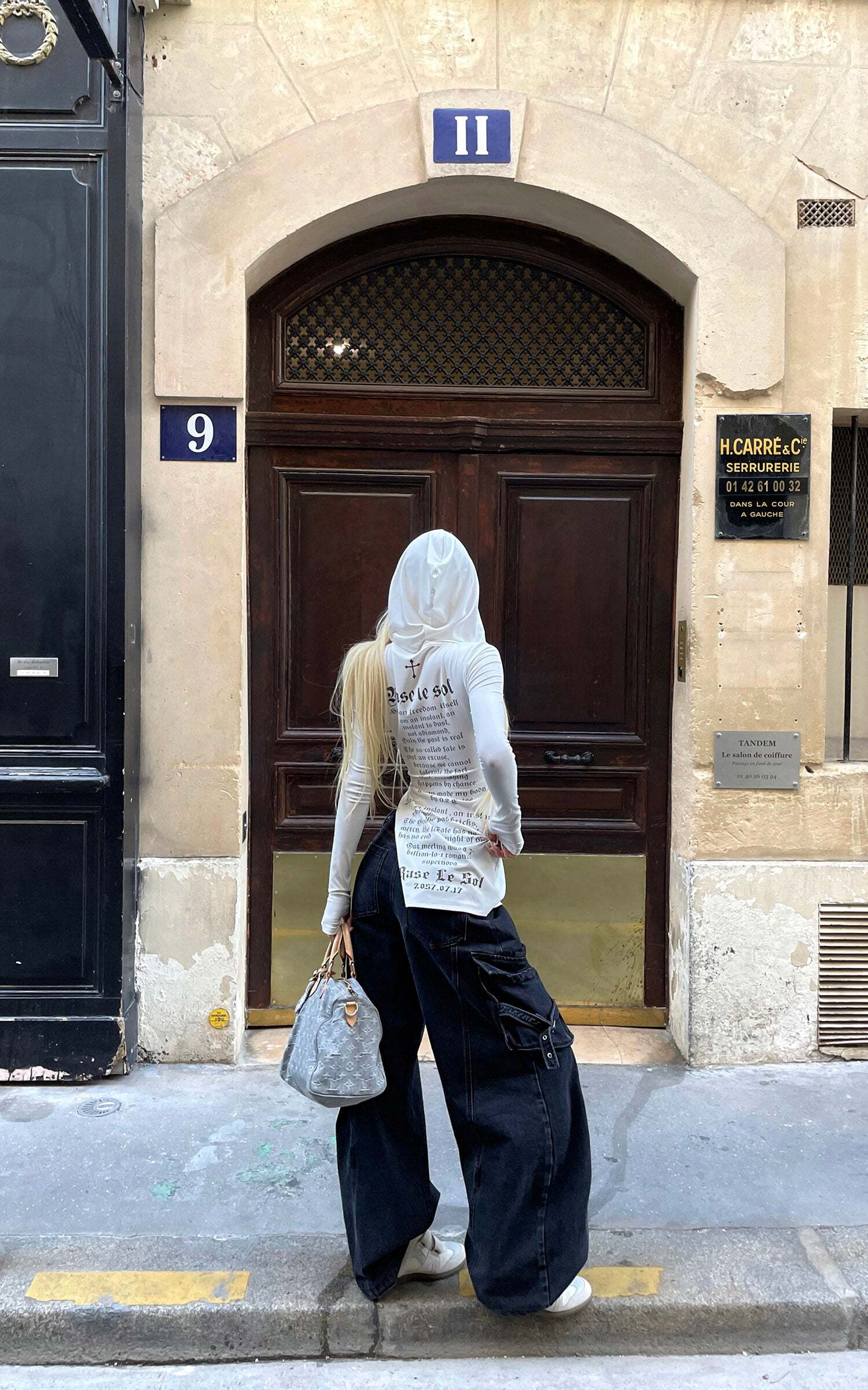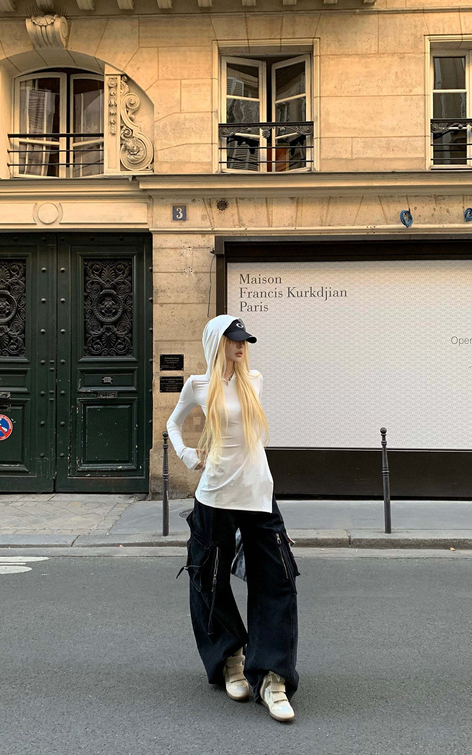 This lightweight hoodie clings to the body like a second skin, crafted from a stretch-knit fabric that breathes with ease. The back features an elongated Gothic script poem—whispered declarations etched in ink, breathing tension into stillness. An asymmetric slit hem disrupts the symmetry, slicing the silhouette into expressive motion. Whether paired with structured cargo trousers or a draped skirt, it evokes a solitary narrative in the quiet hum of the city.
