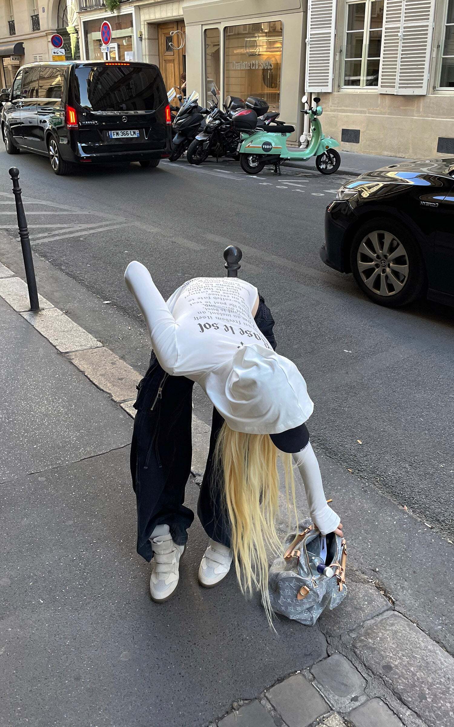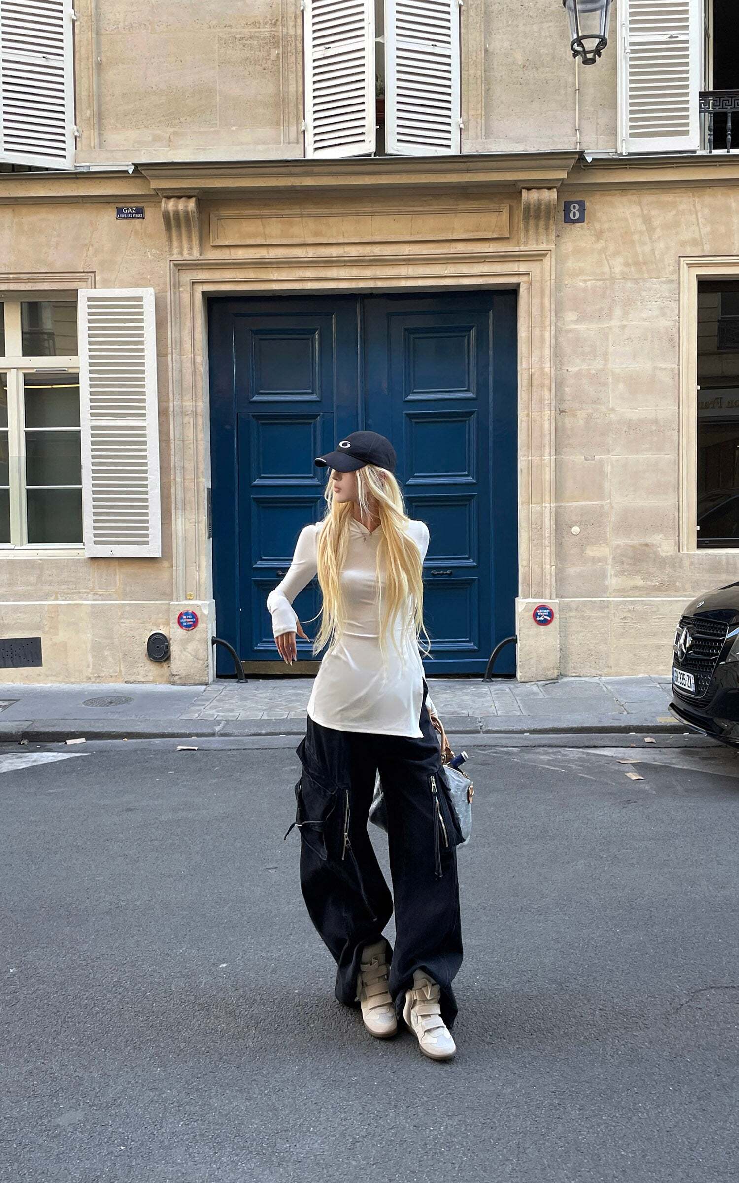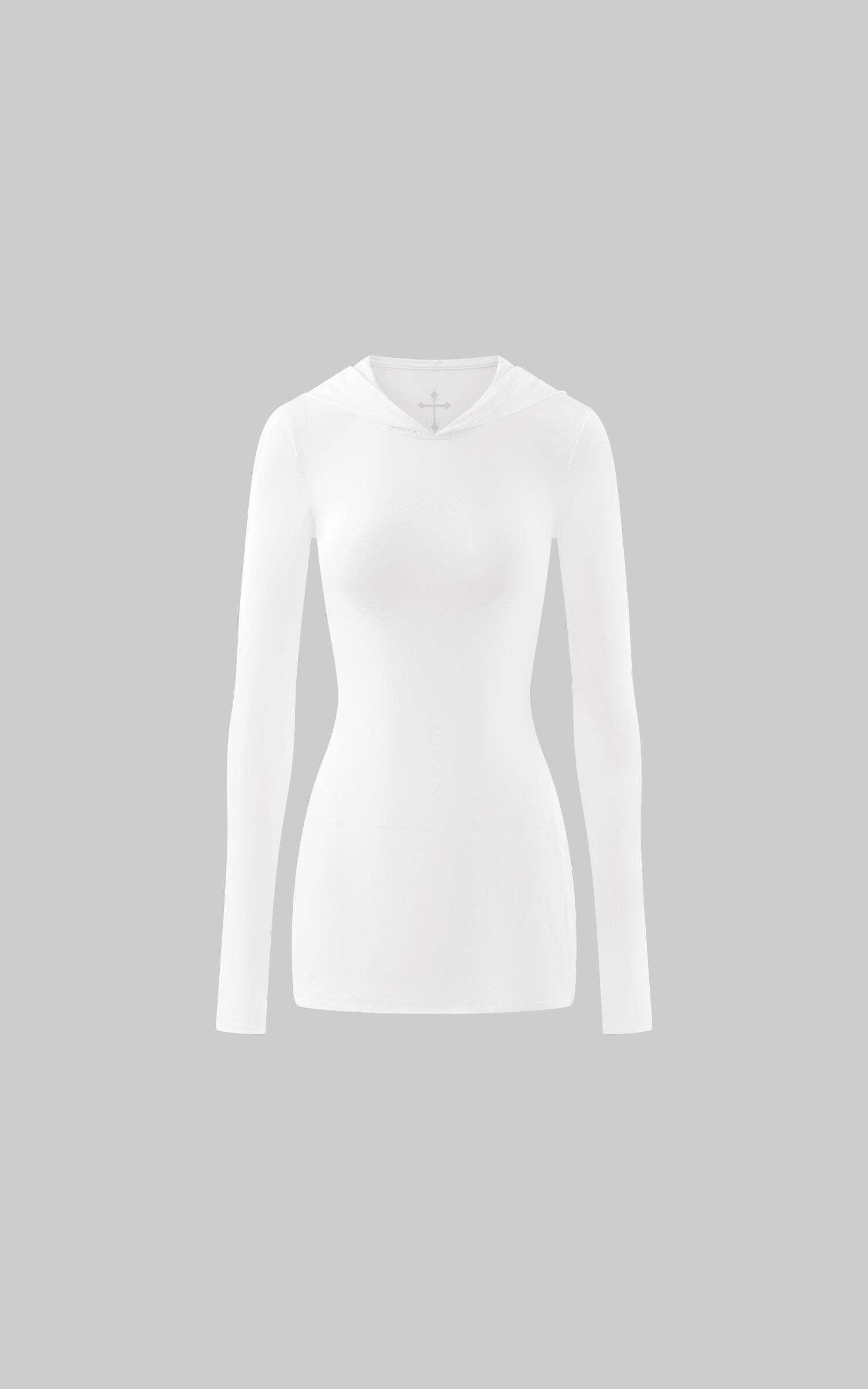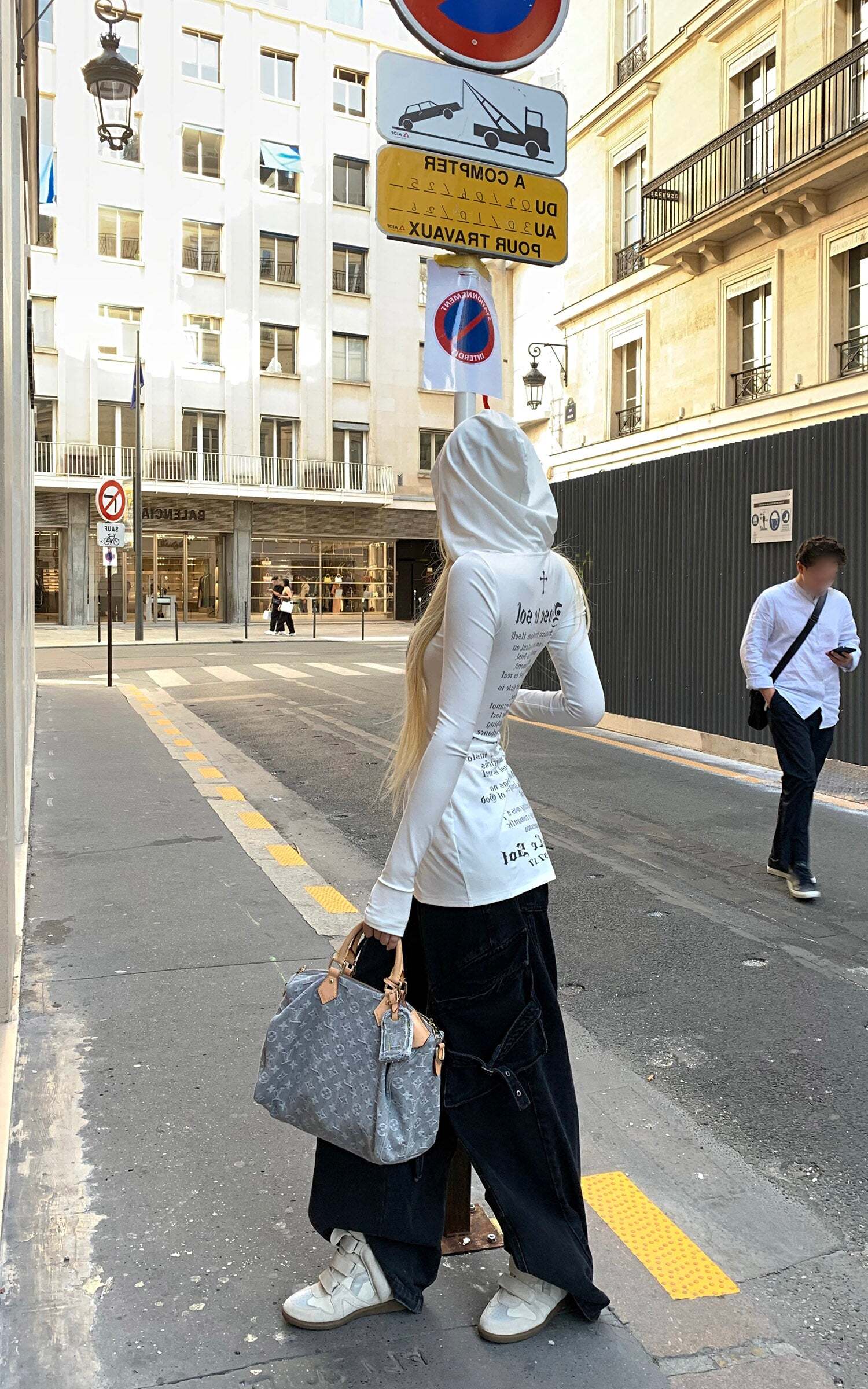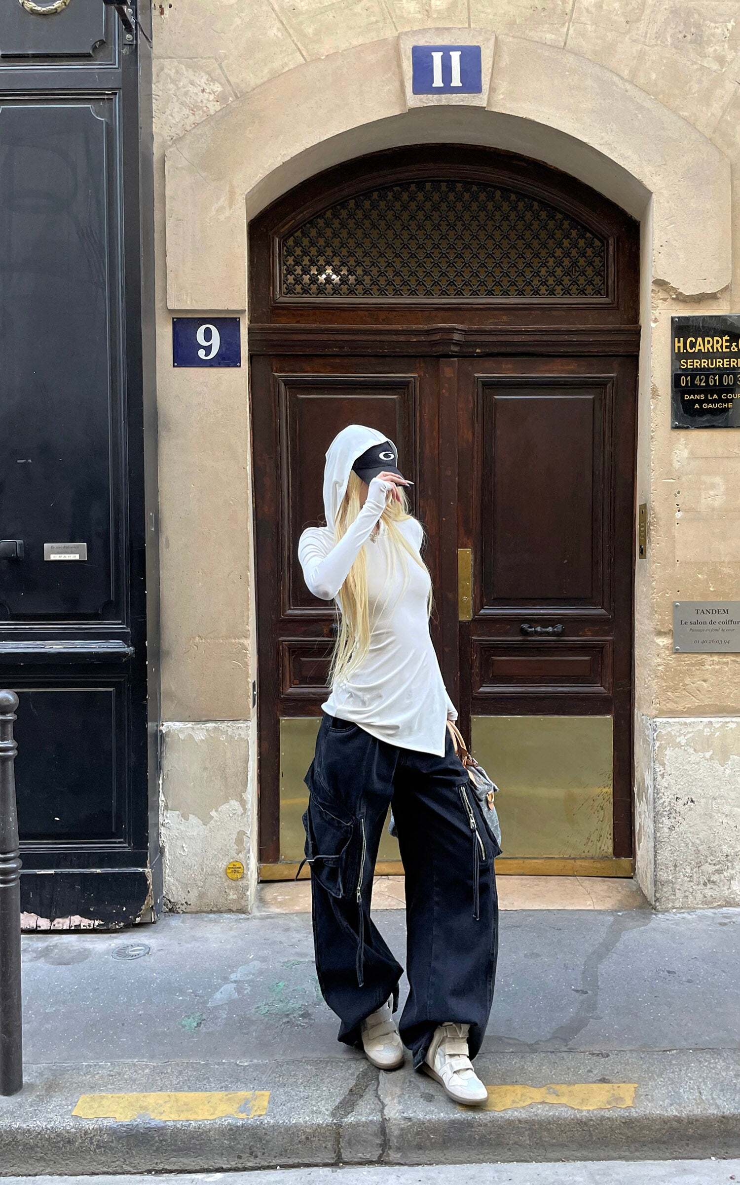 This lightweight hoodie clings to the body like a second skin, crafted from a stretch-knit fabric that breathes with ease. The back features an elongated Gothic script poem—whispered declarations etched in ink, breathing tension into stillness. An asymmetric slit hem disrupts the symmetry, slicing the silhouette into expressive motion. Whether paired with structured cargo trousers or a draped skirt, it evokes a solitary narrative in the quiet hum of the city.