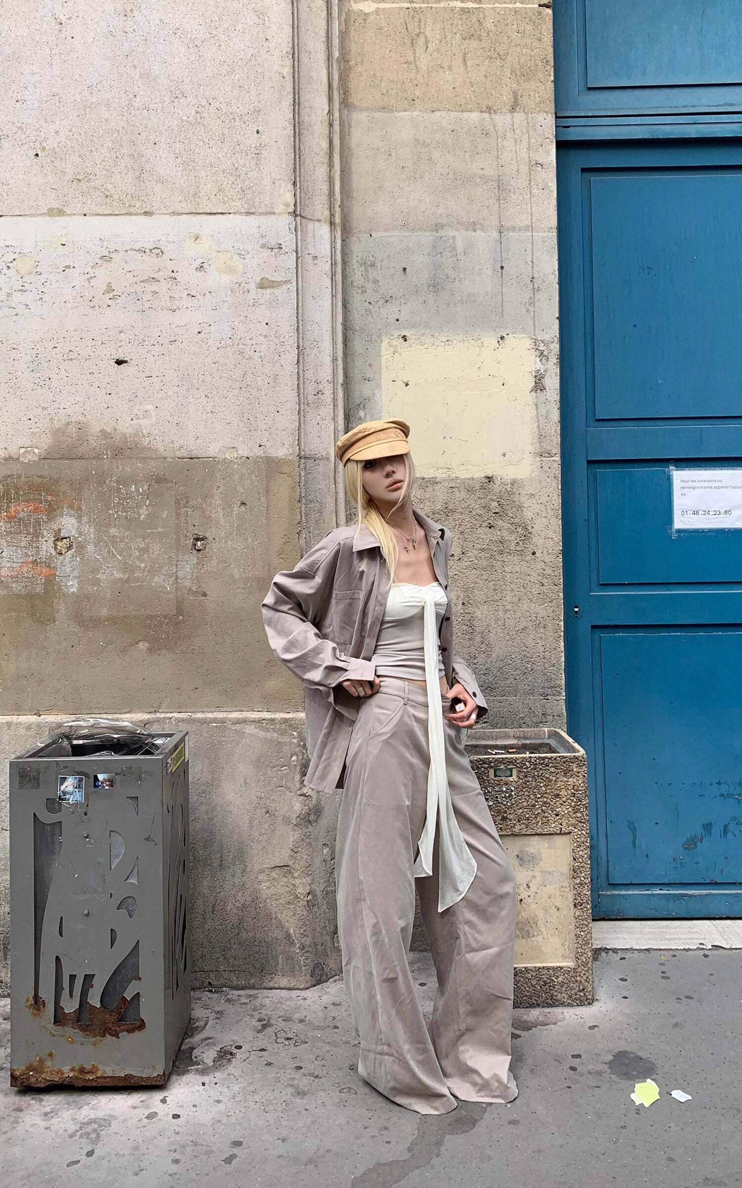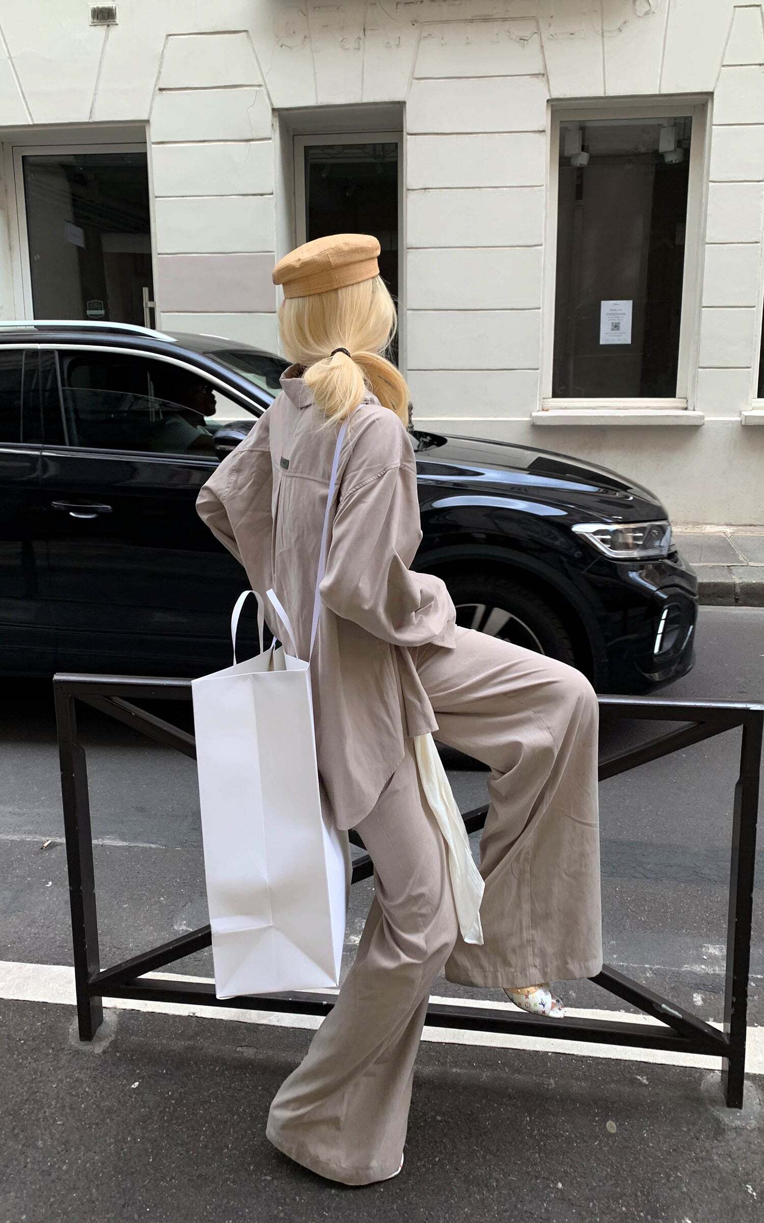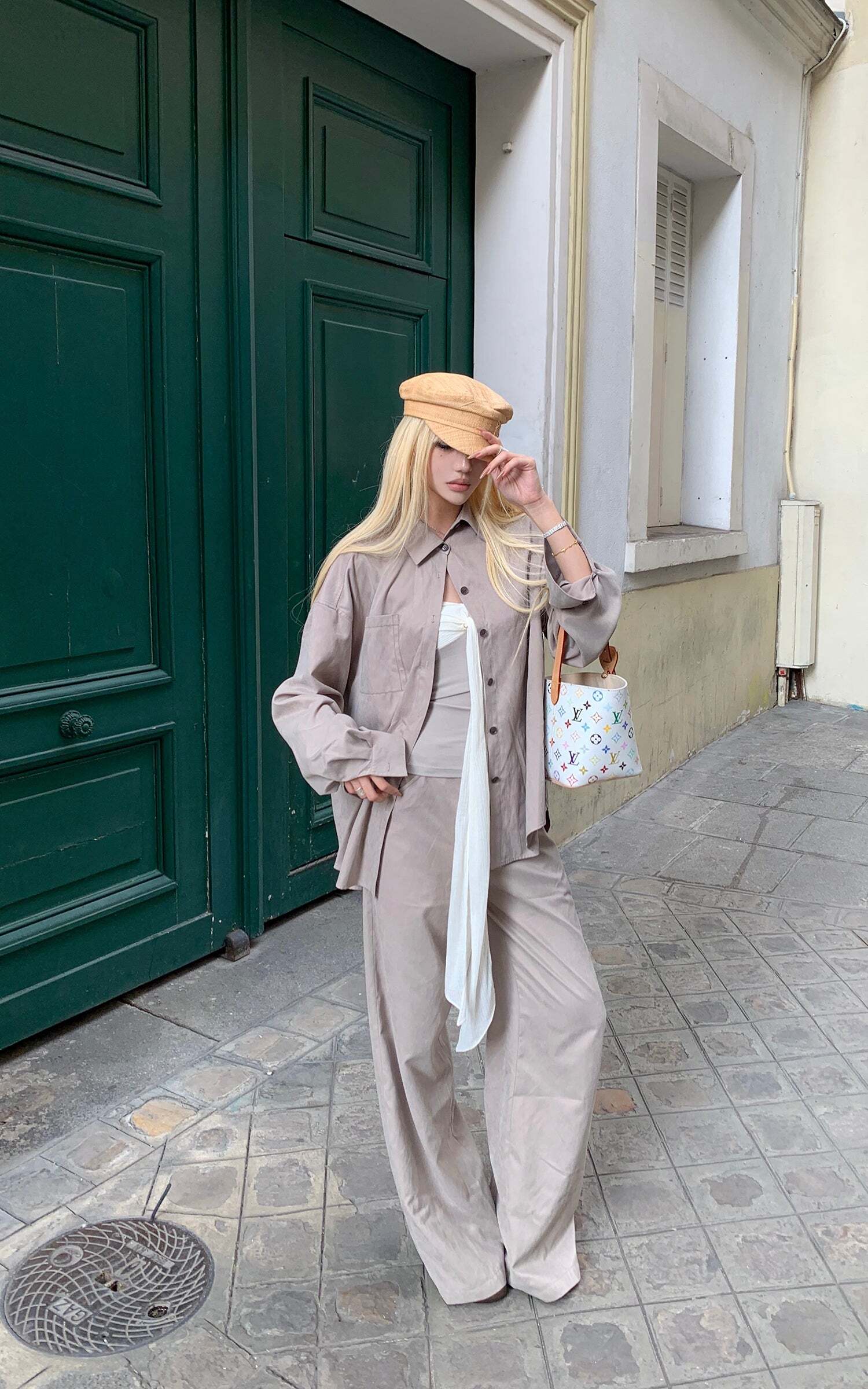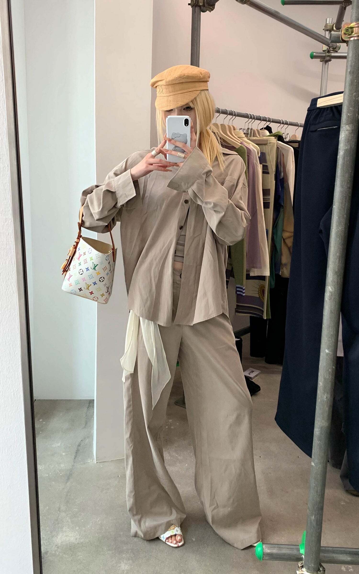 This set of shirt and pants unfolds in minimal structure, loose yet restrained in strength. The crisp fabric defines a broad silhouette—the shirt drapes with quiet ease, while the wide-leg trousers extend into a grounded stance. The muted beige tone exudes calm detachment, like a soft light against urban shadows. It may be worn undone in nonchalance or fastened with precision, shifting its posture between restraint and freedom.