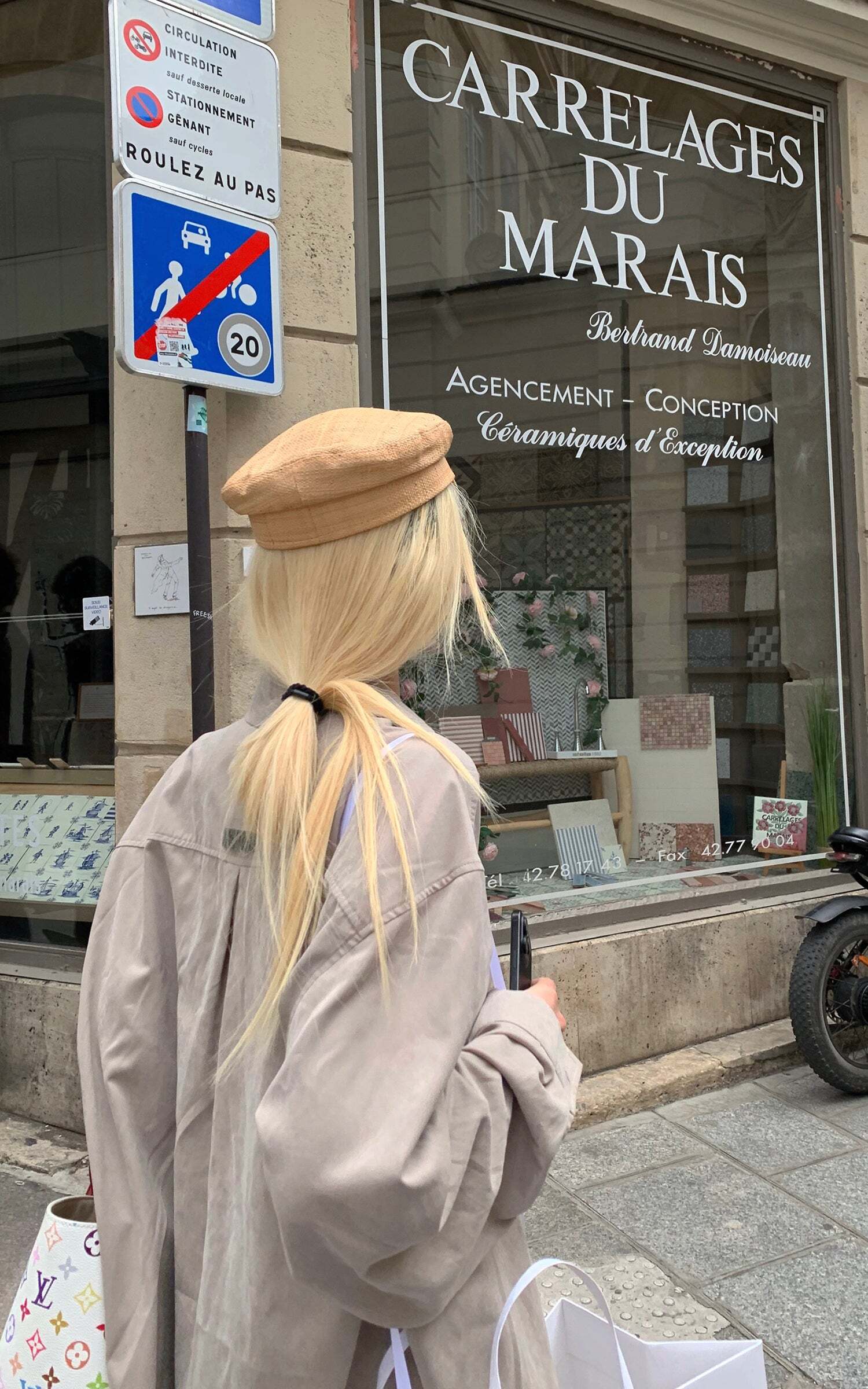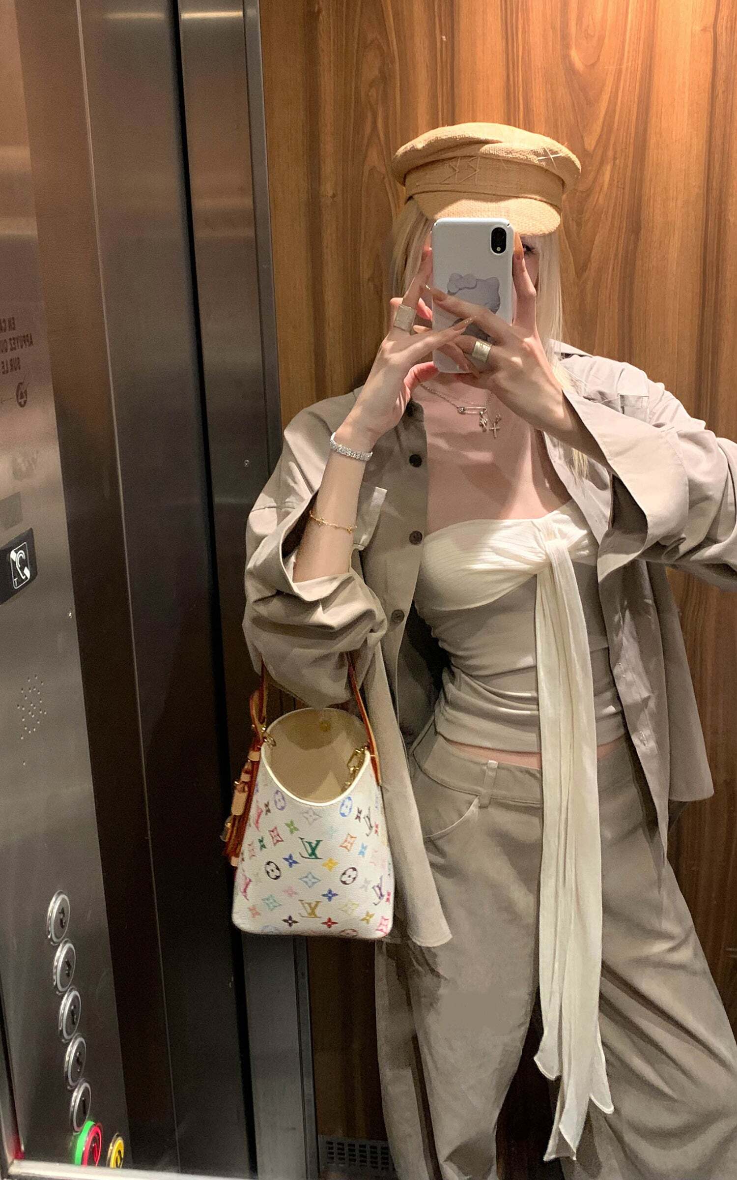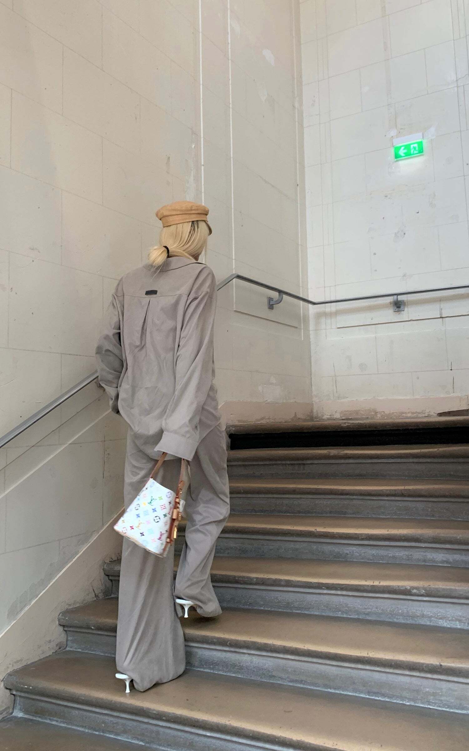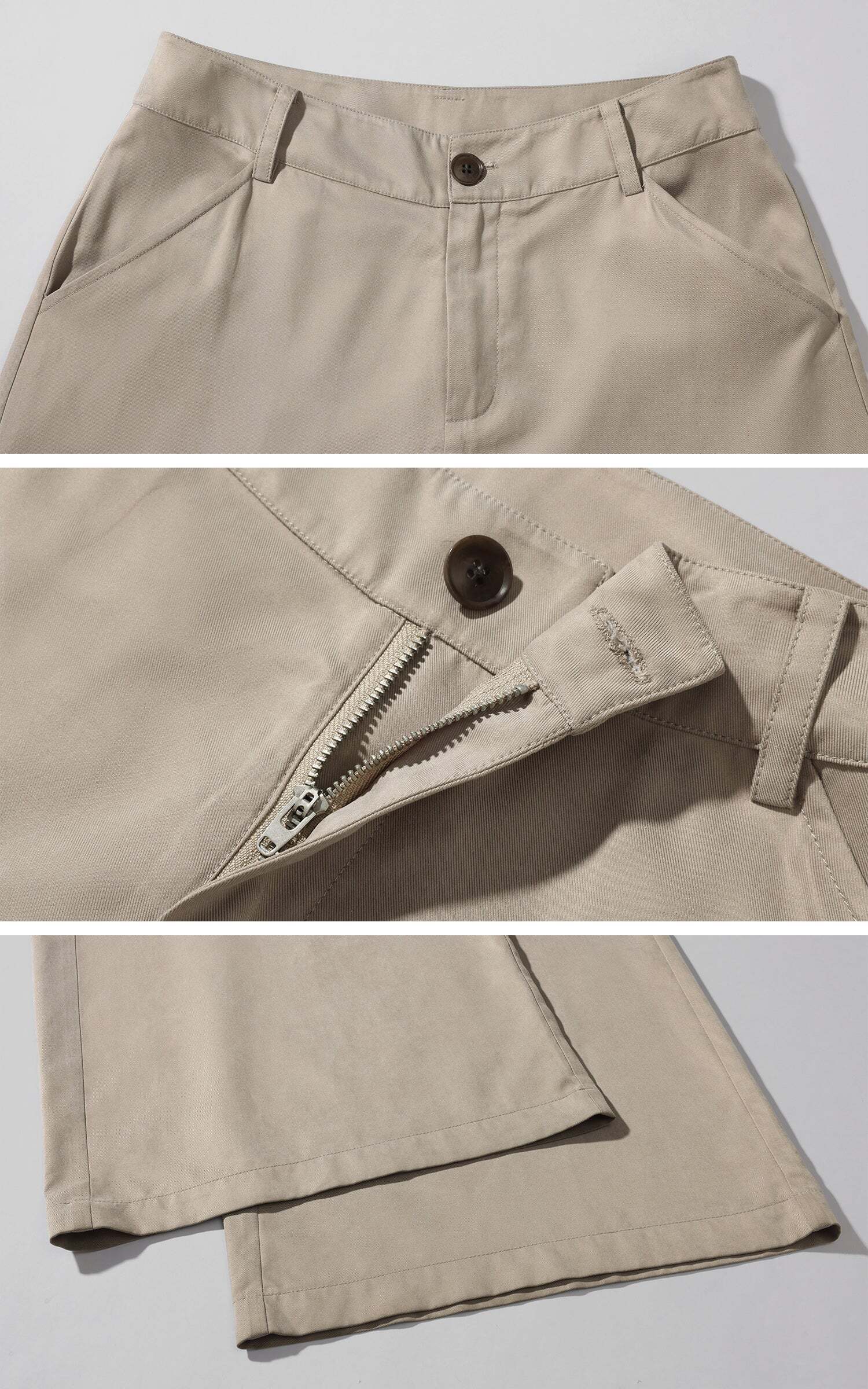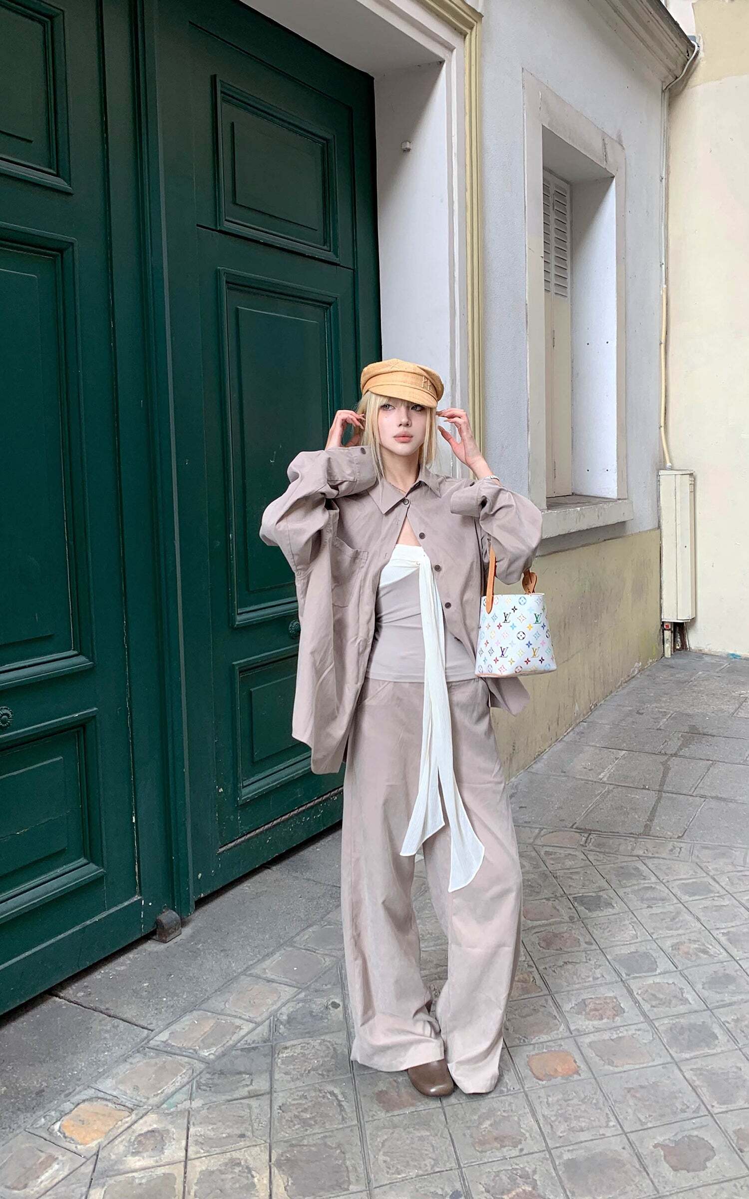 This set of shirt and pants unfolds in minimal structure, loose yet restrained in strength. The crisp fabric defines a broad silhouette—the shirt drapes with quiet ease, while the wide-leg trousers extend into a grounded stance. The muted beige tone exudes calm detachment, like a soft light against urban shadows. It may be worn undone in nonchalance or fastened with precision, shifting its posture between restraint and freedom.