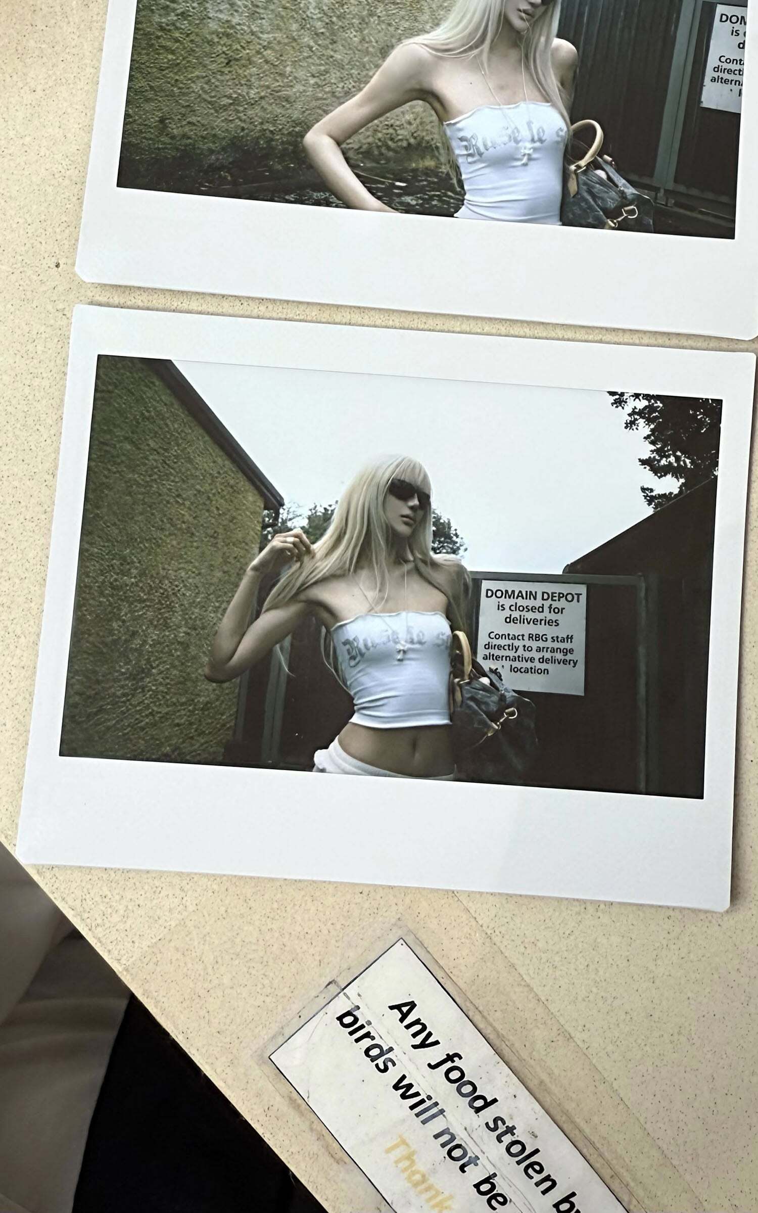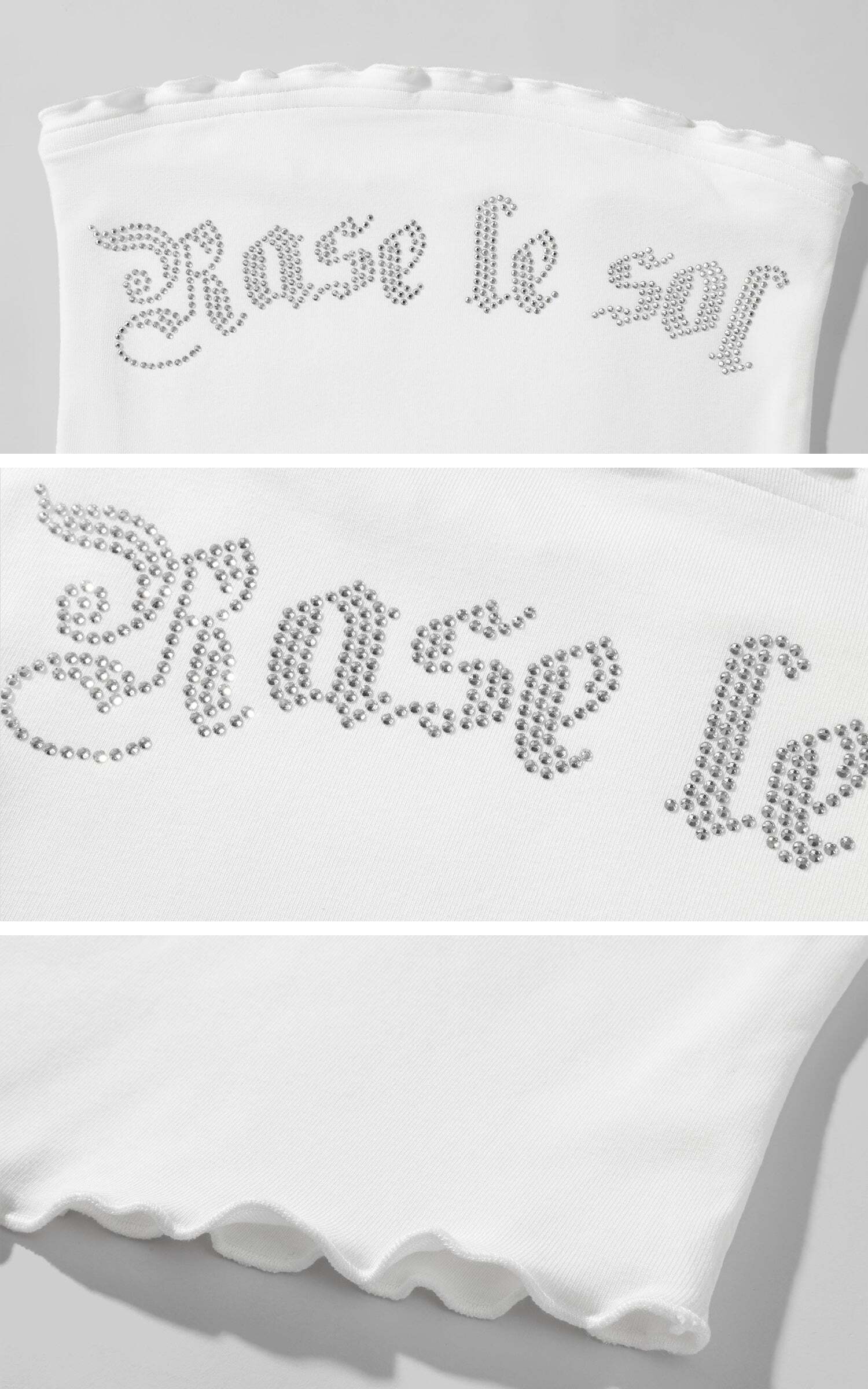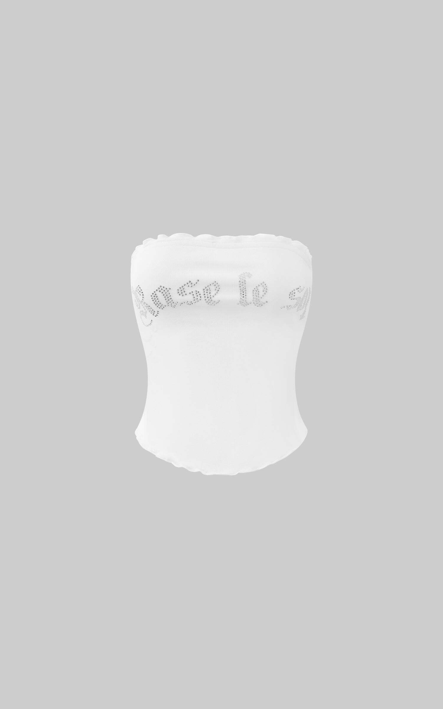Crafted from soft, stretch-infused fabric that clings to the body like a second skin, this strapless tube top frames the neck and collarbone with austere sensuality. Gothic-inspired rhinestone lettering glimmers across the chest—sharp, fragile, and ceremonial all at once. The raw-edge curling at the hem and neckline disrupts the smoothness with subtle dissonance, introducing an air of calculated imperfection. Worn alone or layered under structured pieces, it becomes a quiet declaration of strength through minimalism.