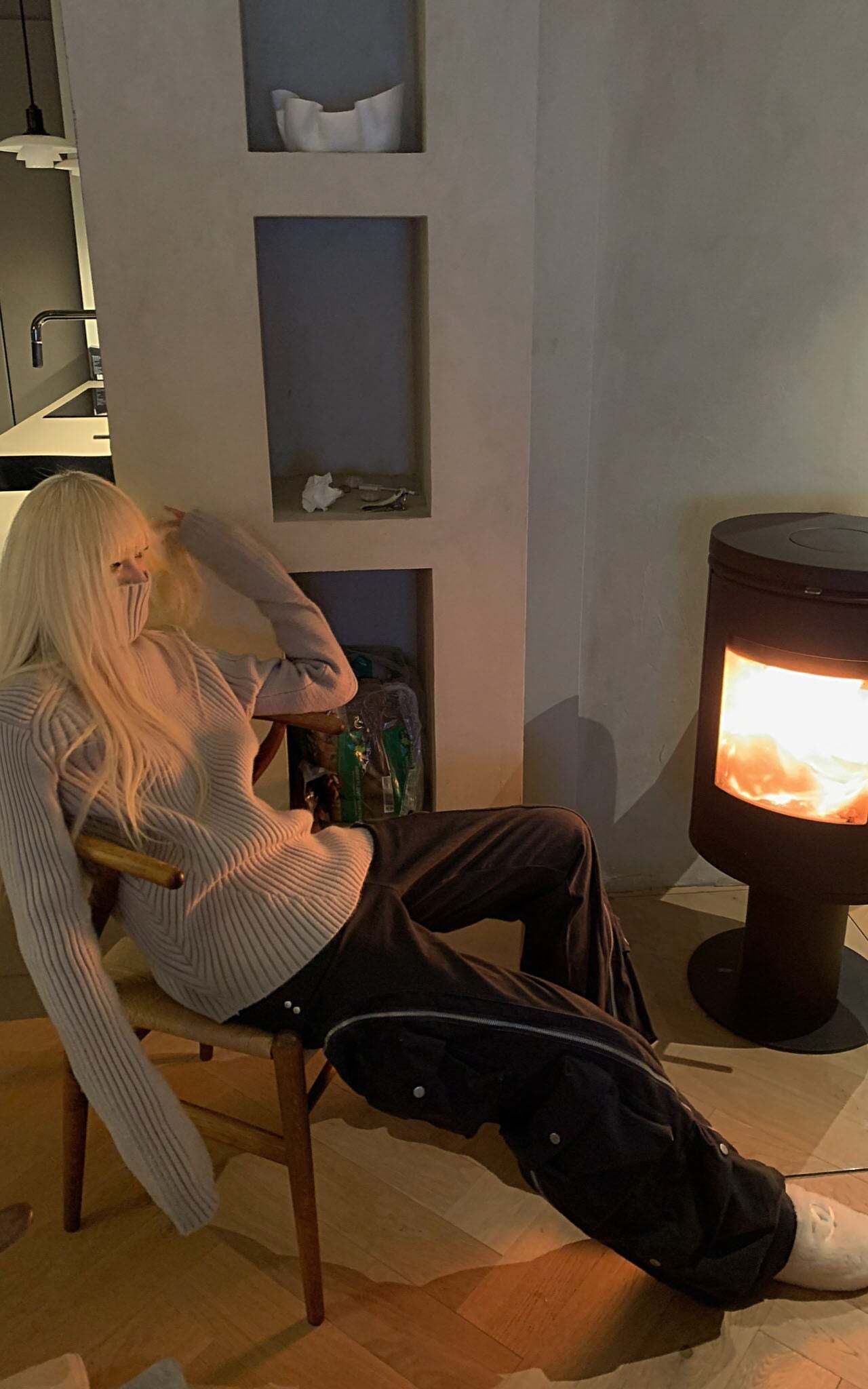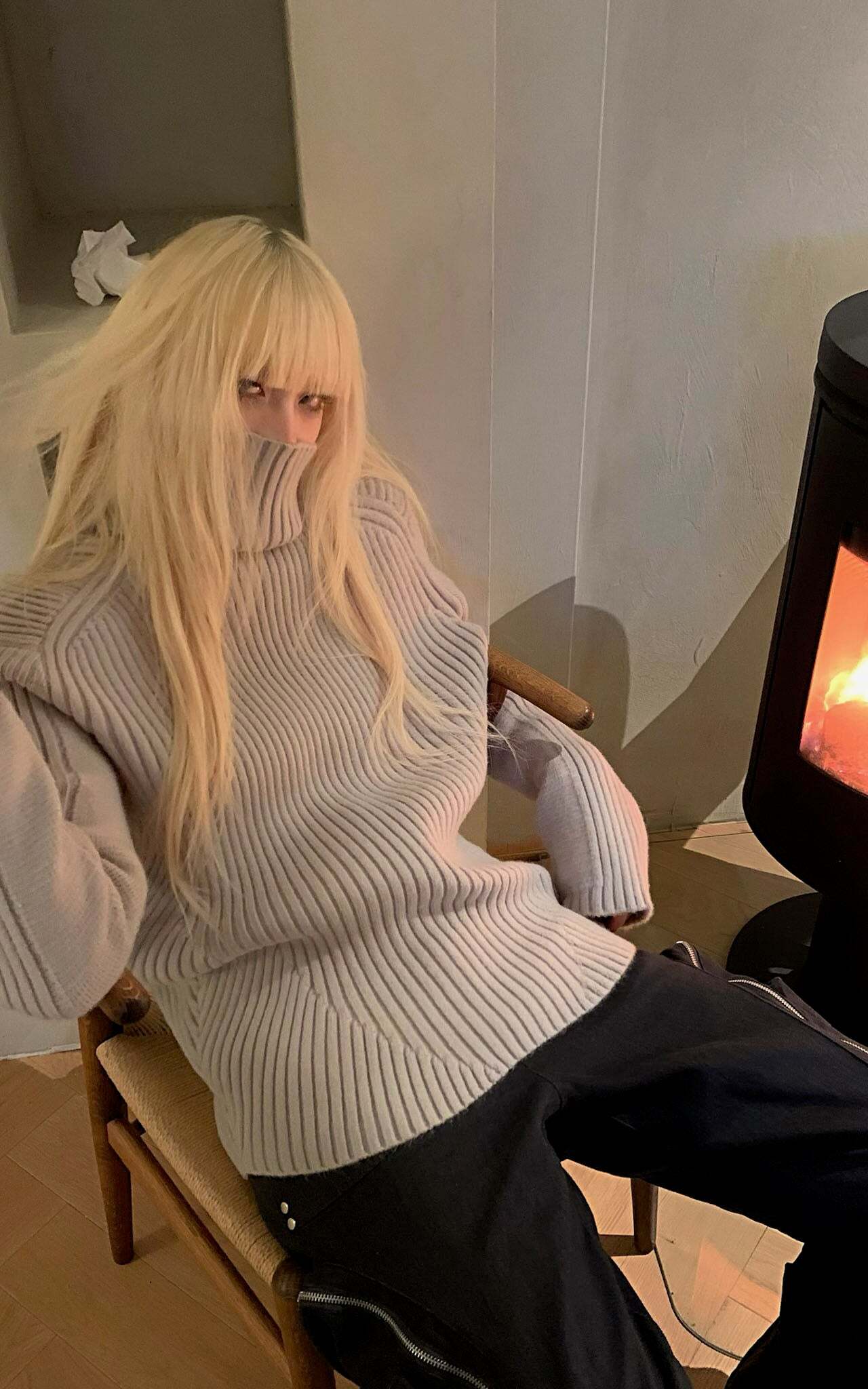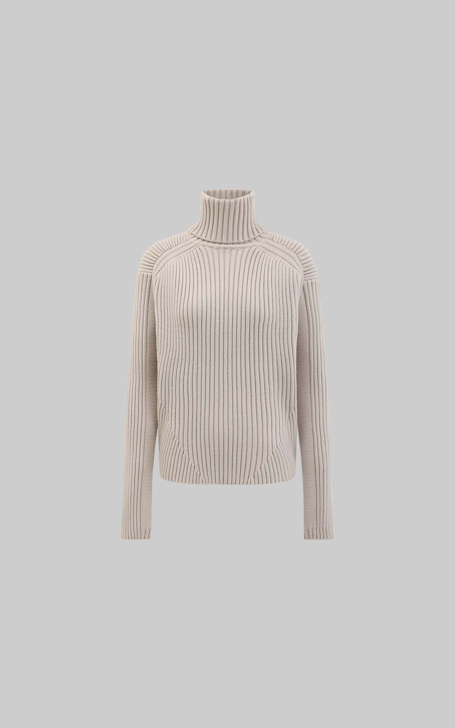 A modern reimagining of the high-neck sweater, this piece offers both sophistication and comfort. The intricate ribbed design adds textural depth, while the elongated sleeves and structured high neckline bring a touch of refined edge. Crafted with premium materials, this sweater is perfect for layering or wearing on its own, seamlessly transitioning from cozy indoors to brisk outdoor settings. A statement in minimalist elegance.