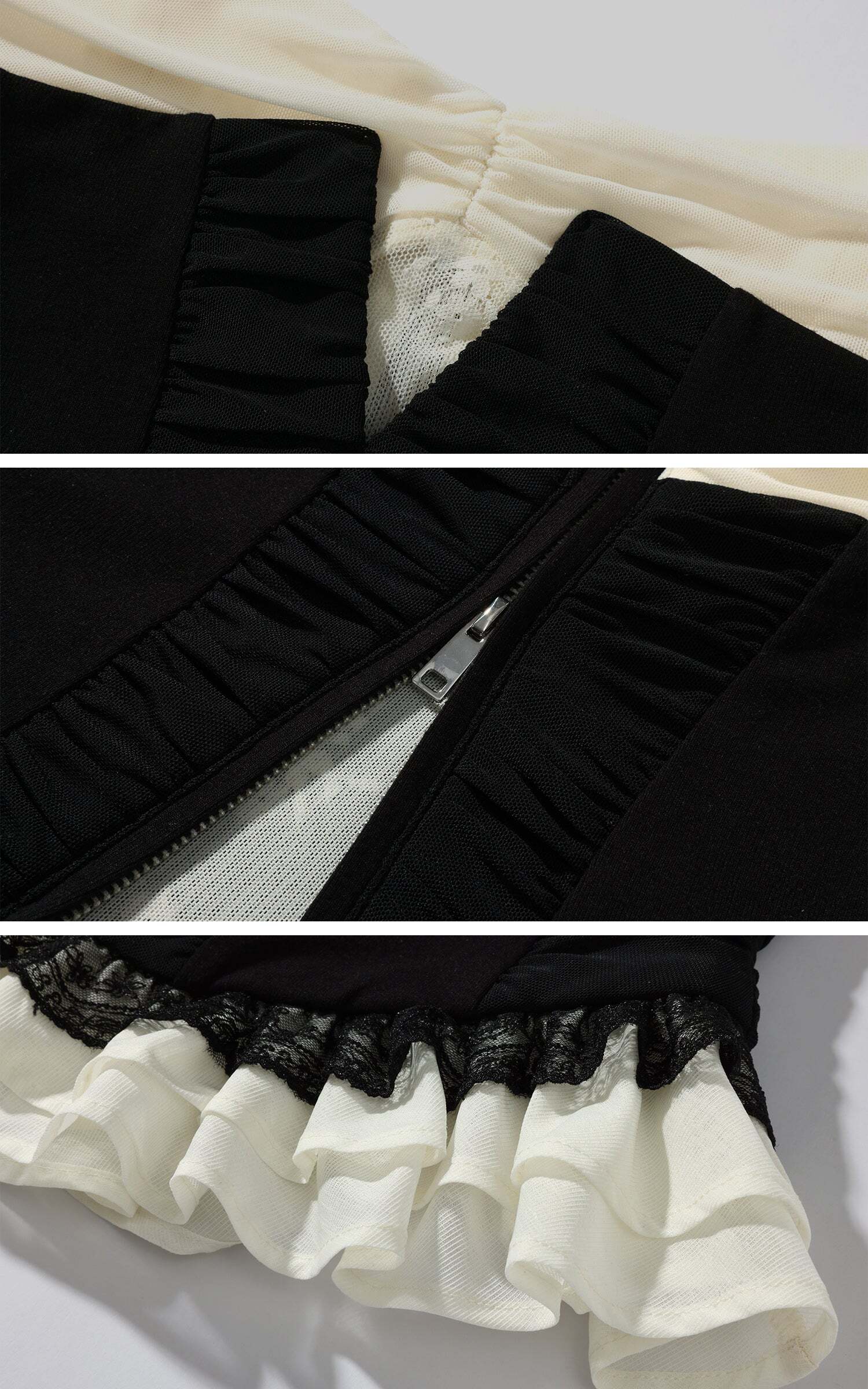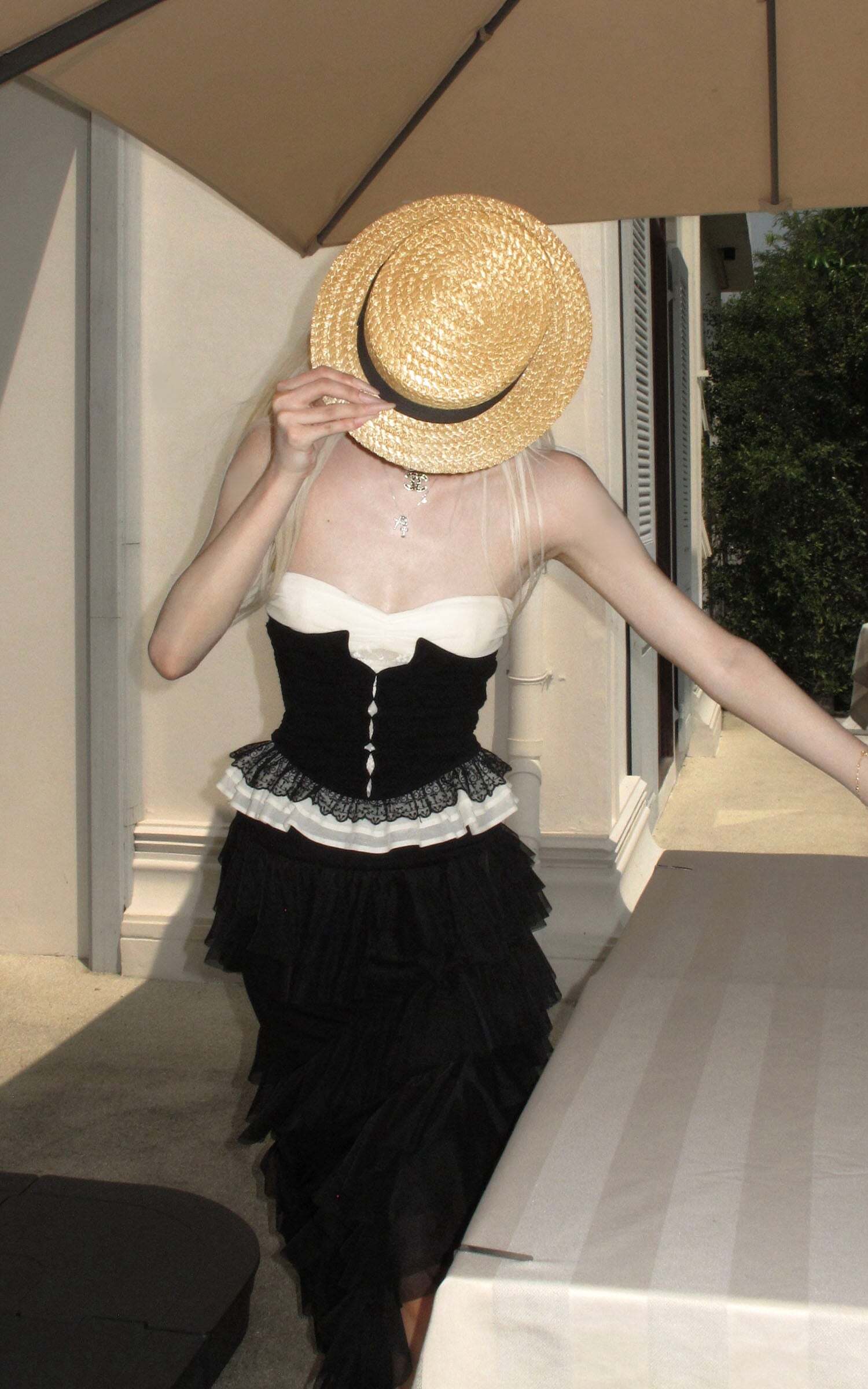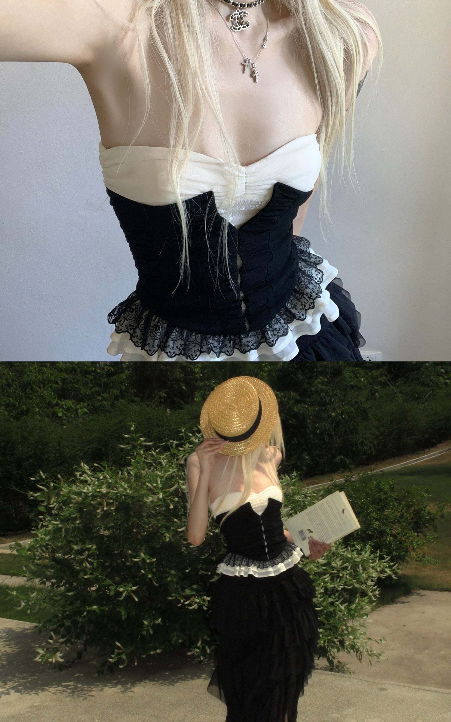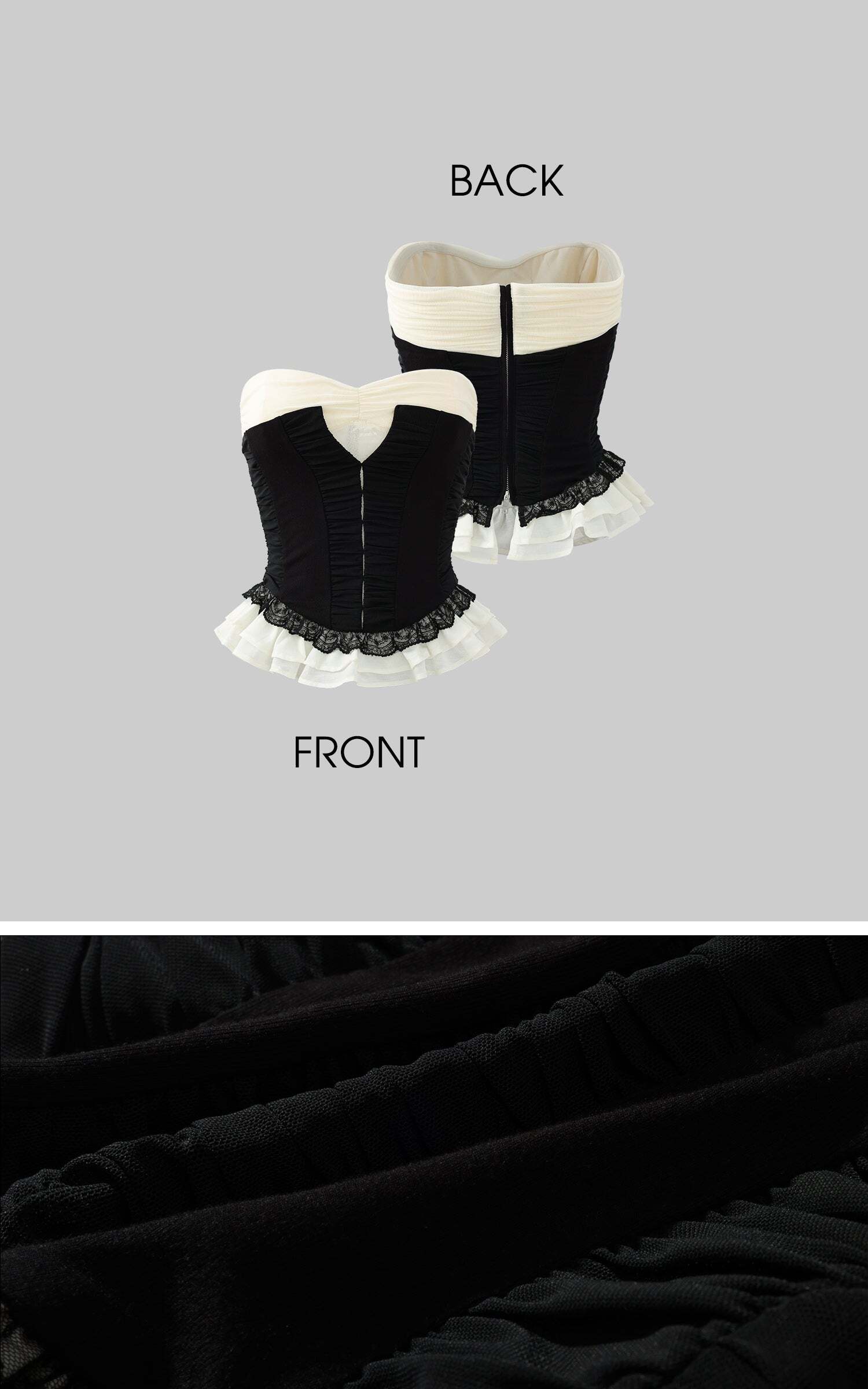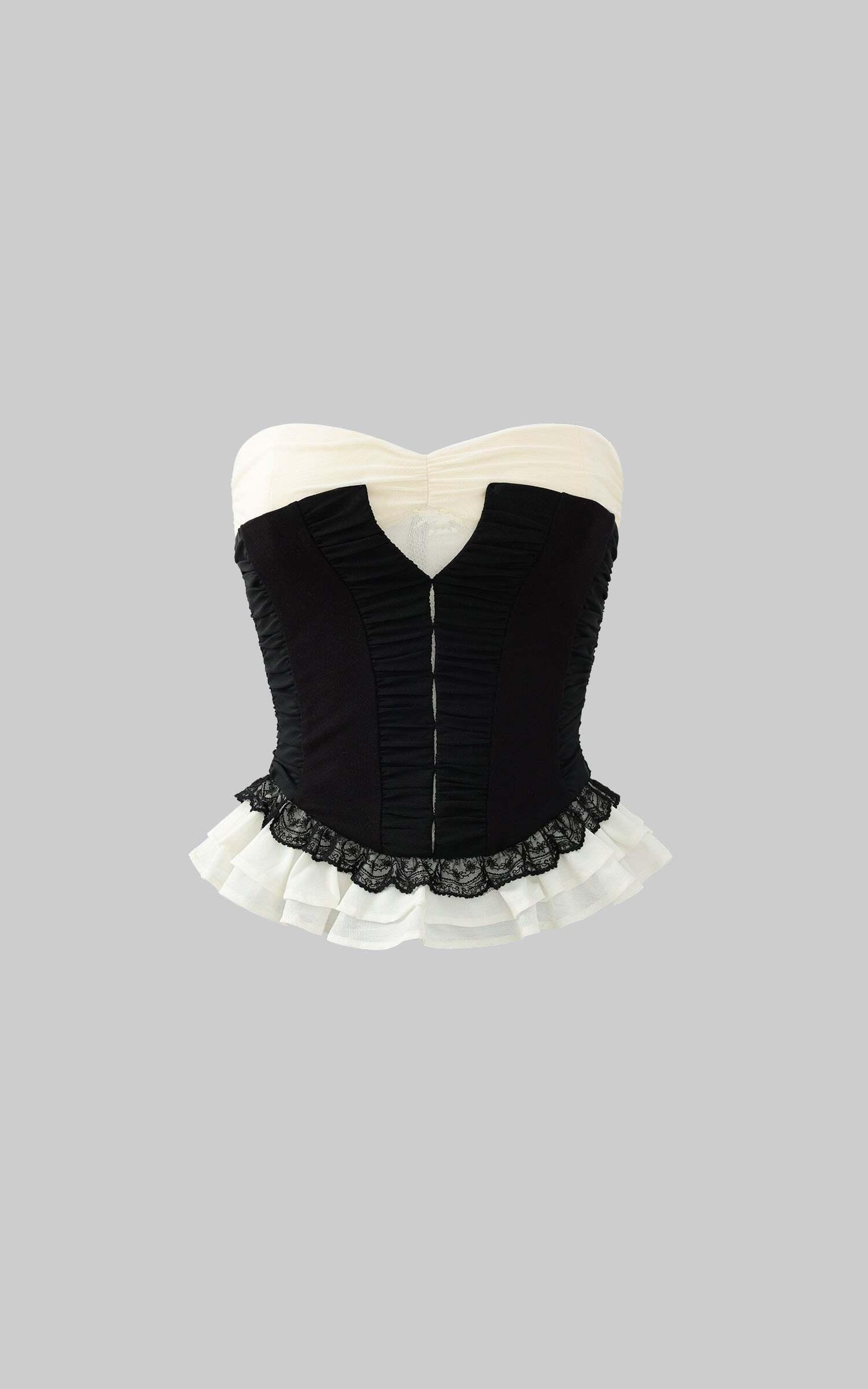 A structured bodice meets soft contrast—this bustier sculpts the form with a central ruched panel and defined silhouette. The hem flares into double-layered ruffles trimmed with lace, adding tension between control and ornament. Reminiscent of historical corsetry, yet spoken in a modern tongue.