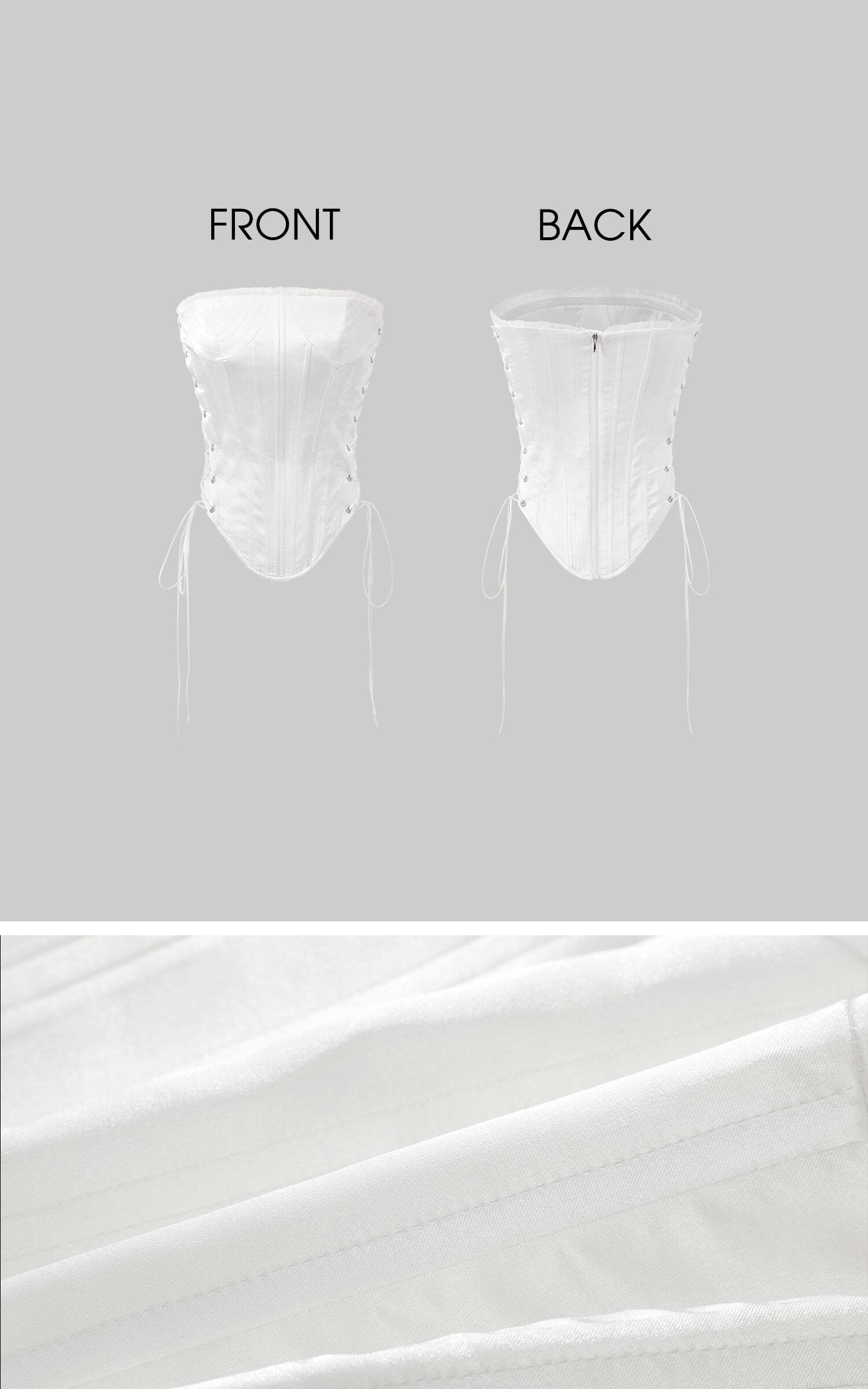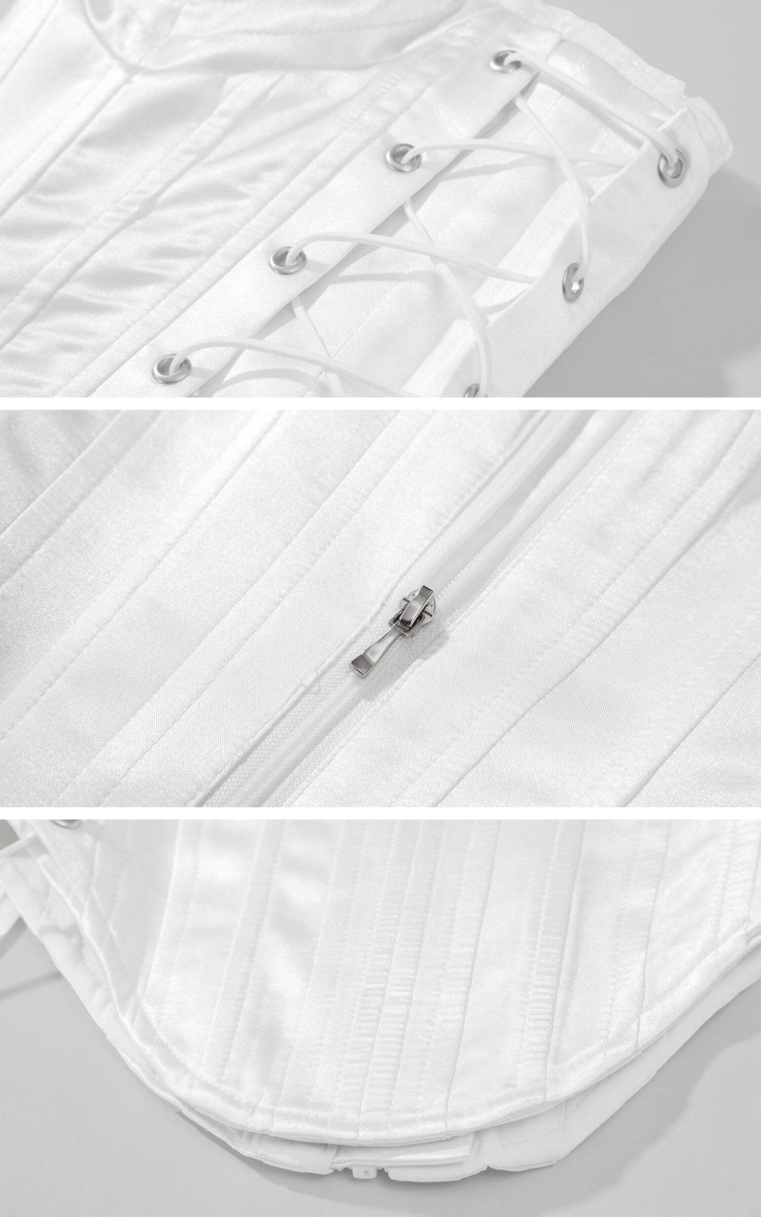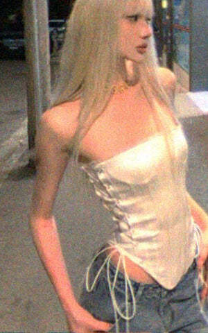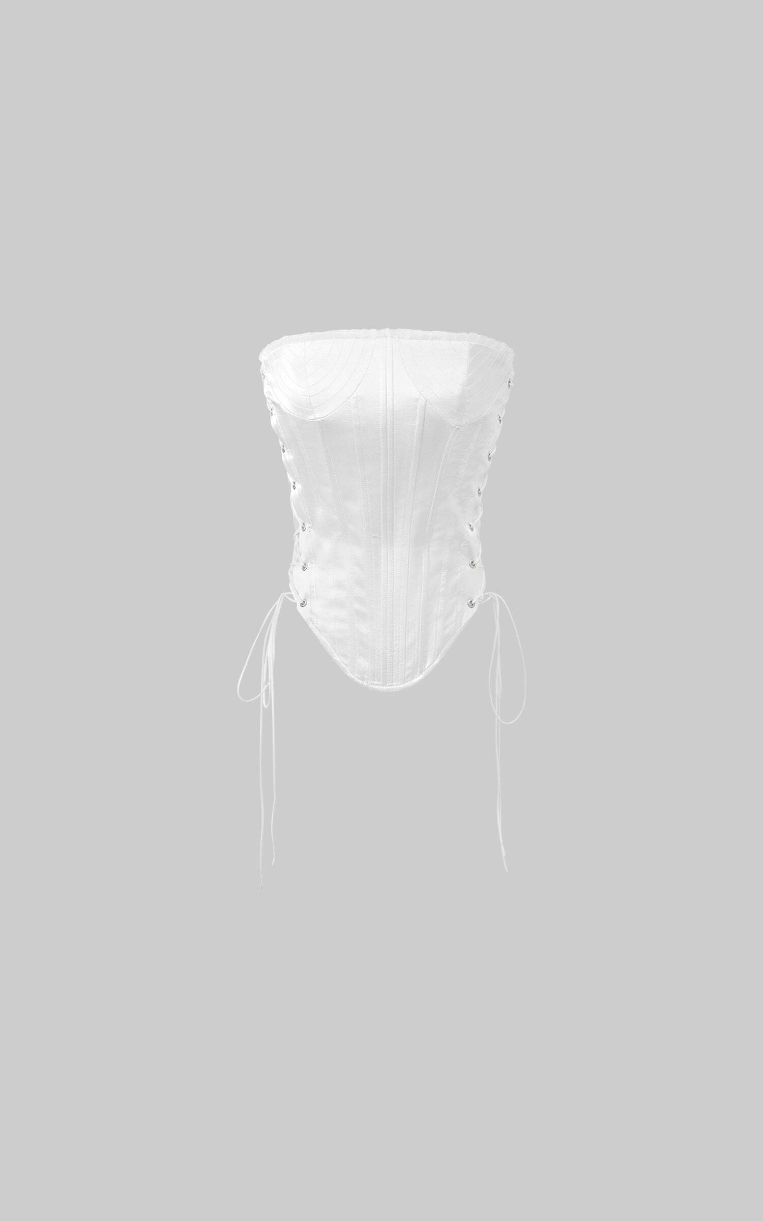 A silhouette that cuts through the dark with sculptural intent. This satin corset top gleams with a soft, mercurial light, its structured seams shaping the body like silent architecture. Side lace-up details stretch taut, delivering a graphic edge, while a concealed back zip completes the design with clarity. Boning lines trace the torso with tension and grace, composing a garment both delicate and unyielding. Pair it with distressed denim—this is a ritual of reconstruction.