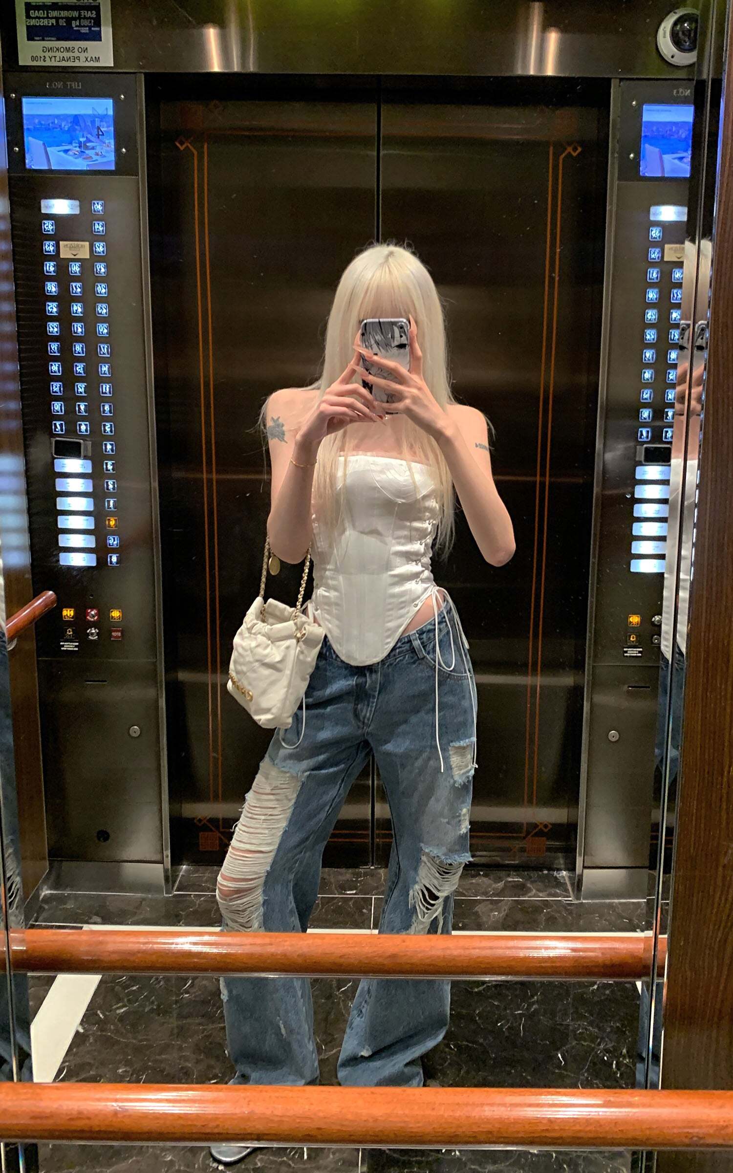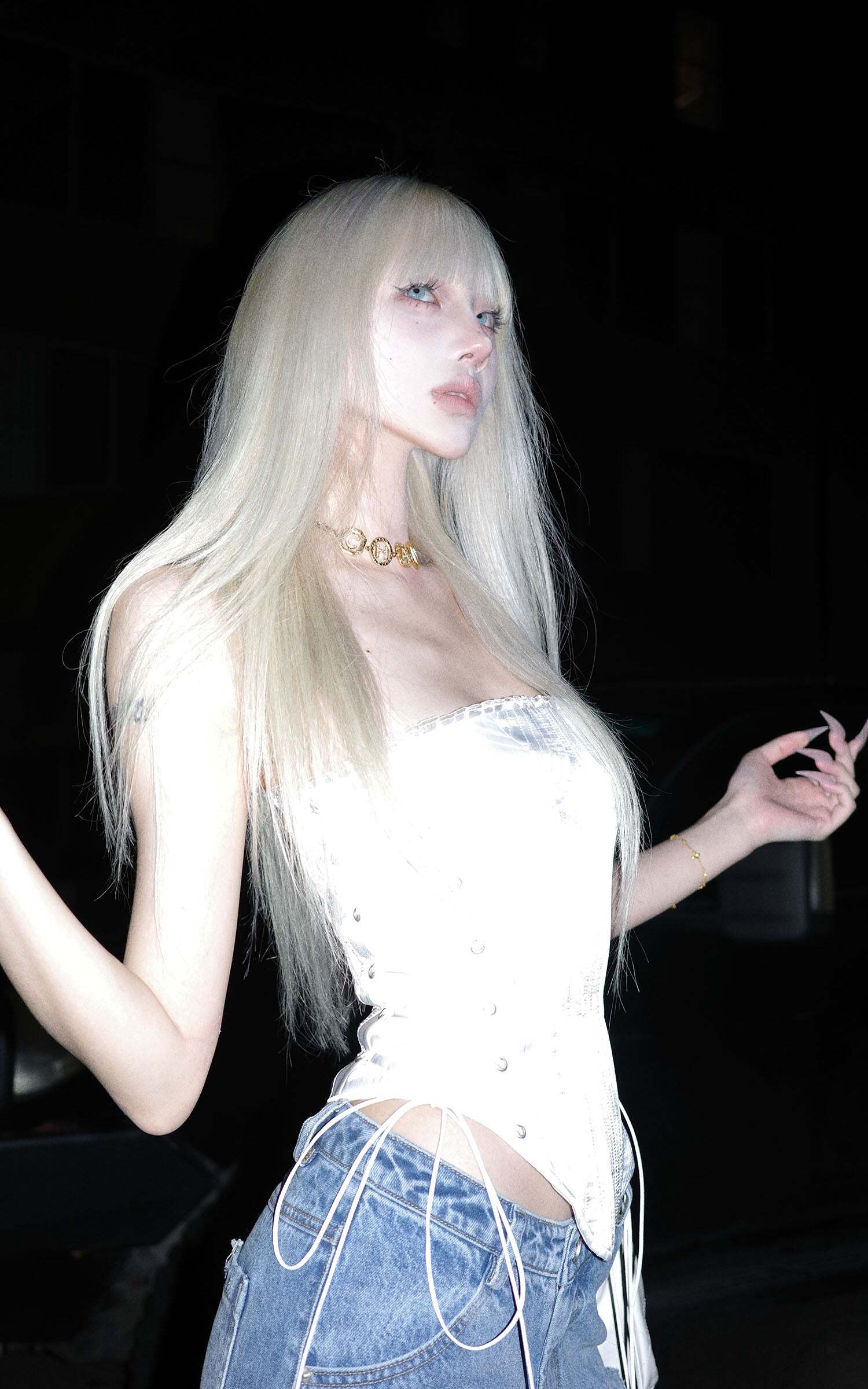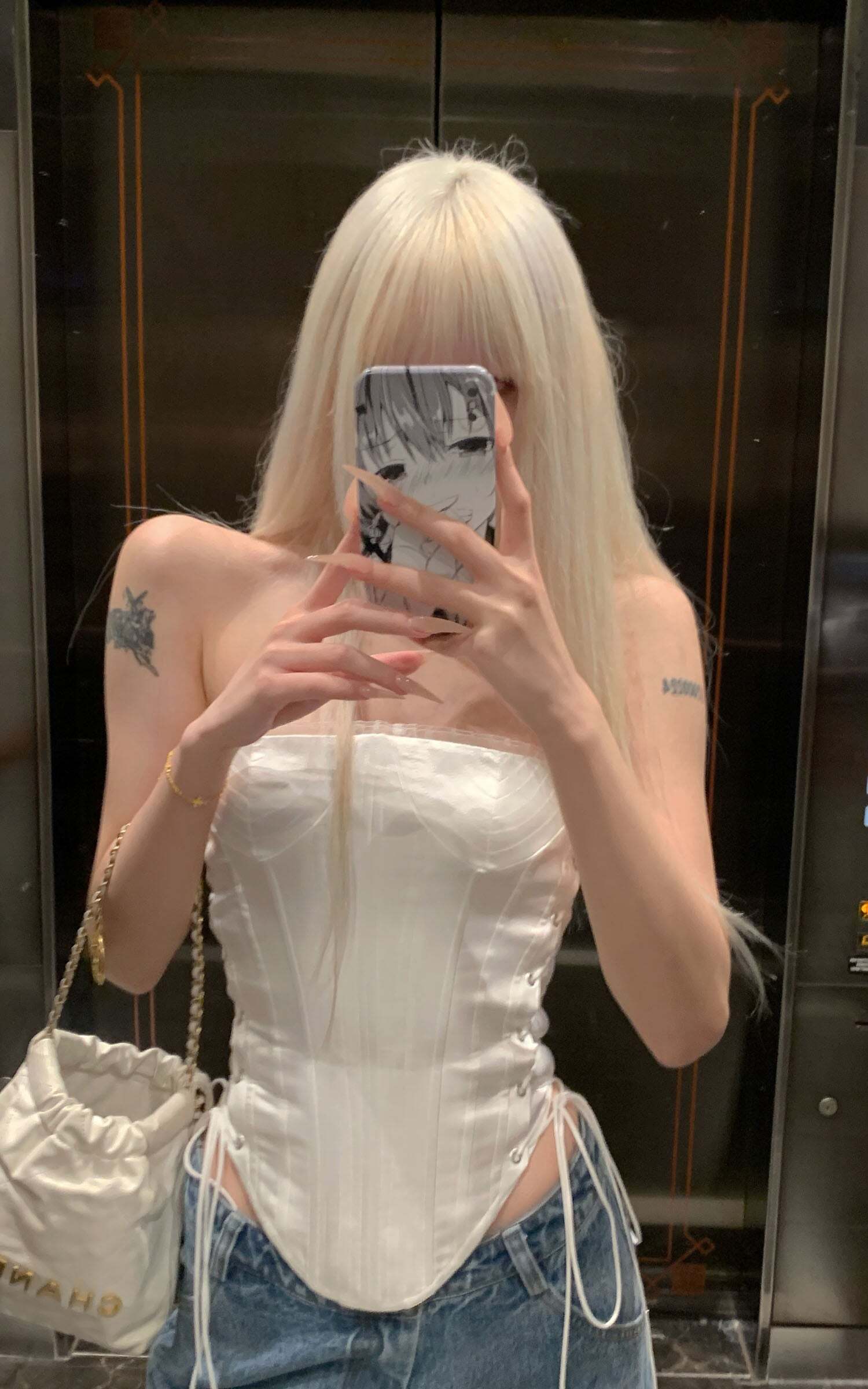 A silhouette that cuts through the dark with sculptural intent. This satin corset top gleams with a soft, mercurial light, its structured seams shaping the body like silent architecture. Side lace-up details stretch taut, delivering a graphic edge, while a concealed back zip completes the design with clarity. Boning lines trace the torso with tension and grace, composing a garment both delicate and unyielding. Pair it with distressed denim—this is a ritual of reconstruction.