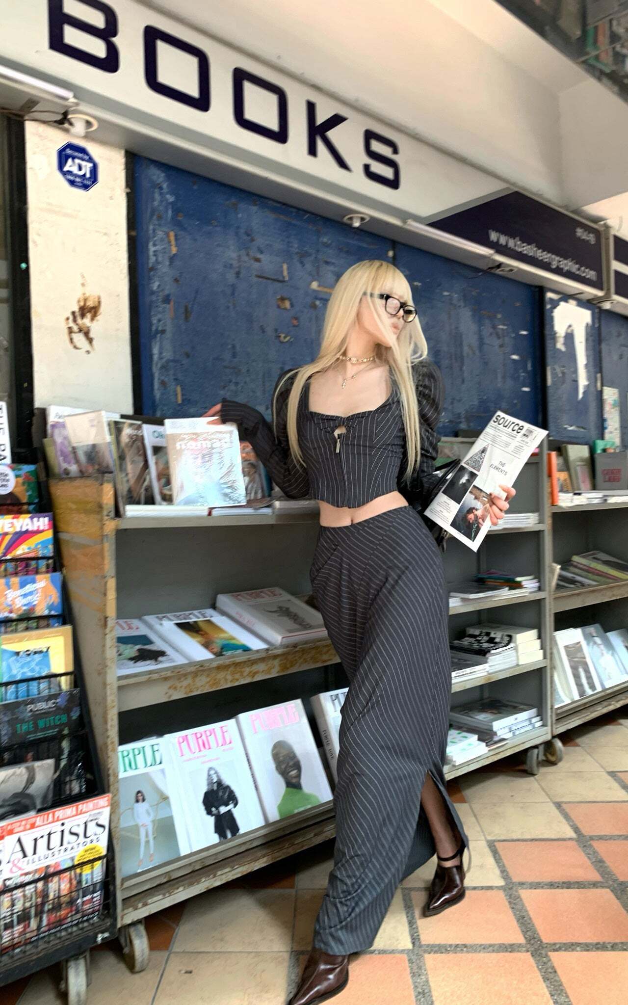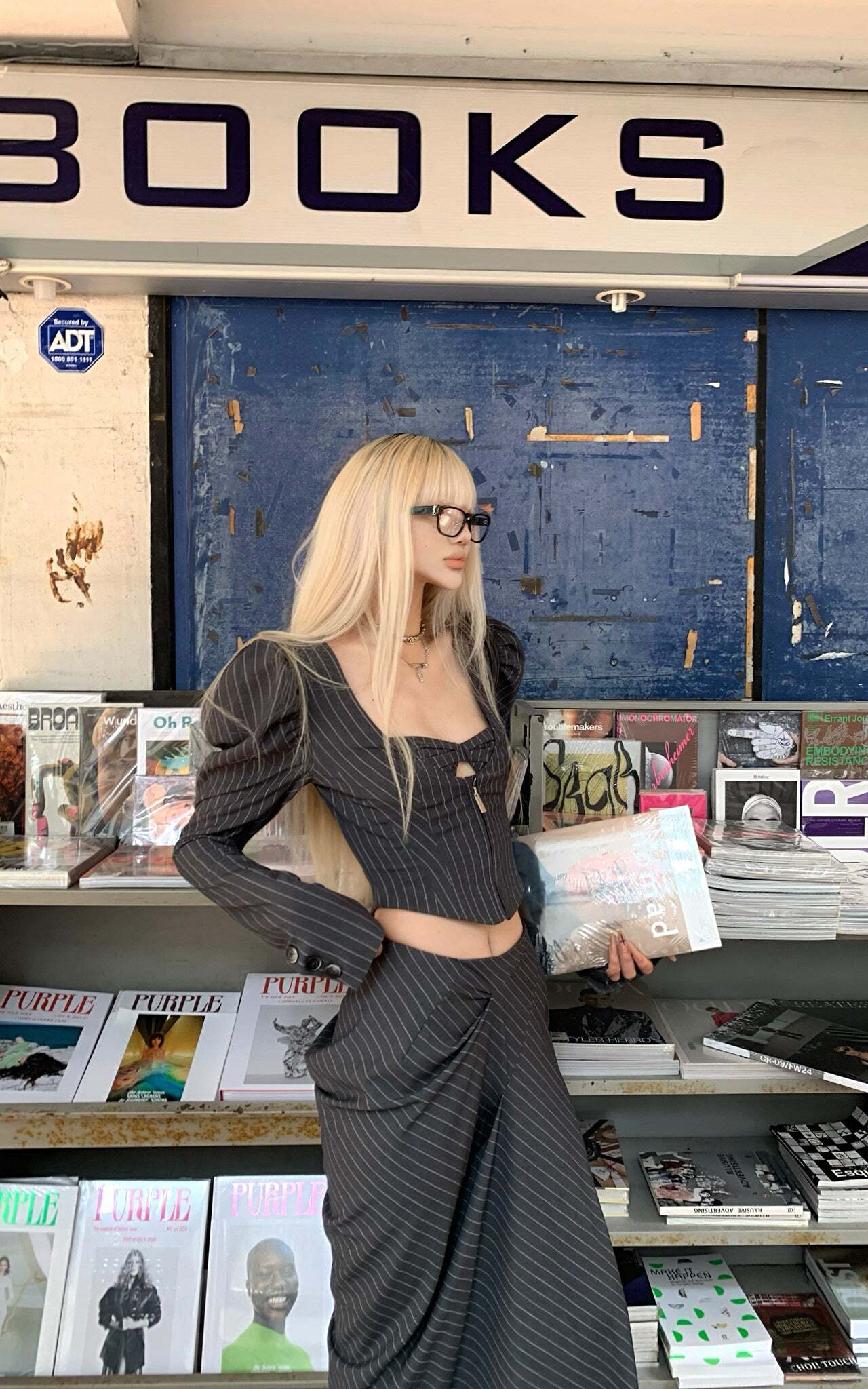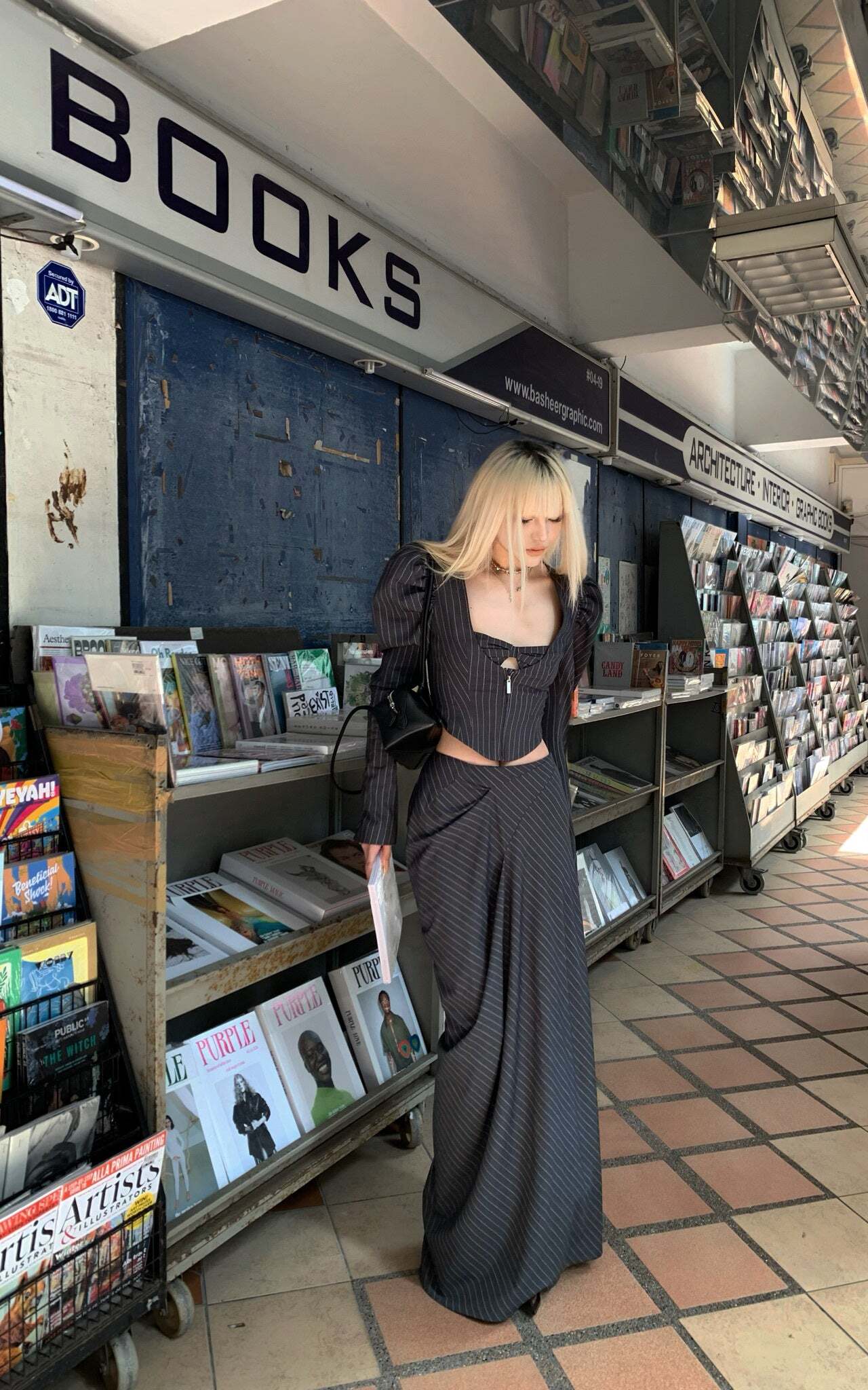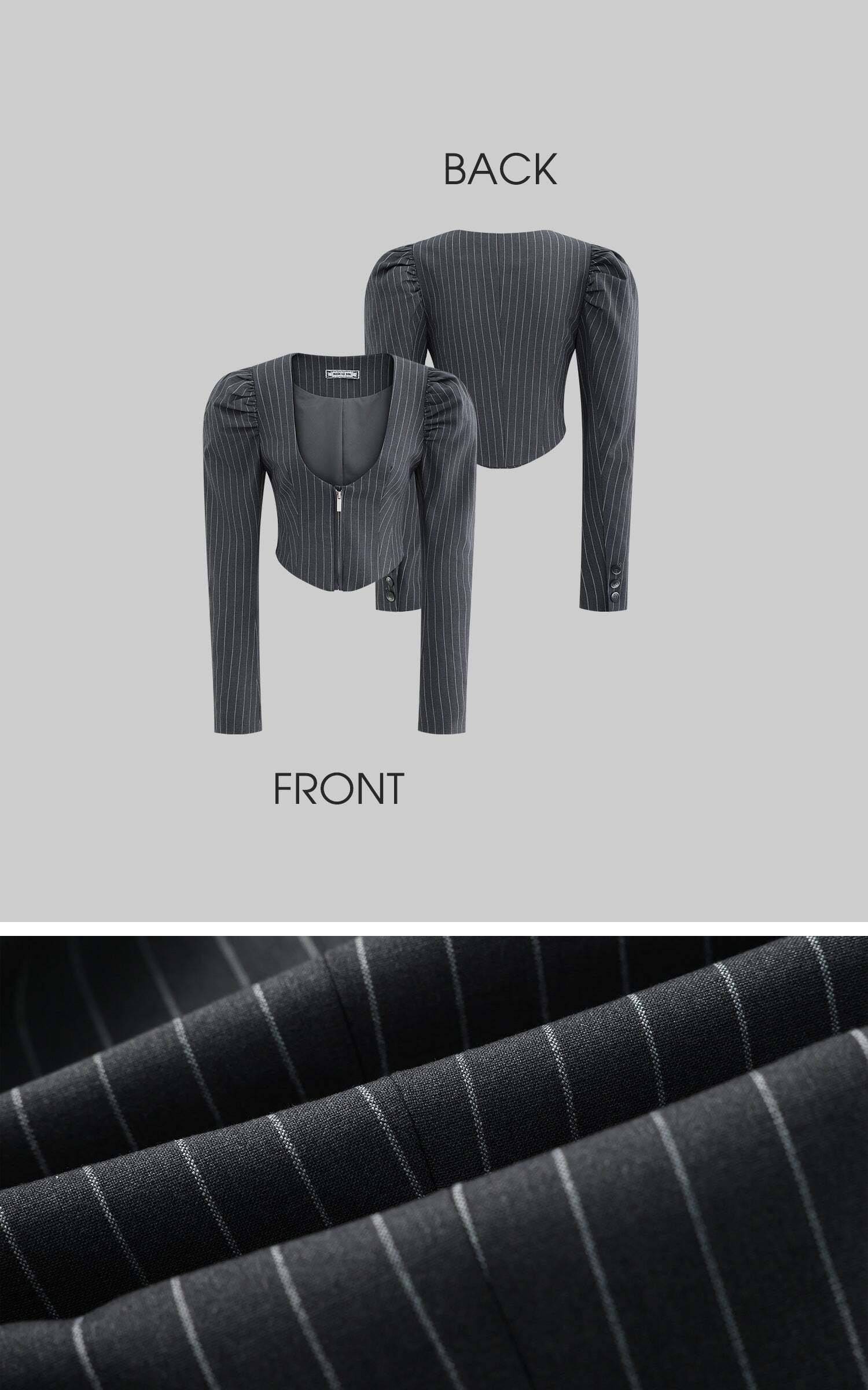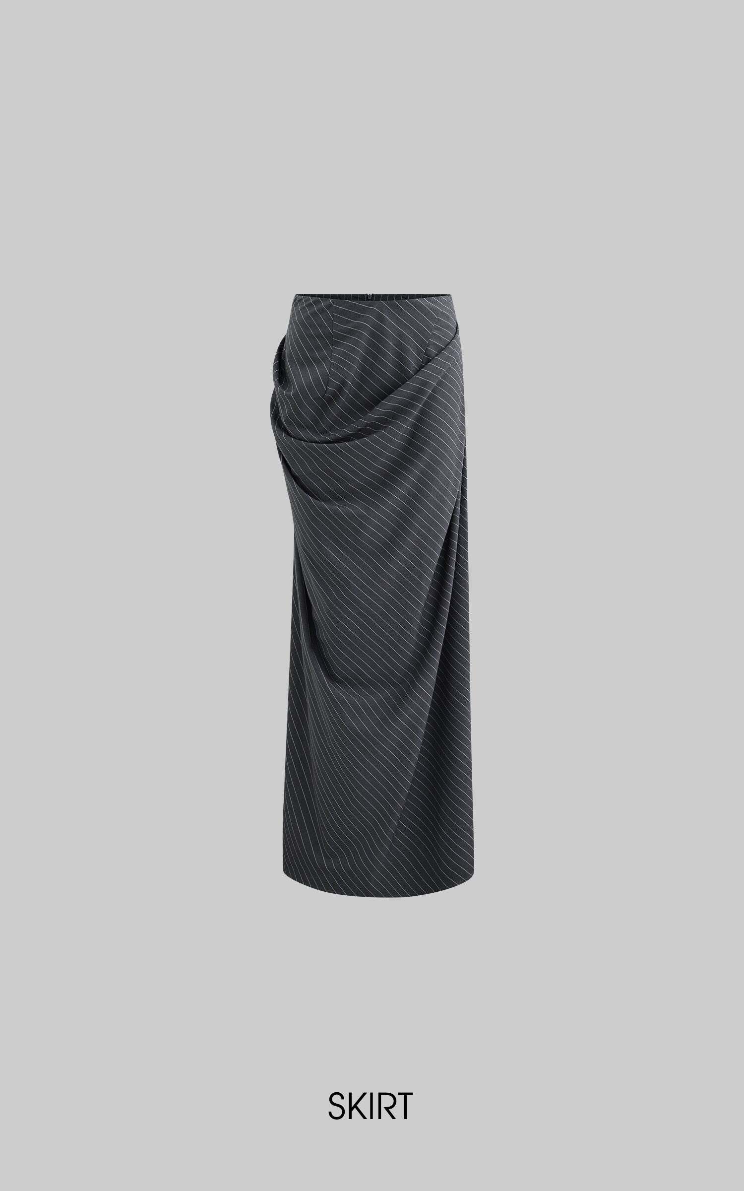 A collision of deconstructed tailoring and elegant lines, this set creates a striking visual tension. The structured blazer, featuring sharp padded shoulders and a subtly cinched waist, is redefined with a low-cut zip front—an interplay of boldness and restraint. The high-waisted skirt disrupts convention with asymmetrical pleats, flowing into a draped silhouette that moves with an effortless grace. Vertical pinstripes elongate the form, weaving together modernity and vintage sophistication. More than just an outfit, this ensemble is a statement—blurring the lines between precision and emotion, offering the wearer the freedom to shift seamlessly between identities.
