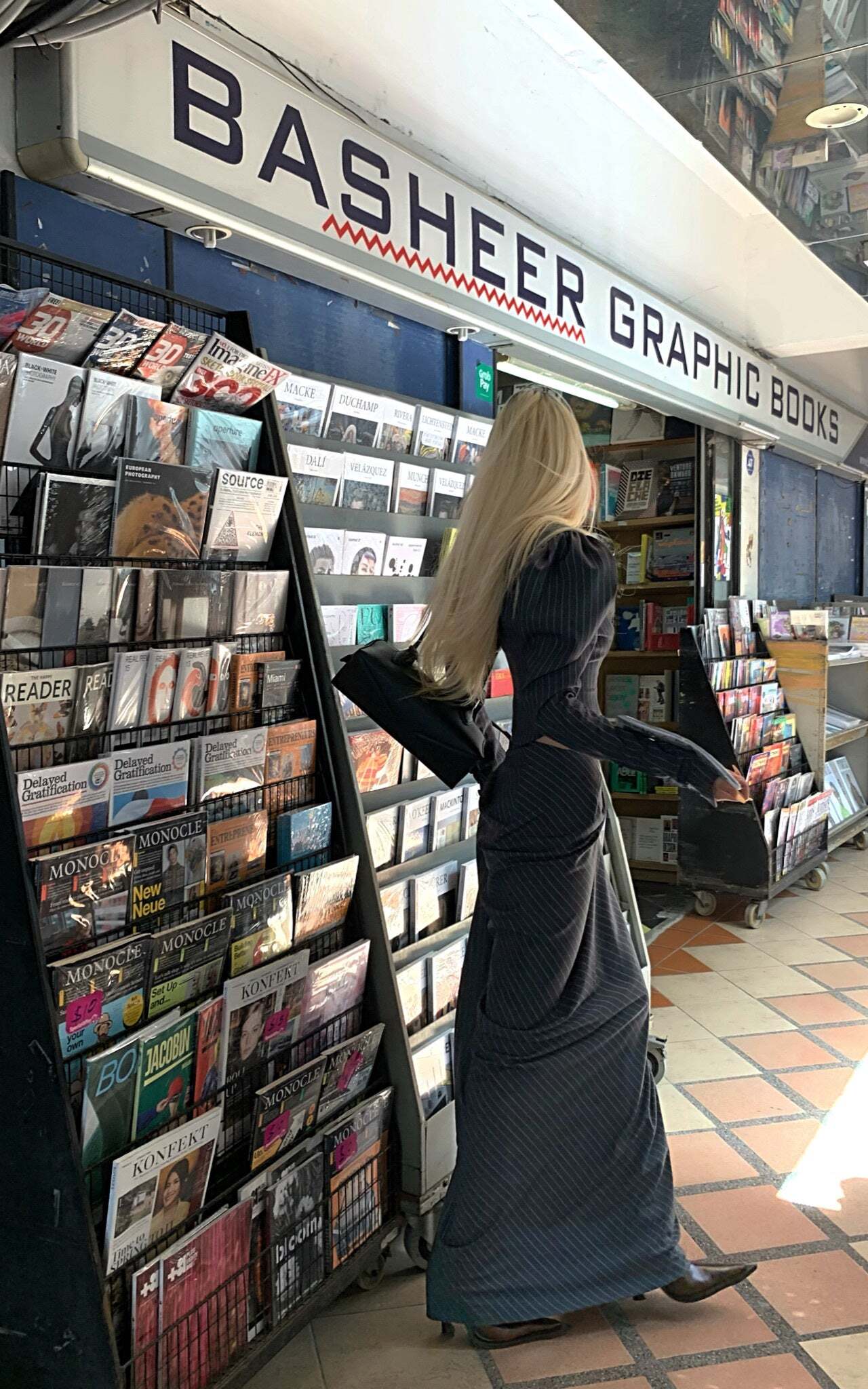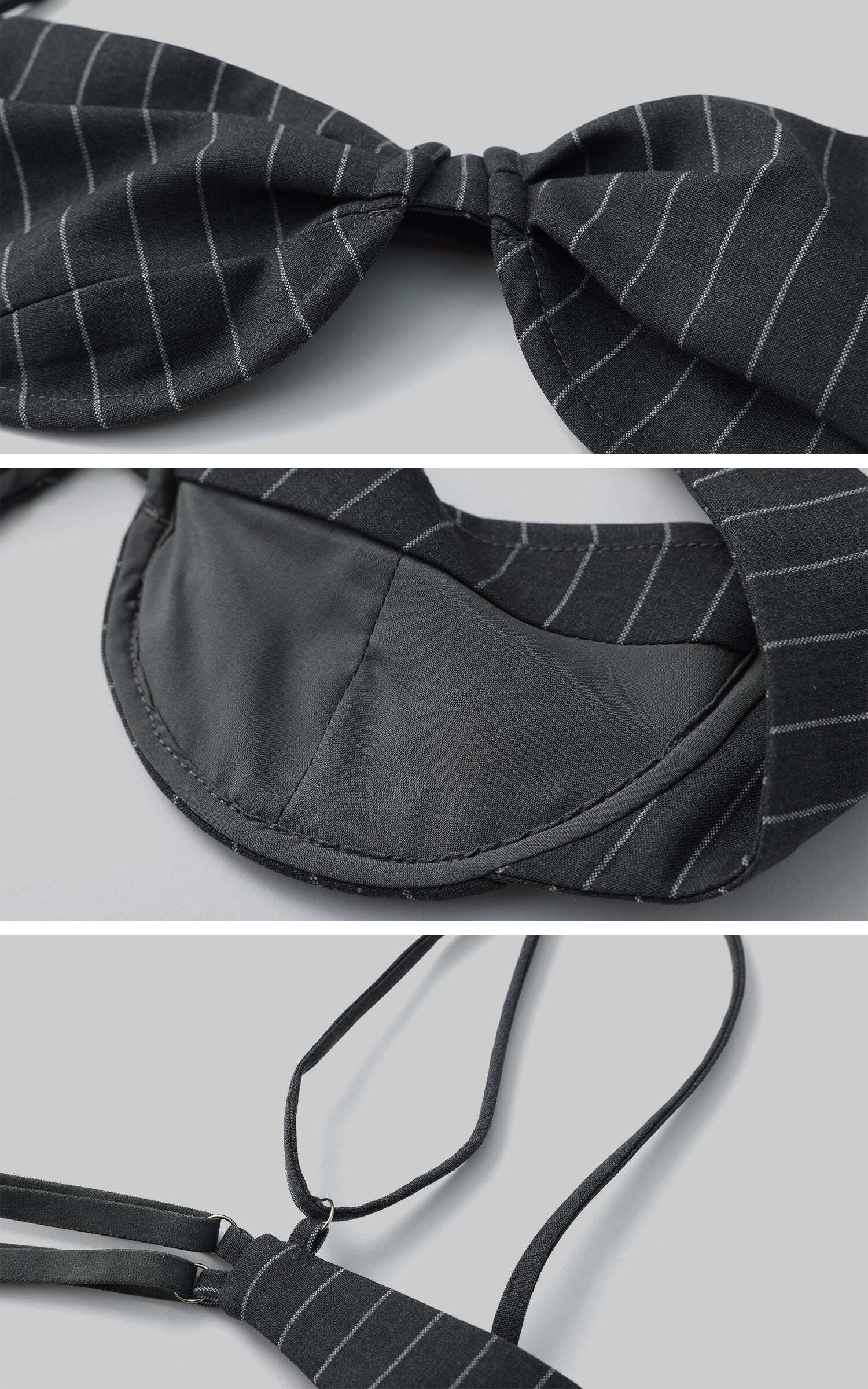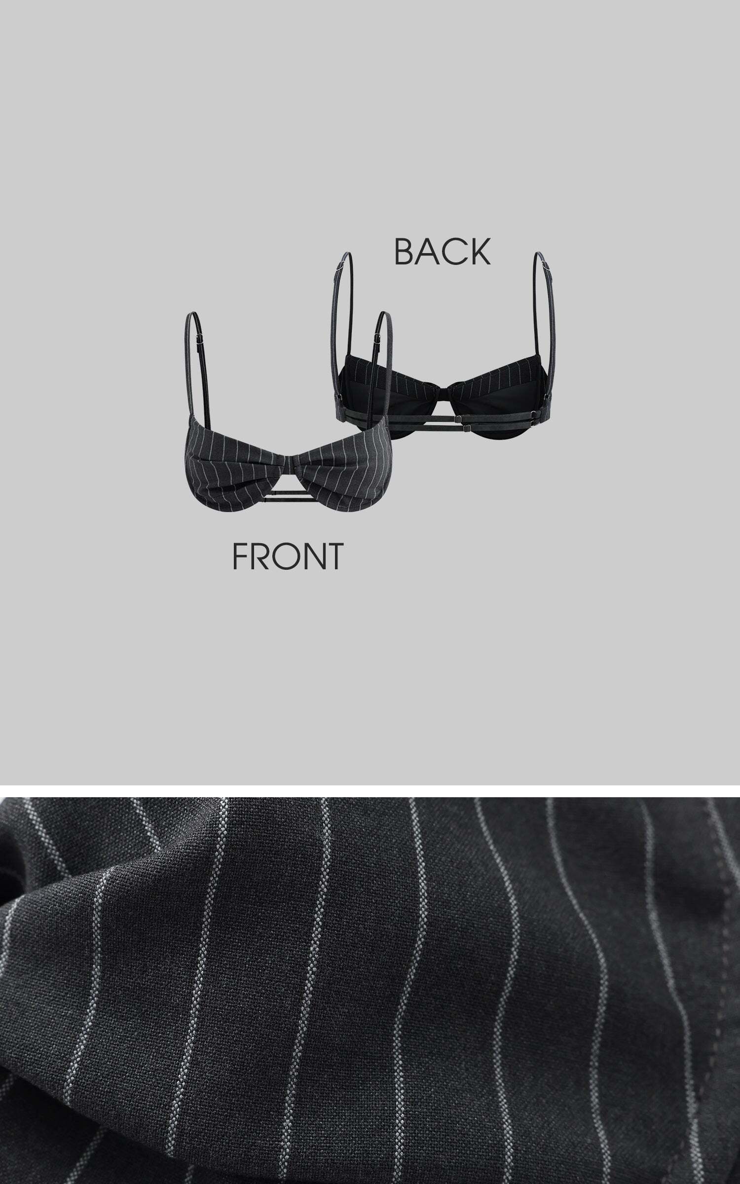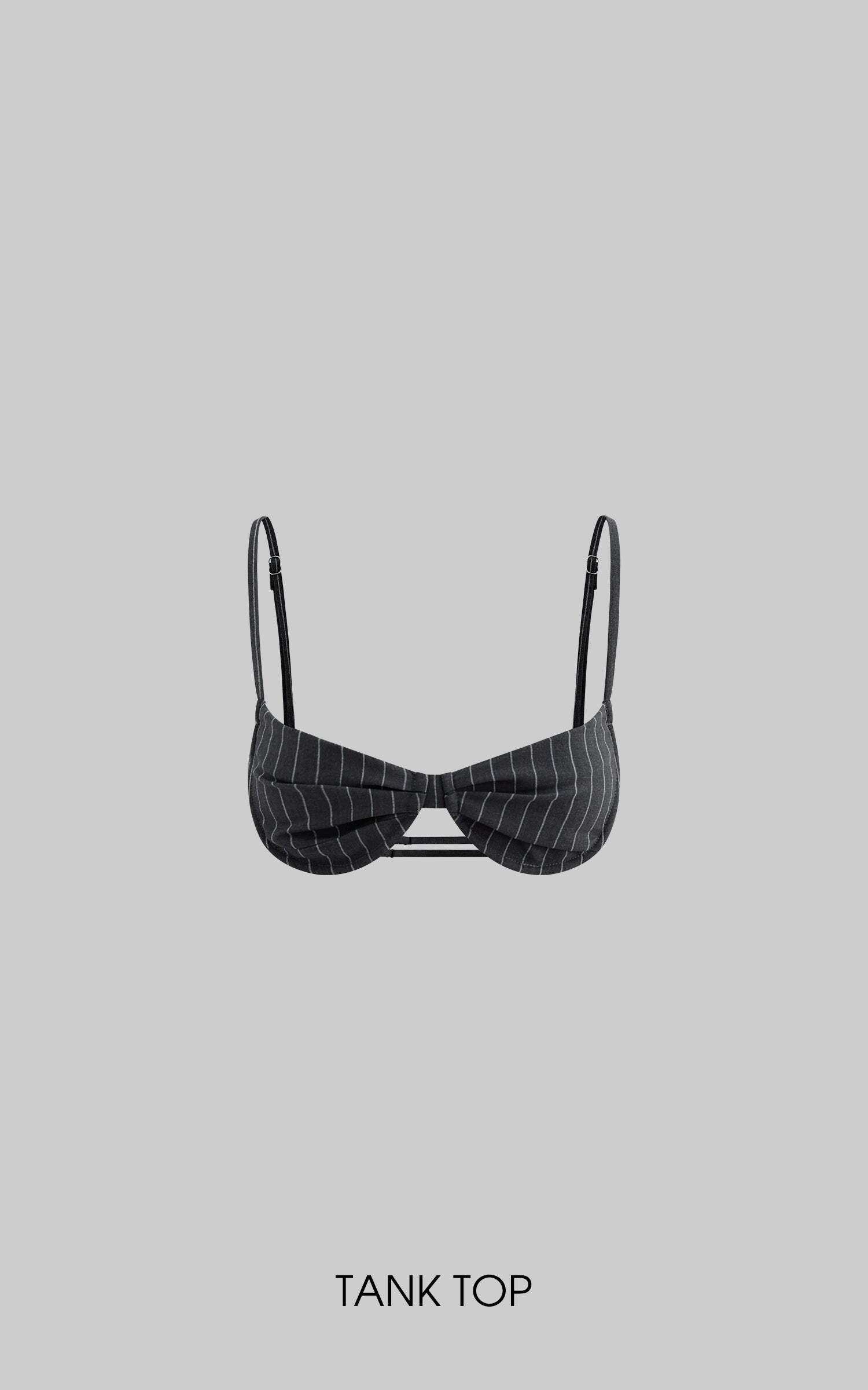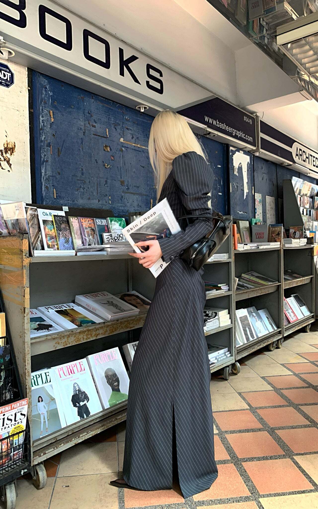 A collision of deconstructed tailoring and elegant lines, this set creates a striking visual tension. The structured blazer, featuring sharp padded shoulders and a subtly cinched waist, is redefined with a low-cut zip front—an interplay of boldness and restraint. The high-waisted skirt disrupts convention with asymmetrical pleats, flowing into a draped silhouette that moves with an effortless grace. Vertical pinstripes elongate the form, weaving together modernity and vintage sophistication. More than just an outfit, this ensemble is a statement—blurring the lines between precision and emotion, offering the wearer the freedom to shift seamlessly between identities.