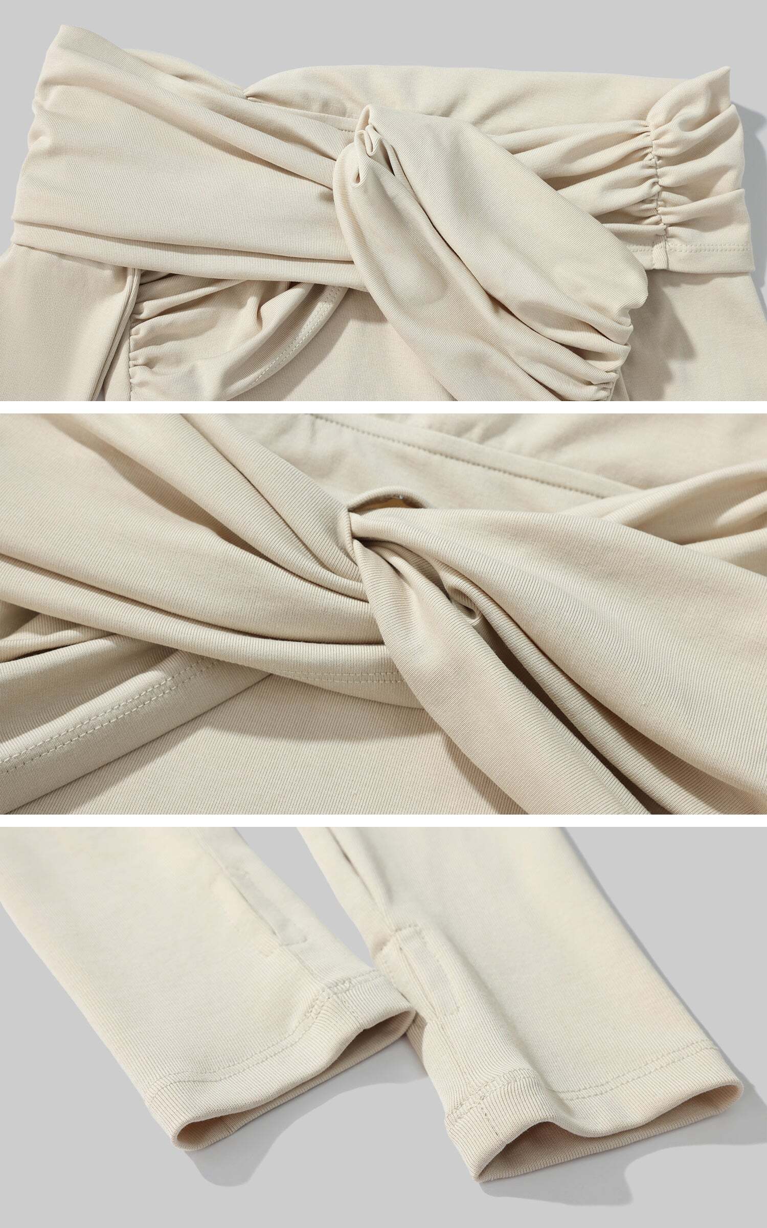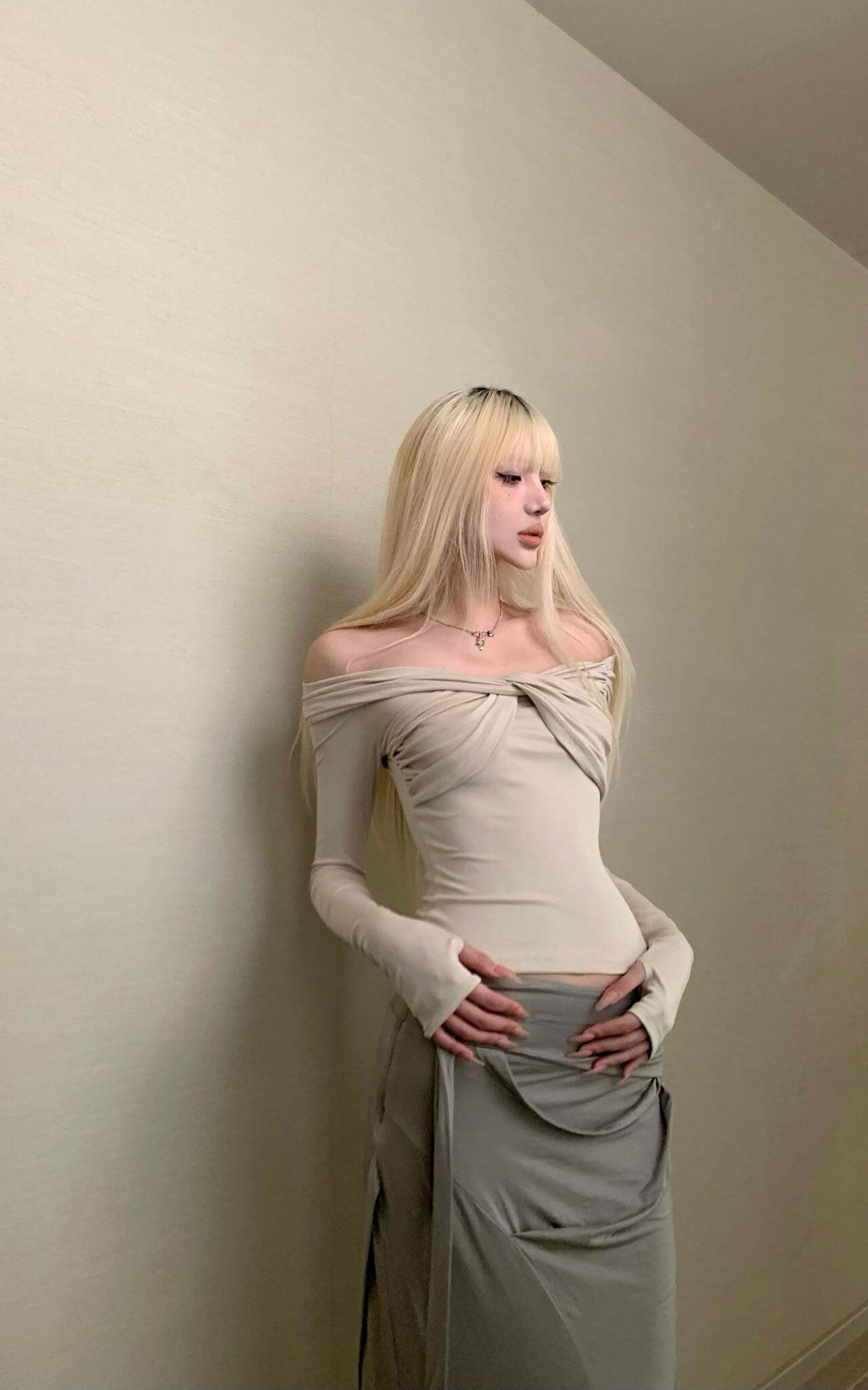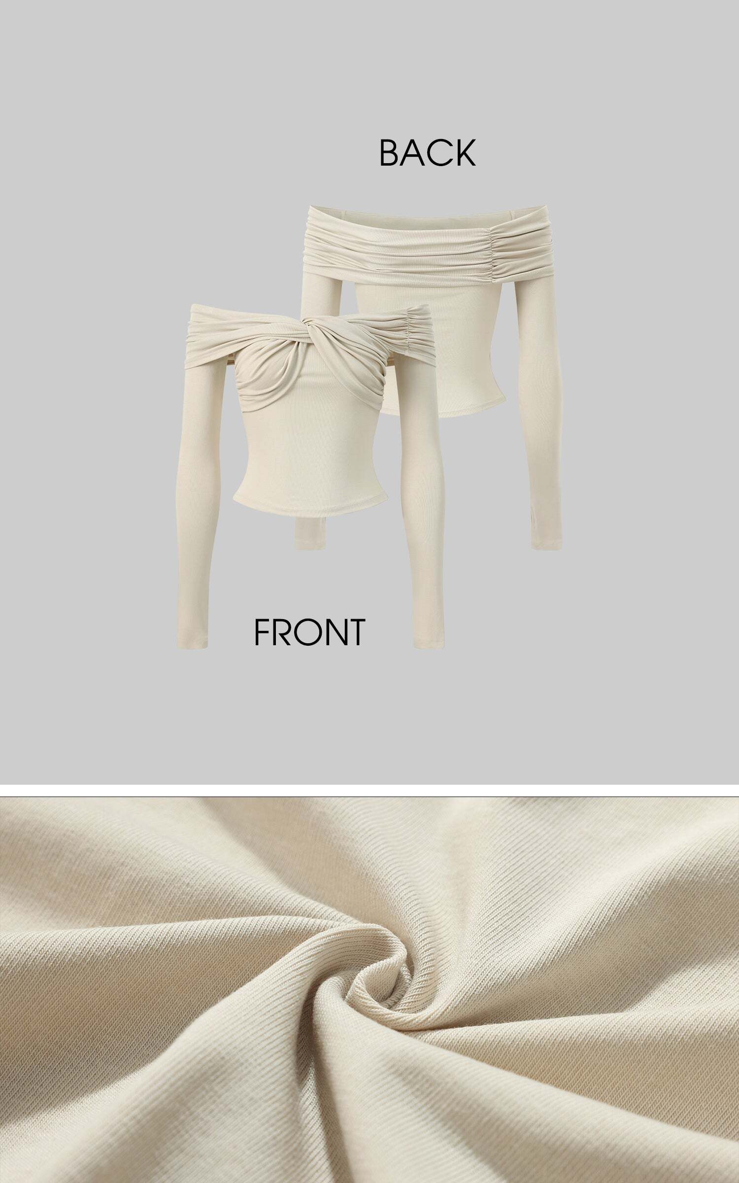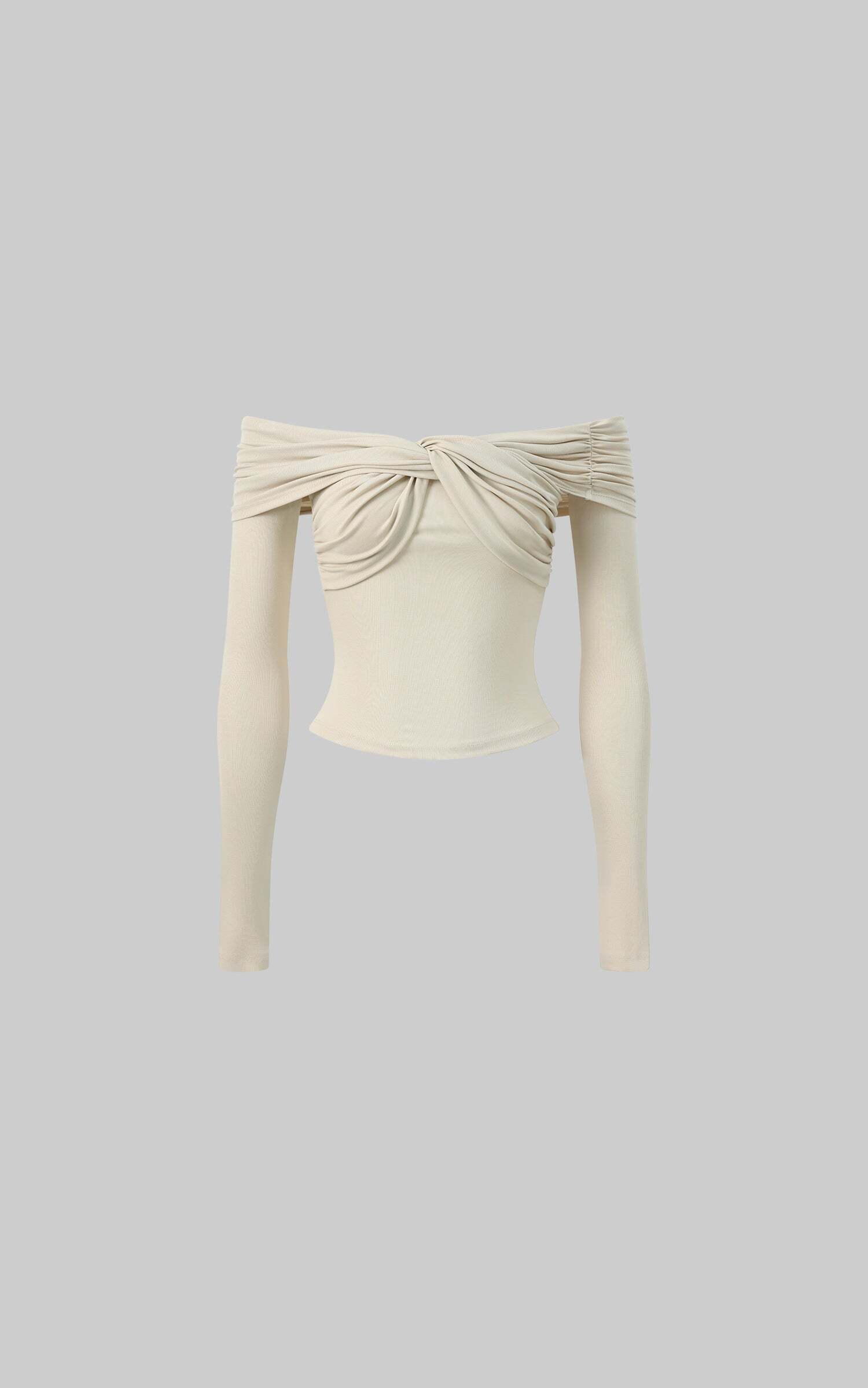 Garments here are extensions of the body, not adornments. This off-shoulder top reveals the collarbones in quiet defiance, with a twisted front that gathers like a tension held inward. The ribbed fabric moves with subtle elasticity, tracing the form with restraint. Cuffs extend into finger-loop details, elongating gesture. It does not speak the language of daily wear—but of something far more intimate.