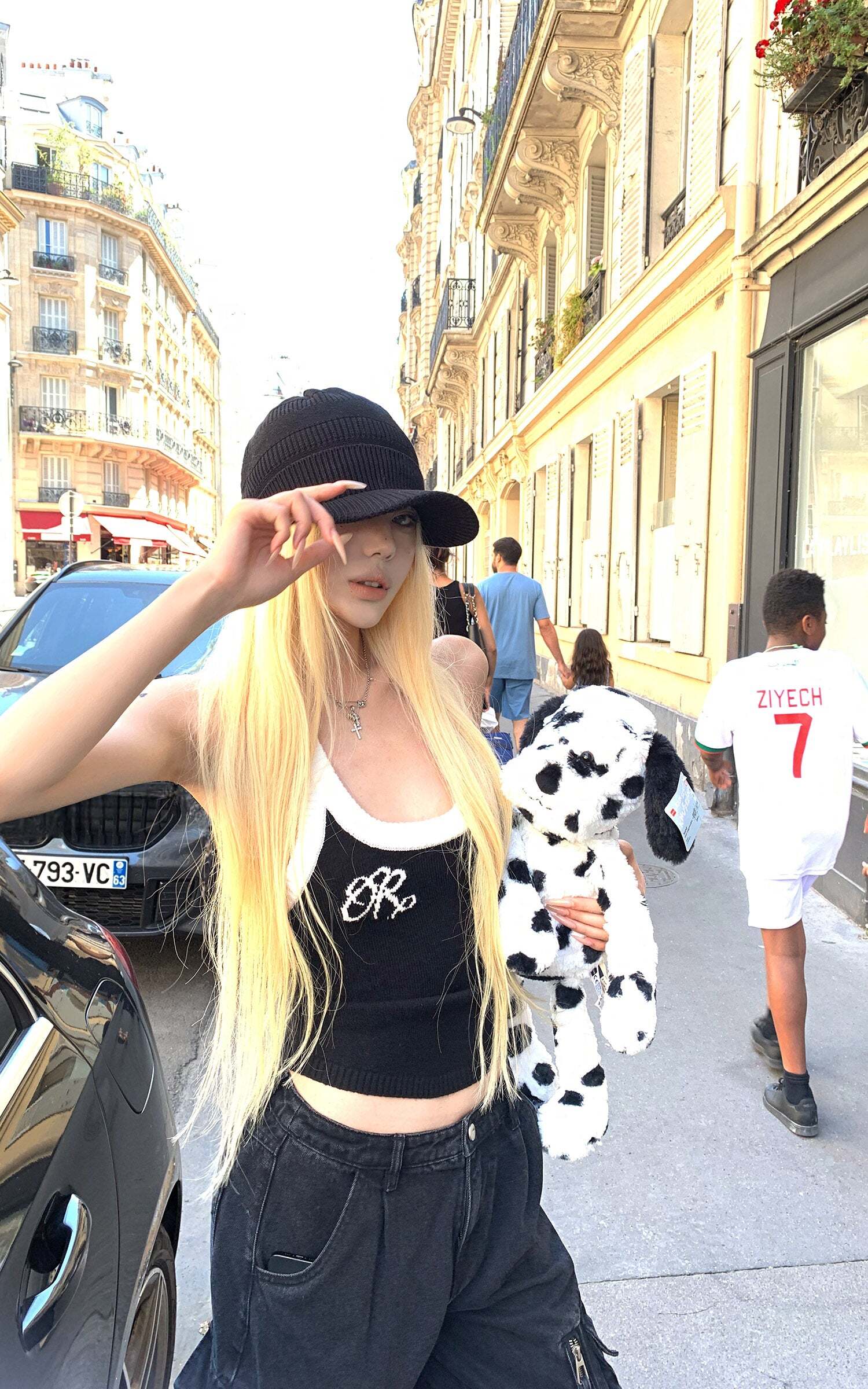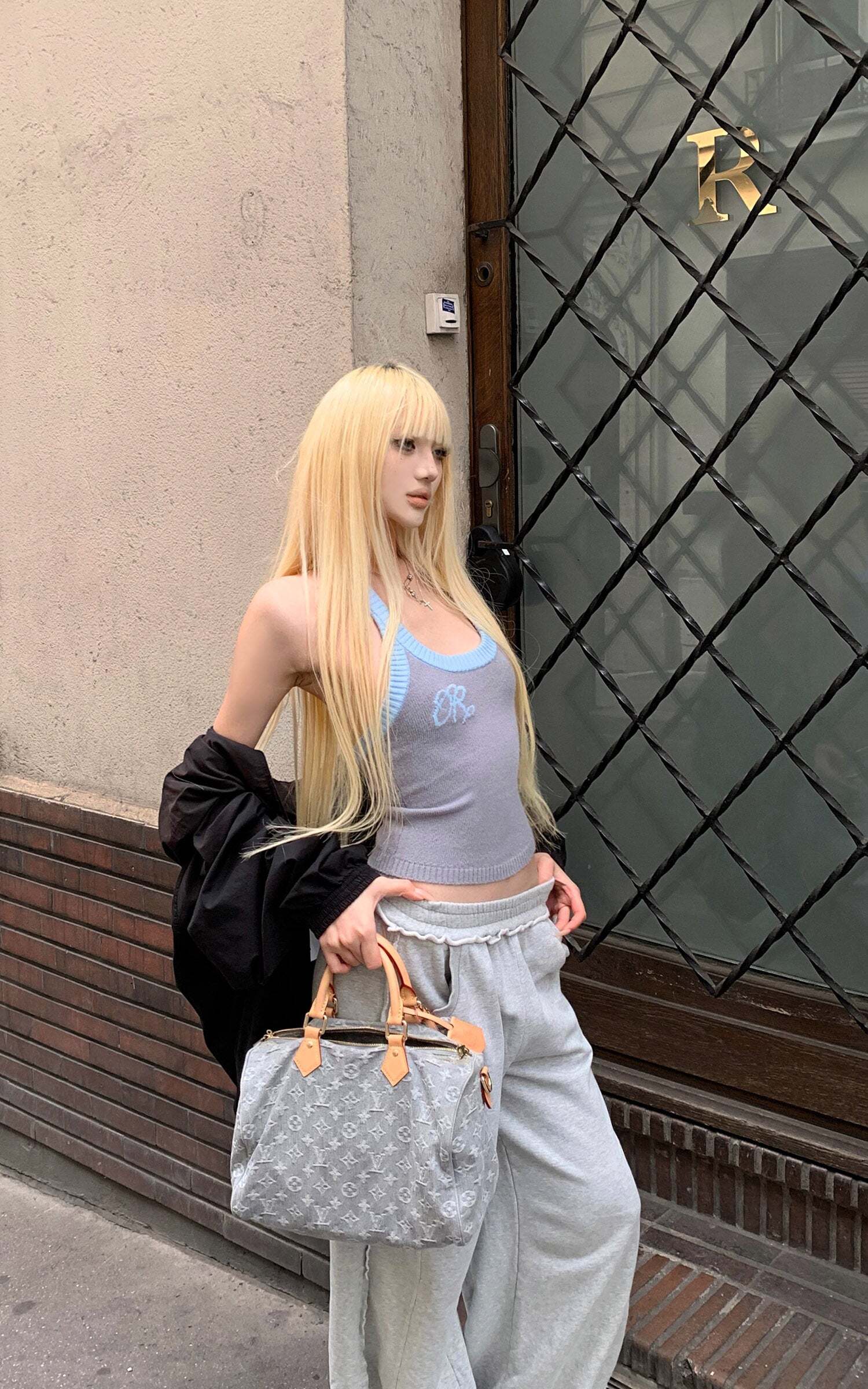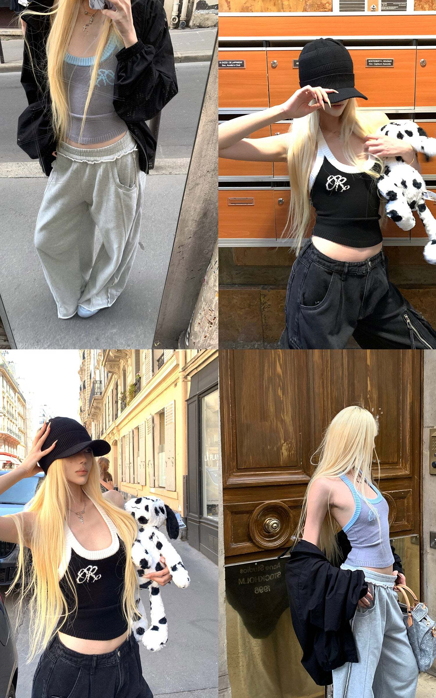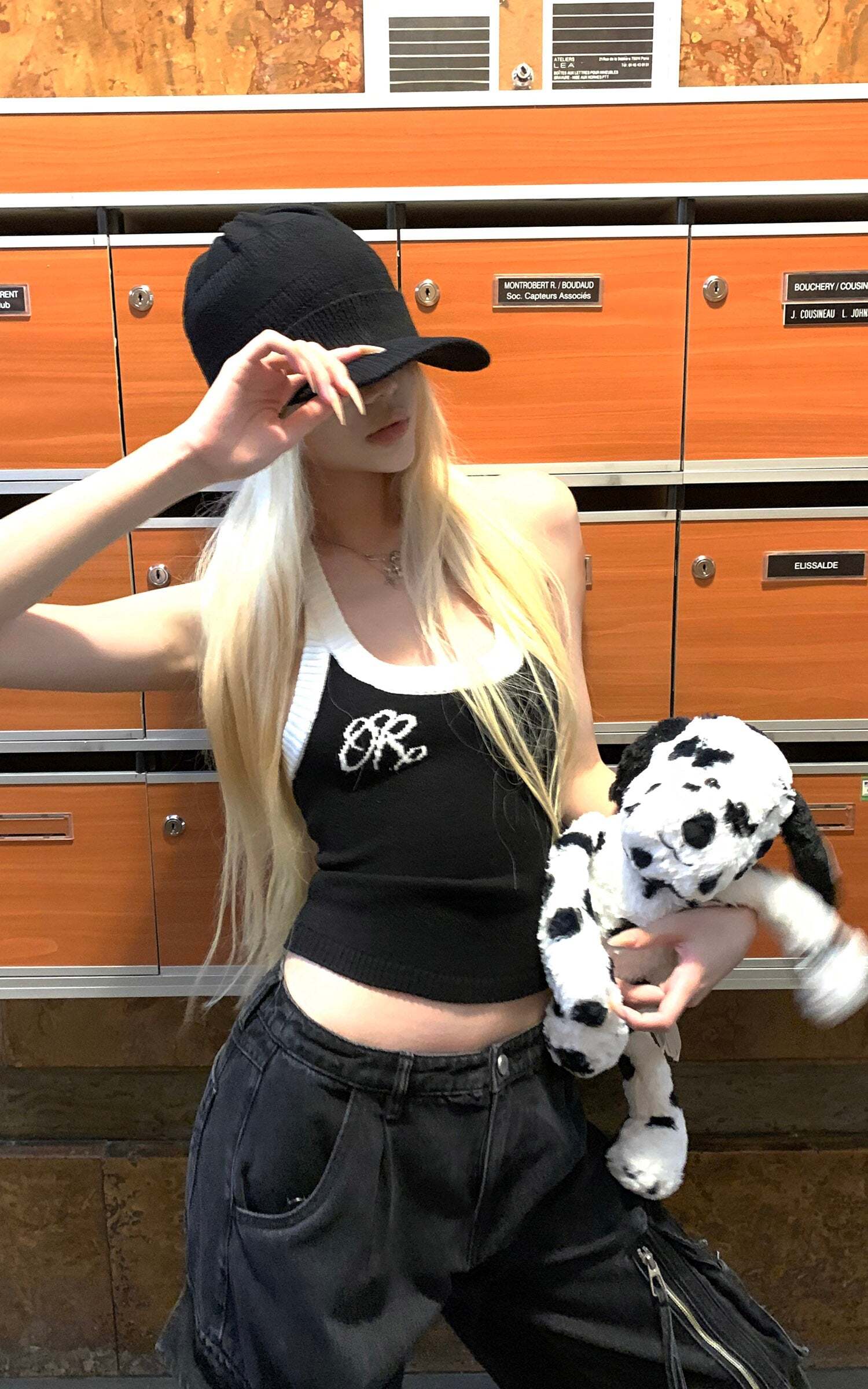 A slim-fit knit tank that clings gently without constriction, crafted from soft, skin-friendly yarn. The silhouette flows cleanly, with tonal depth enhanced by the ribbed texture. Featuring a two-tone neckline and shoulder trim that brings contrast to its minimalist form, the front is embroidered with an abstract graphic—unrefined yet intentional. Wear it solo or layered under a shirt or leather jacket to channel a quiet, emotive urban presence.