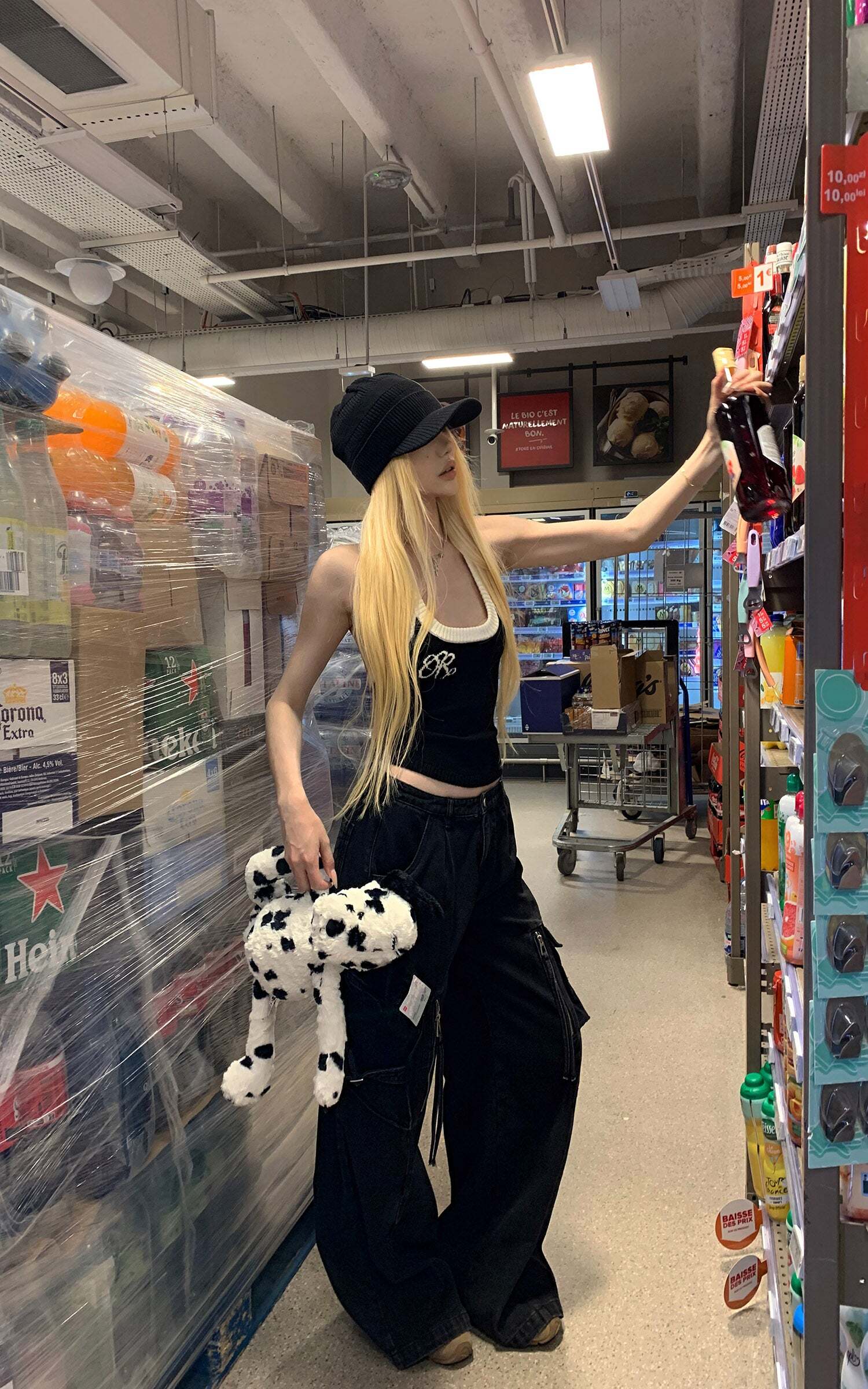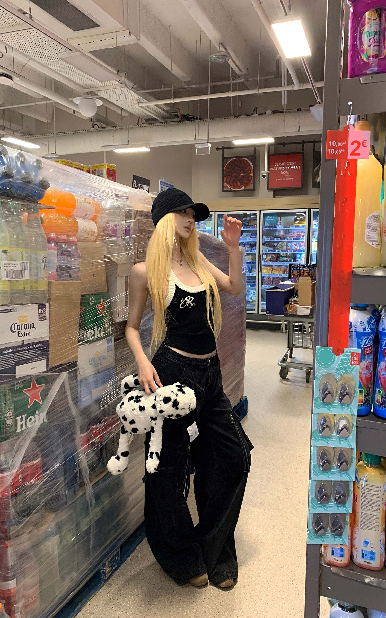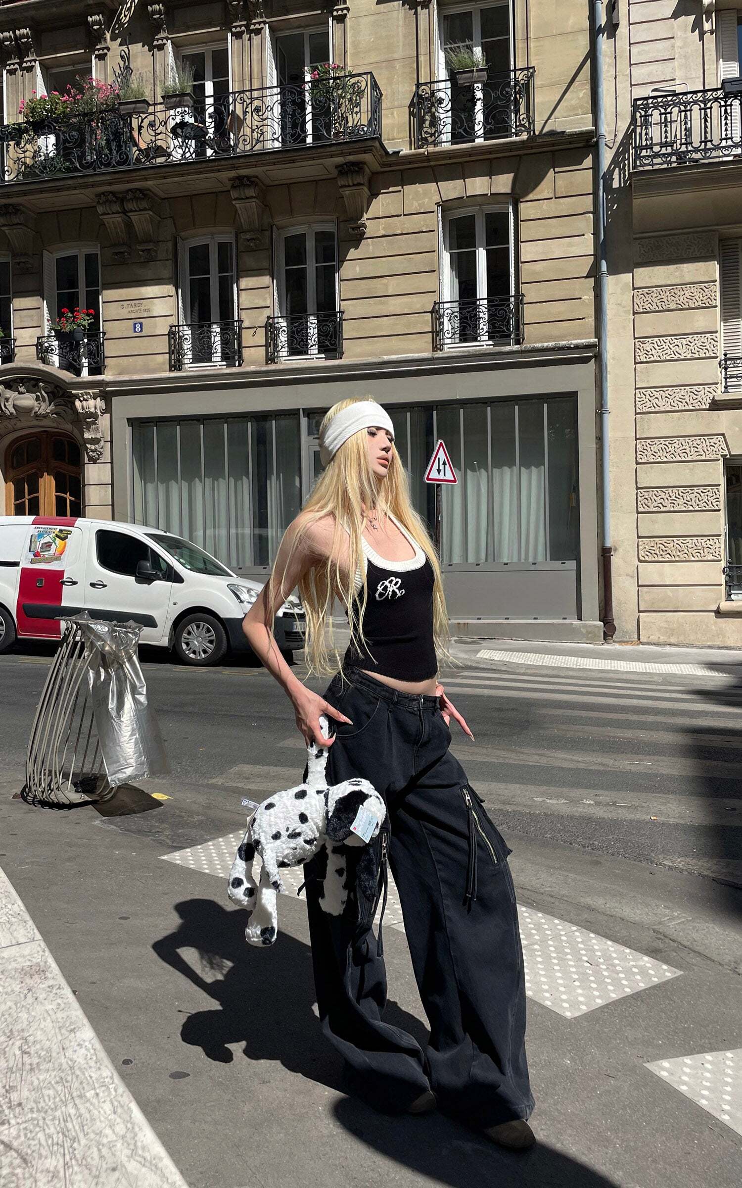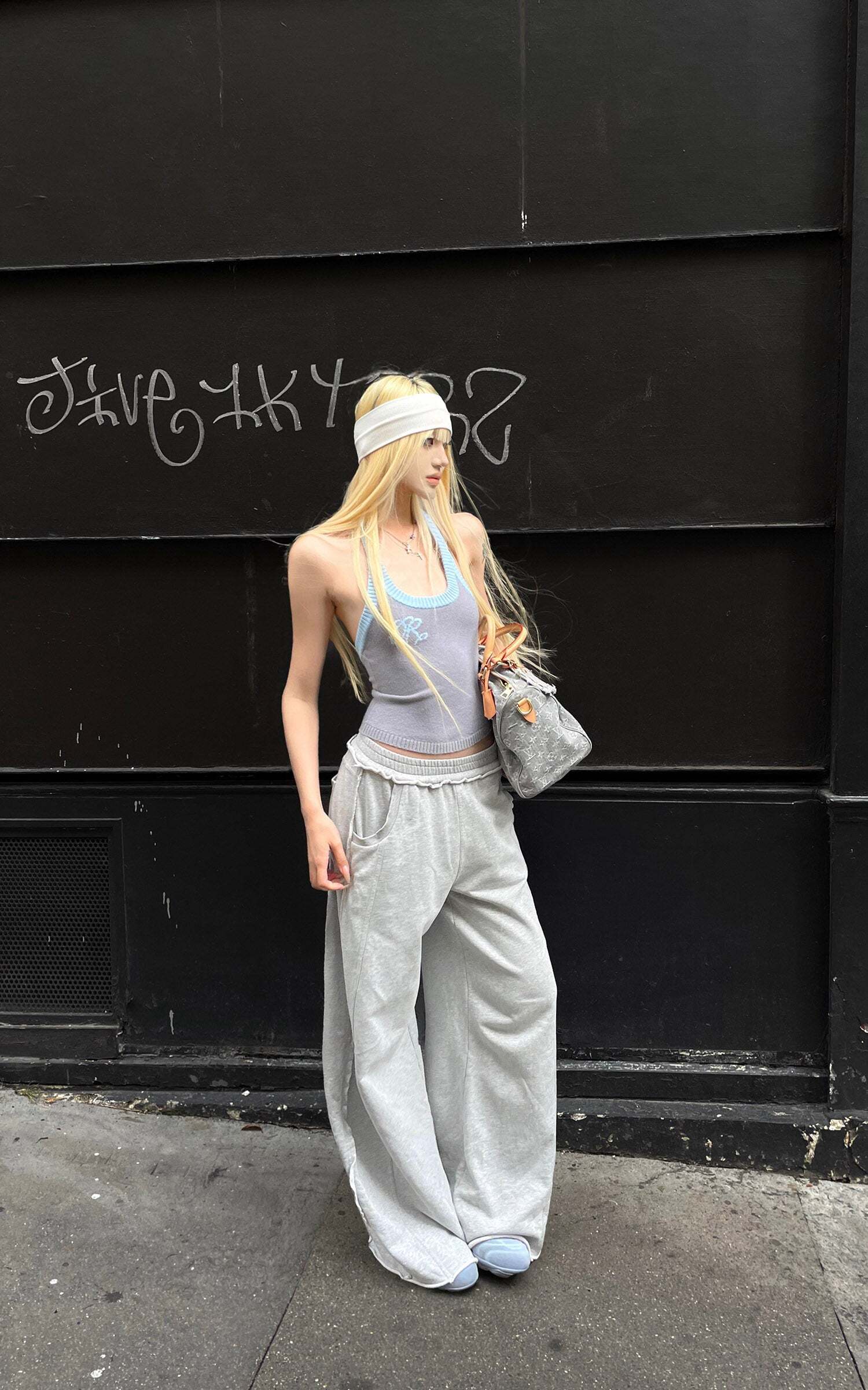 A slim-fit knit tank that clings gently without constriction, crafted from soft, skin-friendly yarn. The silhouette flows cleanly, with tonal depth enhanced by the ribbed texture. Featuring a two-tone neckline and shoulder trim that brings contrast to its minimalist form, the front is embroidered with an abstract graphic—unrefined yet intentional. Wear it solo or layered under a shirt or leather jacket to channel a quiet, emotive urban presence.