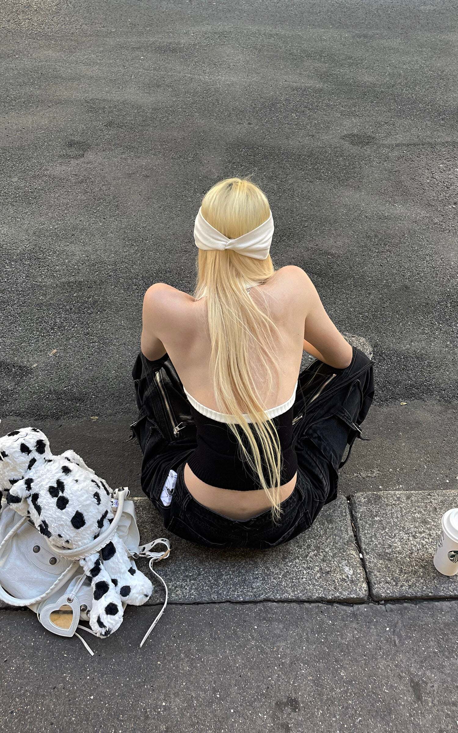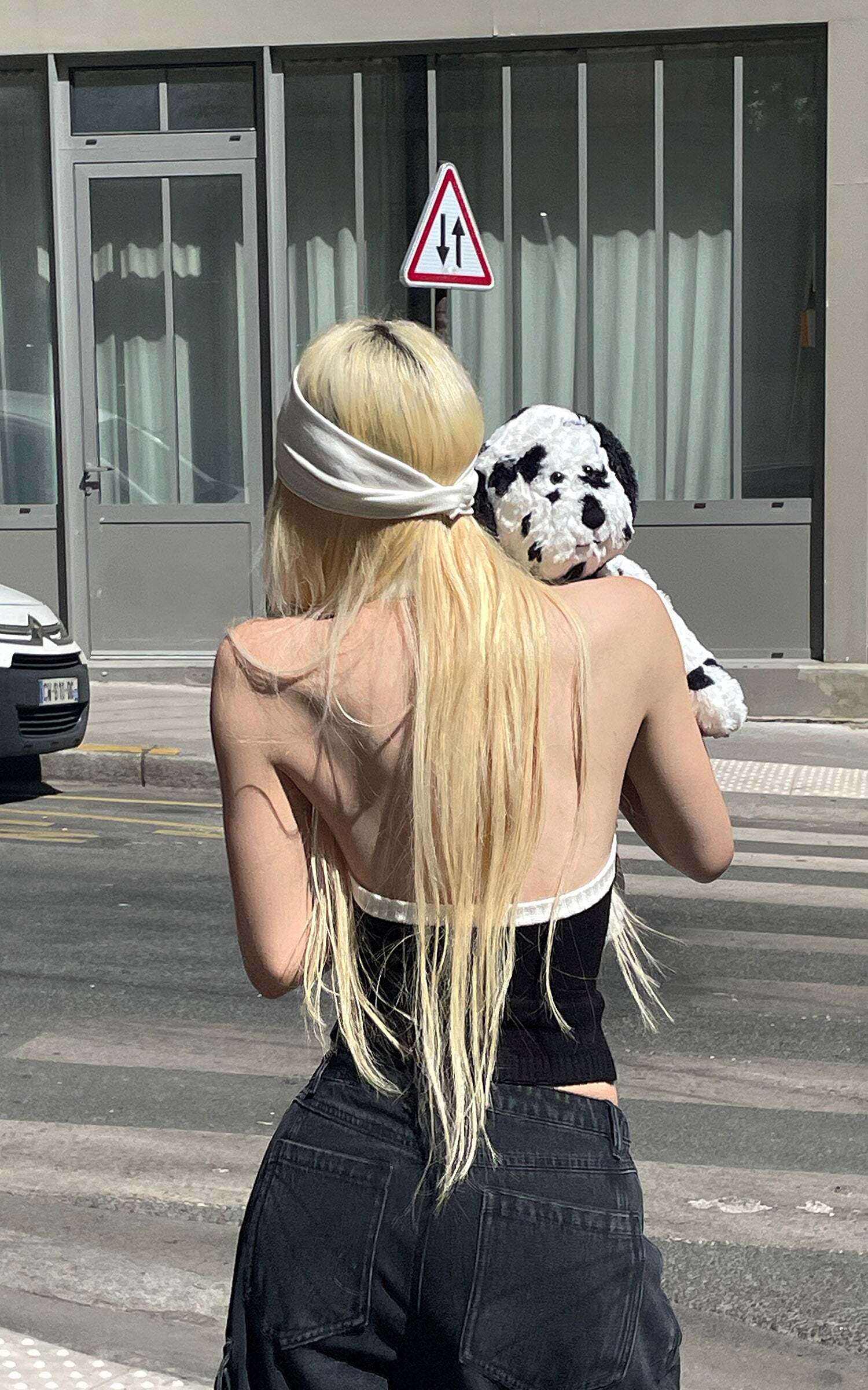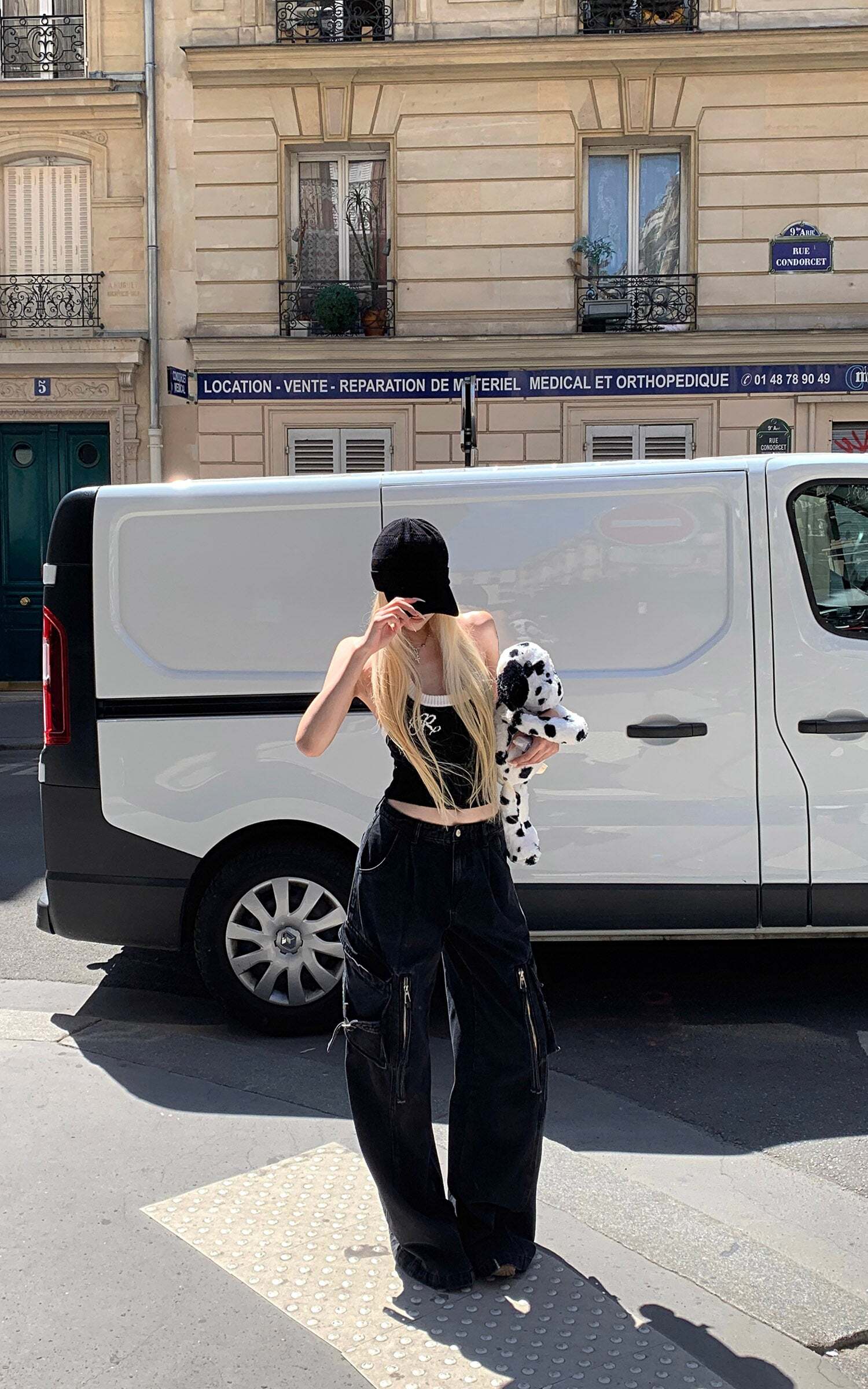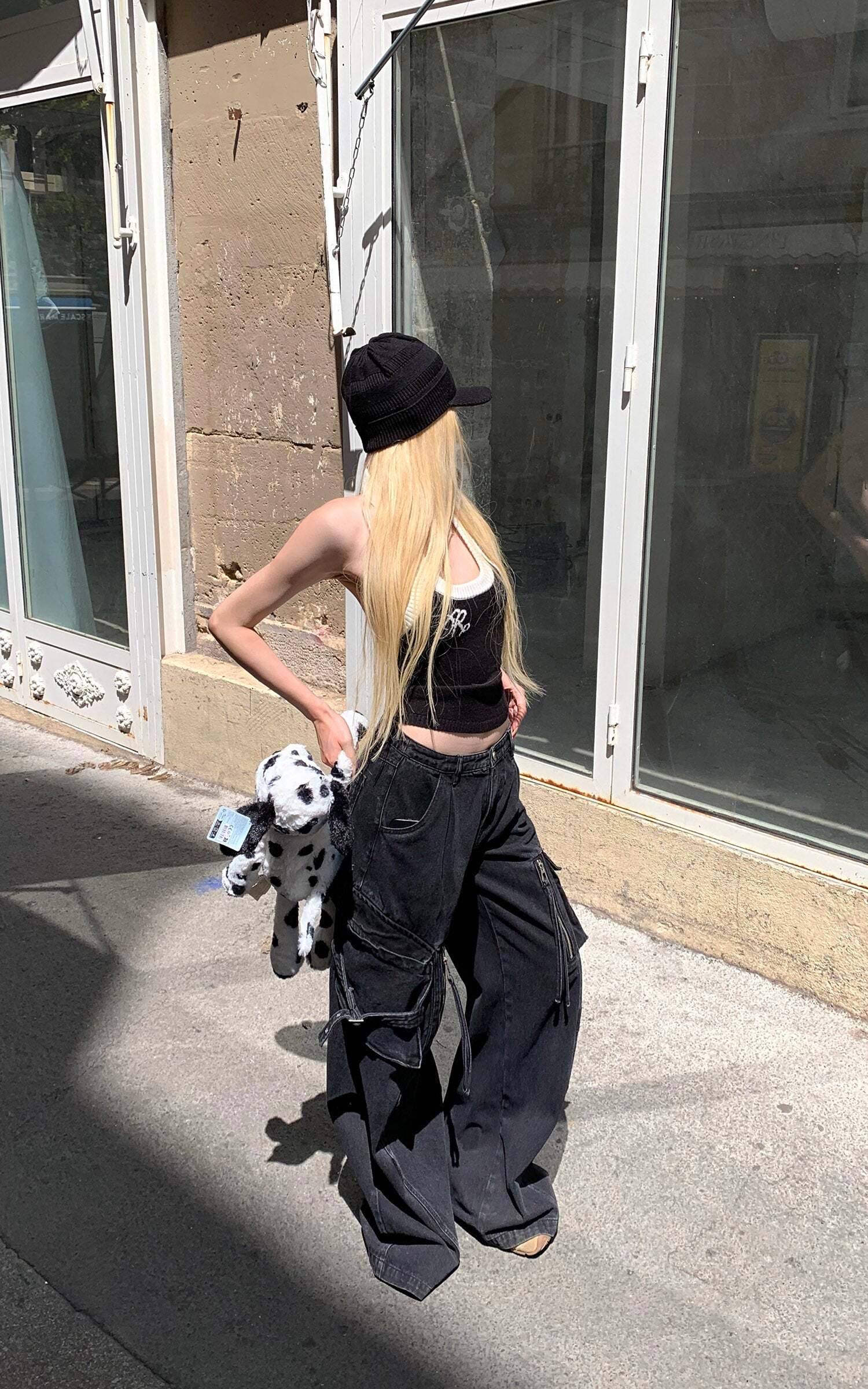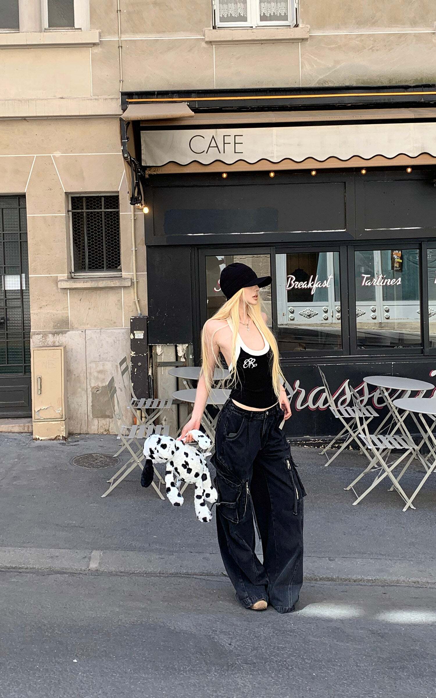 A slim-fit knit tank that clings gently without constriction, crafted from soft, skin-friendly yarn. The silhouette flows cleanly, with tonal depth enhanced by the ribbed texture. Featuring a two-tone neckline and shoulder trim that brings contrast to its minimalist form, the front is embroidered with an abstract graphic—unrefined yet intentional. Wear it solo or layered under a shirt or leather jacket to channel a quiet, emotive urban presence.