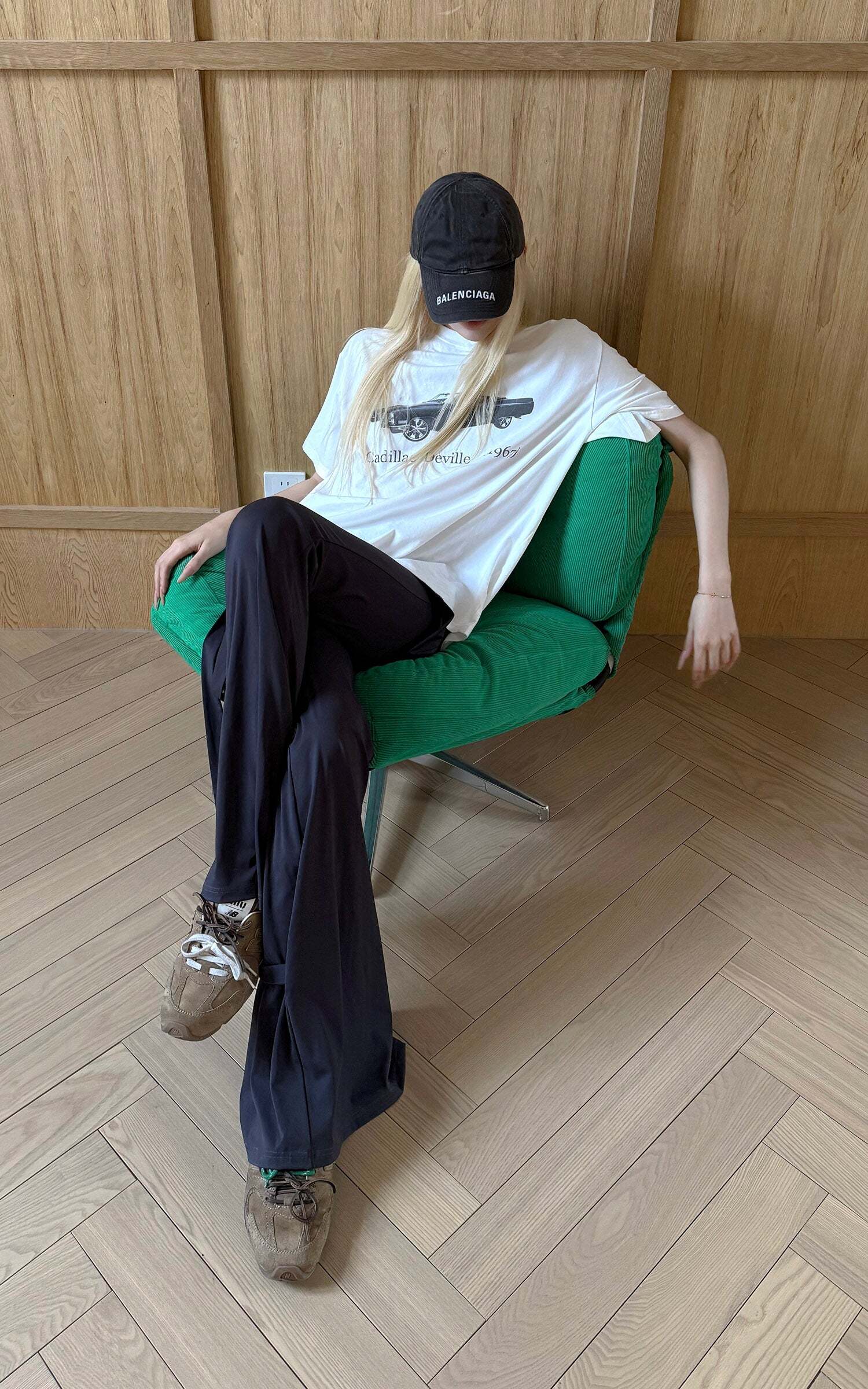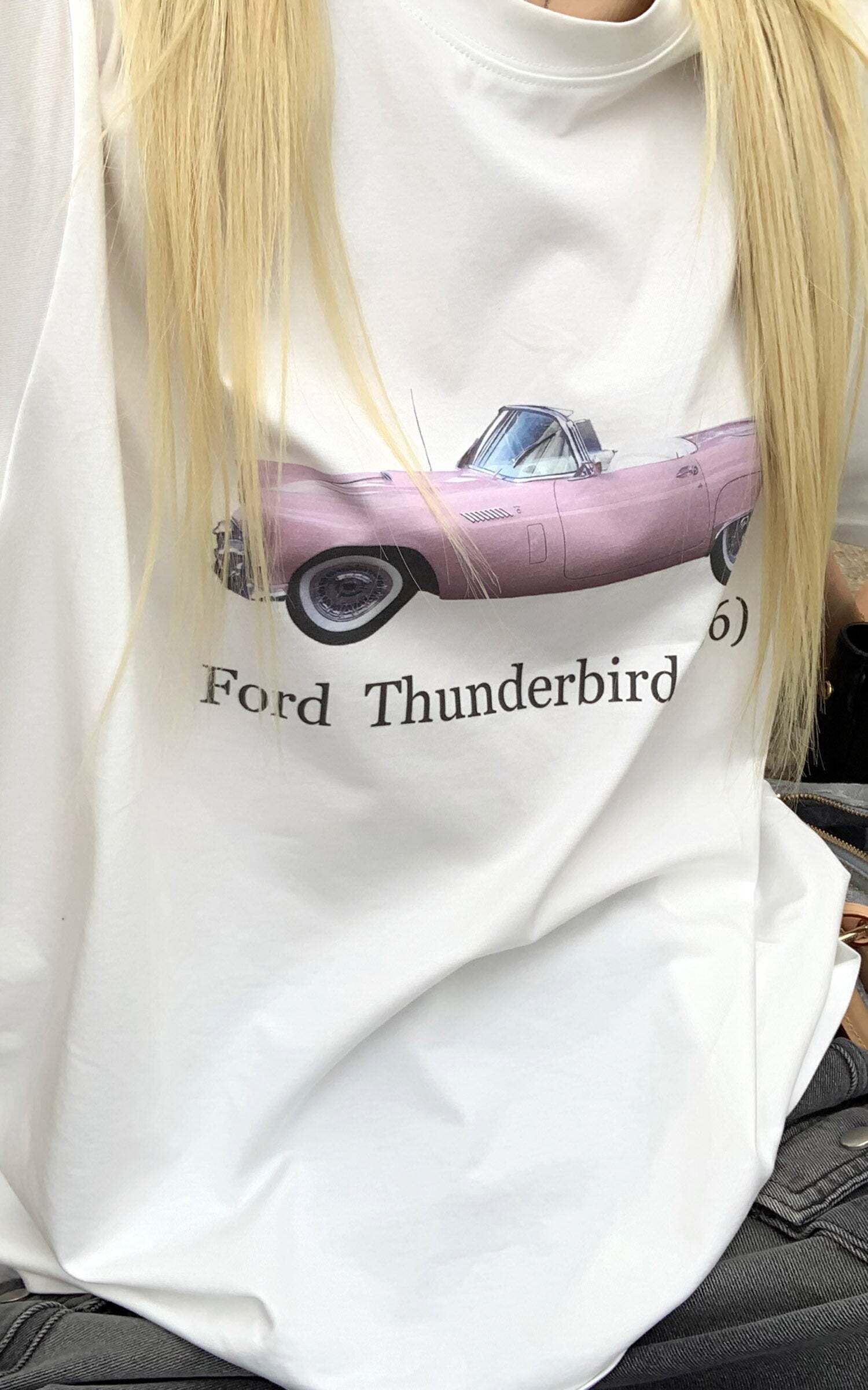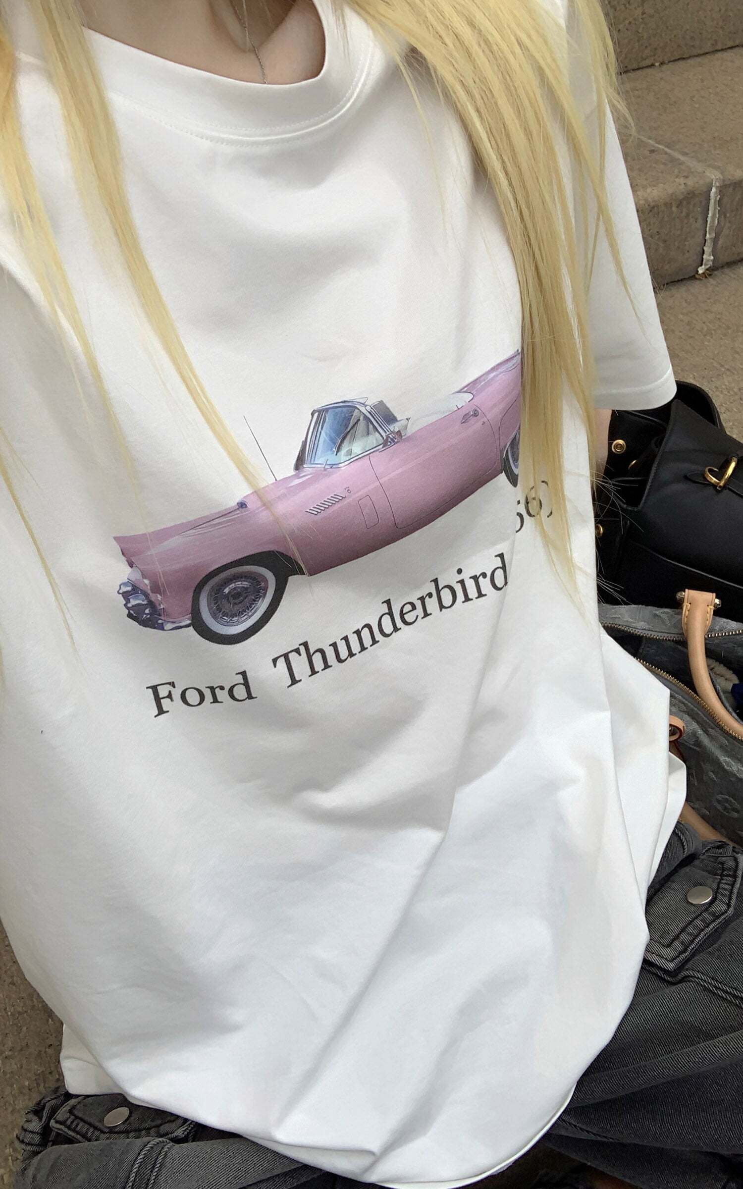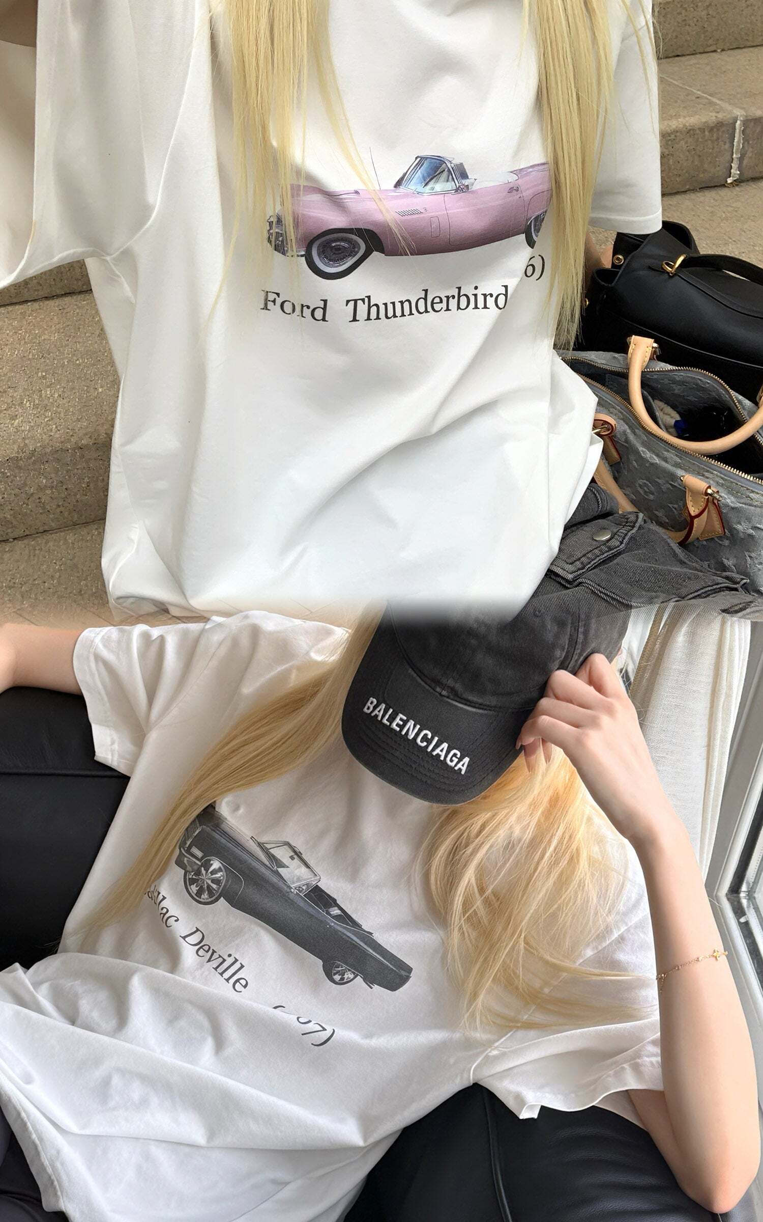 This short-sleeve tee features prints of the iconic 1956 Ford Thunderbird and 1967 Cadillac Deville, accompanied by clean retro typography—visual echoes from a different era. The oversized, gender-neutral silhouette with drop shoulders offers a nonchalant blend of street ease and quiet elegance. Crafted from soft, breathable cotton, it’s ideal for everyday layering through spring and summer. A piece that speaks without volume—like a poem driving in from the past.