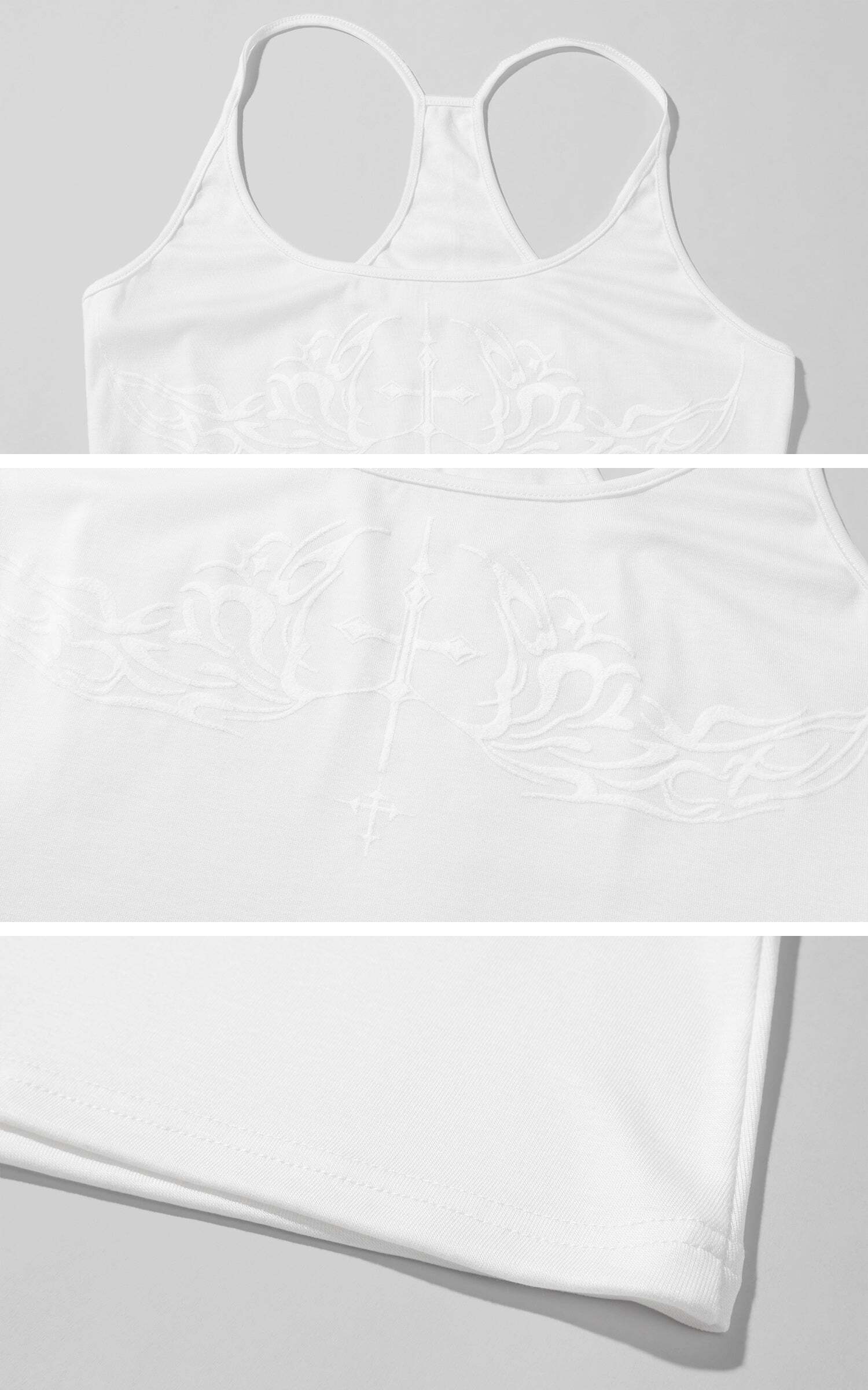 Minimalism as language, silhouette as statement. The slim straps cross at the back, tracing a sharp and skeletal line, while subtle embroidered motifs at the chest emerge like shadows—restrained yet charged with quiet tension. Crafted from stretch knit fabric, it conforms to the body with a cool intimacy. Stripped of ornament, it is a dialogue between structure and skin, allowing the wearer to shift fluidly between the ordinary and the extraordinary.