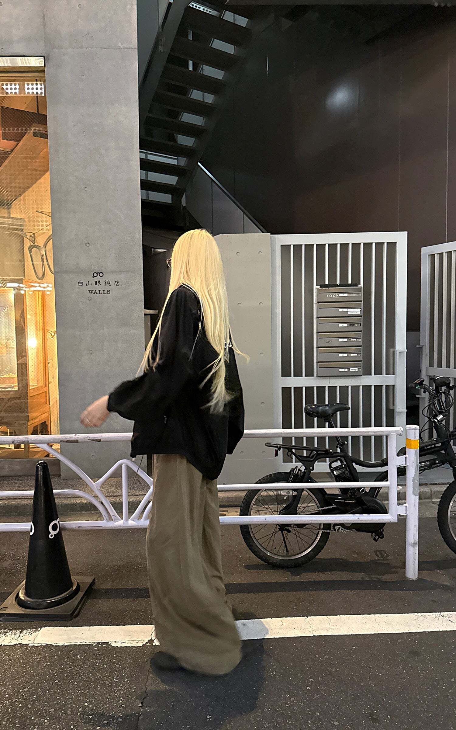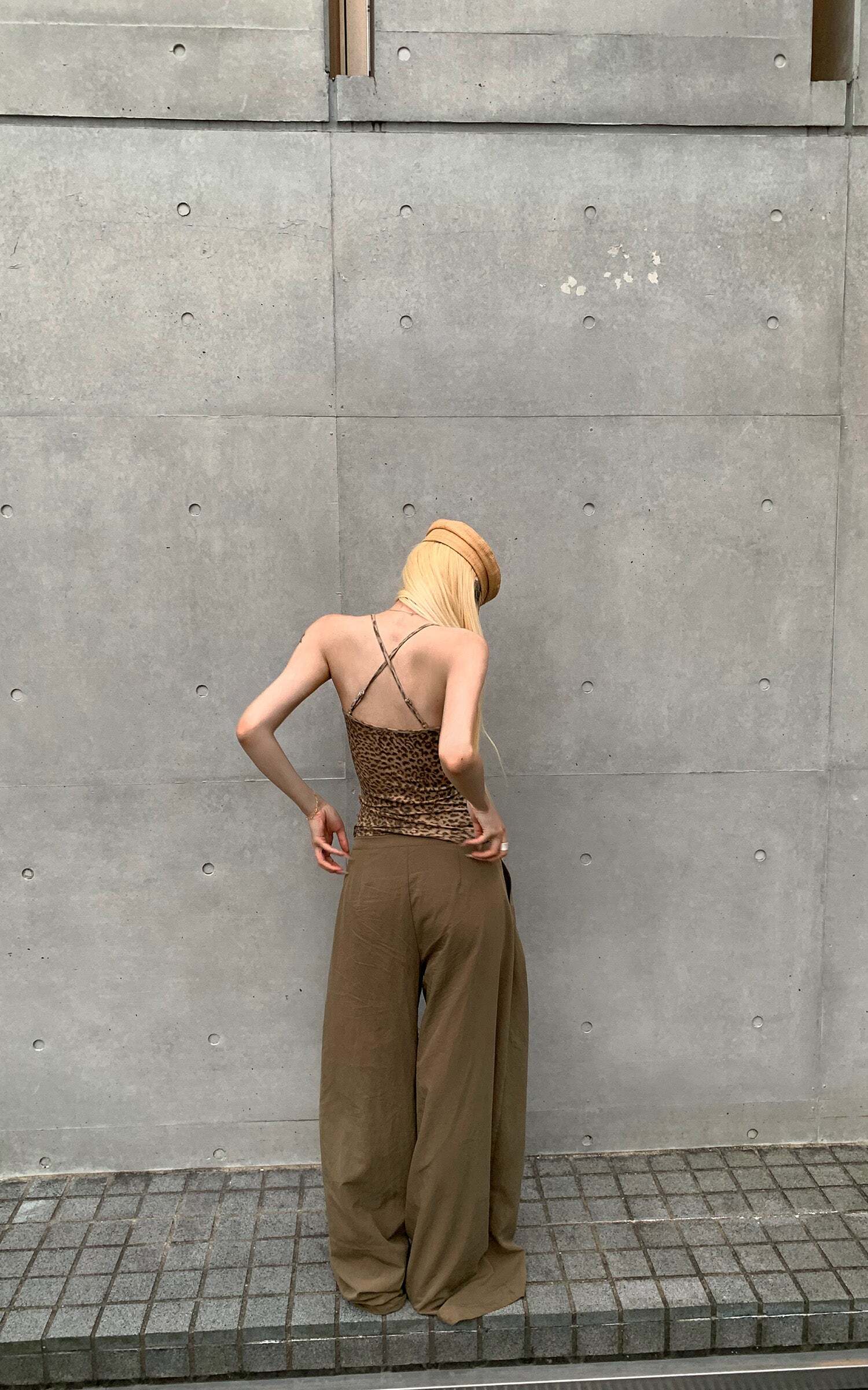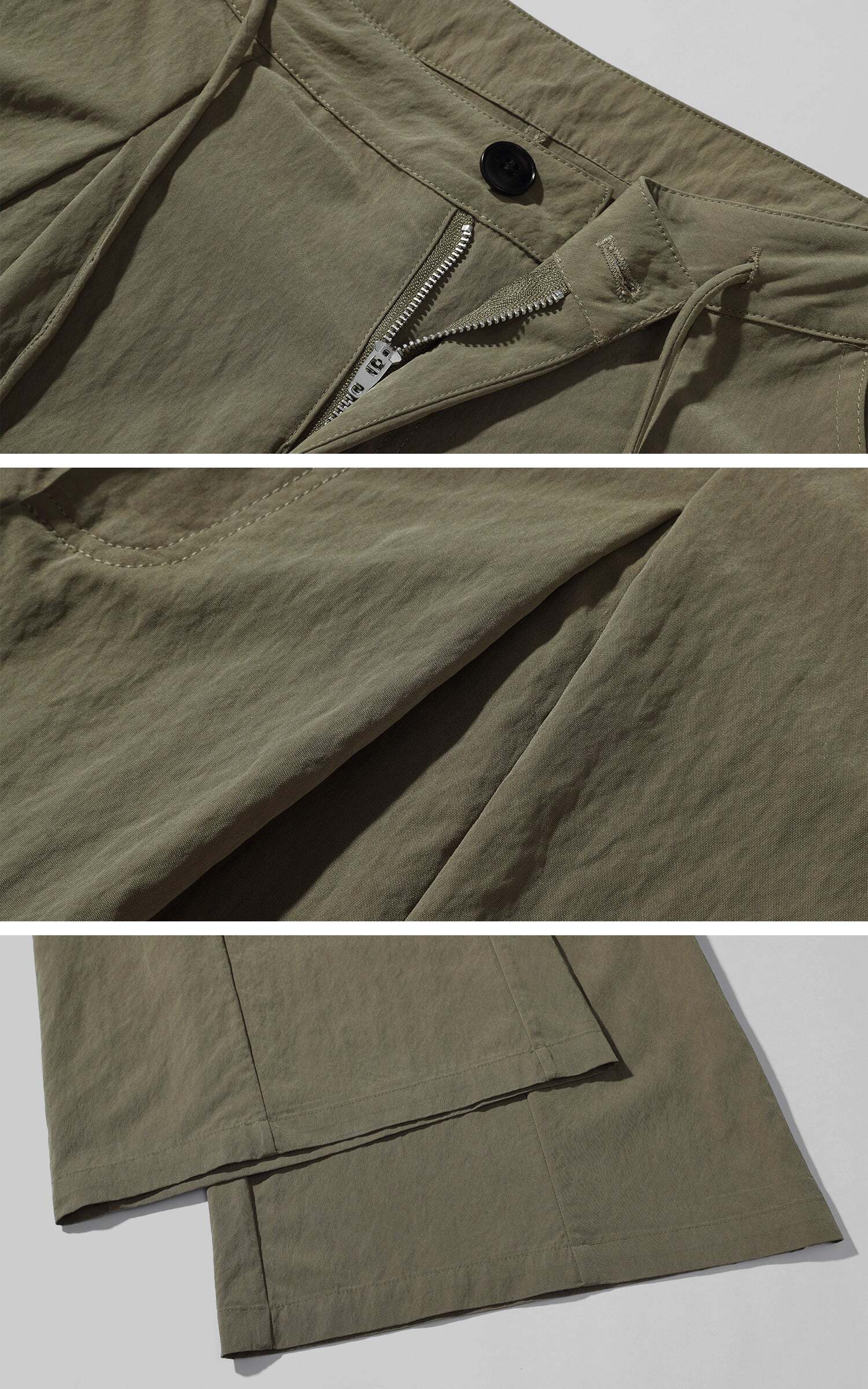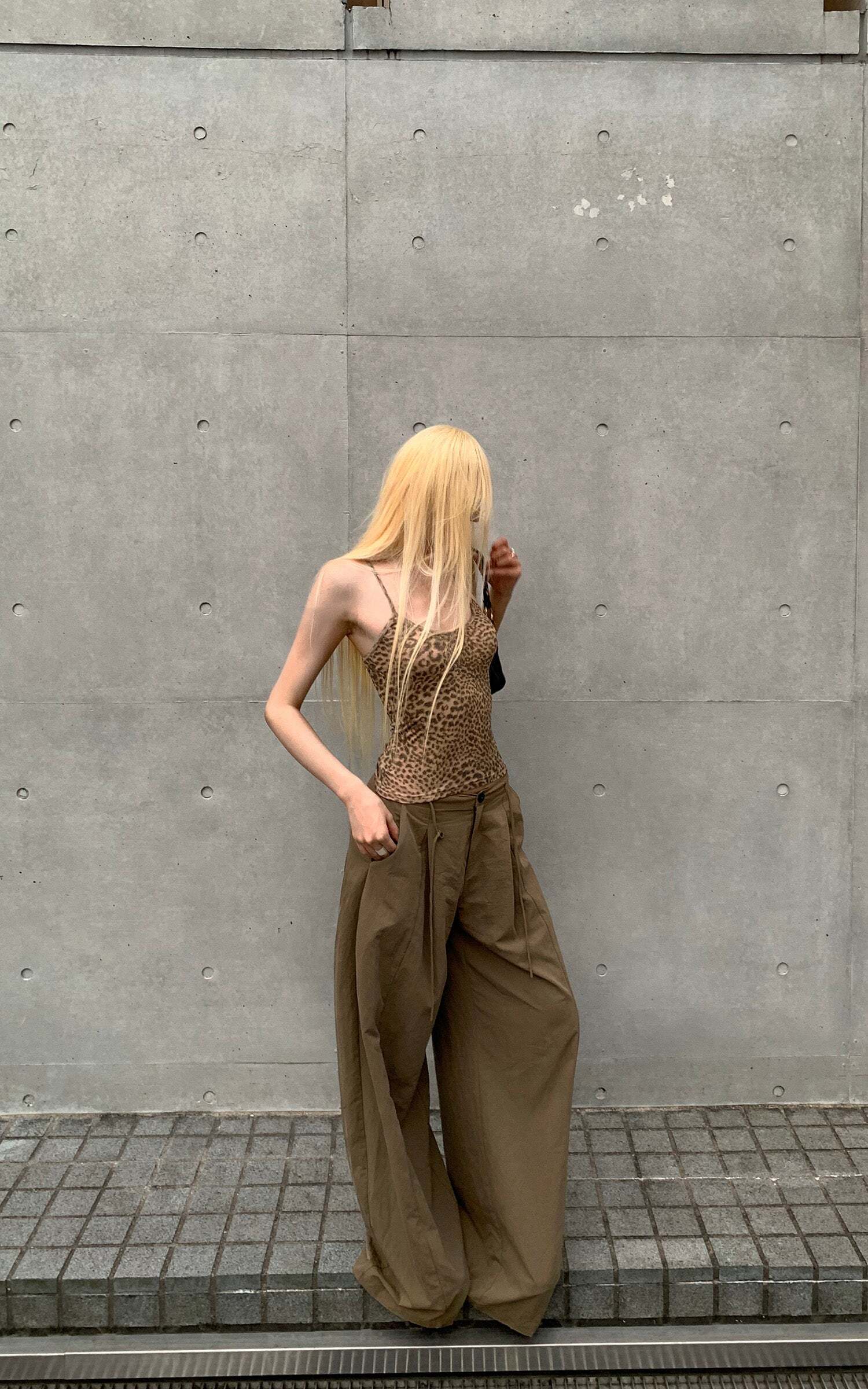 Still as a form, fluid in intent. These wide-leg trousers fall in deliberate weight, tracing slow motion with each stride. The lightweight fabric bears a natural crinkled grain, meeting structured pleats and a high-rise drawstring waistband that invites tension and release. Stripped of ornament, the design speaks through construction—subtly subverting the order of the everyday.