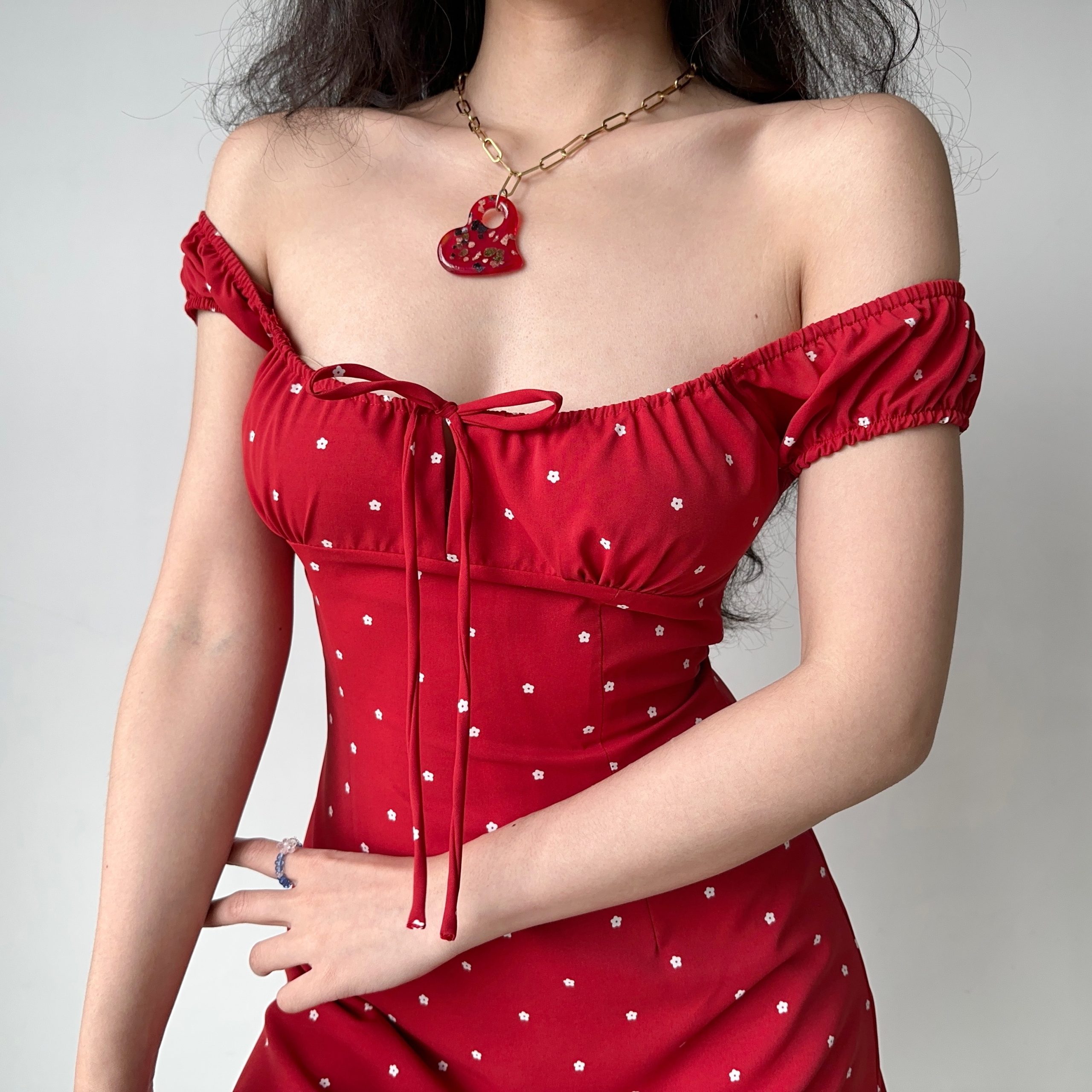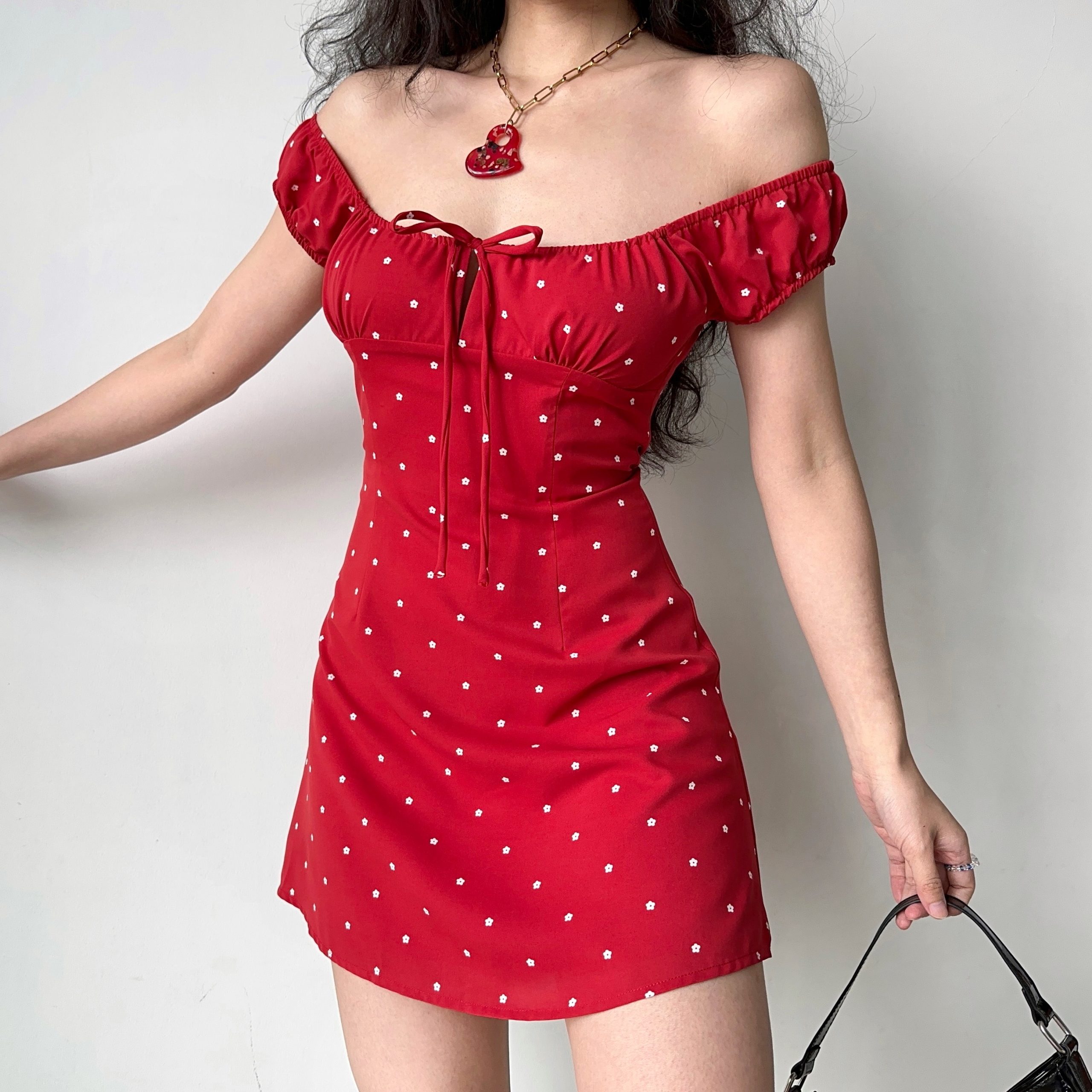 Red Floral Polka Dot Front Tie a Line Dress Slim Fit Short Skirt Girl – Skirt Outfits