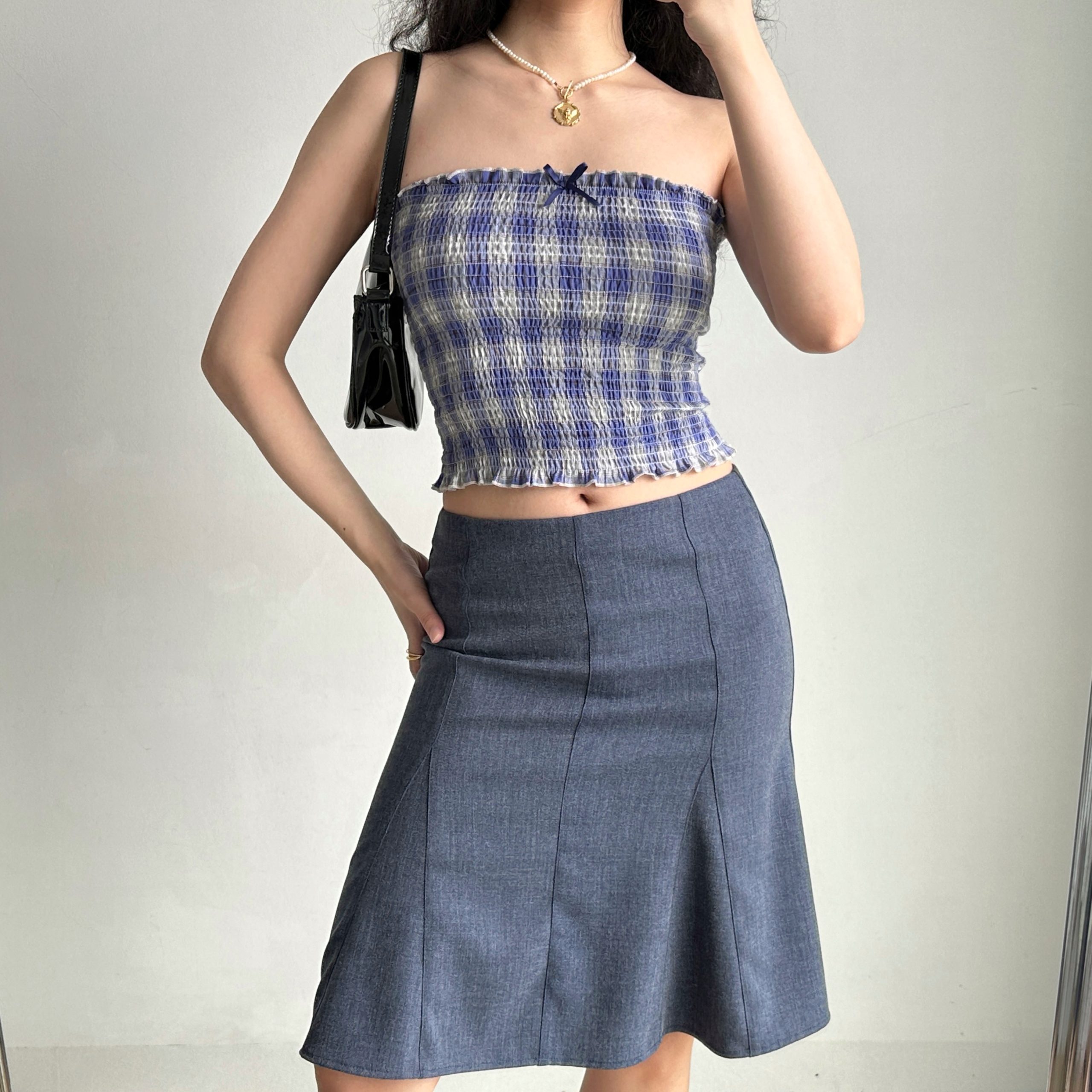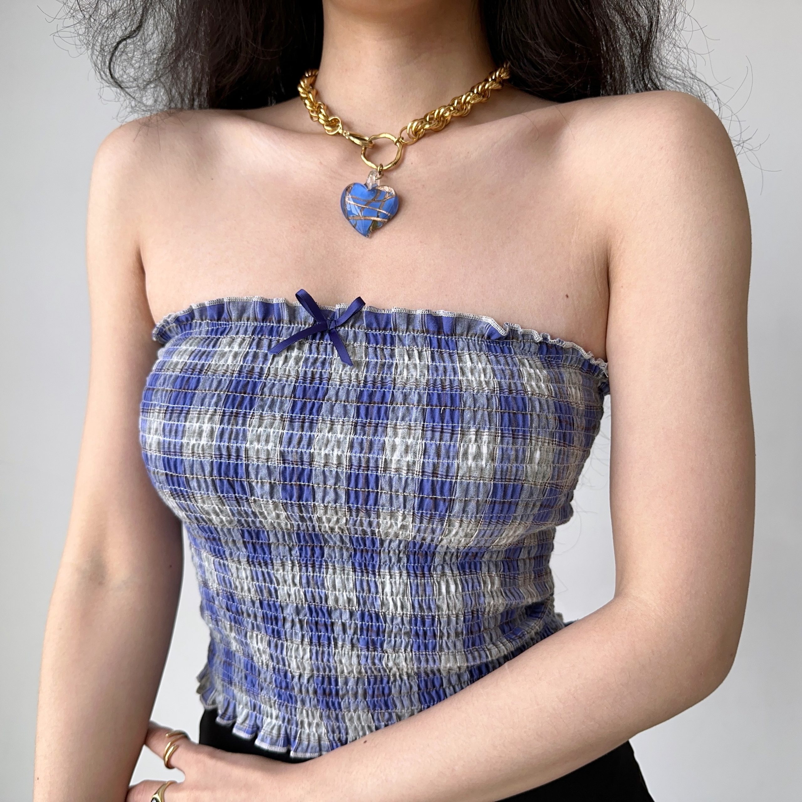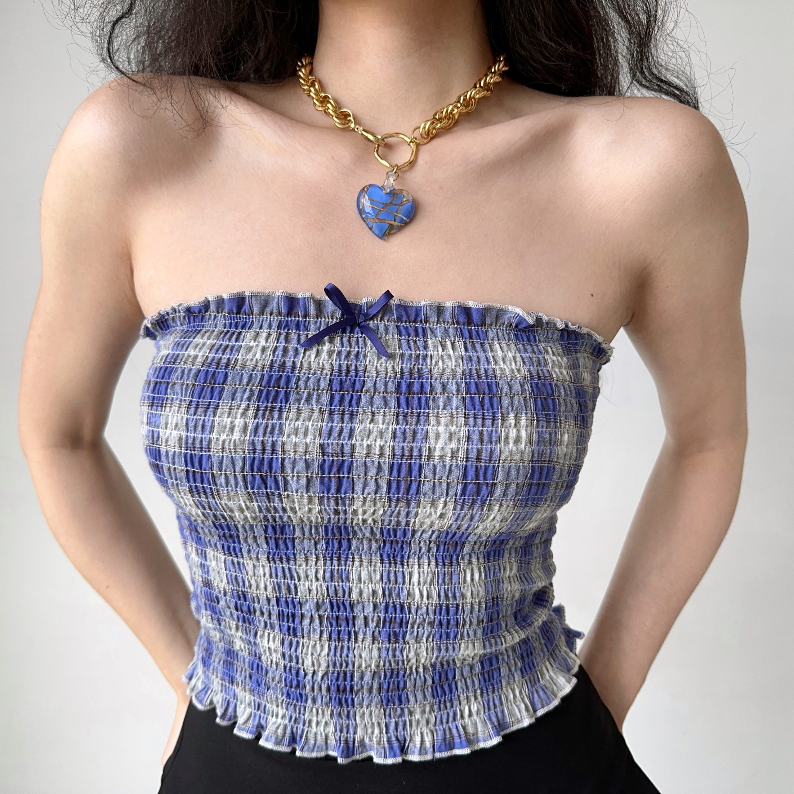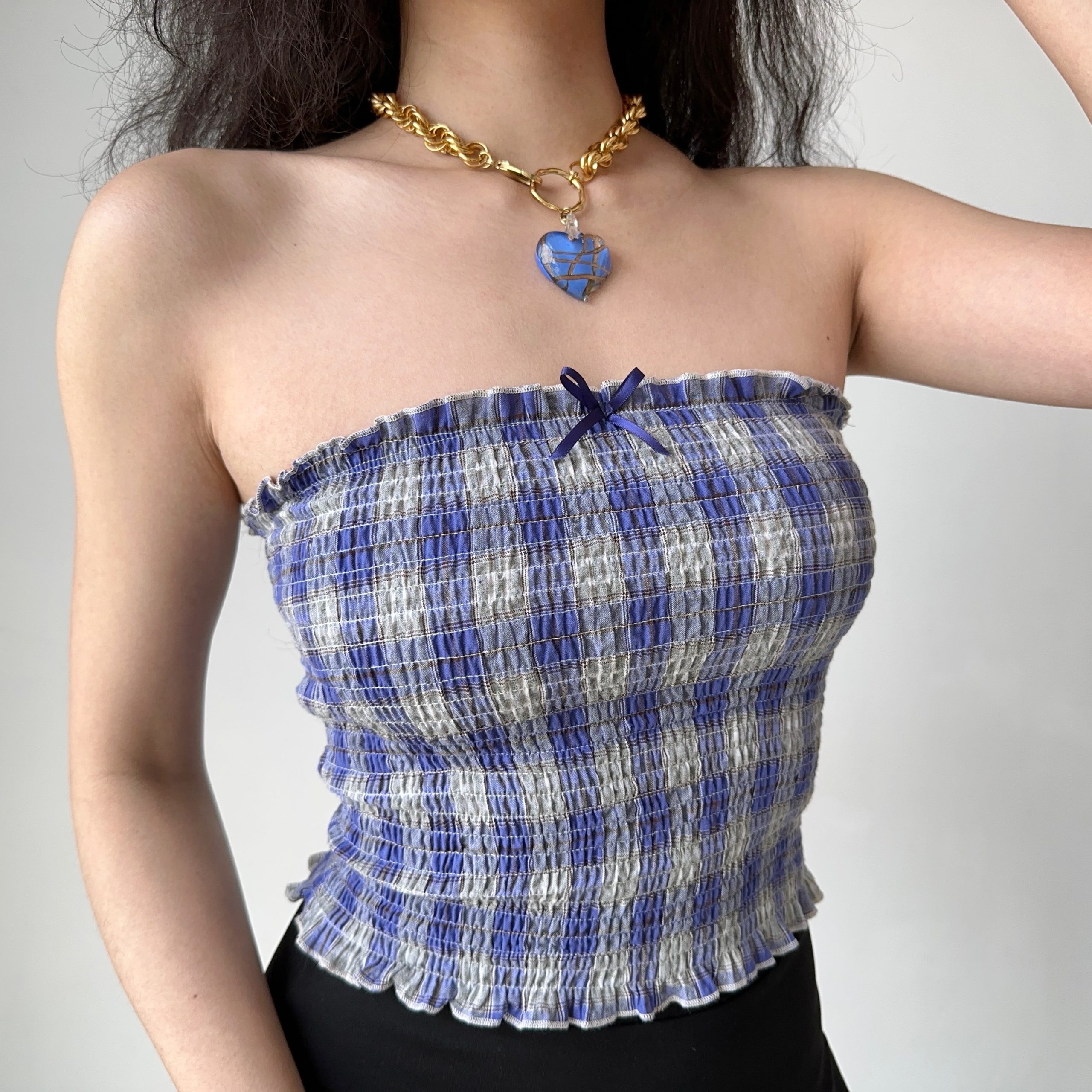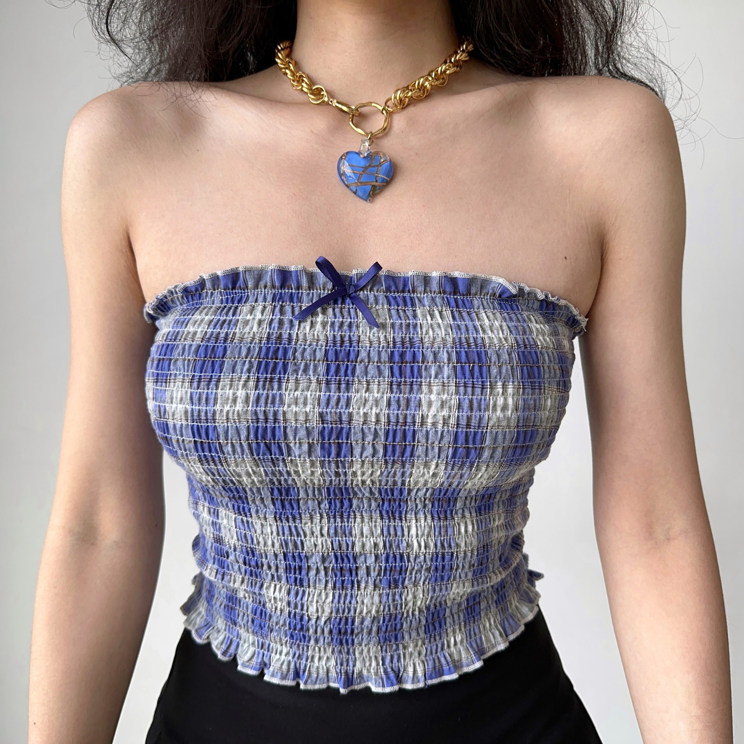 Retro Blue Plaid Strapless Summer Top Women Sleeveless Outfit – Summer Fits