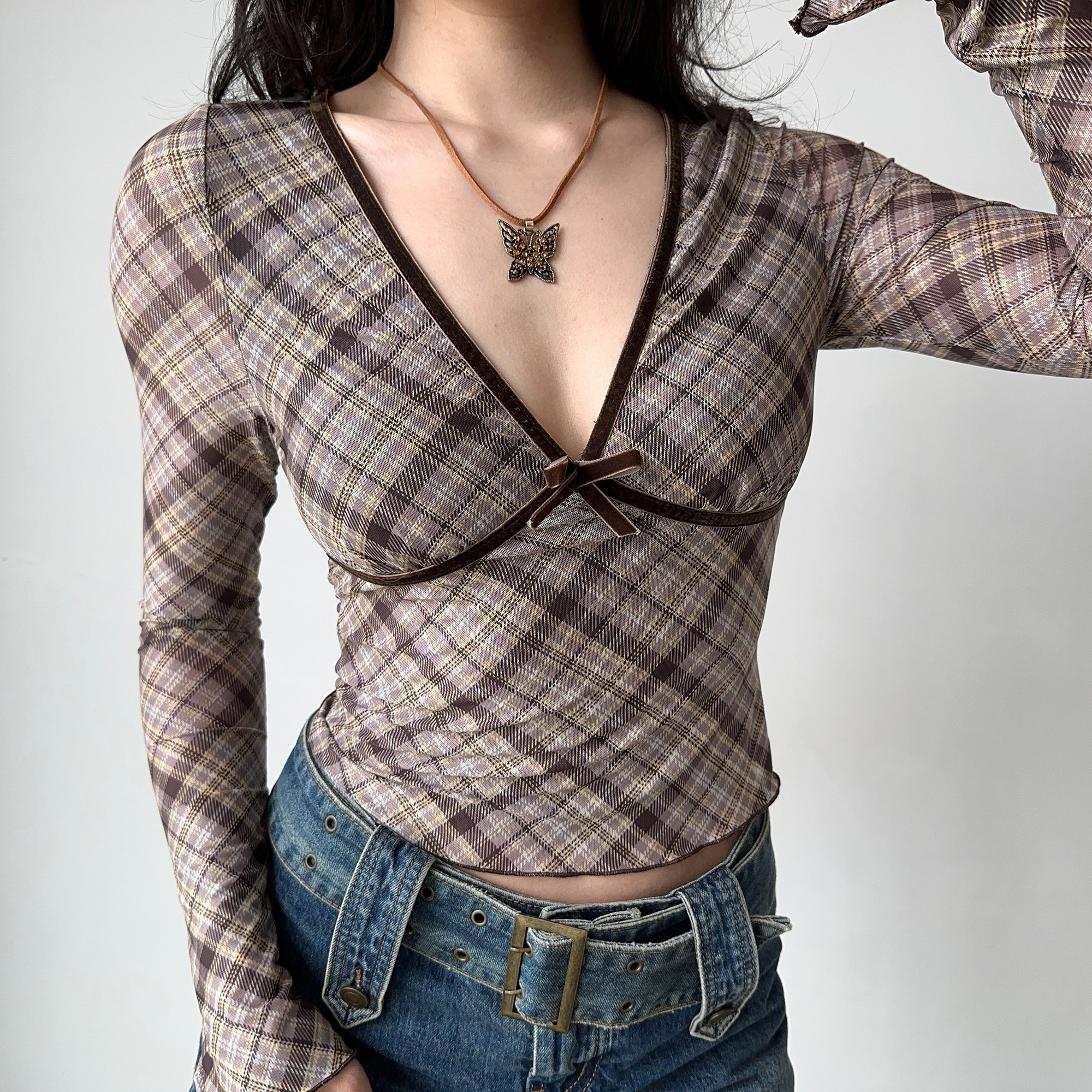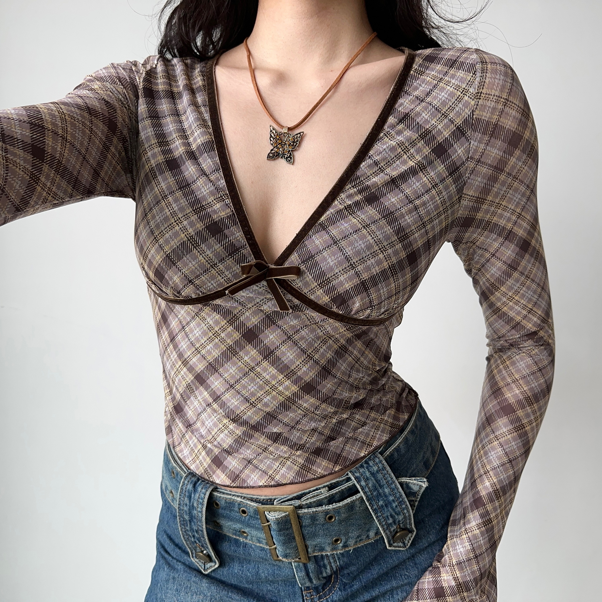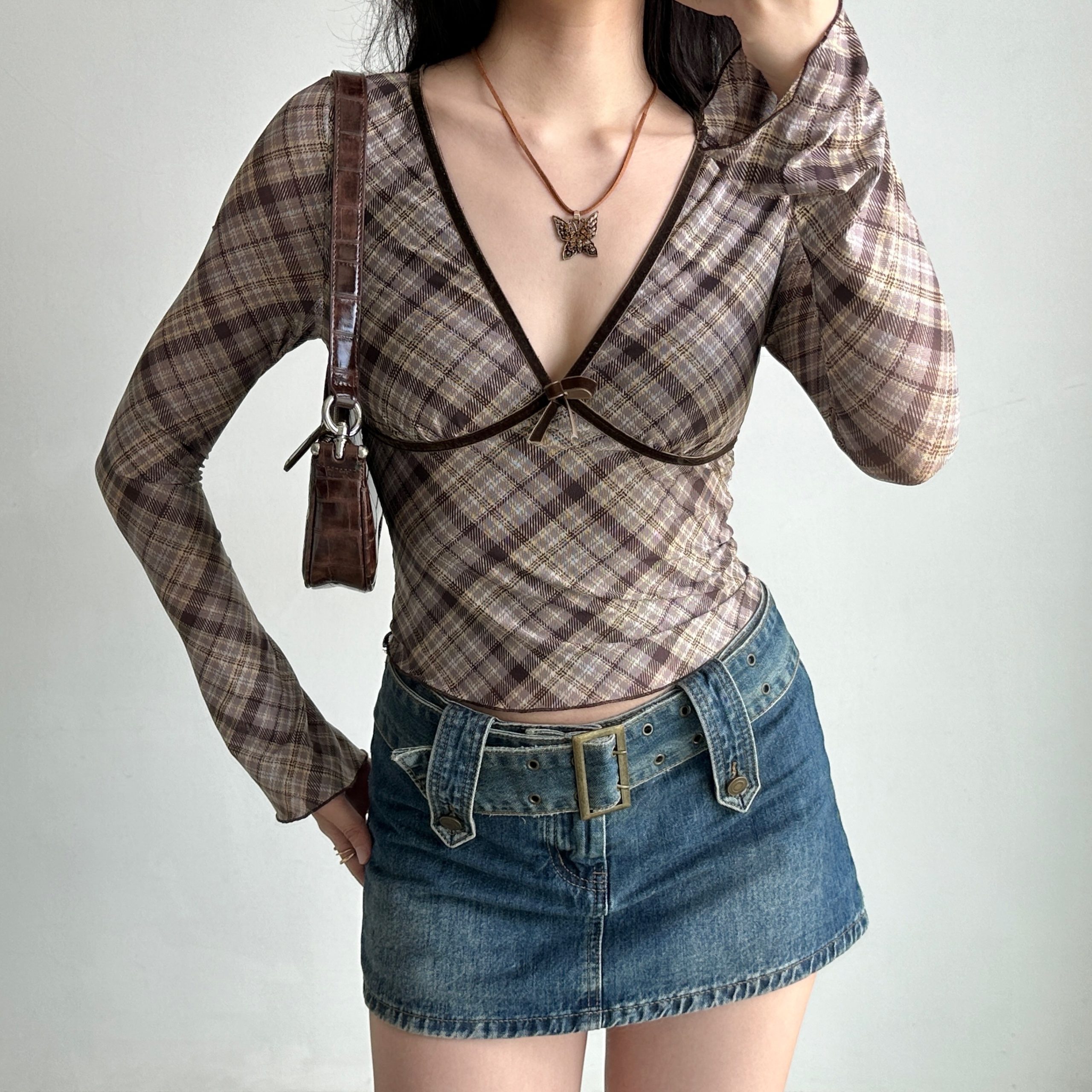 Retro Deep V- Neck Long Sleeve Plaid Women Slim Fit Cropped Top, pired High-quality product featuring outfit inspo, fall outfits women, easy halloween costume and more. Modern design that fits the latest trends. Premium materials ensure durability and comfort. Order now for special offers! Product designed with attention to every detail. Suitable for all occasions and personal styles.