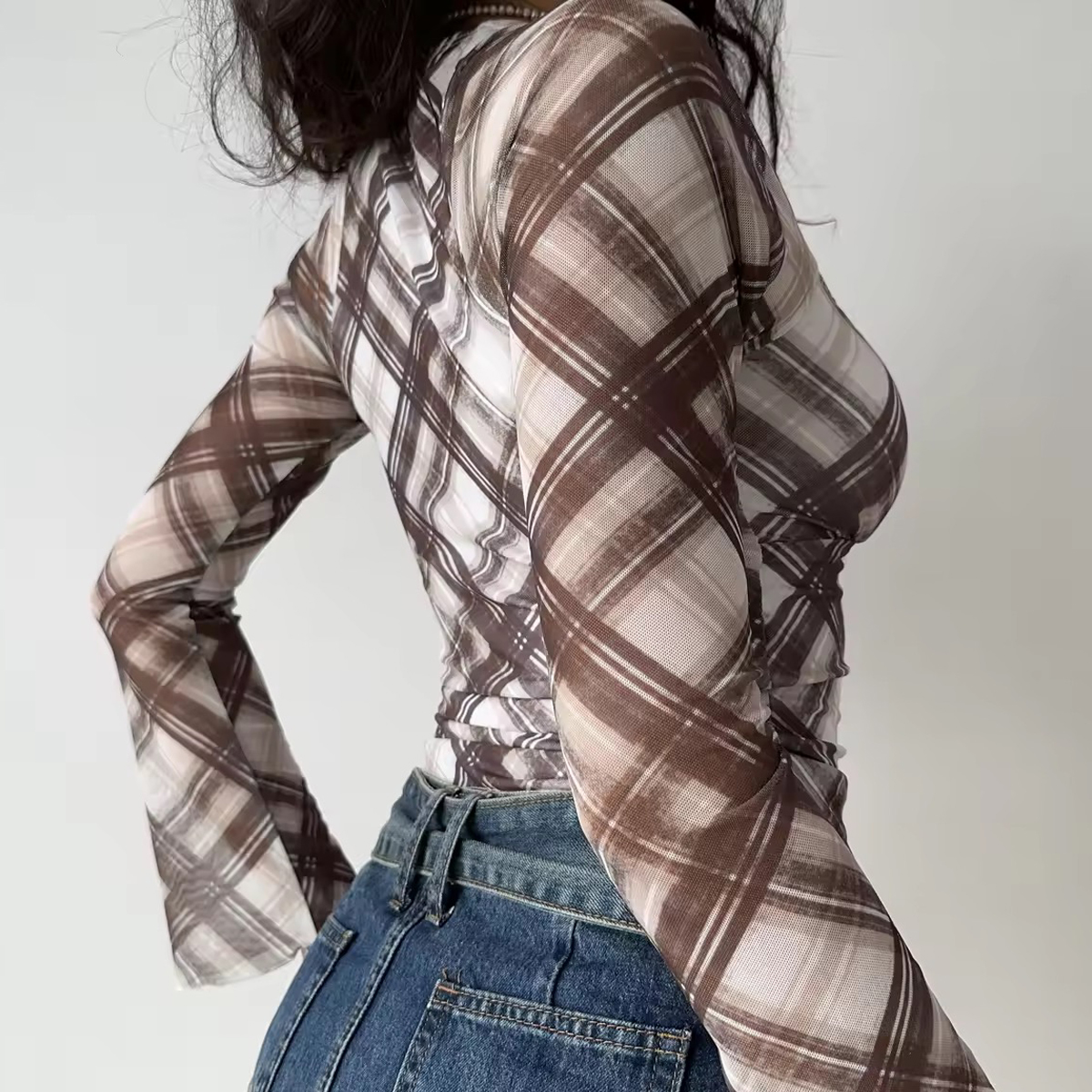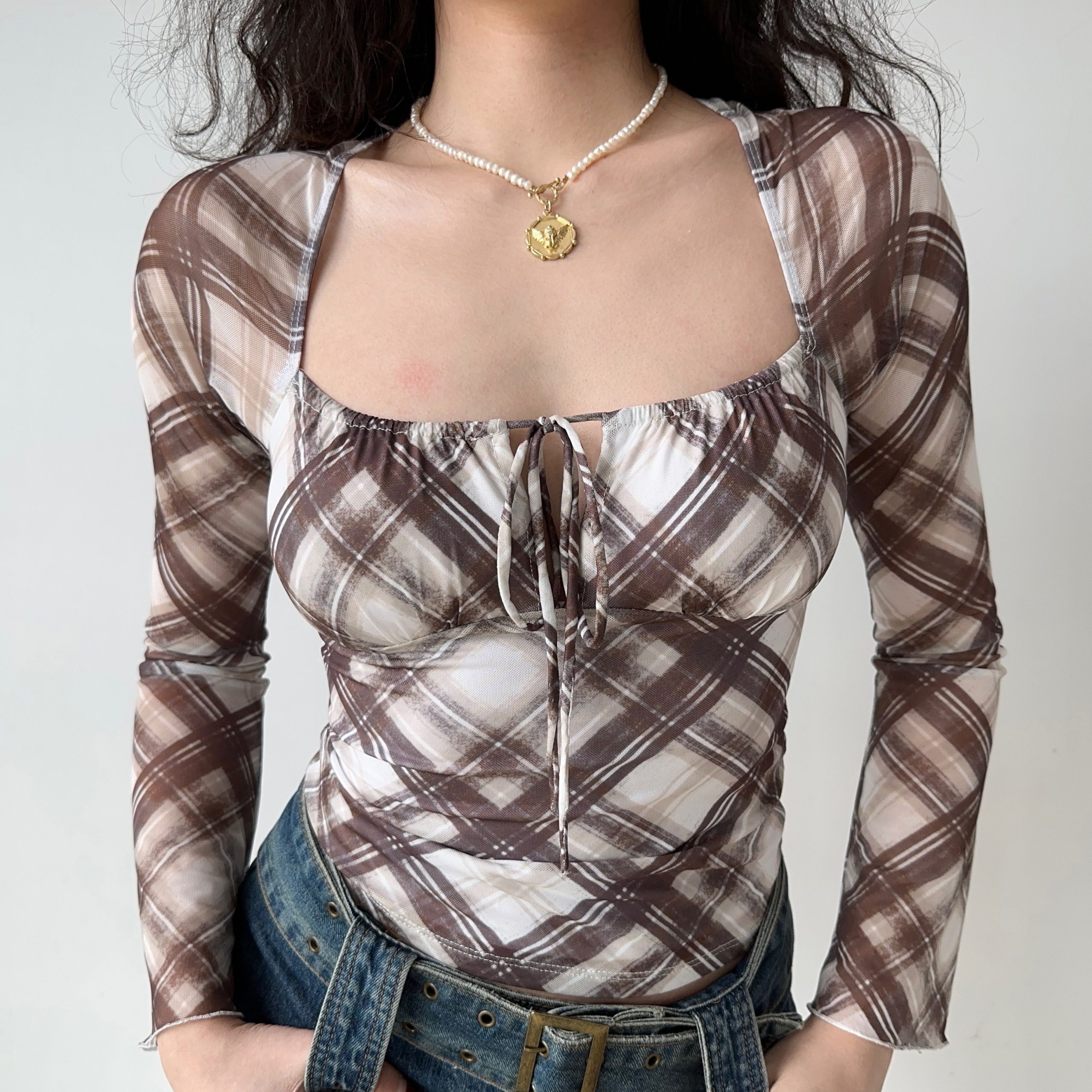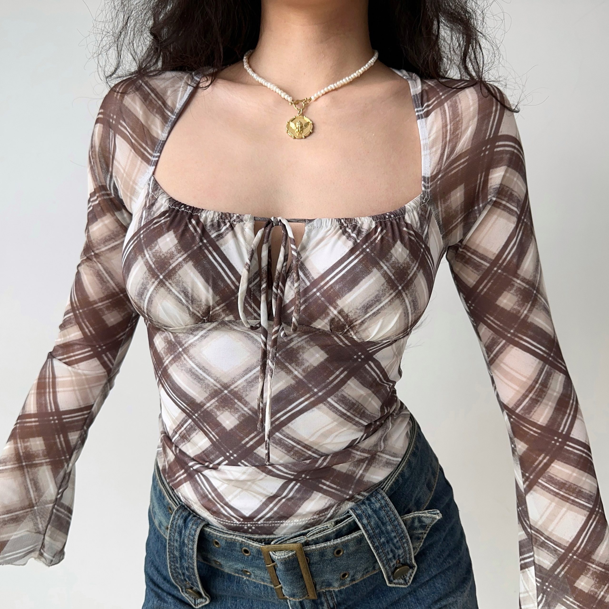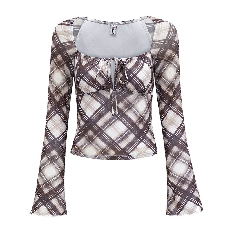 Retro Plaid Tie up Square Collar Long Sleeve Shirt Women Slim Fit Top – Fall Fits