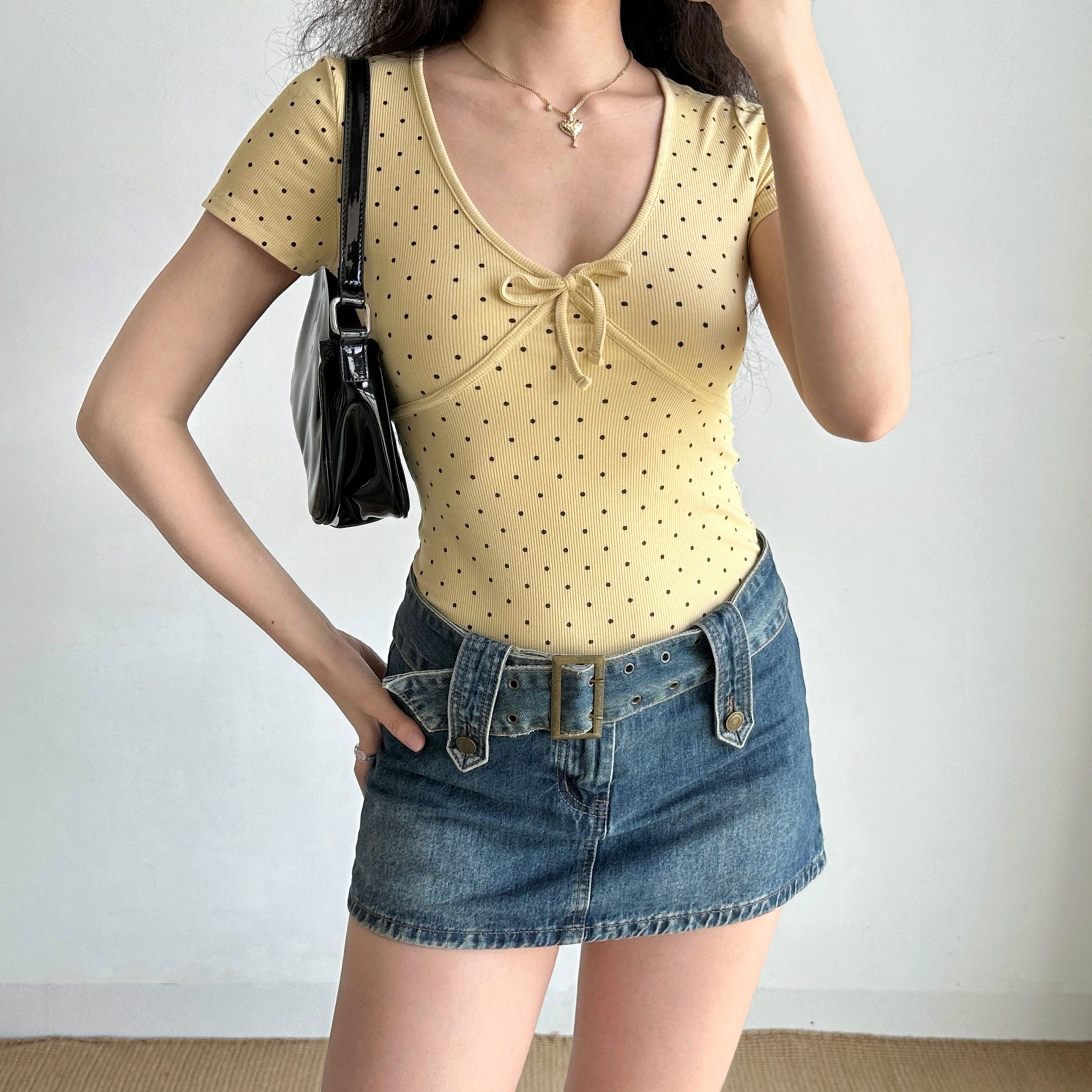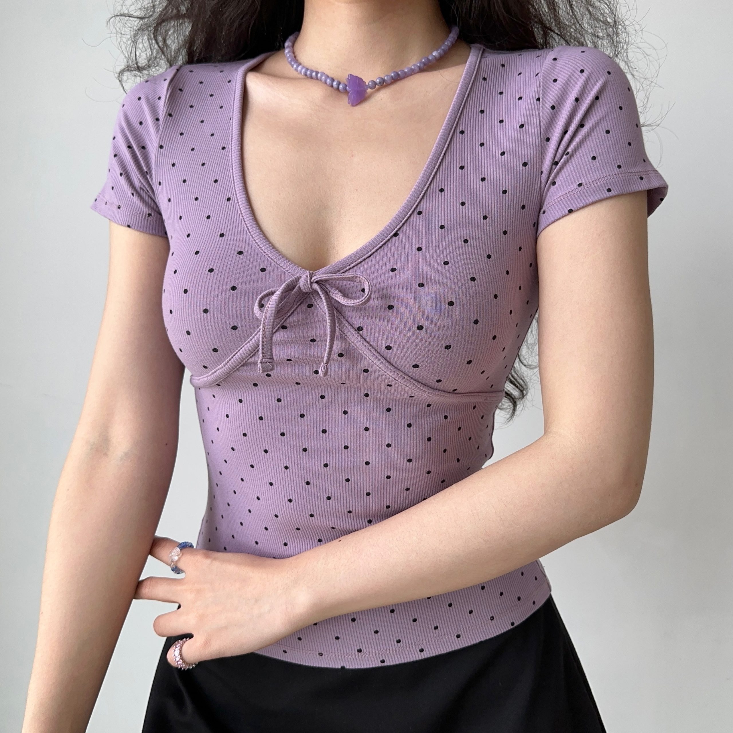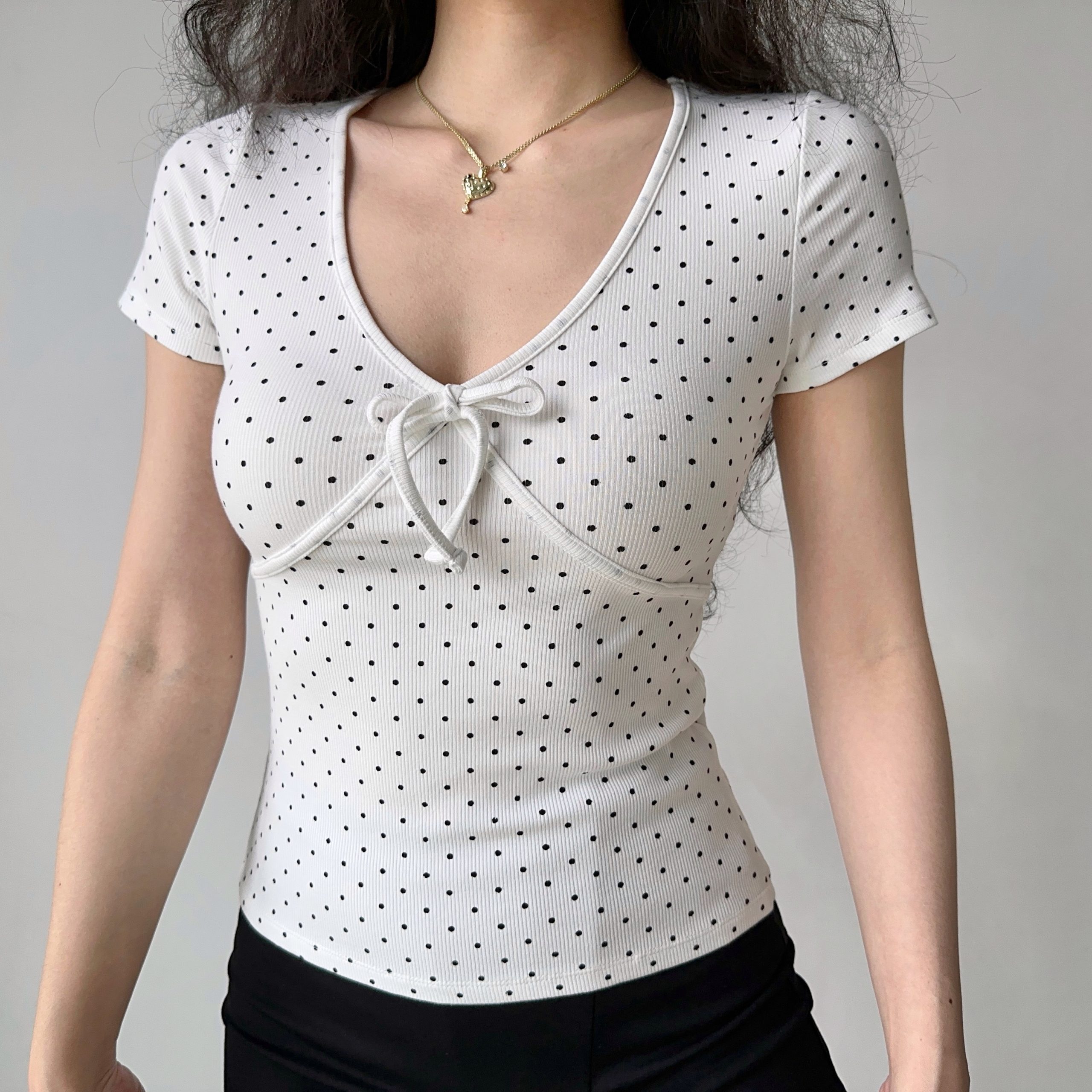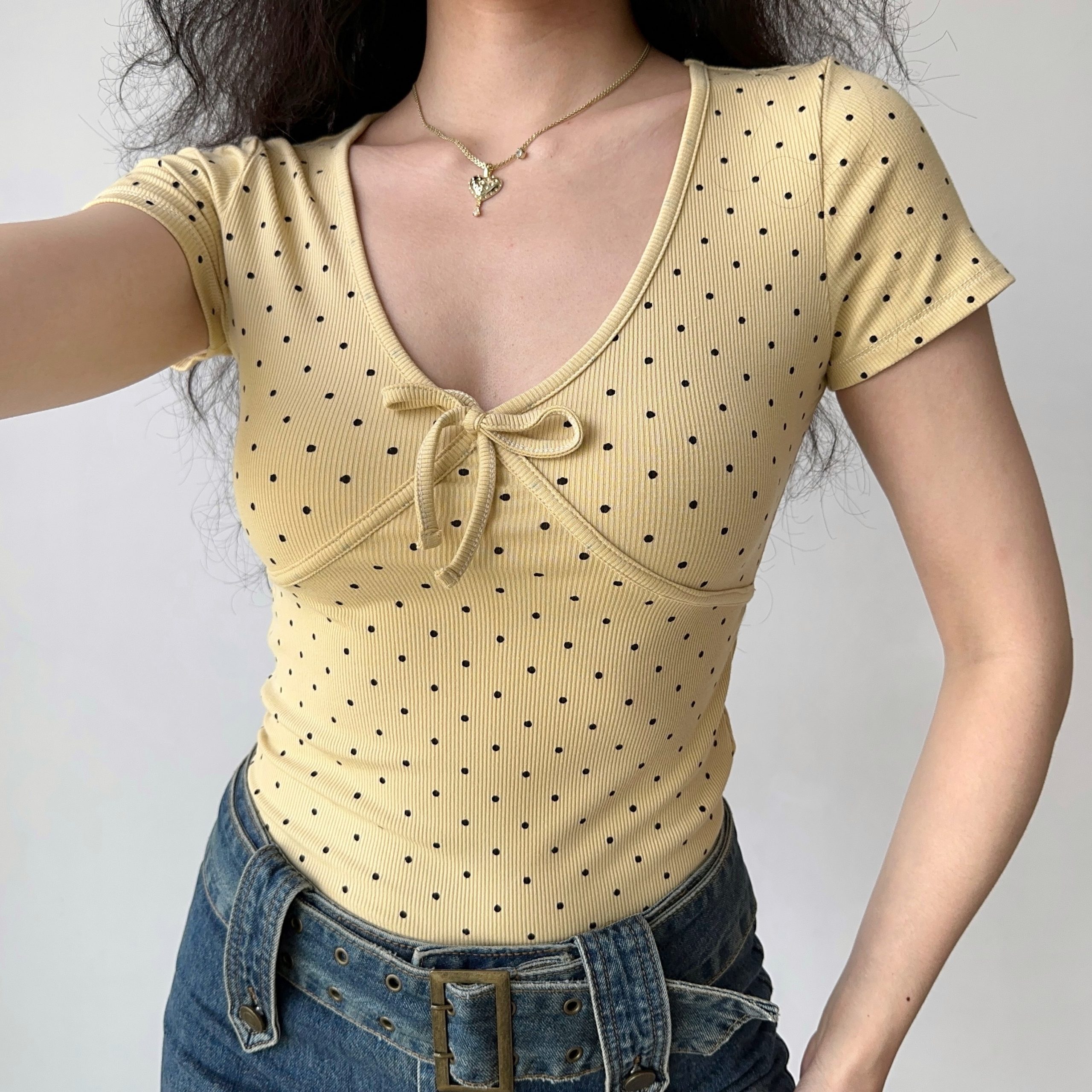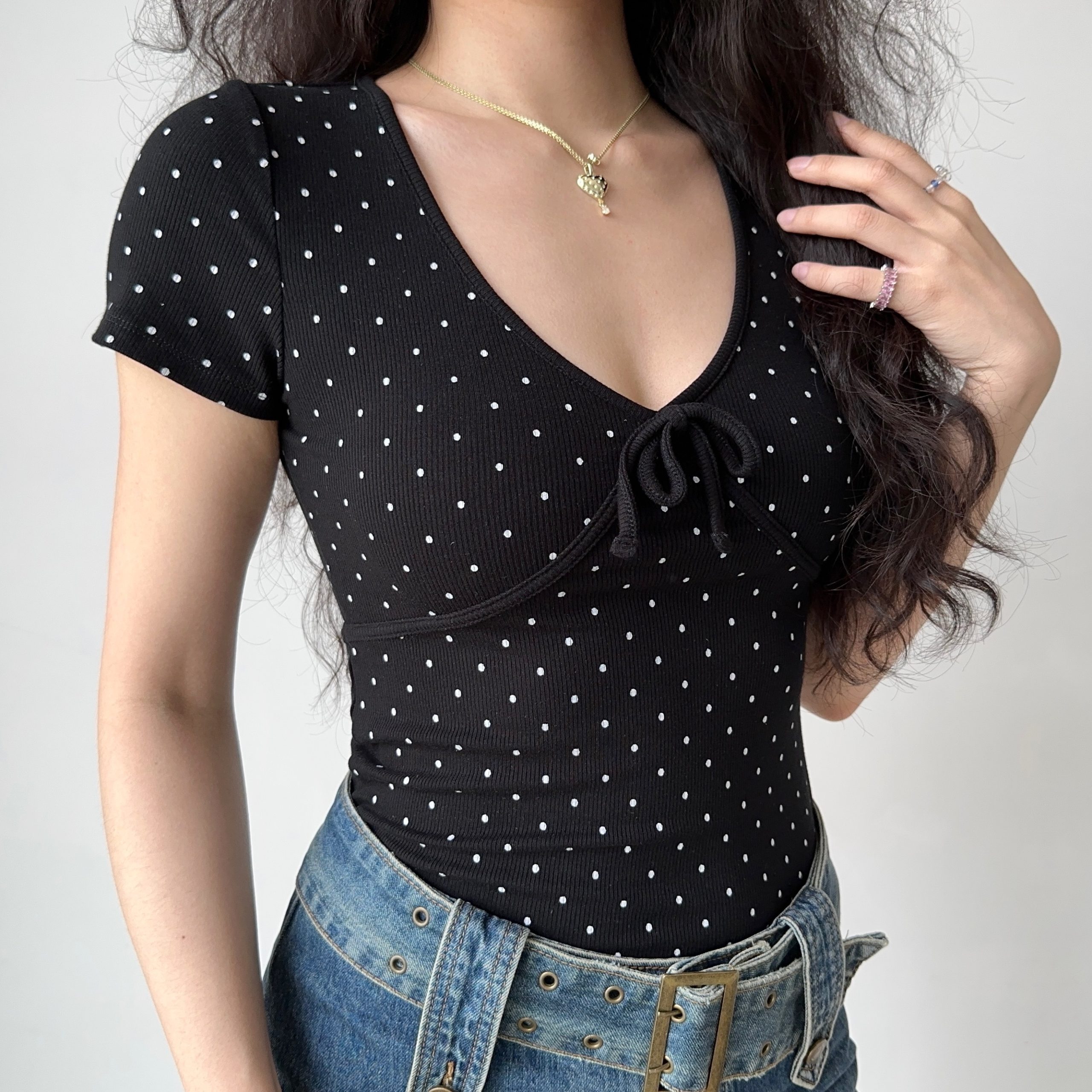 Retro Polka Dot Bow V- Neck Women Slim Fit Short Sleeve Summer Top in – Summer Fits