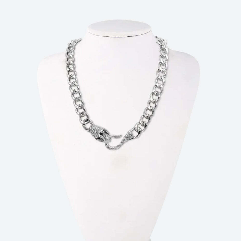 This rhinestone snake necklace brings bold energy to any outfit. The shimmering snake head clasp, covered in crystals, creates an eye-catching statement. Ideal for streetwear, gothic, or punk-inspired looks, it’s the perfect piece to elevate your jewelry game.