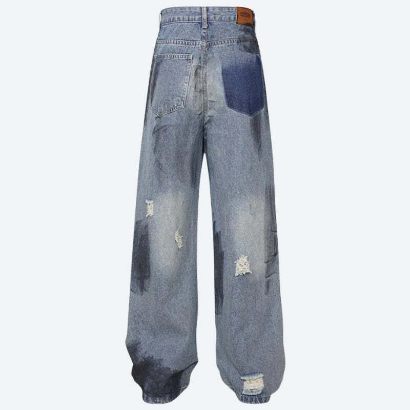 Ripped Denim Jeans with a raw edge. These wide-leg jeans bring serious attitude with bold distressing, faded wash zones, and asymmetric seam lines. A must-have for streetwear lovers chasing that undone, edgy energy.
