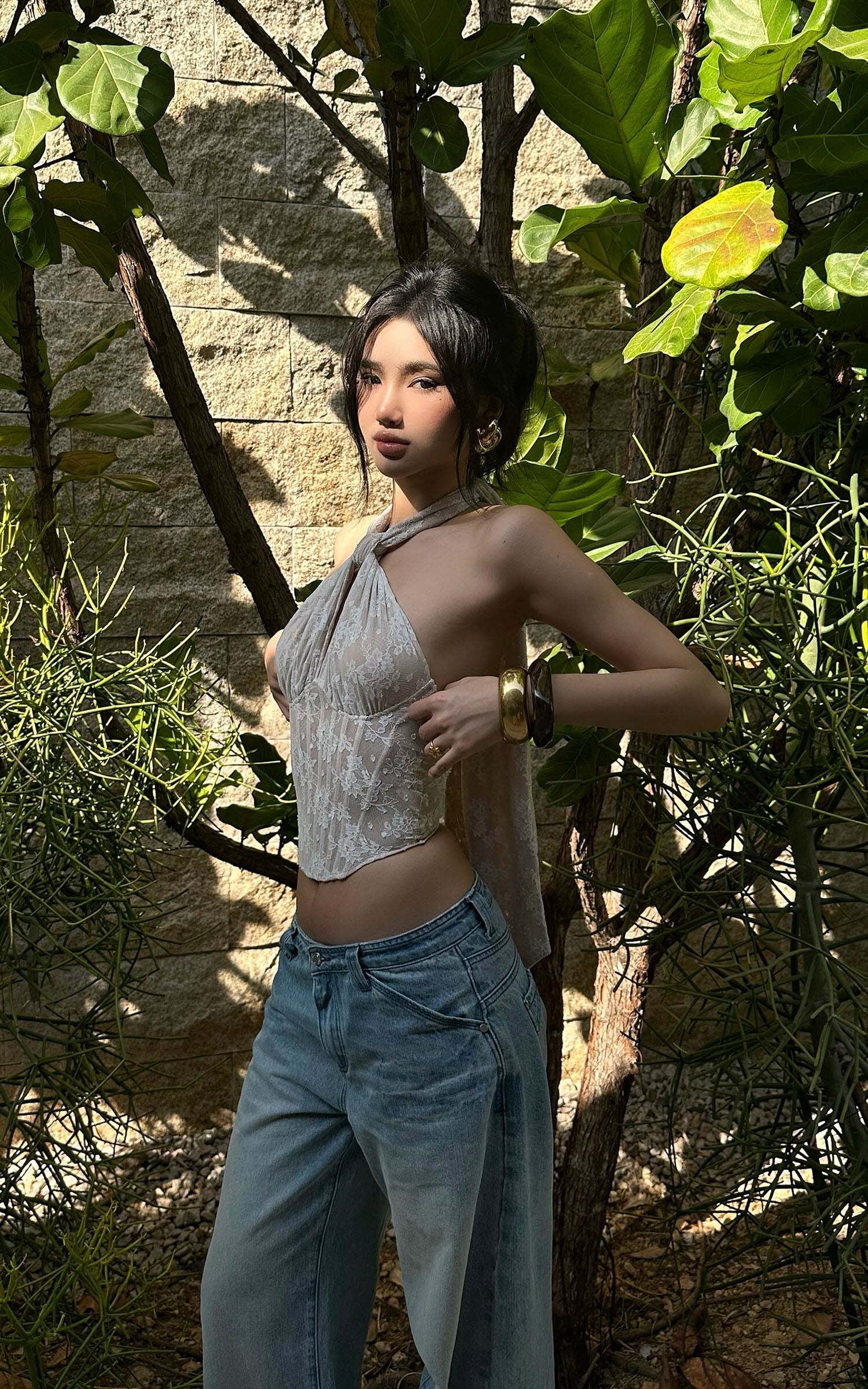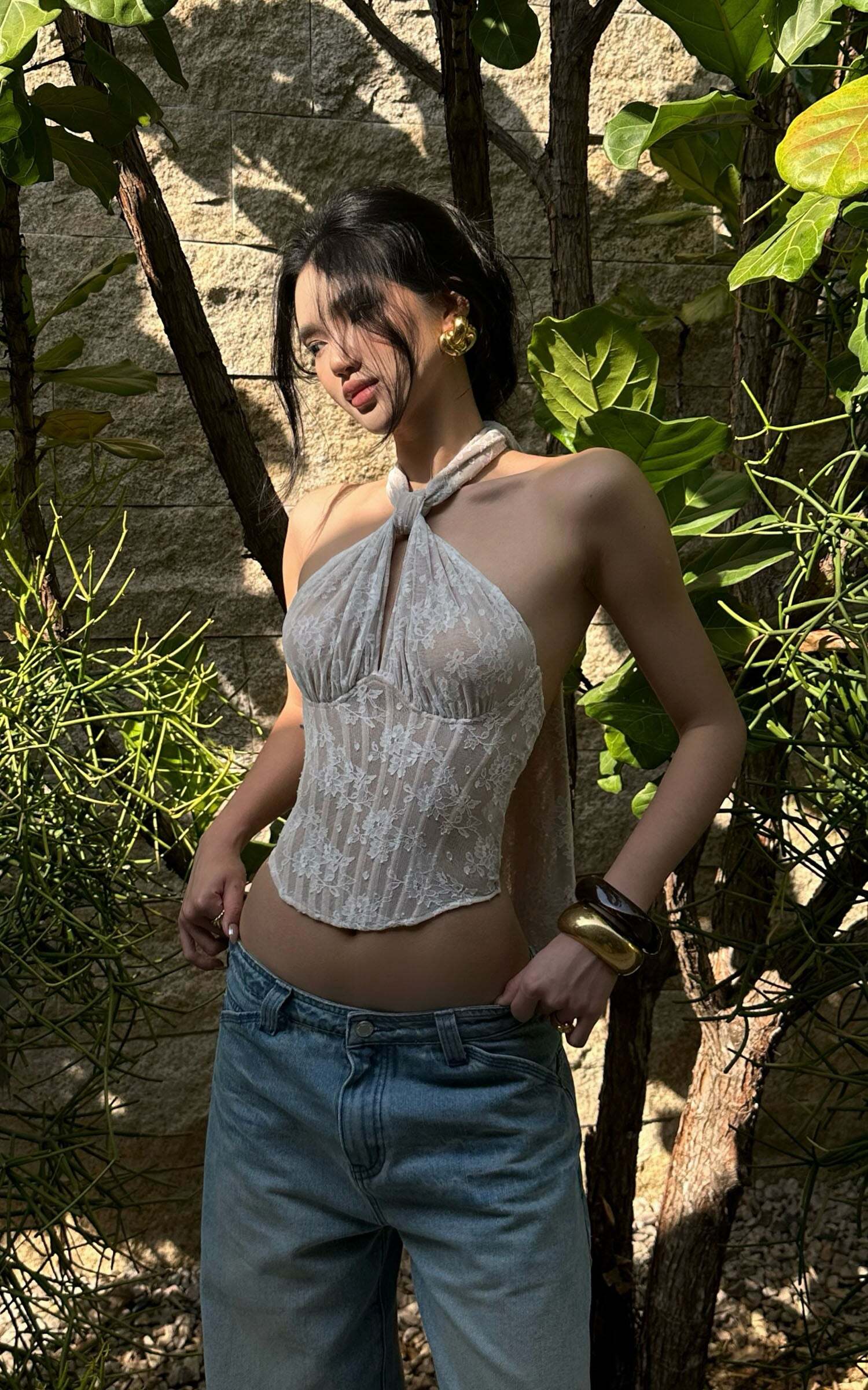 Crafted from sheer nude mesh layered with delicate floral lace, this halter top flirts with transparency and structure in equal measure. The softly ruched cups sculpt the bust, while the knotted neckline flows into a dramatic draped back, evoking the elegance of a cape in motion. Internal boning ensures shape and support, creating a tension between fragility and form.Wear it with oversized denim for an undone edge, or pair it with tailored pieces for a look that’s both sultry and sculptural. Whether under the sun or city lights, this top leaves an unforgettable trace.