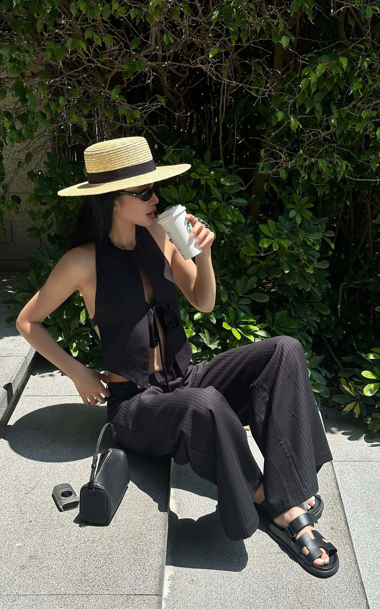 An irreverent twist on classic tailoring—this pinstripe halter vest bares your back while keeping the structure sharp. Designed with a high neckline and deep front slit, it cinches with a long ribbon tie at the bust, creating a softly sculpted silhouette. The tailored panels contour the body while the open back delivers a flirtatious finish. Pair with matching trousers or wear solo for an elevated summer statement.