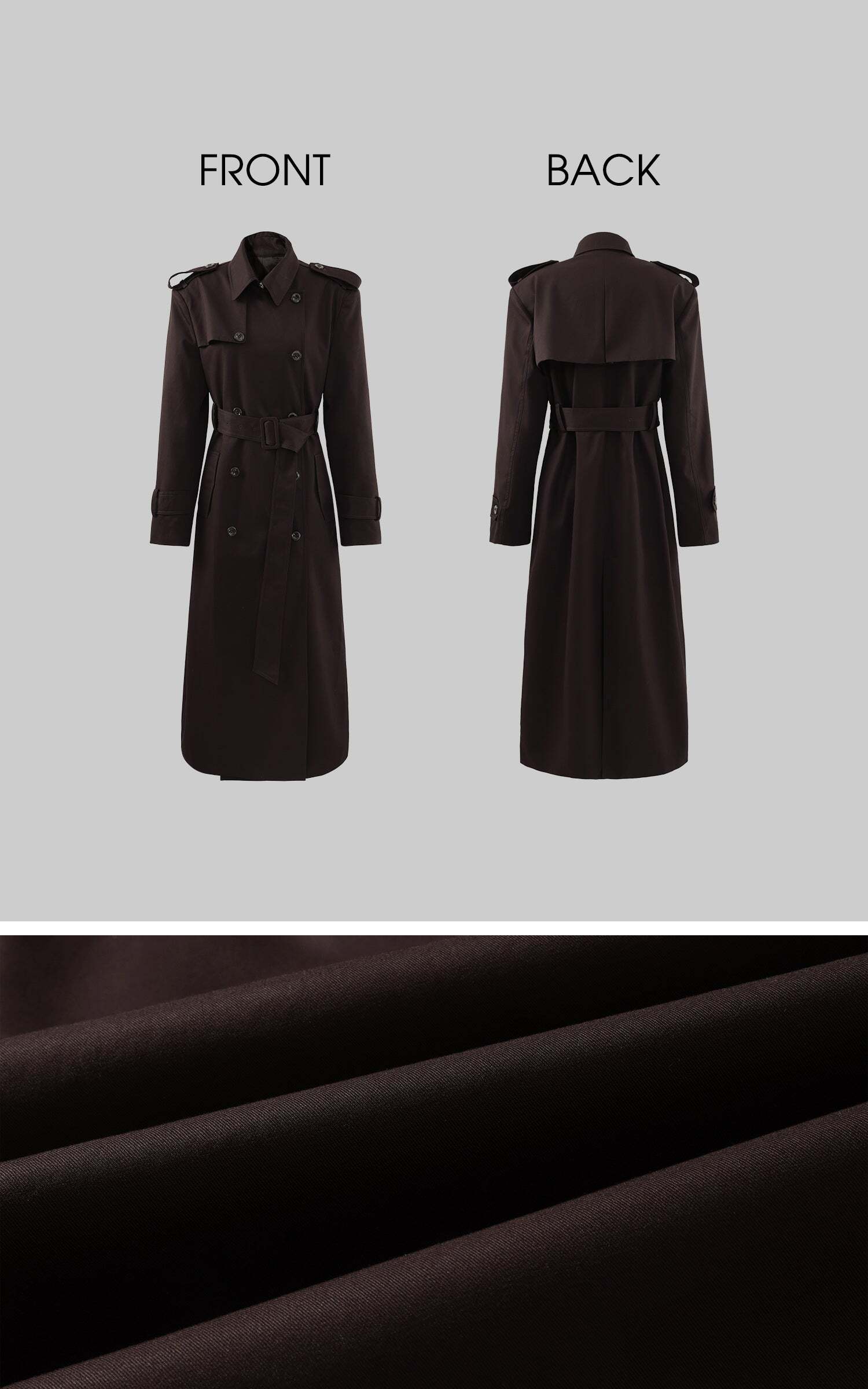 A modern take on the classic trench, crafted in deep chocolate tones with a sharp double-breasted cut. The structured shoulders and belted waist create a bold silhouette, while epaulettes and storm flaps add a touch of military precision. Designed for layering, it slips seamlessly from day to night, making it the statement outerwear piece your wardrobe demands.