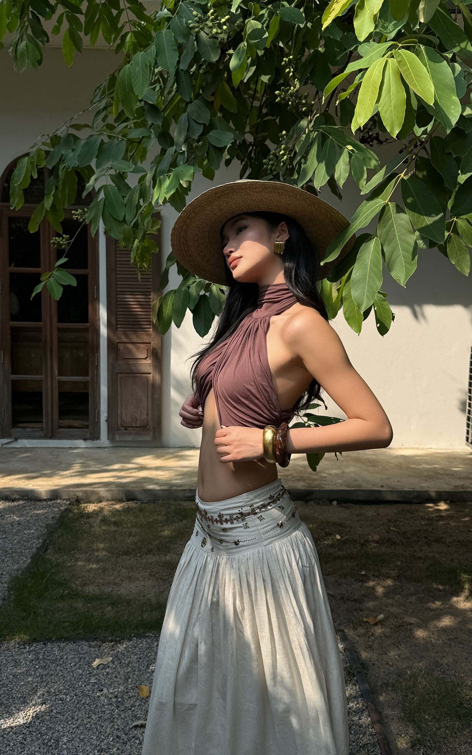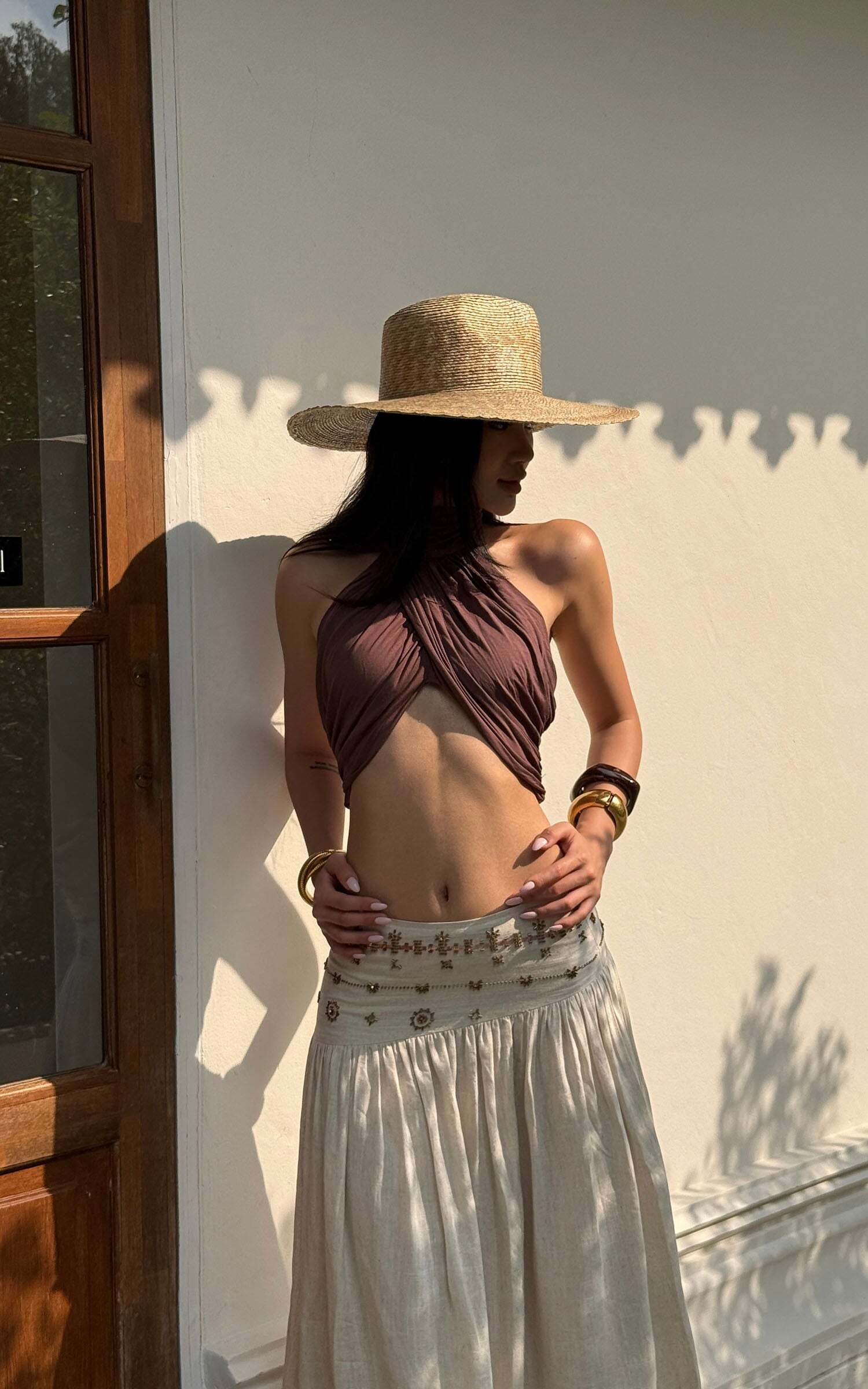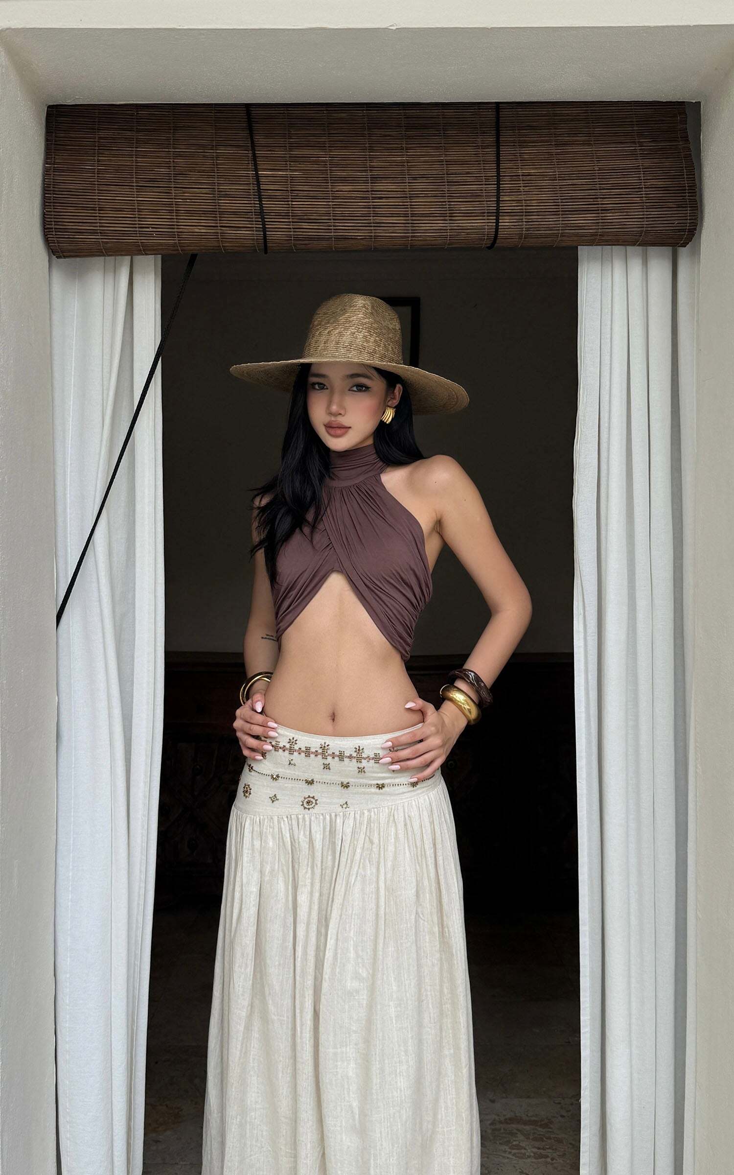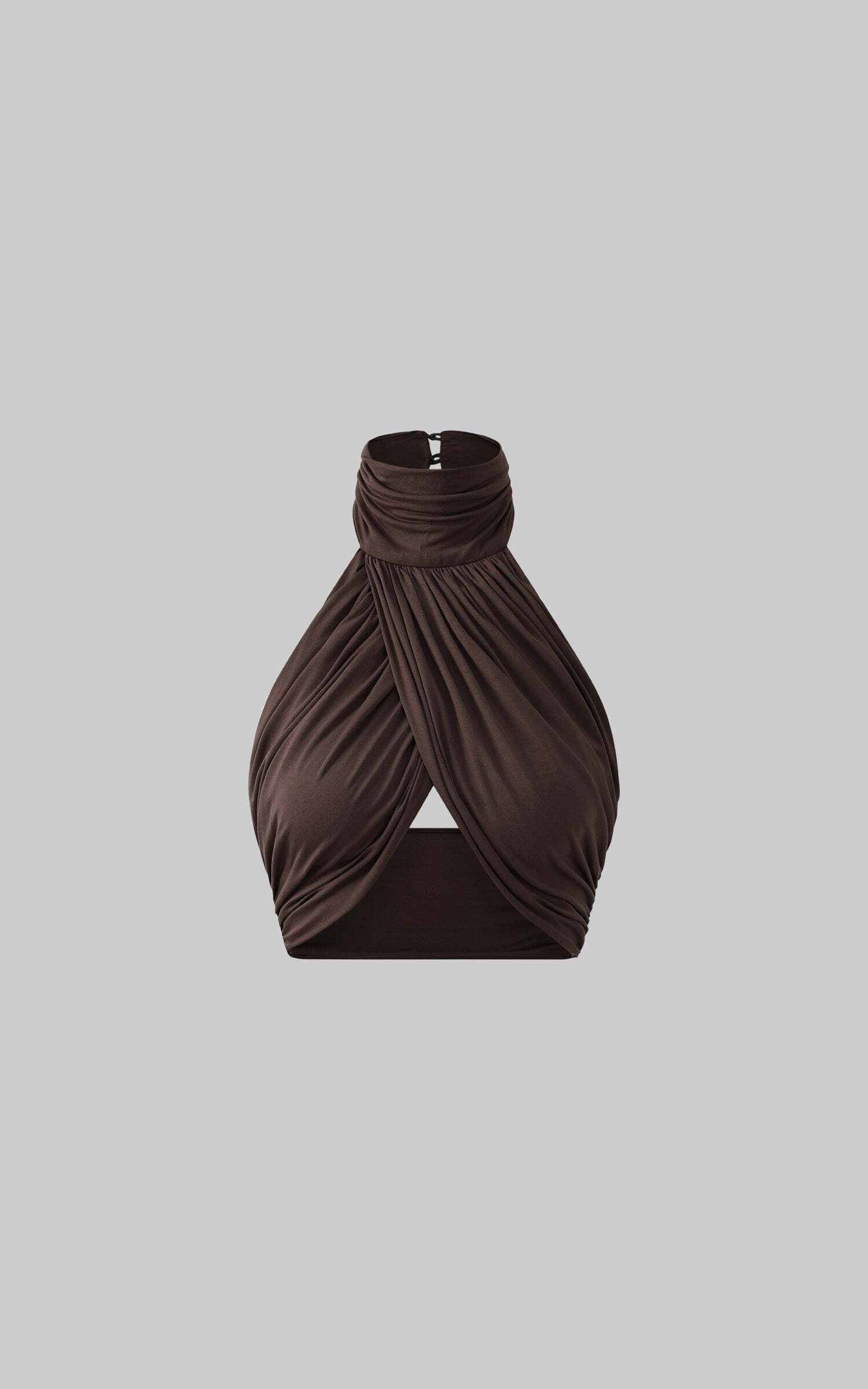 A sculptural silhouette with sultry intent — this halter top wraps the body in waves of ruched jersey, crossing over the bust with fluid precision. The high neckline fastens with beaded buttons, giving a nod to bohemian sensuality. Stretchy yet structured, this piece is designed to shape and seduce. Style it with flowy skirts for resort elegance, or make it the statement against denim and heels.
