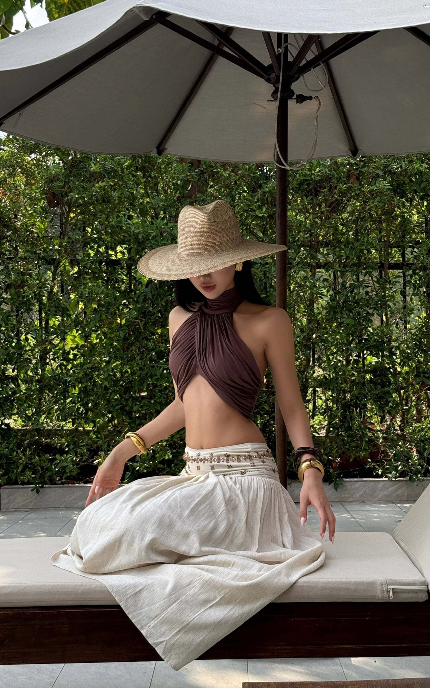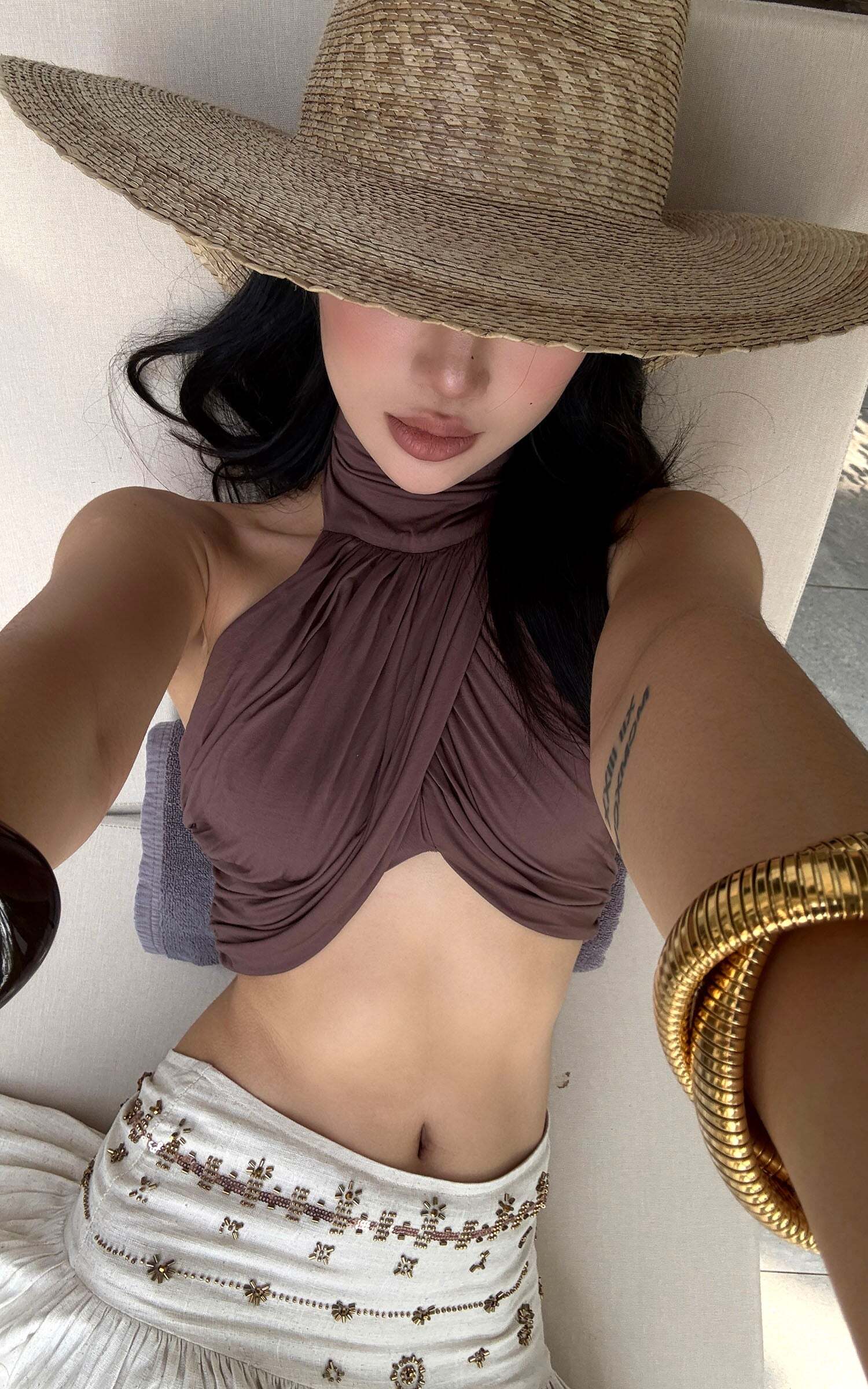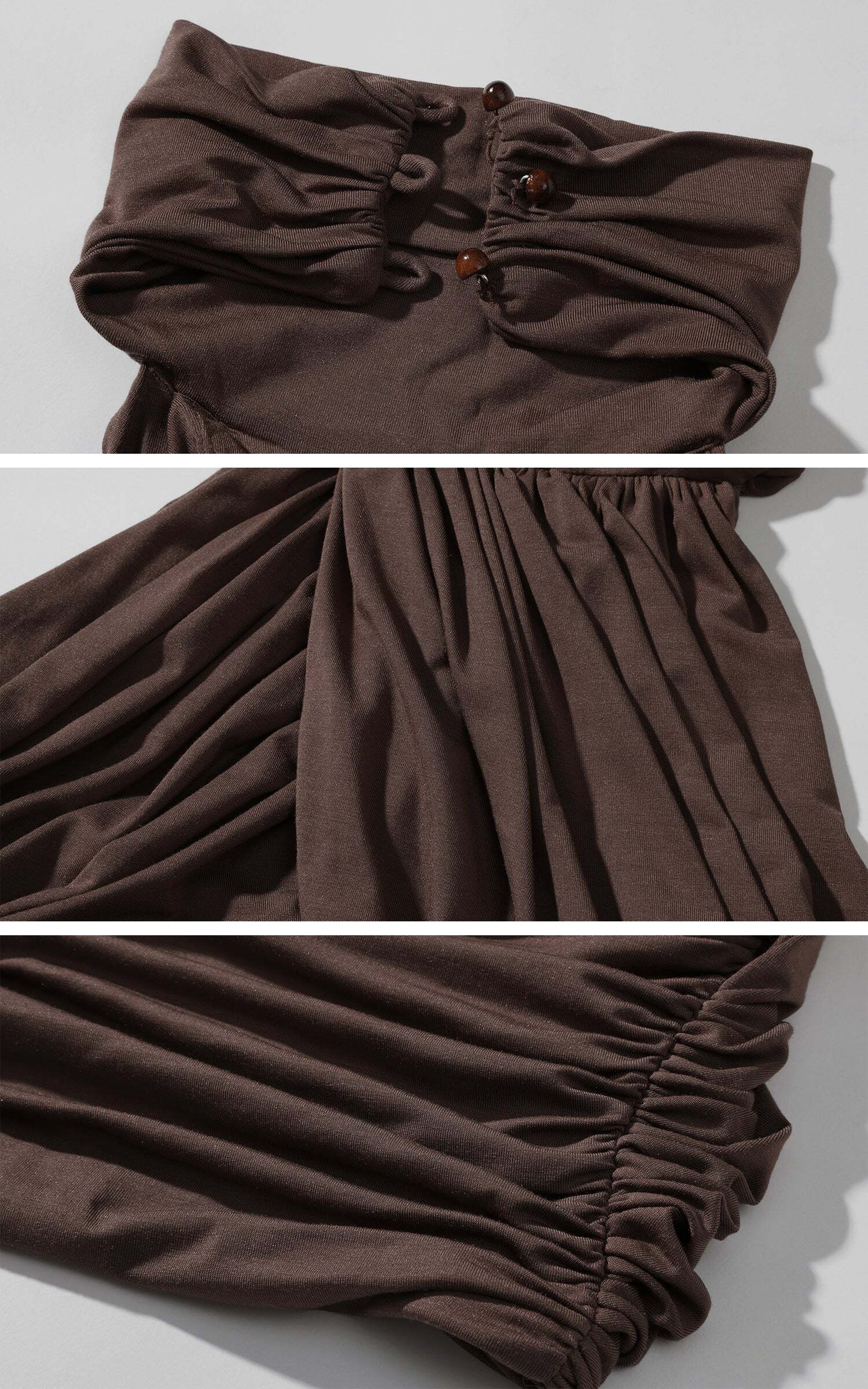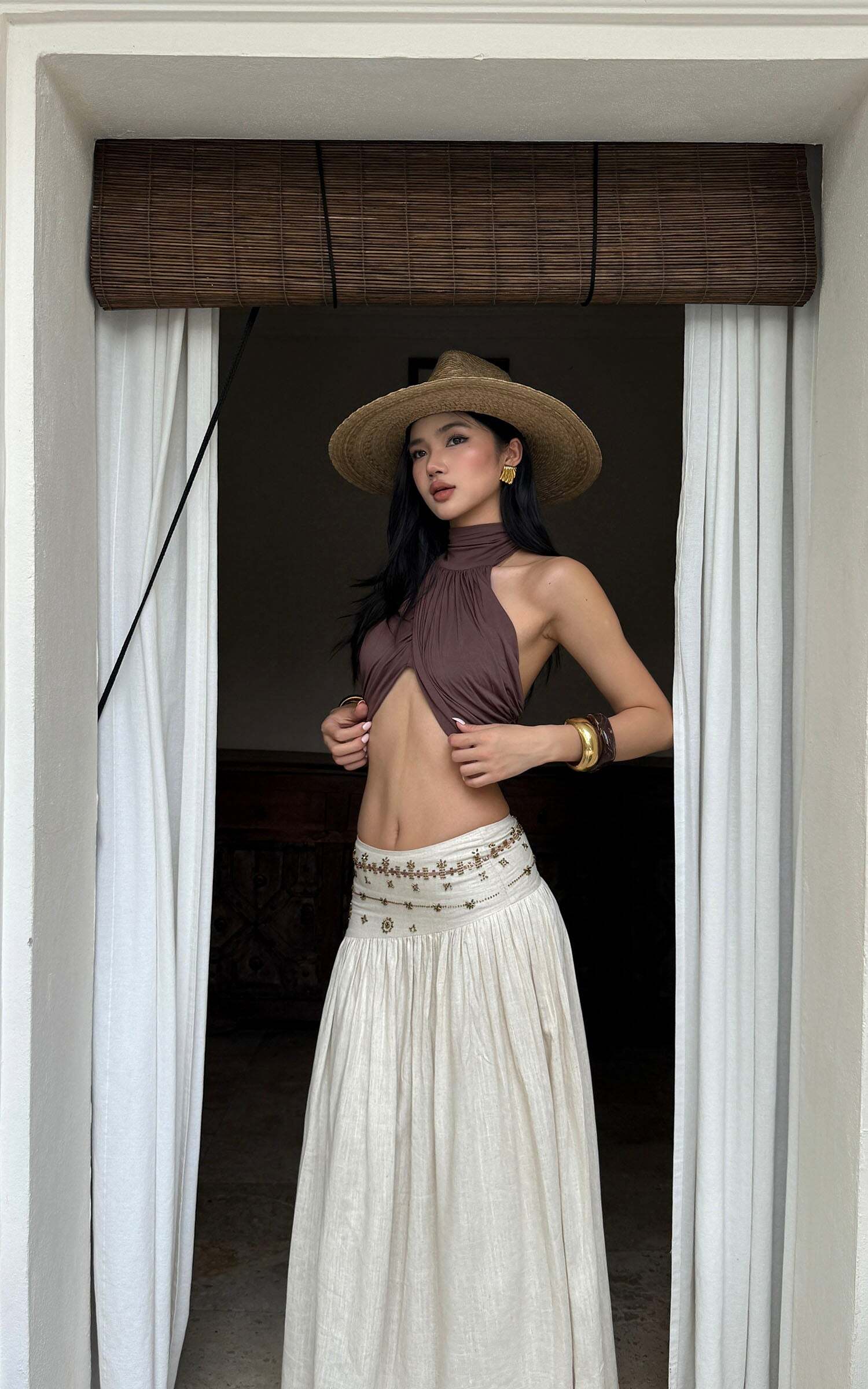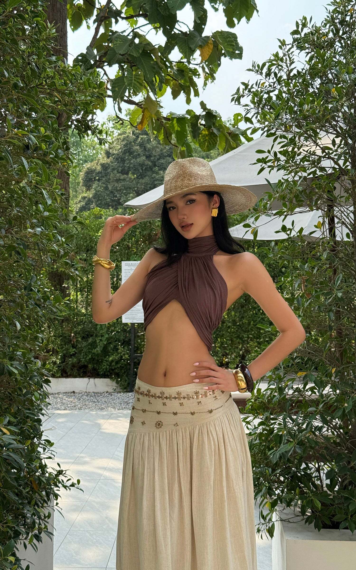 A sculptural silhouette with sultry intent — this halter top wraps the body in waves of ruched jersey, crossing over the bust with fluid precision. The high neckline fastens with beaded buttons, giving a nod to bohemian sensuality. Stretchy yet structured, this piece is designed to shape and seduce. Style it with flowy skirts for resort elegance, or make it the statement against denim and heels.