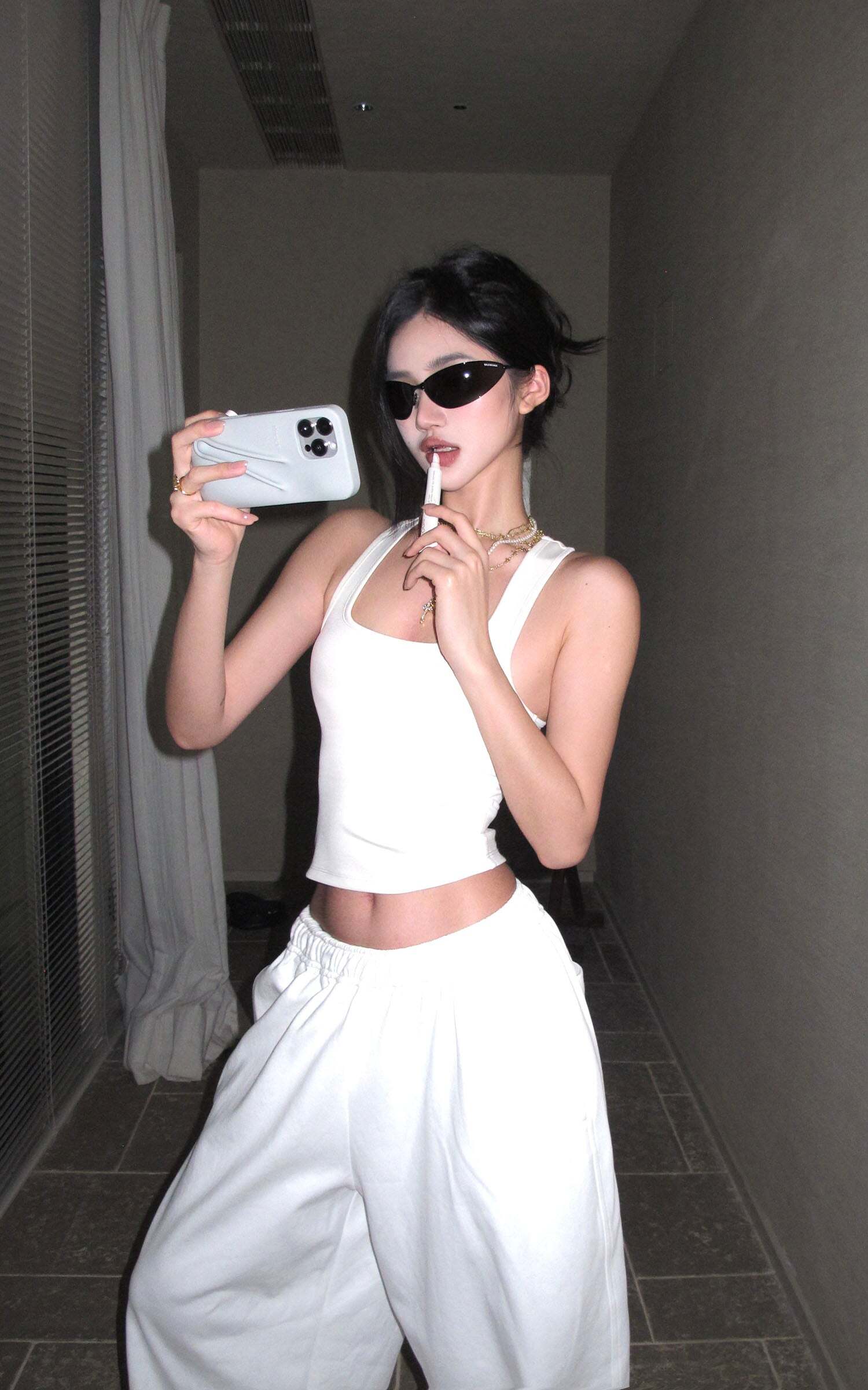 A minimal staple with maximum attitude. This razorback tank clings to your curves with a second-skin fit, sculpting the silhouette in all the right places. Crafted from a supple stretch cotton blend, it features a classic scoop neckline and racerback cut, delivering a laid-back sensuality with edge. Whether paired with voluminous trousers or layered under an oversized blazer, it’s the effortless statement you’ll reach for on repeat. Think clean lines, bold simplicity, and unapologetic confidence.