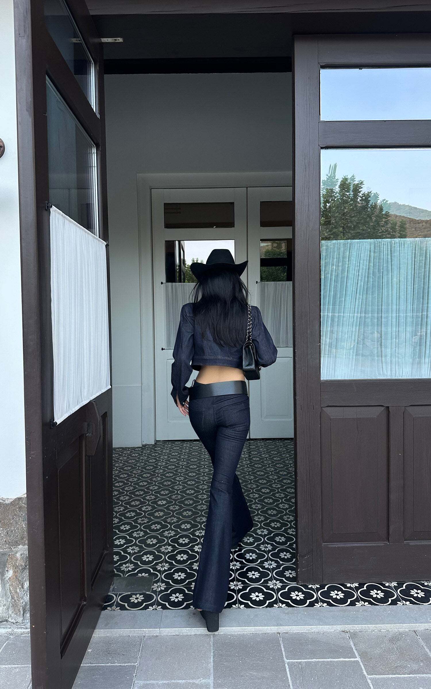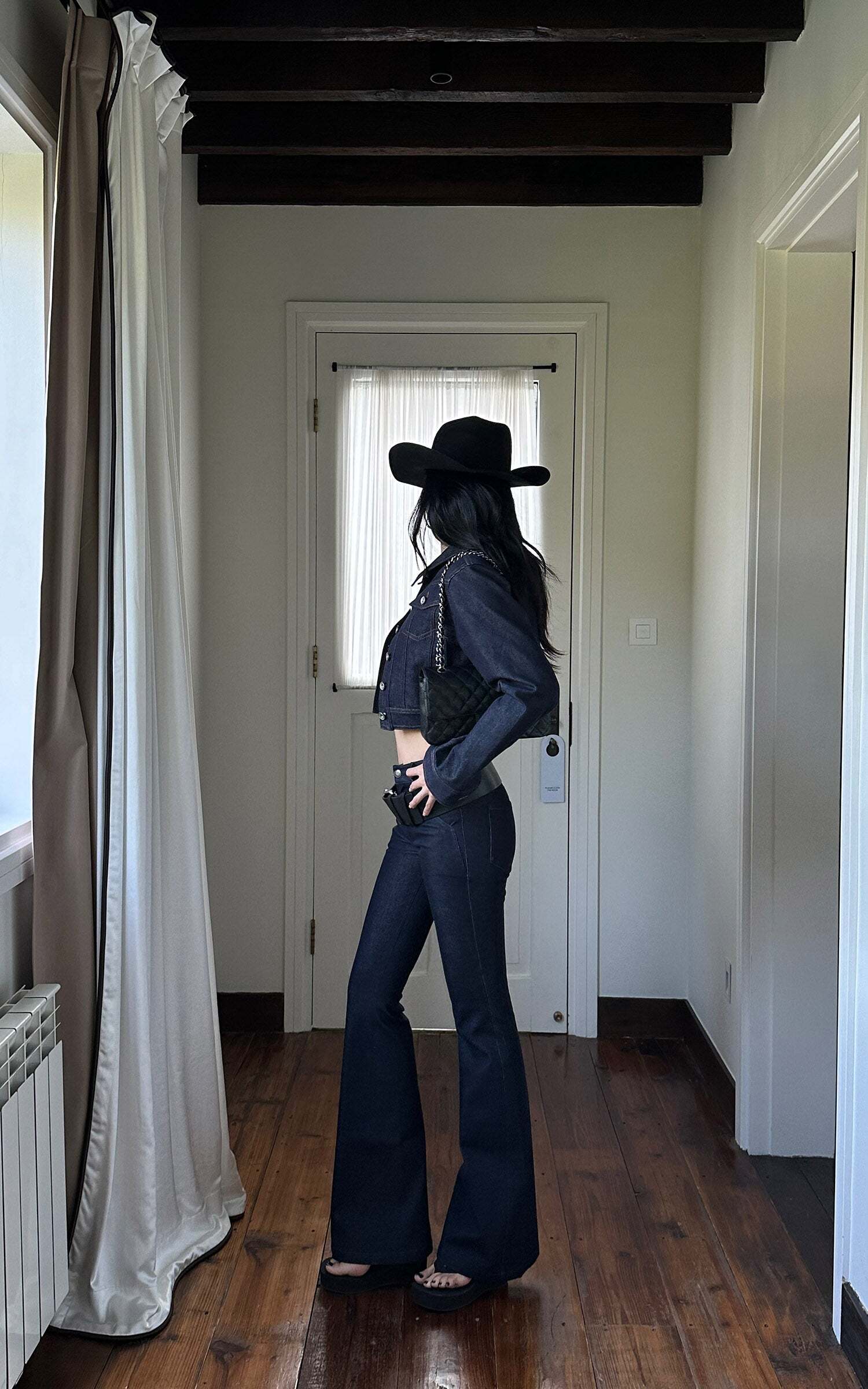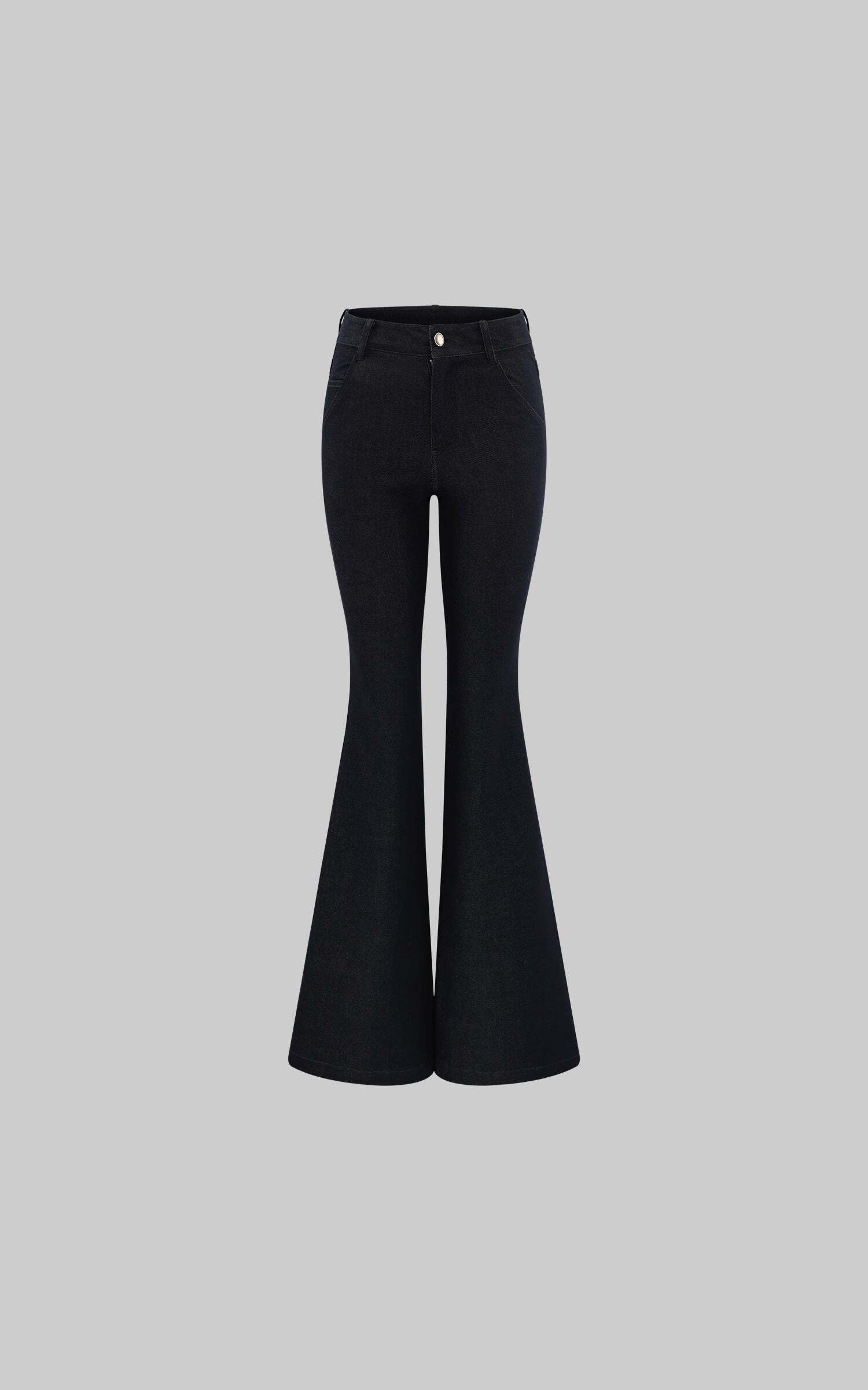 Cut in a dark wash with a high-rise waist, these denim pants elongate the frame through a slim thigh and dramatic flare. The clean silhouette creates a sculpted shape that moves with attitude, while the raw minimalism channels modern cool. Pair with cropped jackets, heels, or bold accessories to push the balance between casual ease and nightlife edge.