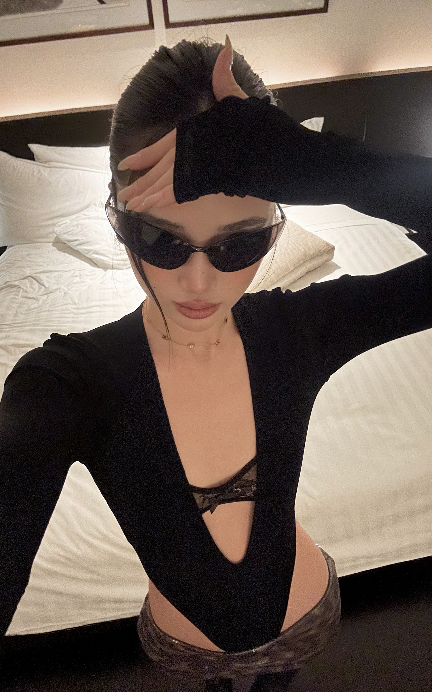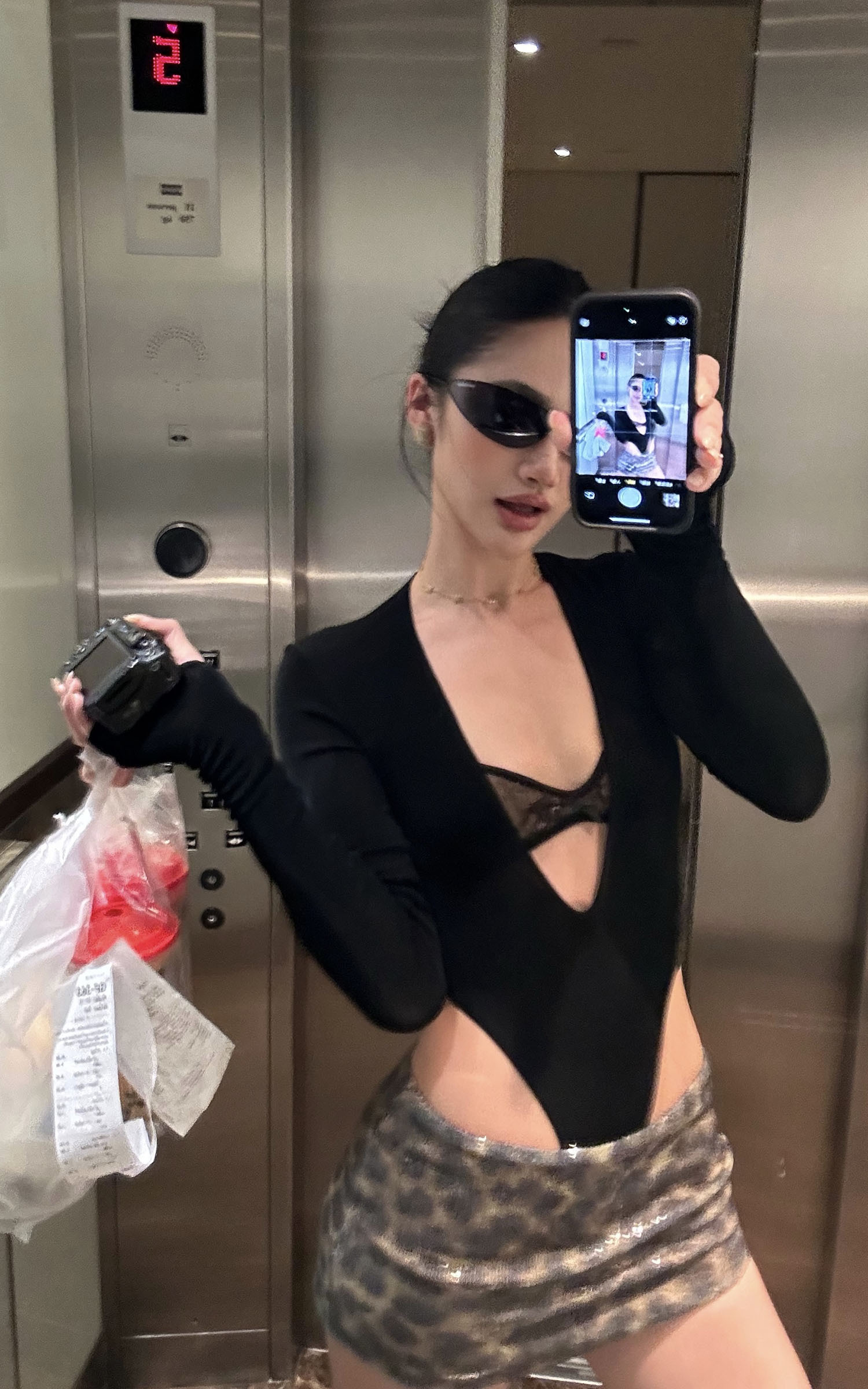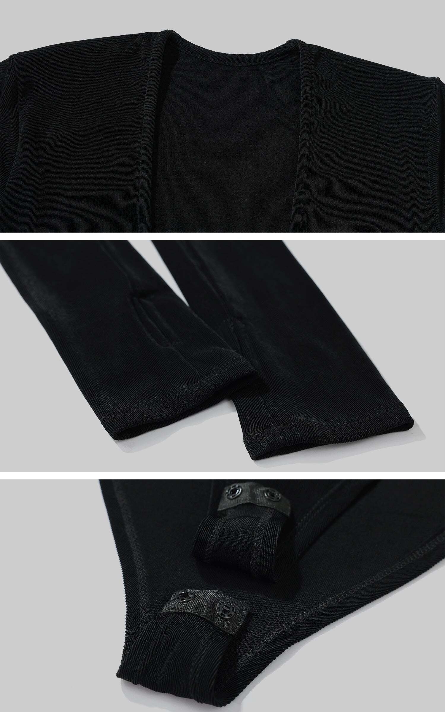 Daring by design, this body-hugging piece is your after-dark armor. Cut from stretch ribbed fabric that clings to every curve, the silhouette is sculpted with a plunging V-front and exaggerated high-cut legs for maximum impact. A built-in sheer lace bra peeks from the plunge, adding a femme-laced edge to the otherwise razor-sharp attitude. Long sleeves balance out the skin-baring drama, while the snap-button base keeps things sleek and practical. Pair with a micro skirt and pointed heels — or wear solo, unapologetically.