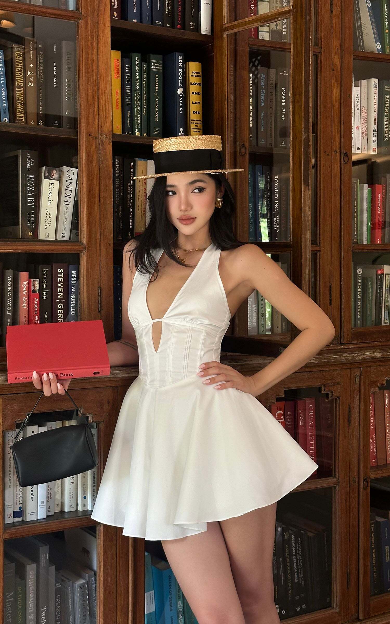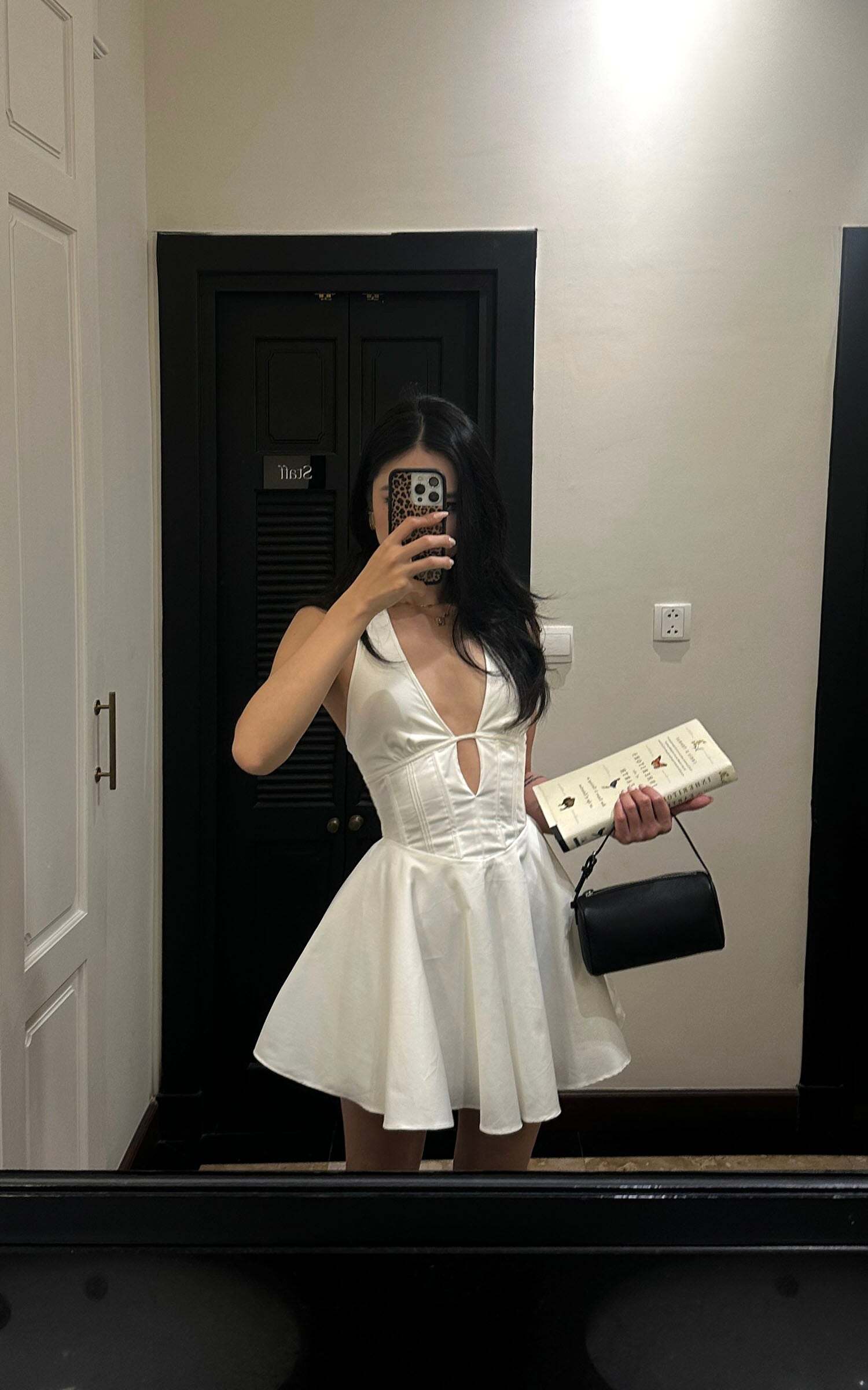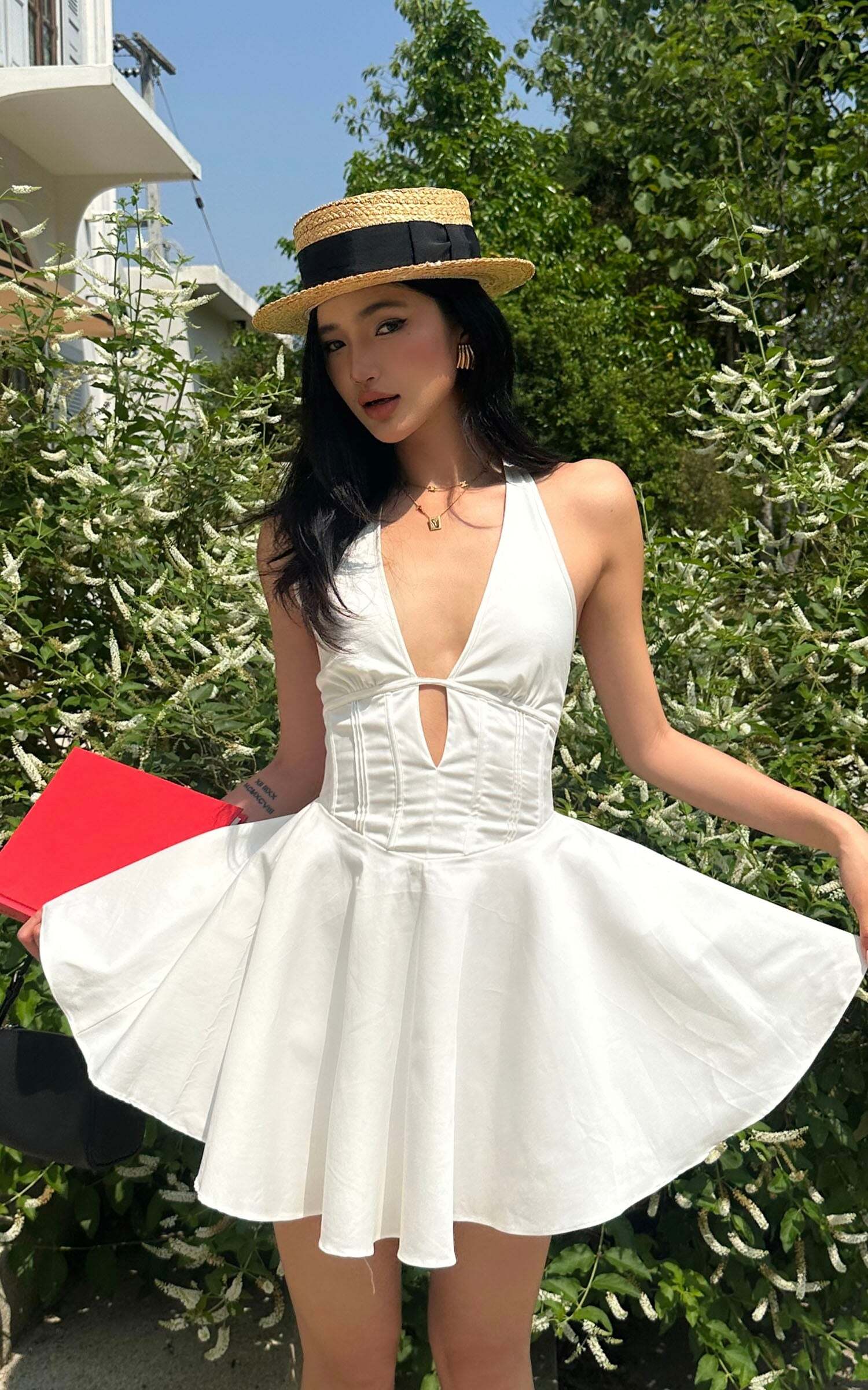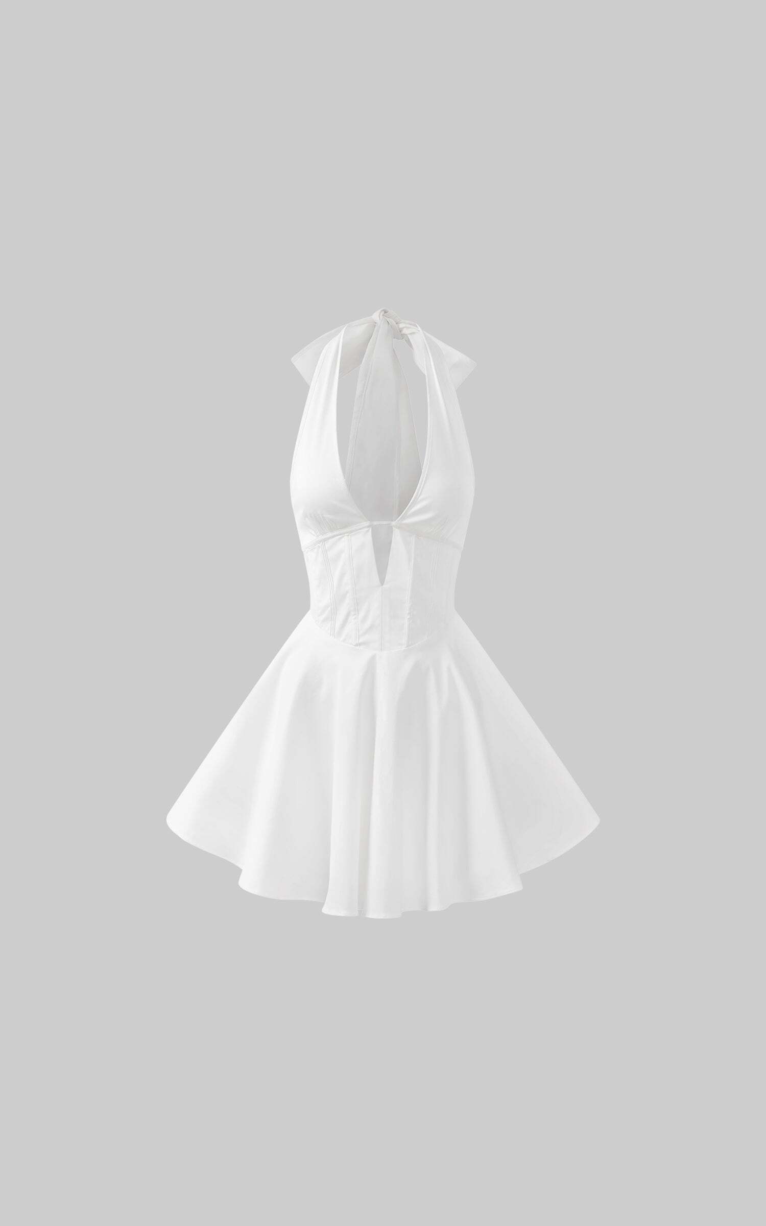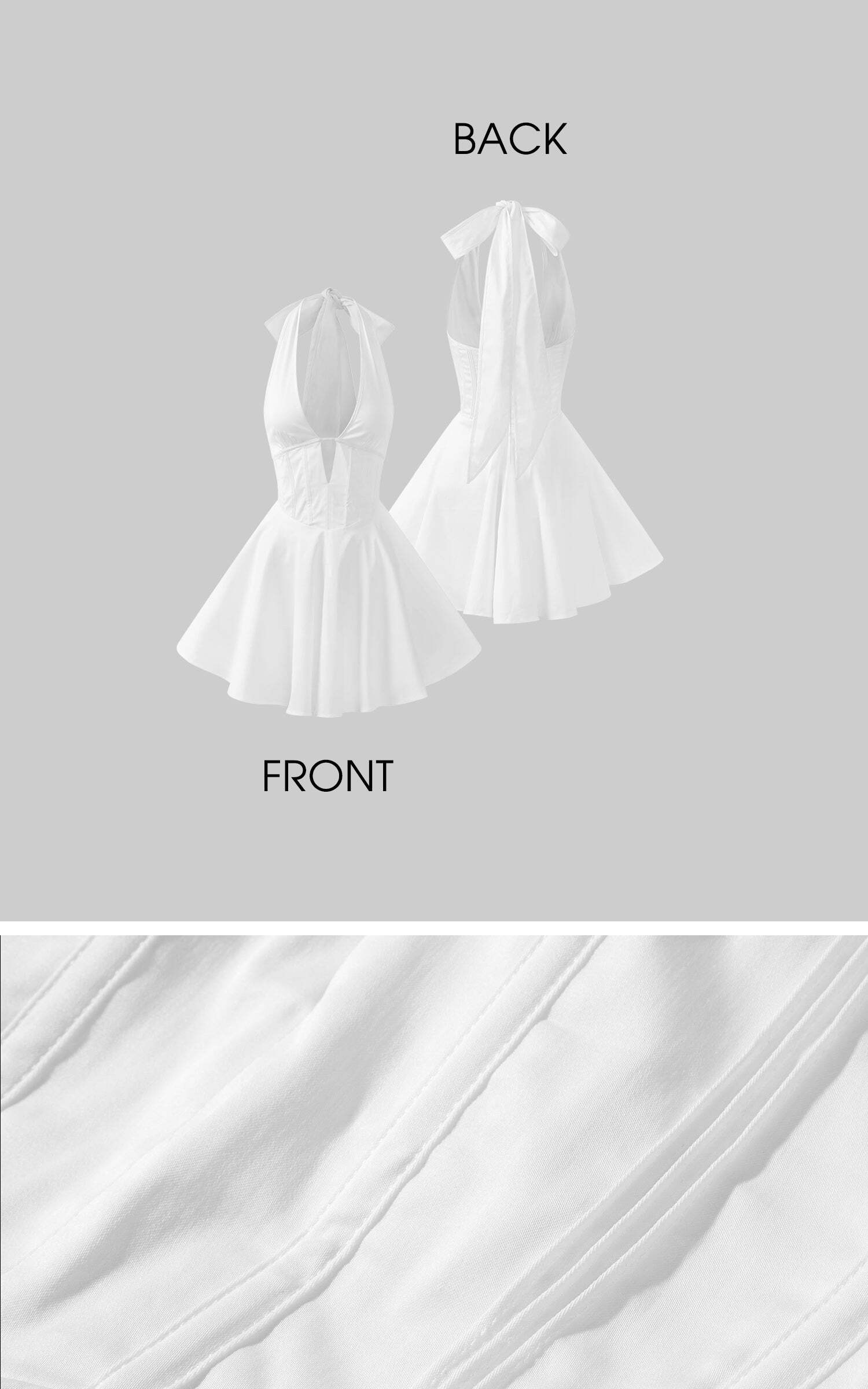 Designed to evoke vintage femininity with a seductive modern twist, this halter mini dress features a structured corset-style bodice and a dramatic flared skirt. The deep V neckline with a peekaboo cutout reveals just enough, while the wide self-tie at the neck adds elegance. Made from smooth, lustrous fabric with an inner mesh lining for volume, it’s perfect for garden parties, rooftop drinks, or any moment worth remembering.