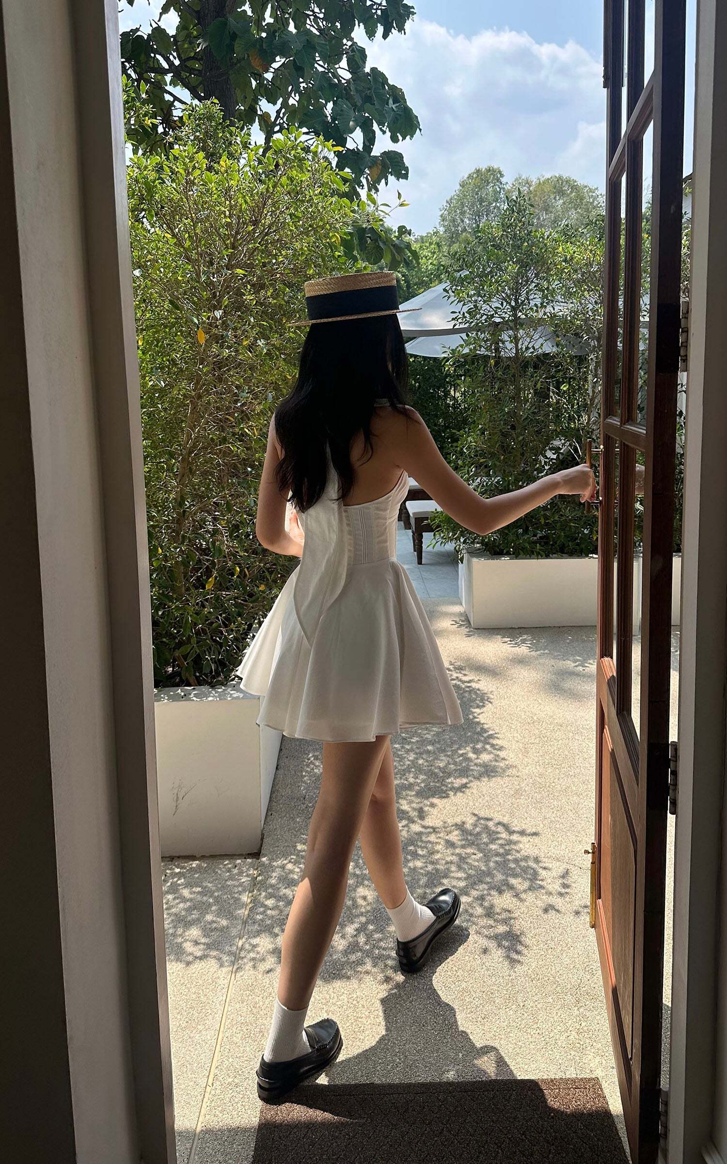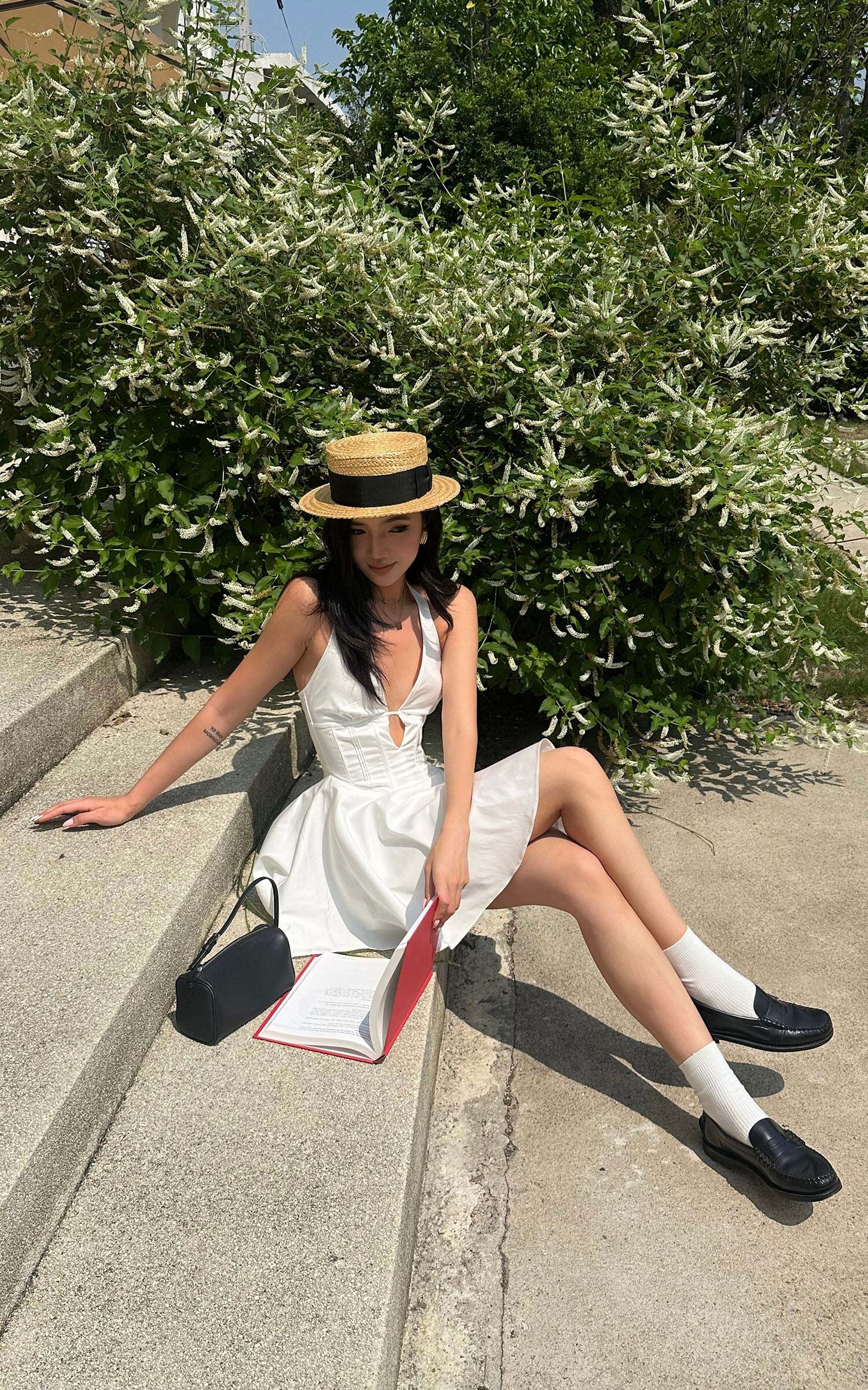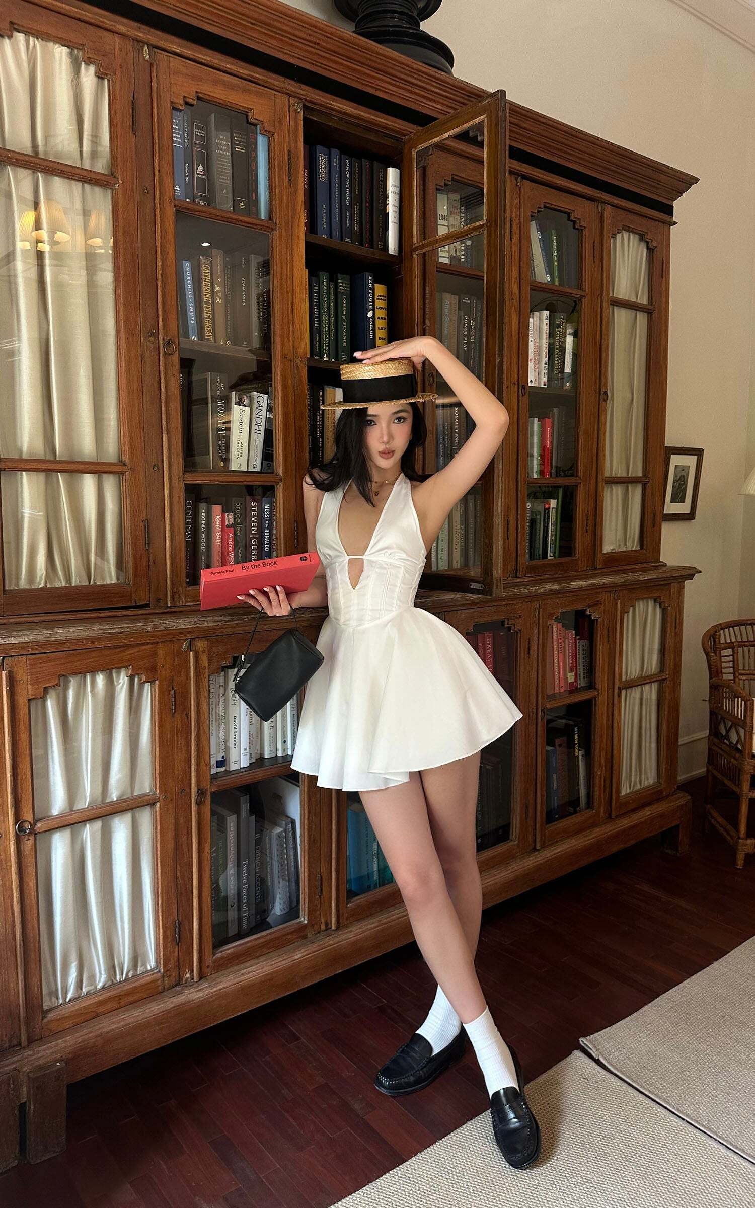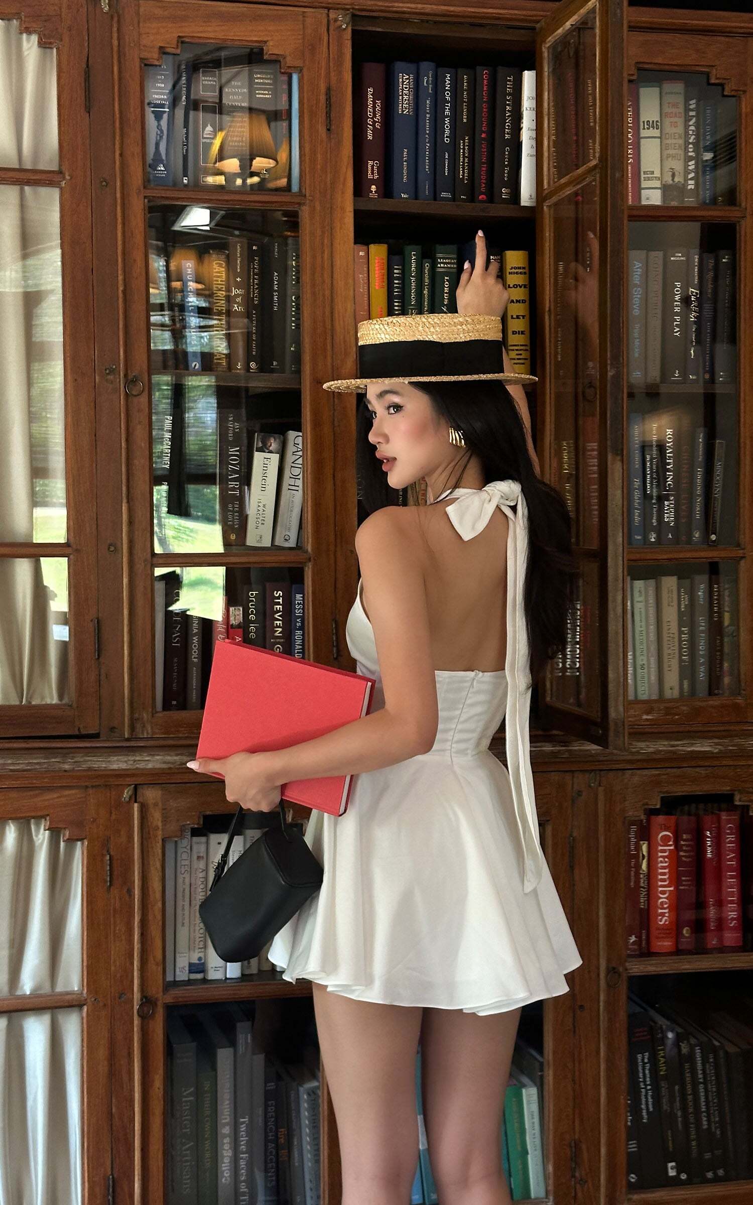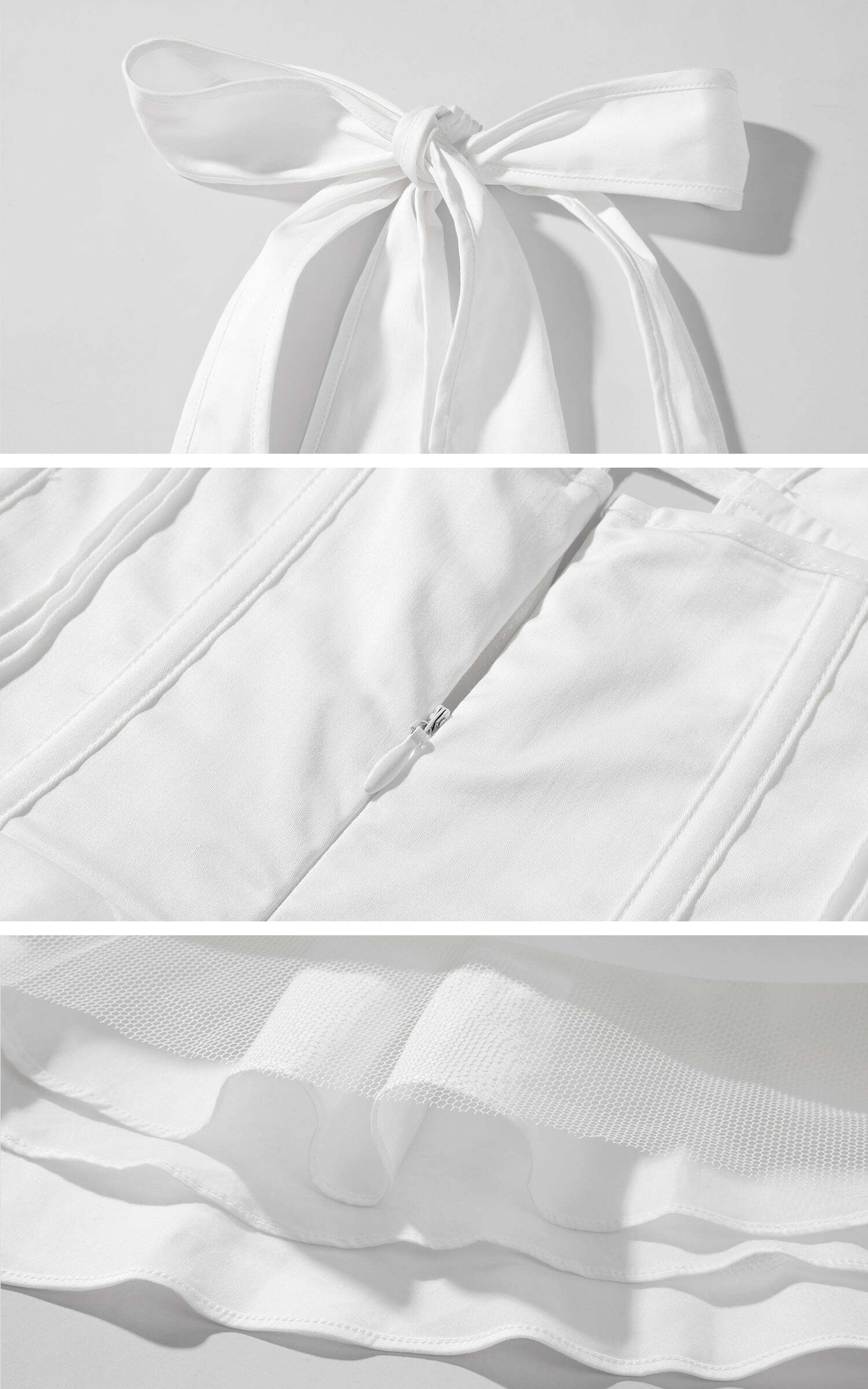 Designed to evoke vintage femininity with a seductive modern twist, this halter mini dress features a structured corset-style bodice and a dramatic flared skirt. The deep V neckline with a peekaboo cutout reveals just enough, while the wide self-tie at the neck adds elegance. Made from smooth, lustrous fabric with an inner mesh lining for volume, it’s perfect for garden parties, rooftop drinks, or any moment worth remembering.